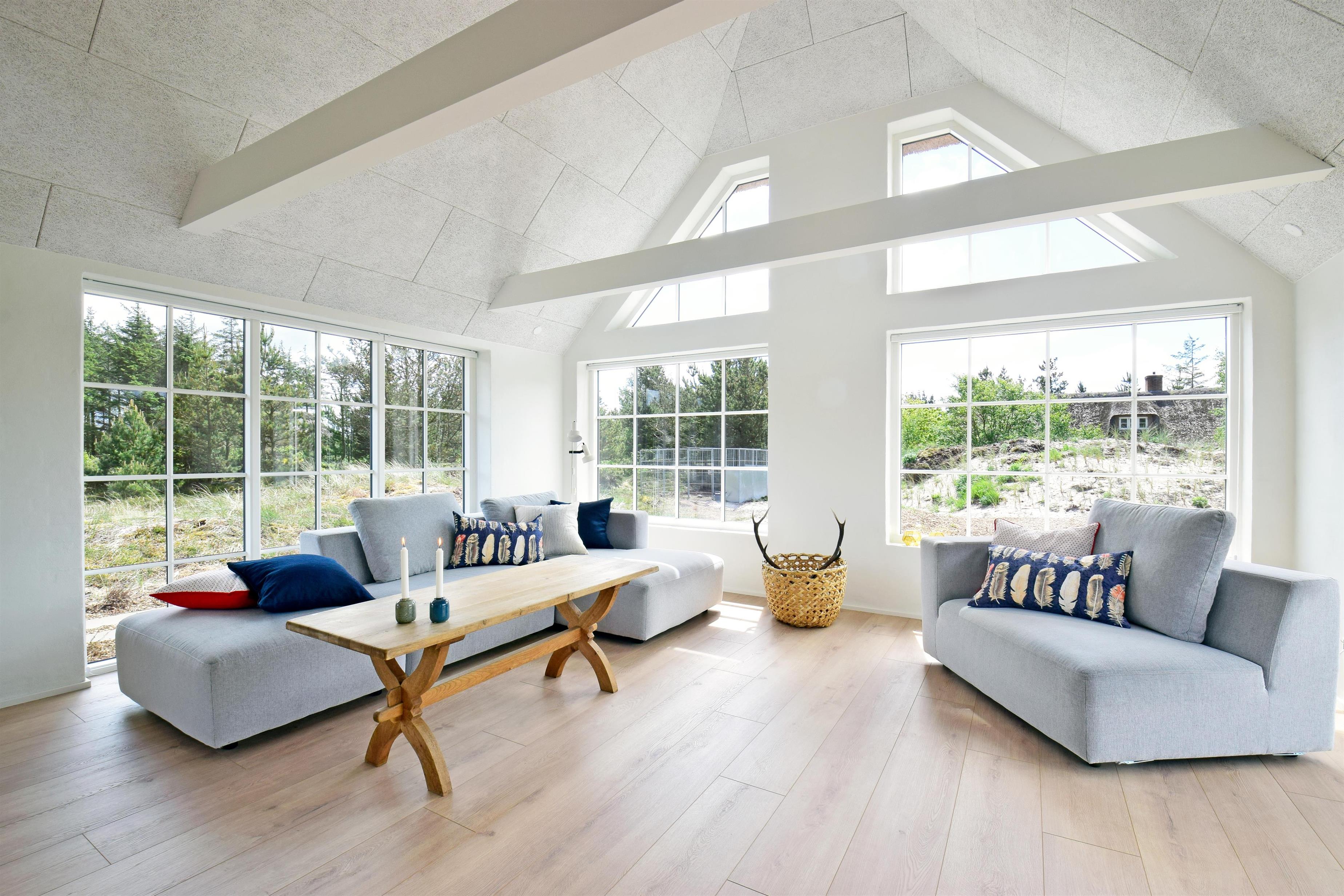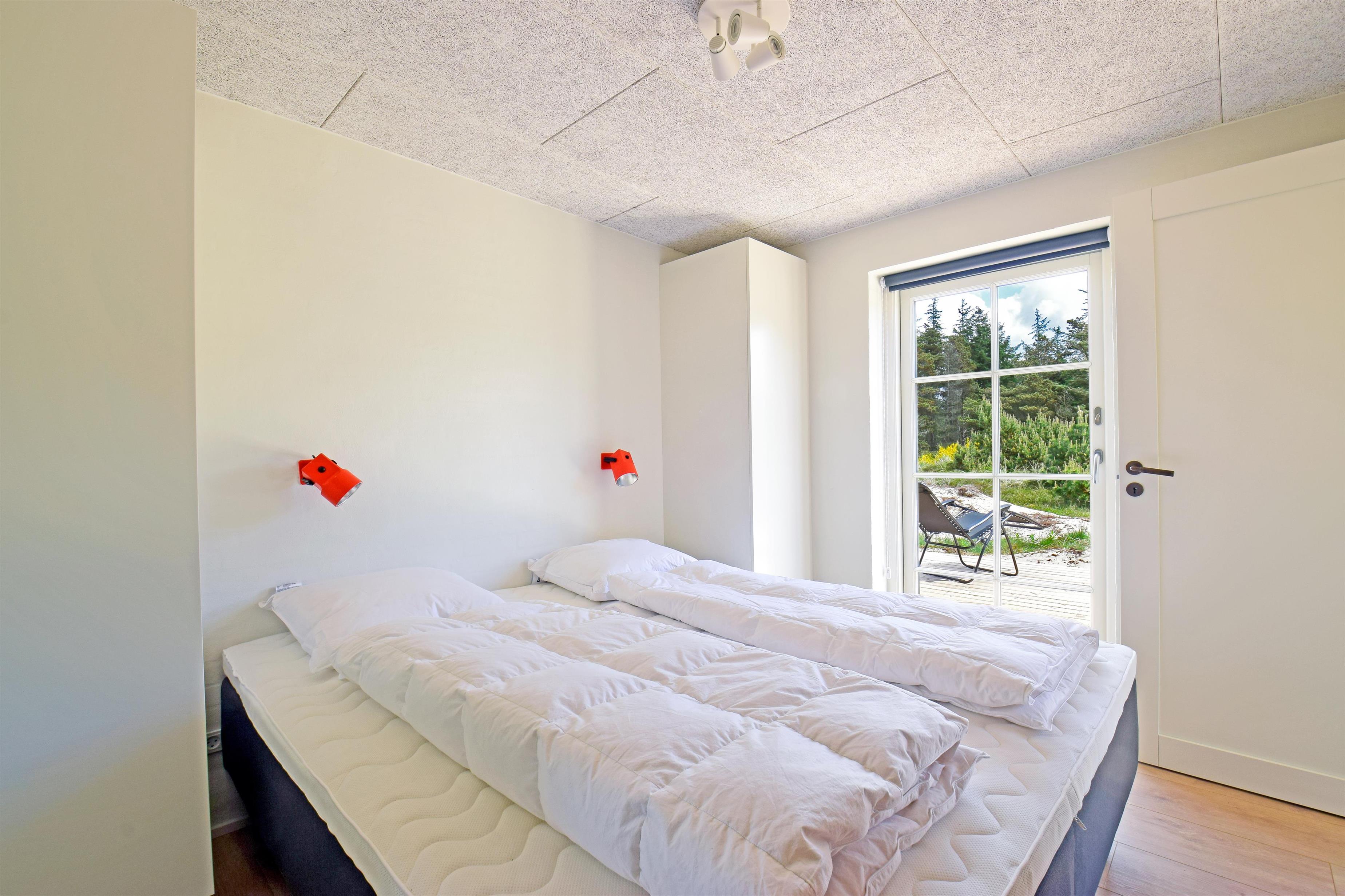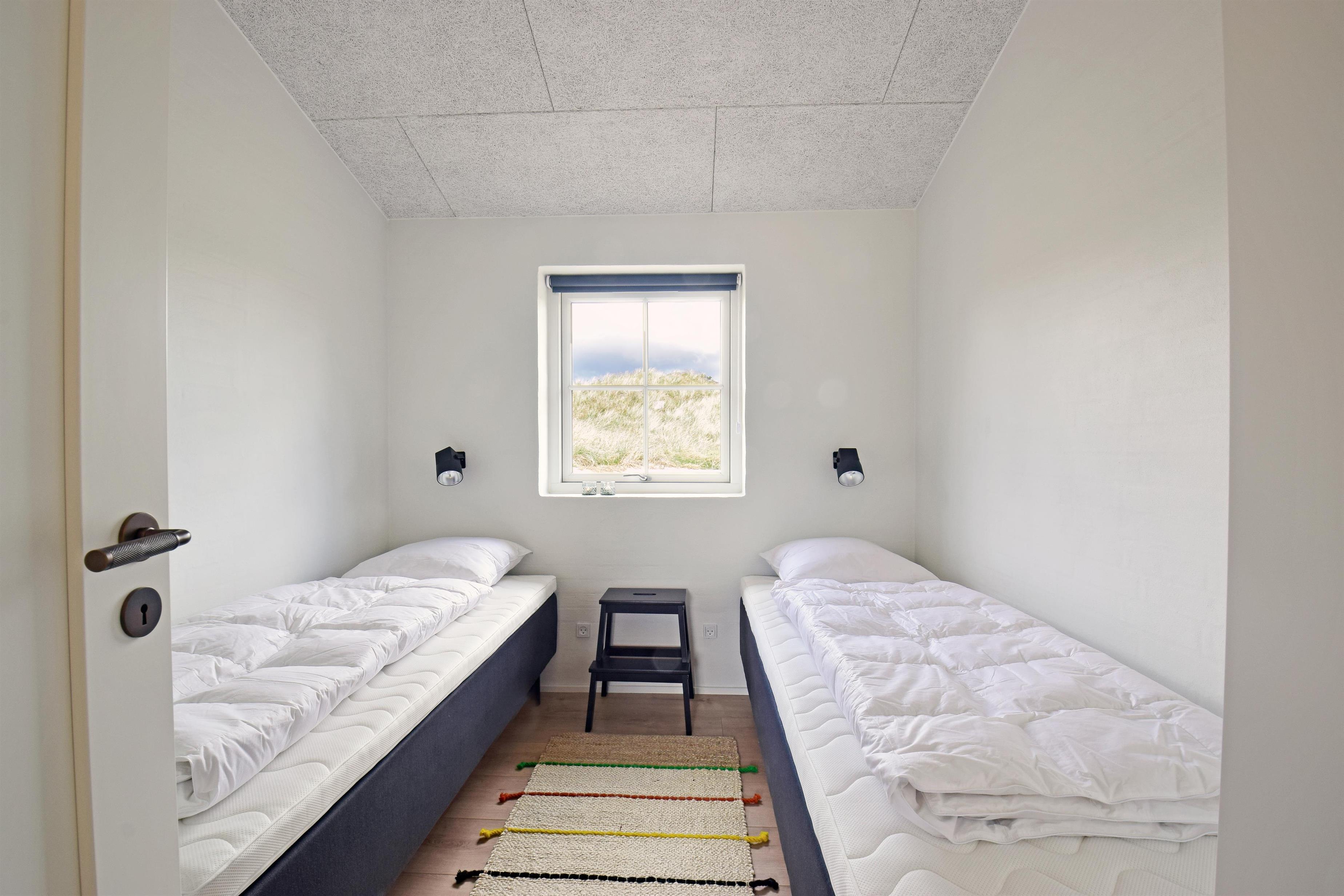 Indretning: Entre med plads til overtøj og sko. Værelse med 2 enkelte senge. Værelse med dobbeltseng. Soveværelse med dobbeltsenge og adgang til badeværelse med bruseniche. Huset har et stort luksusbadeværelse med bruseniche, spabad og sauna, hvorfra der også er udgang til terrasse med udendørsspabad. Husets køkken er i åben forbindelse med stuen, hvor der er loft i kip og store vinduespartier så klitplanskabet kan nydes fra både sofa og spiseplads.