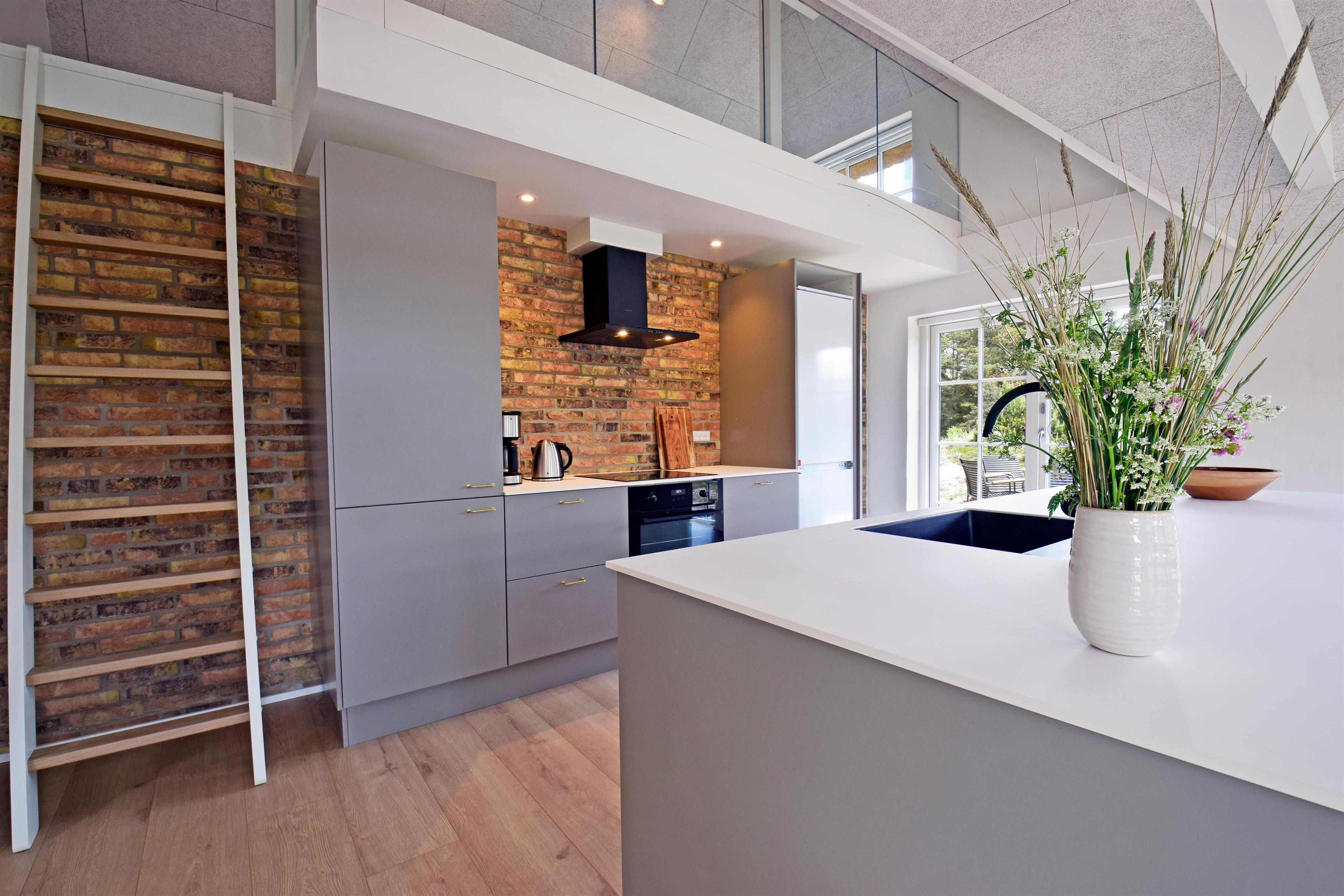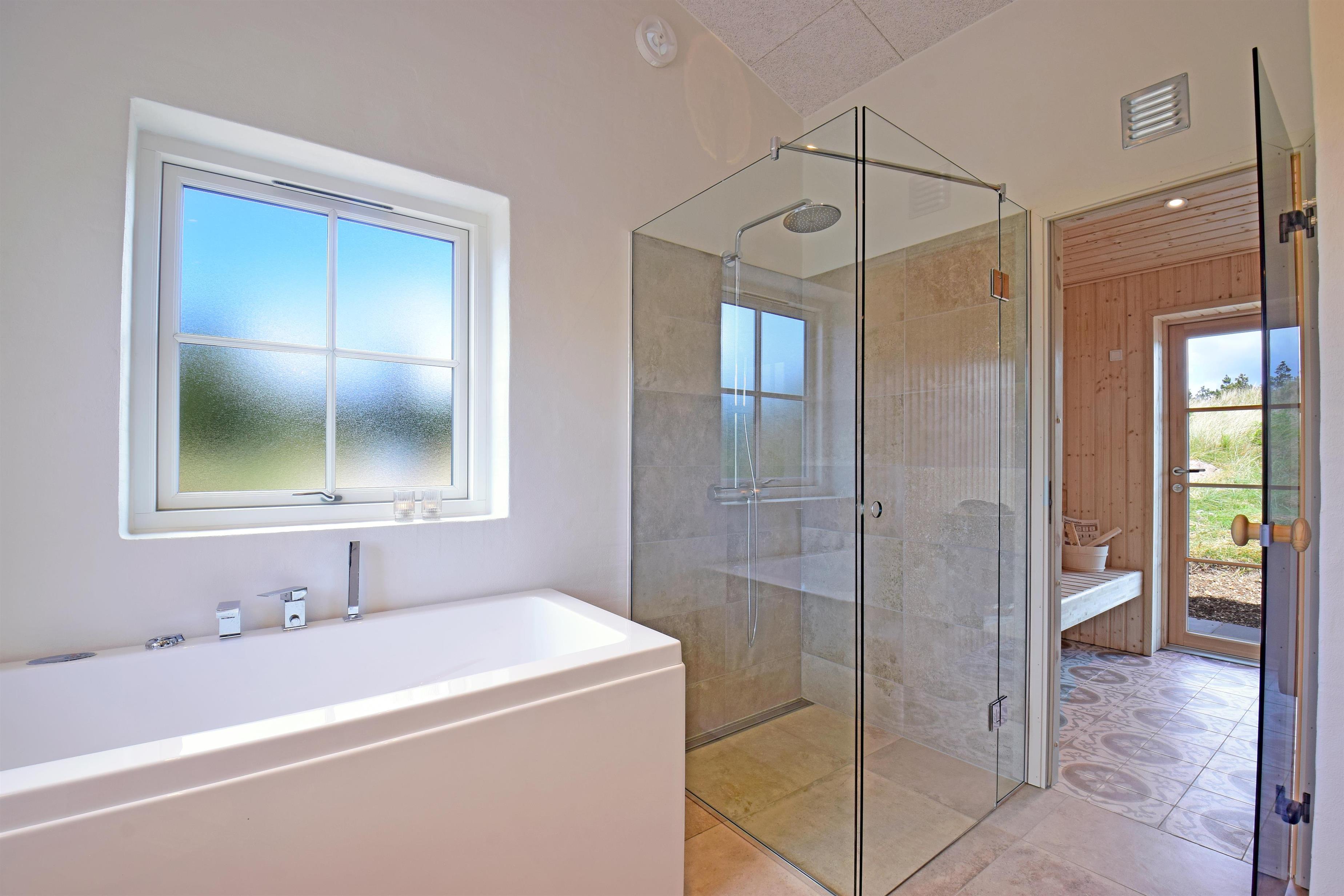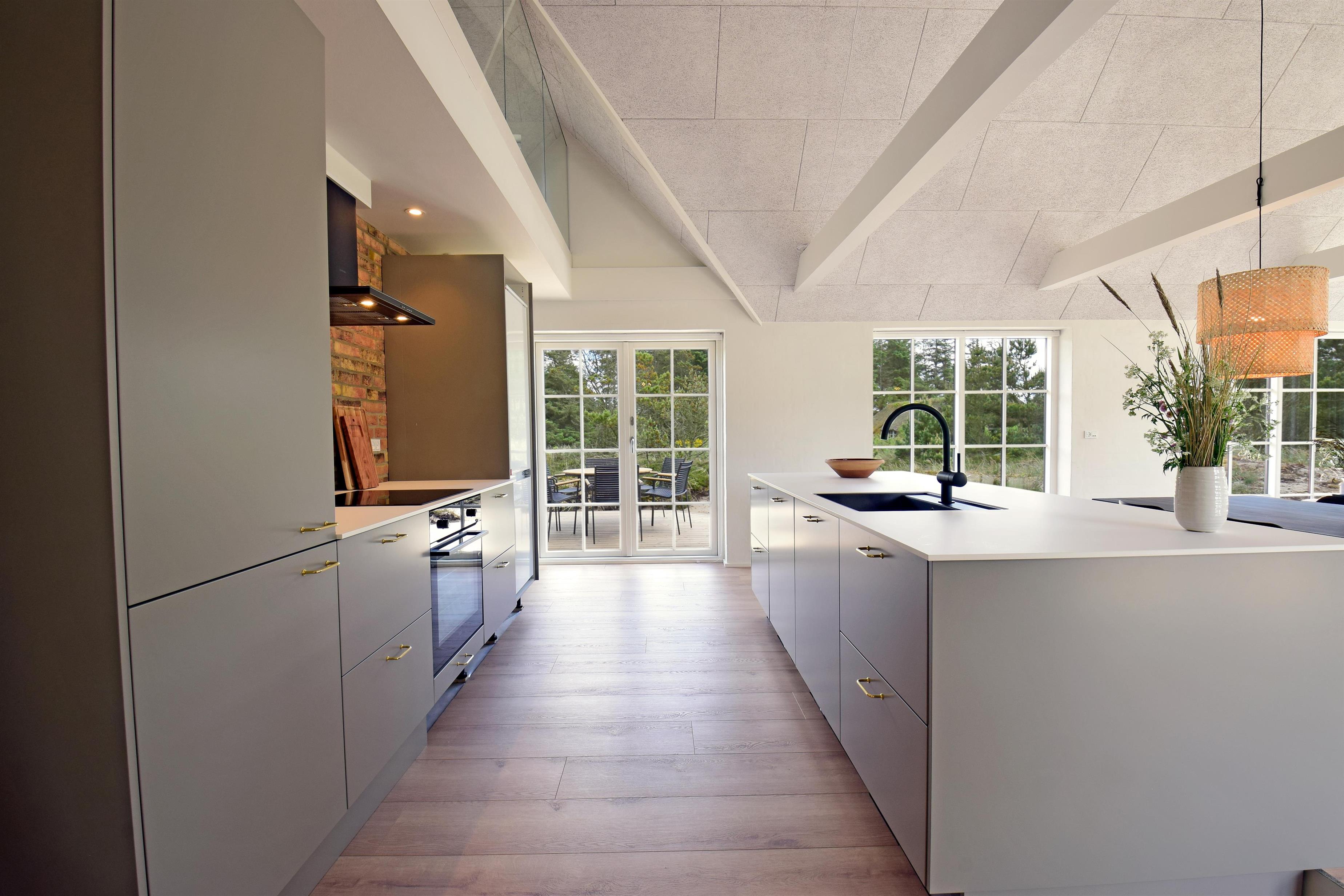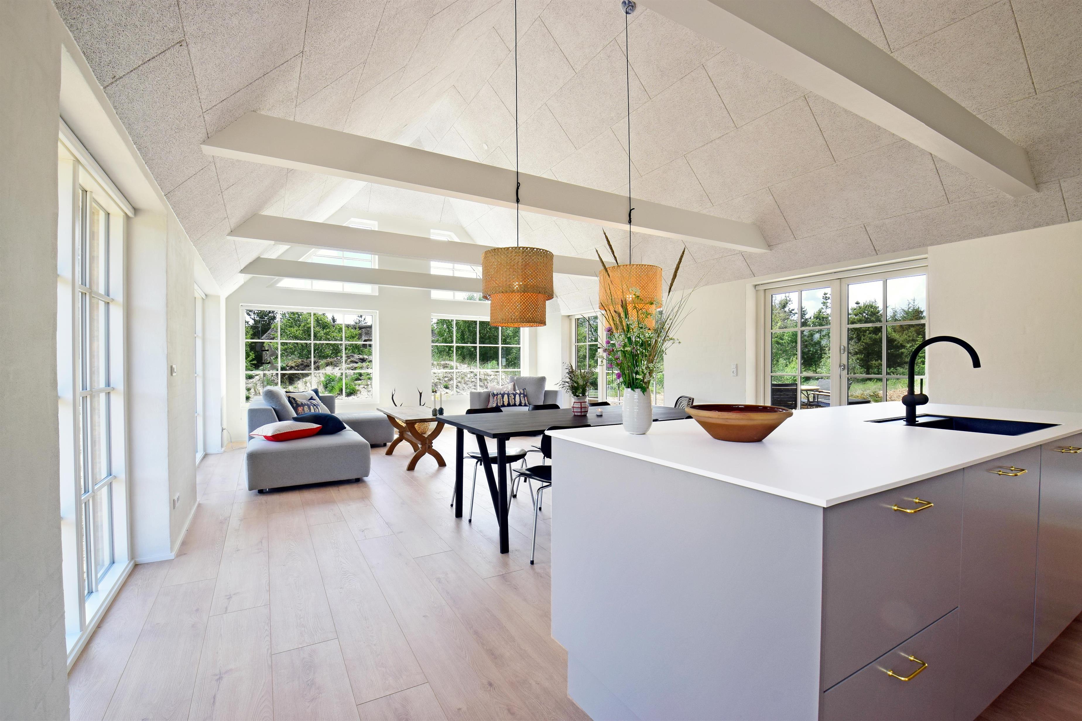 Indretning: Entre med plads til overtøj og sko. Værelse med 2 enkelte senge. Værelse med dobbeltseng. Soveværelse med dobbeltsenge og adgang til badeværelse med bruseniche. Huset har et stort luksusbadeværelse med bruseniche, spabad og sauna, hvorfra der også er udgang til terrasse med udendørsspabad. Husets køkken er i åben forbindelse med stuen, hvor der er loft i kip og store vinduespartier så klitplanskabet kan nydes fra både sofa og spiseplads.