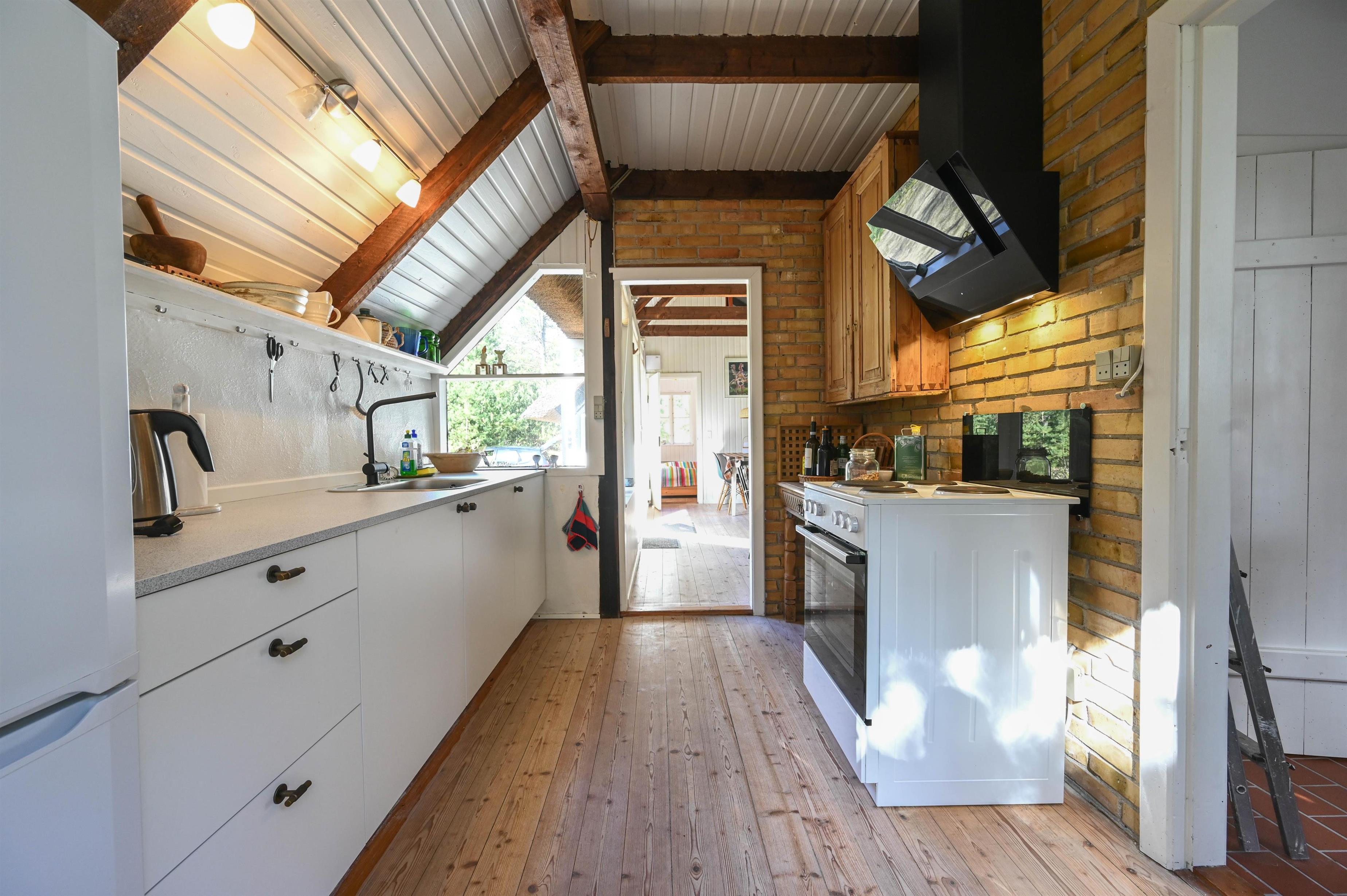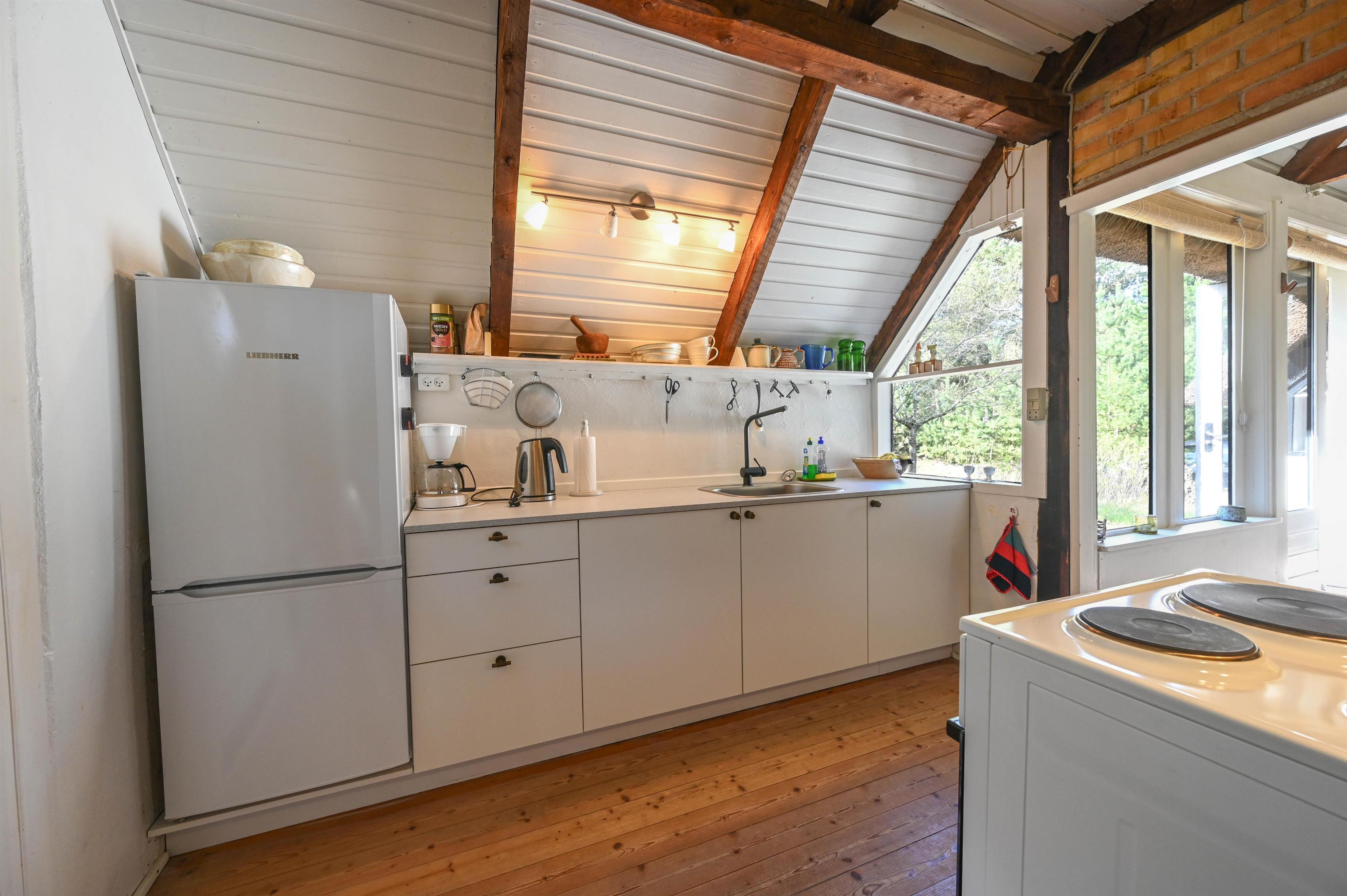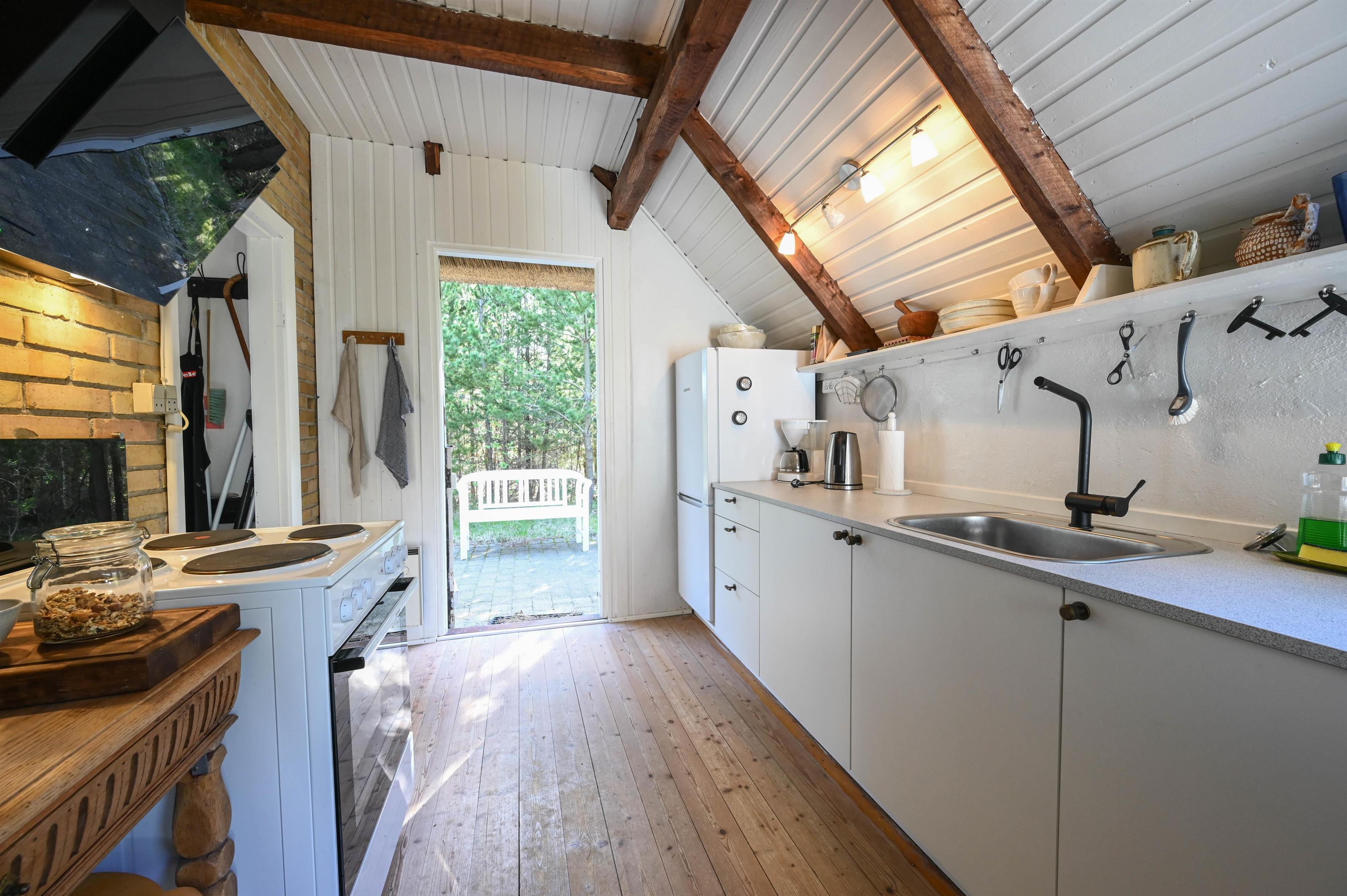 Køkkenet er ældre, men funktionelt, og passer perfekt til husets autentiske stil.