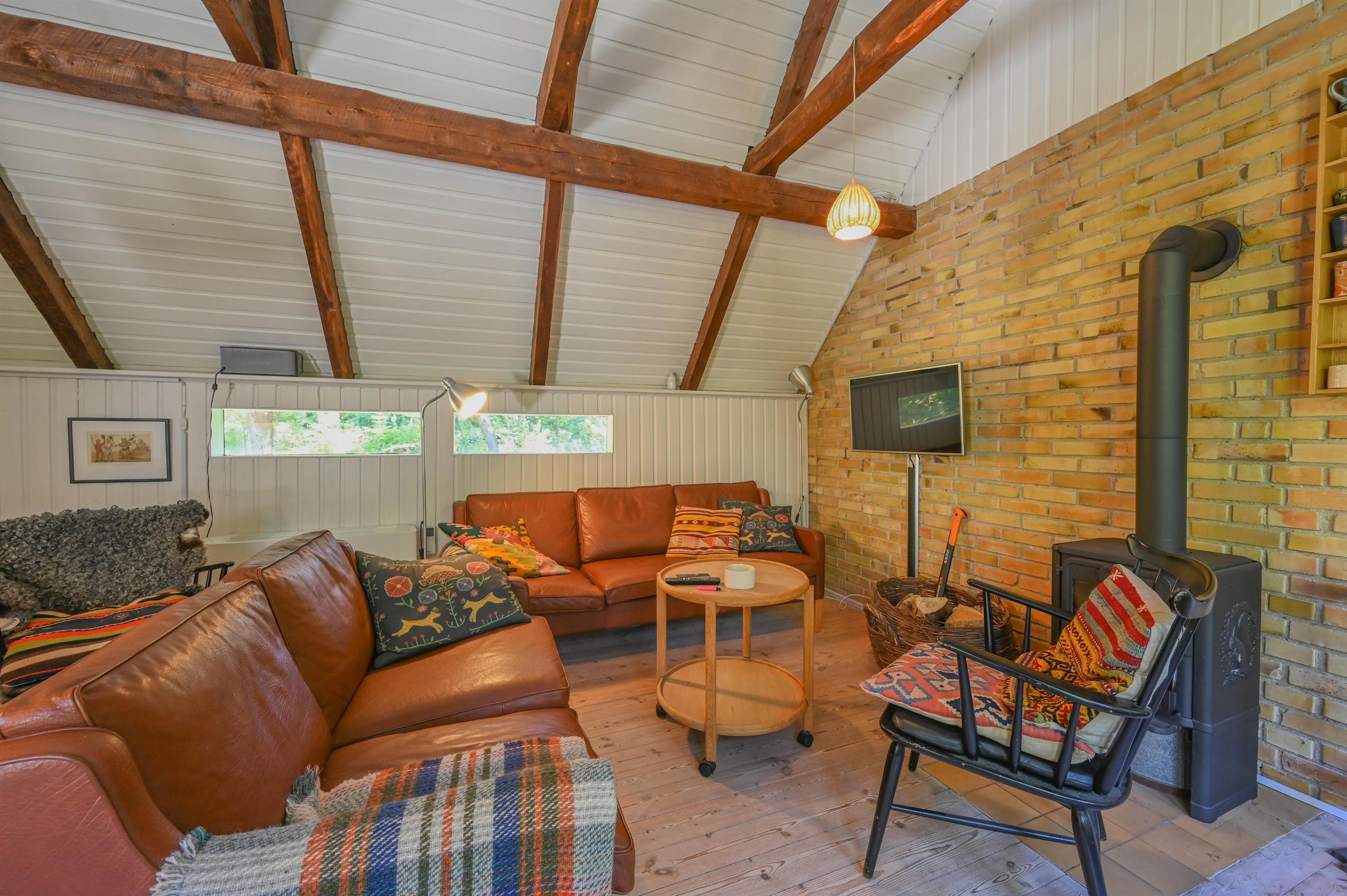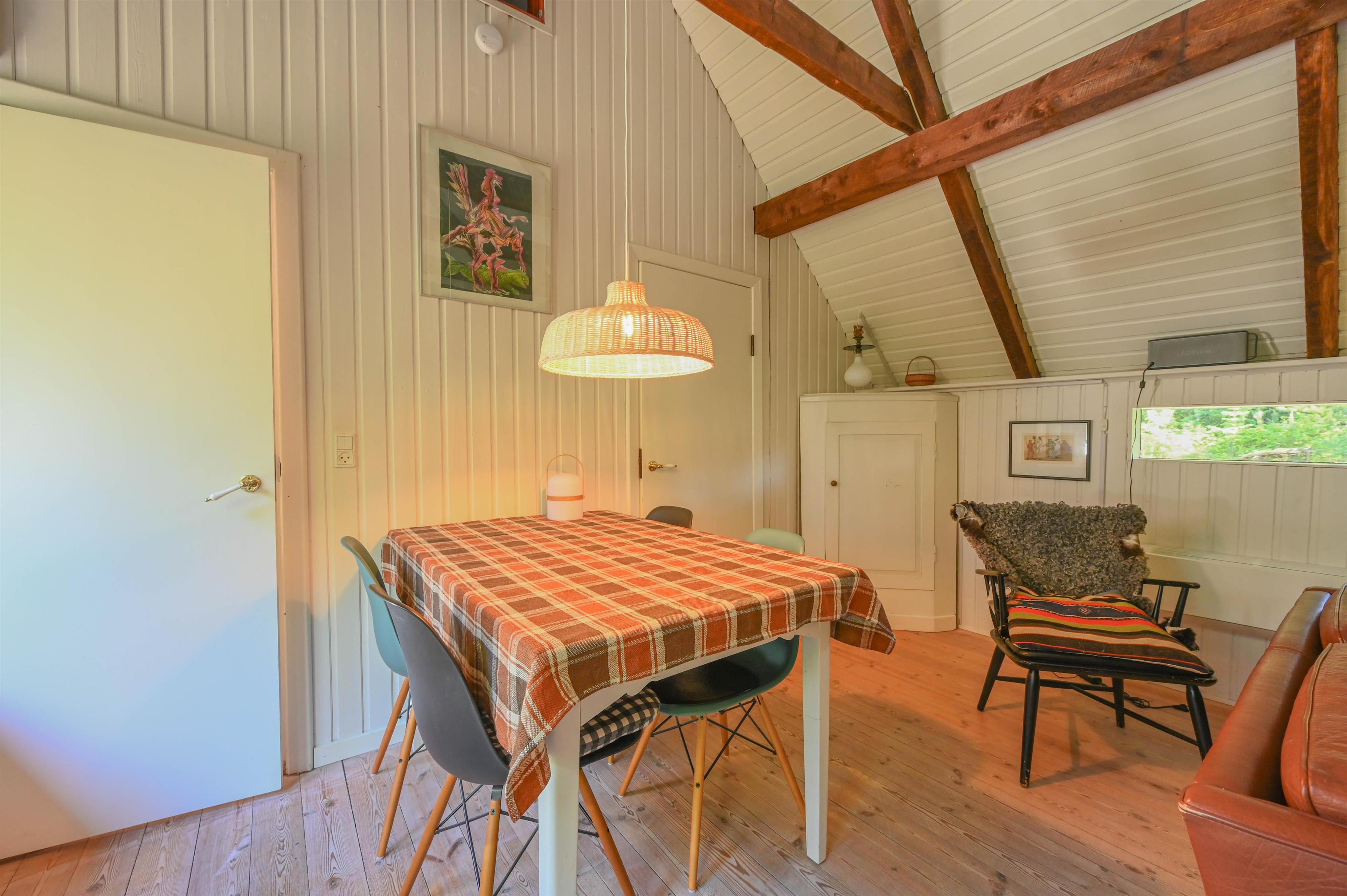 Den lille stue og spisestue ligger i ét og er indrettet med brændeovn og hyggelige møbler, som skaber en varm og afslappet stemning.