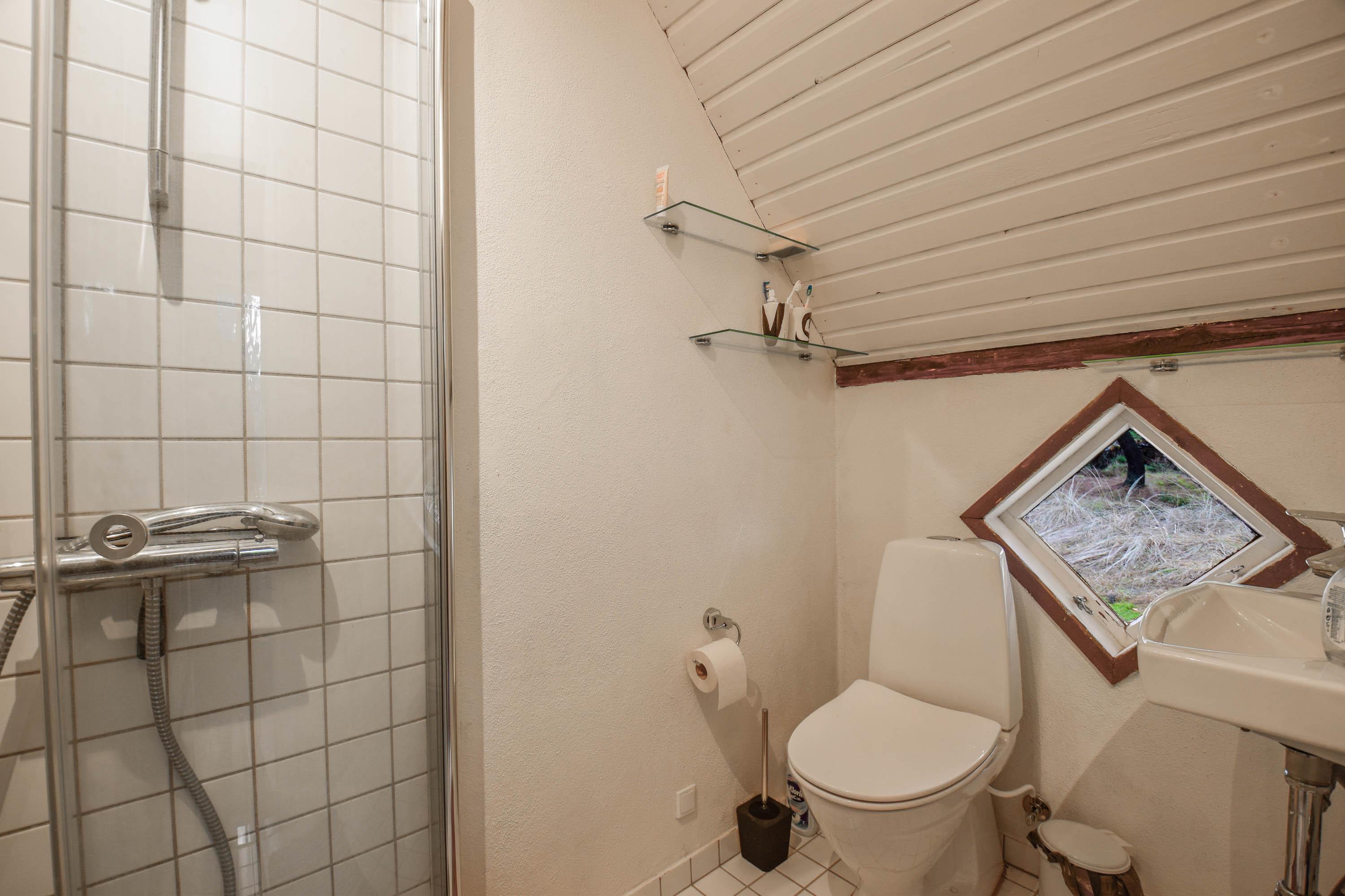 Badeværelset er lille, men praktisk, og indeholder alt det nødvendige.
