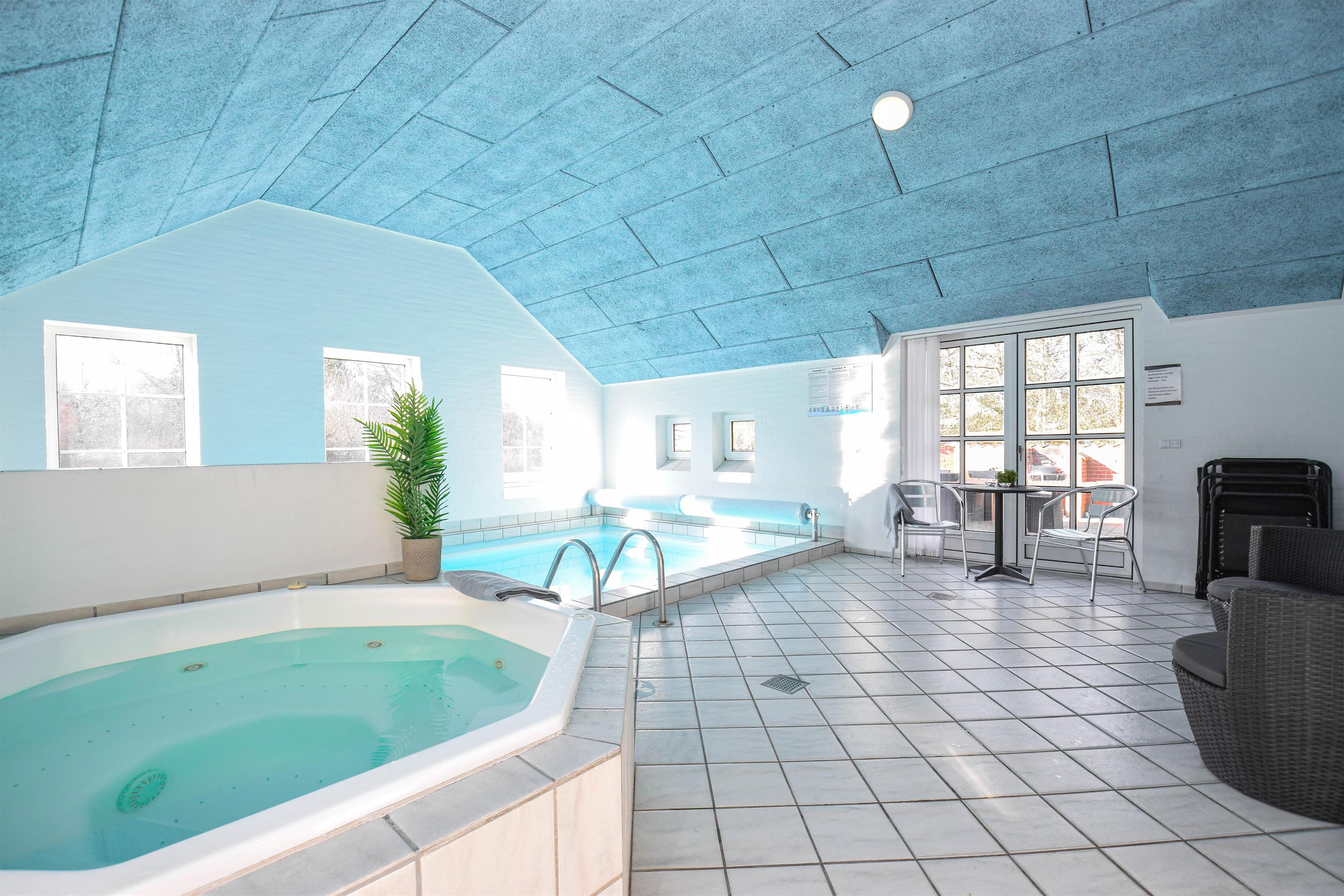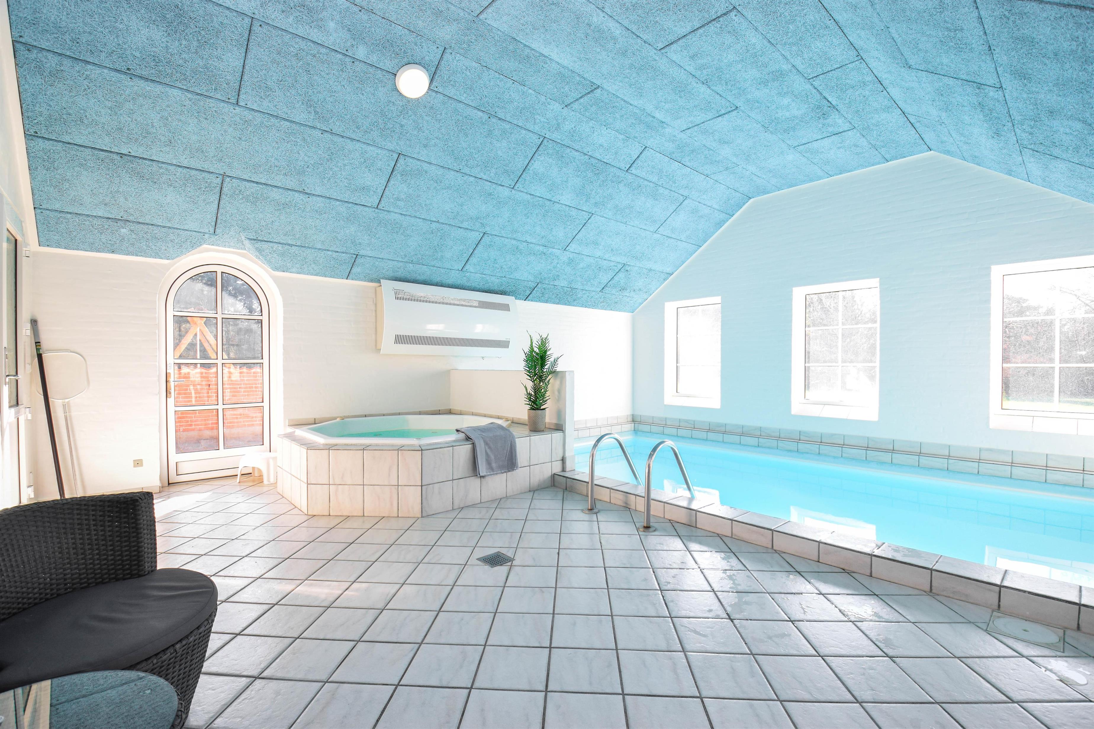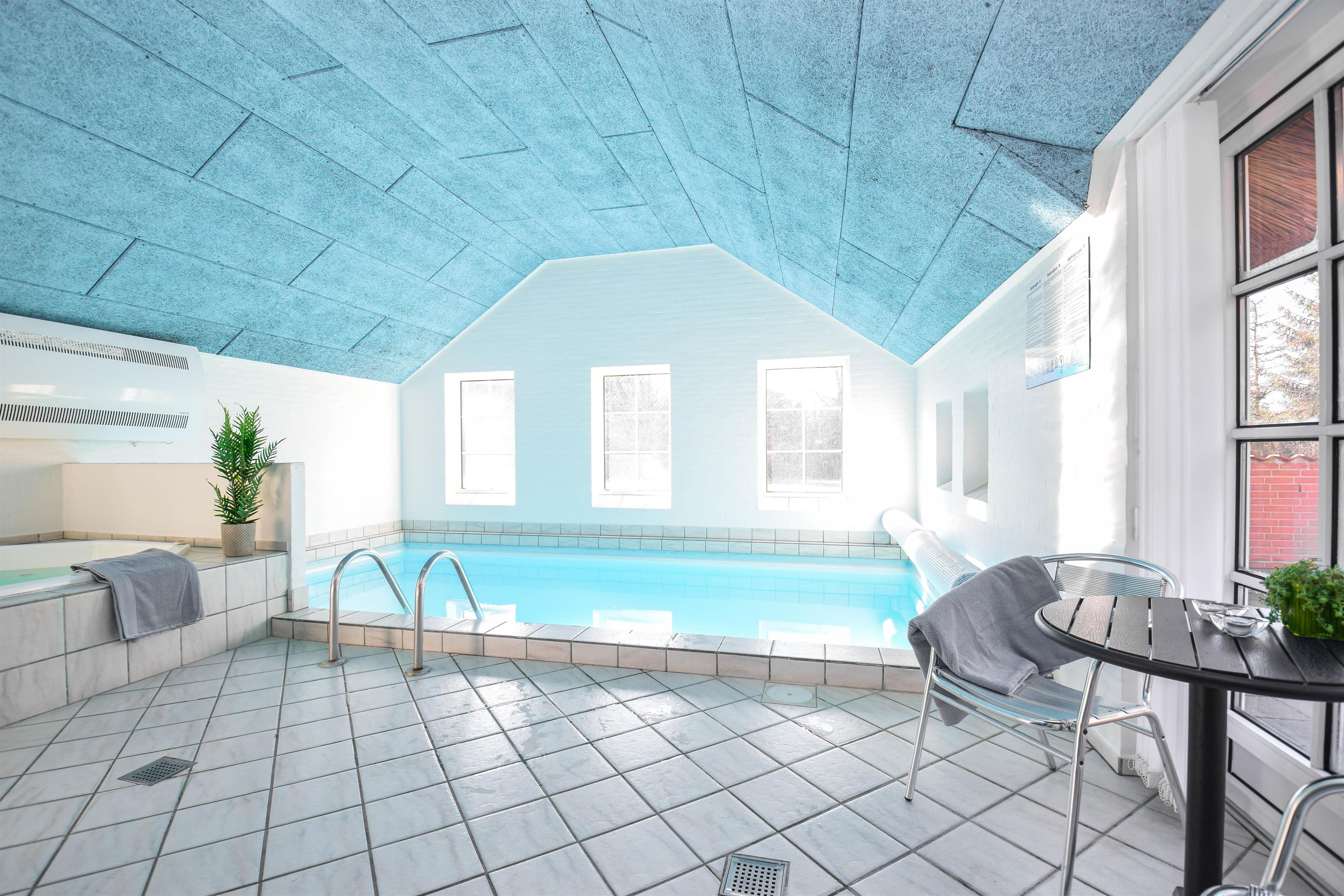 Indretning: Entré med vaskemaskine og tørretumbler, 3 værelser med dobbeltsenge, samt et enkelt værelse med to enkeltsenge. Feriehuset har indendørs swimmingpool samt spabad og sauna. Der er to gode badeværelser med gulvvarme og bruseniche.