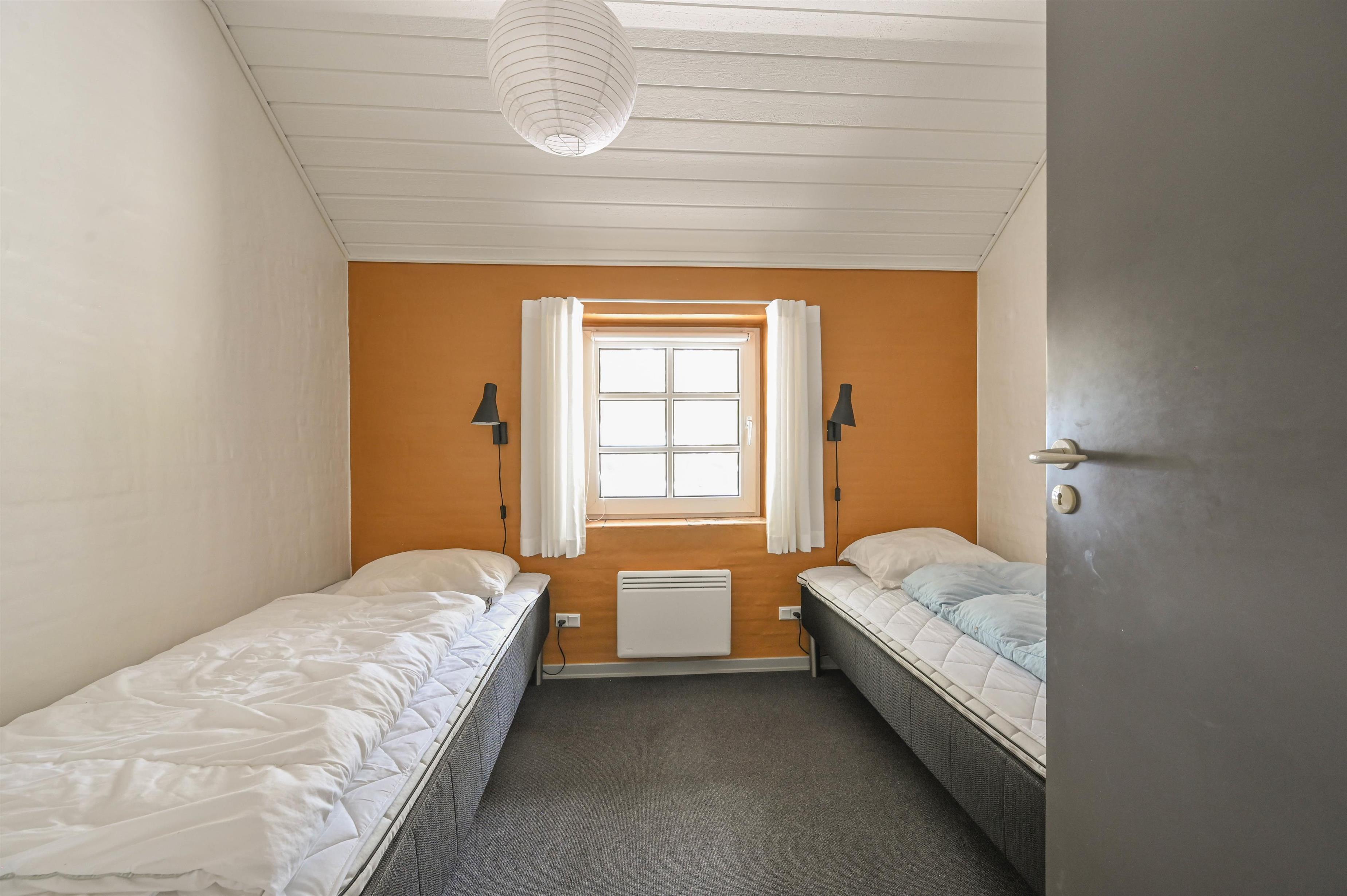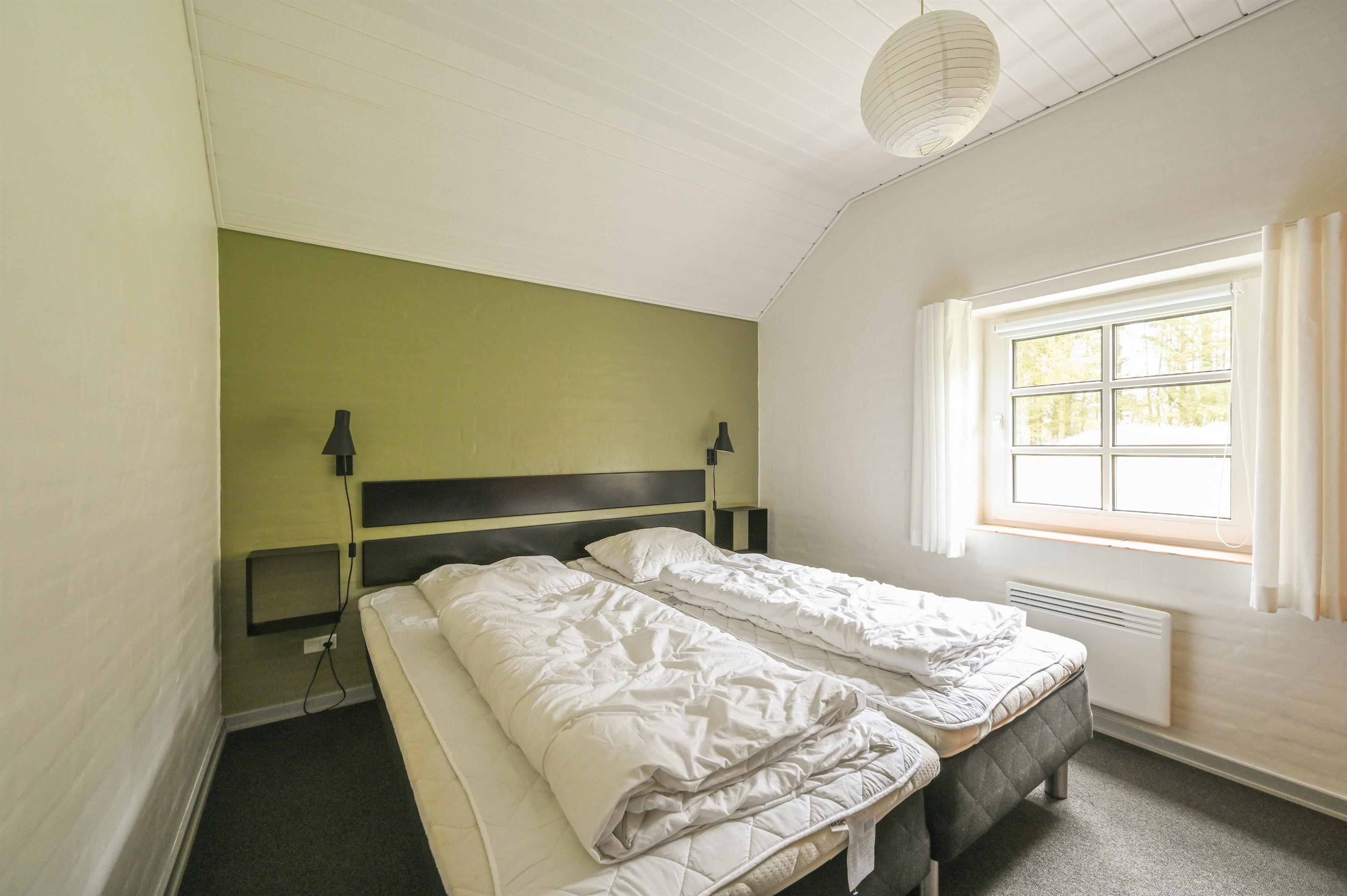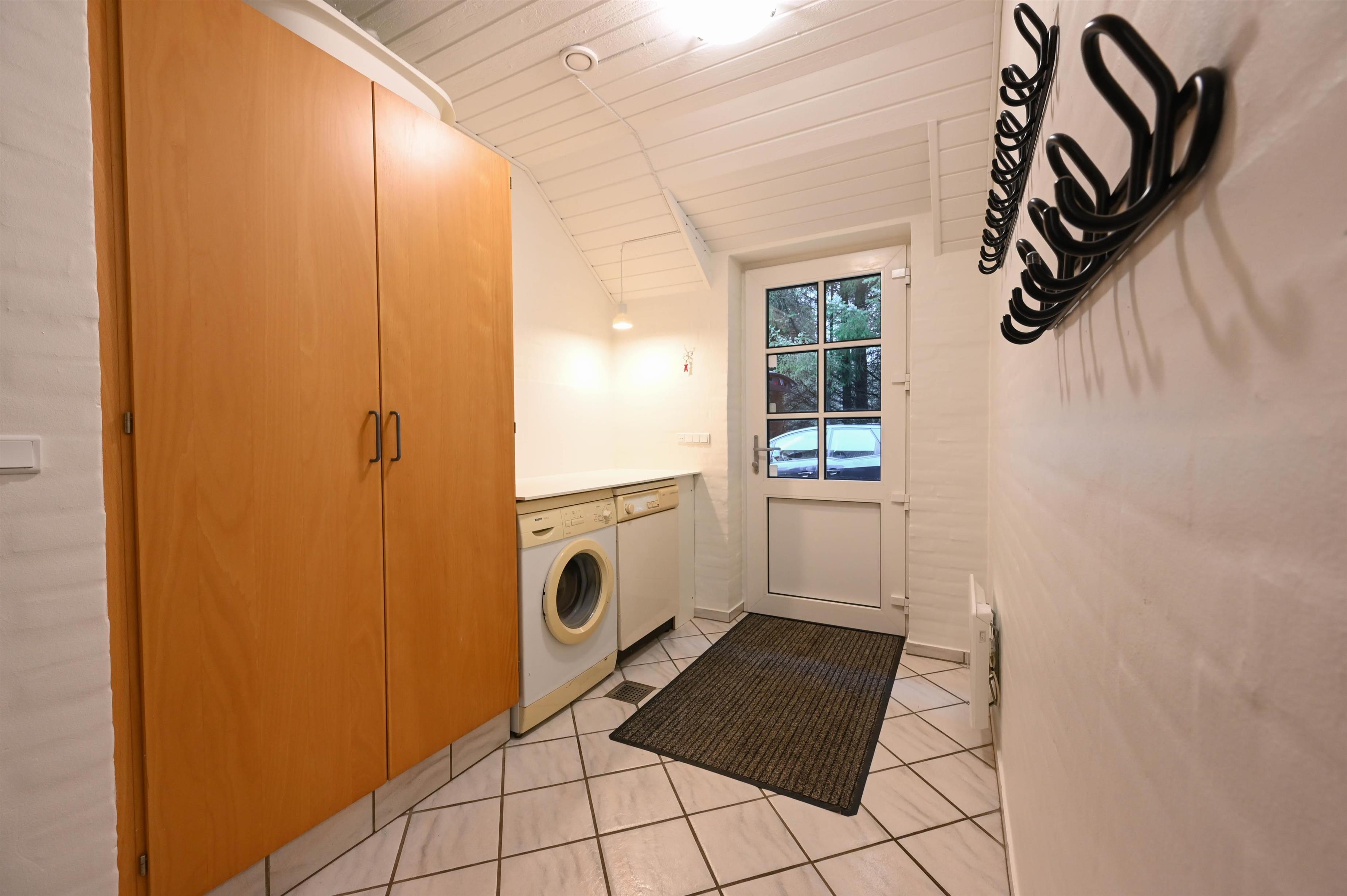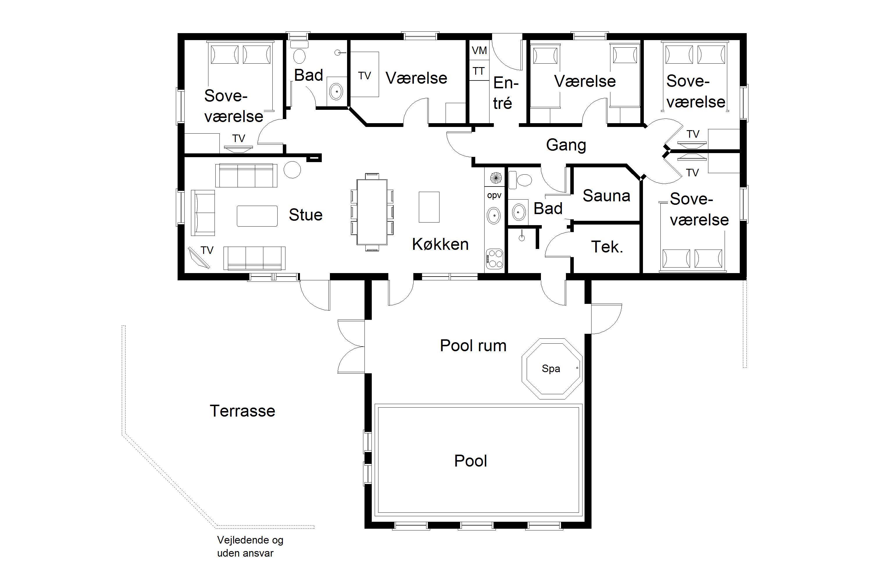 Indretning: Entré med vaskemaskine og tørretumbler, 3 værelser med dobbeltsenge, samt et enkelt værelse med to enkeltsenge. Feriehuset har indendørs swimmingpool samt spabad og sauna. Der er to gode badeværelser med gulvvarme og bruseniche.
