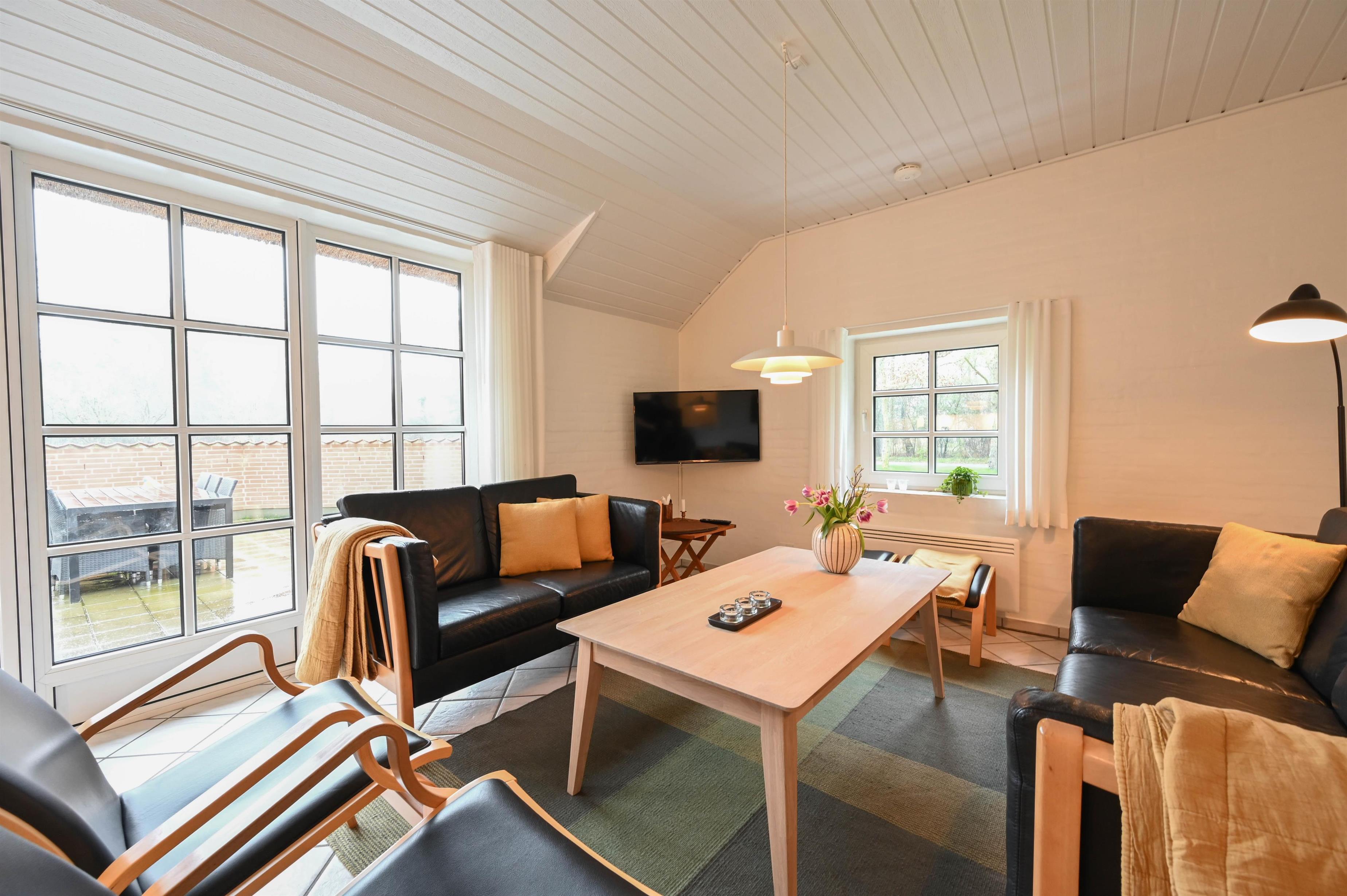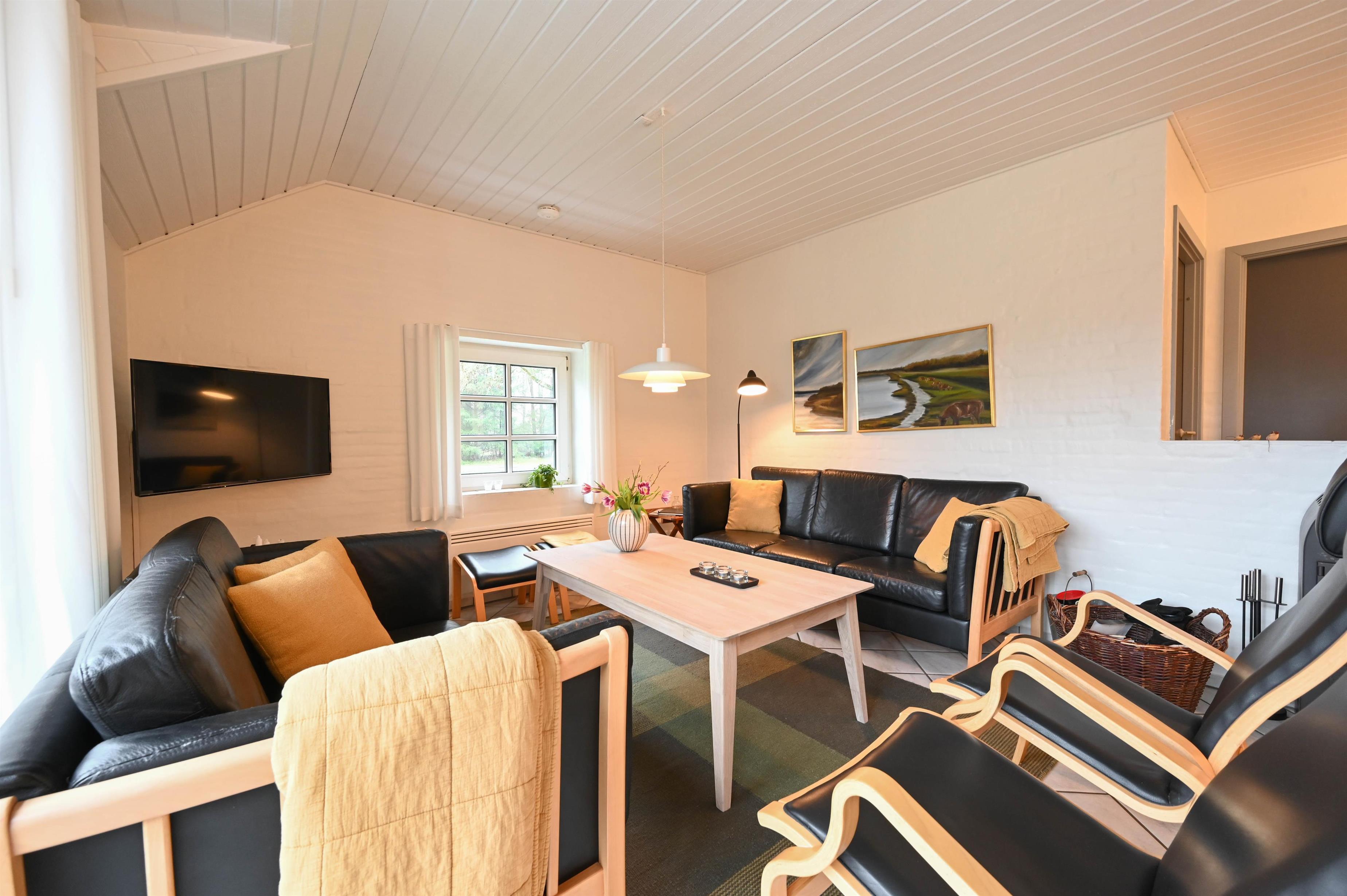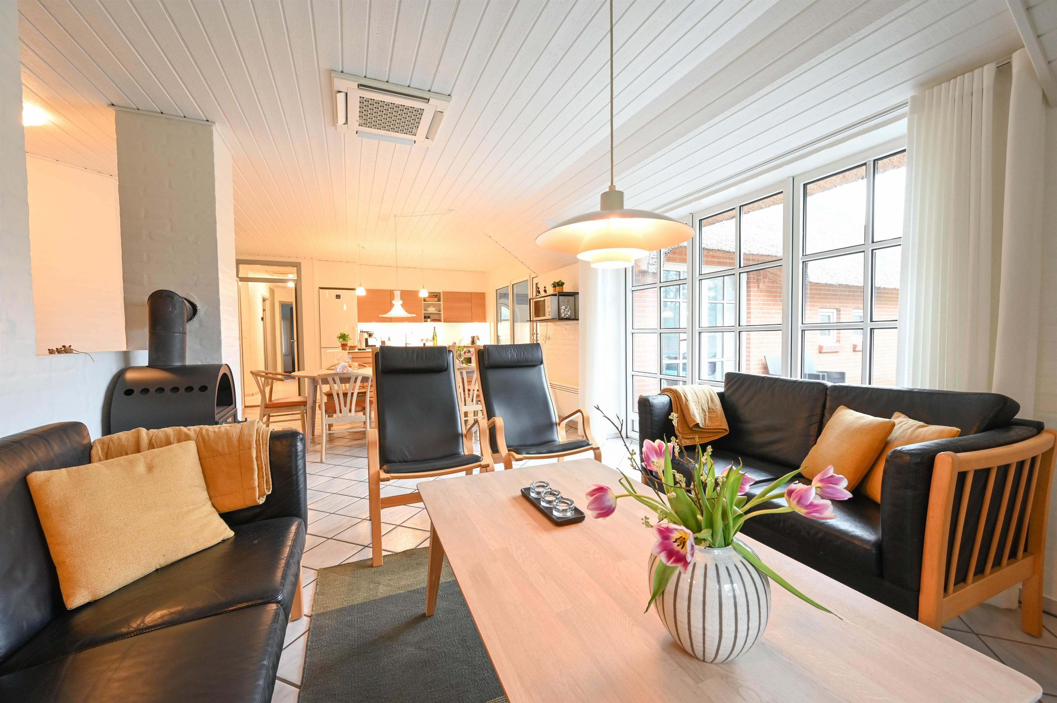 I forlængelse med det nye veludstyrede køkken er stuen placeret, som er indrettet med gode møbler og en dejlig brændeovn.