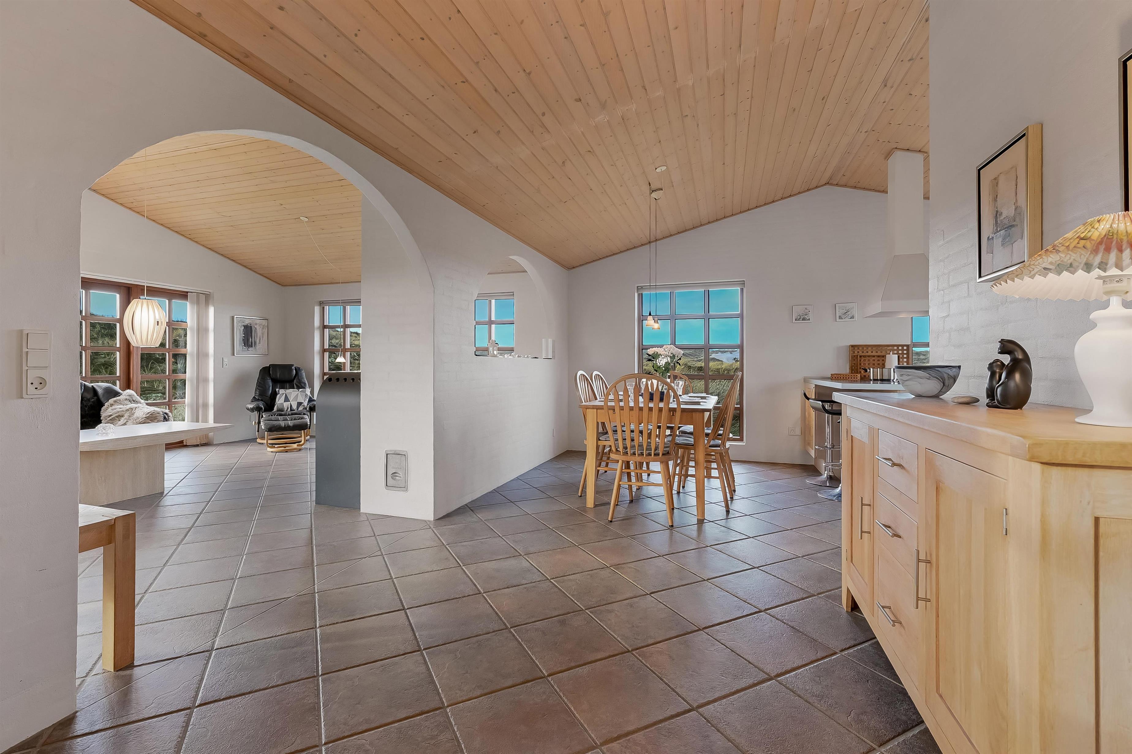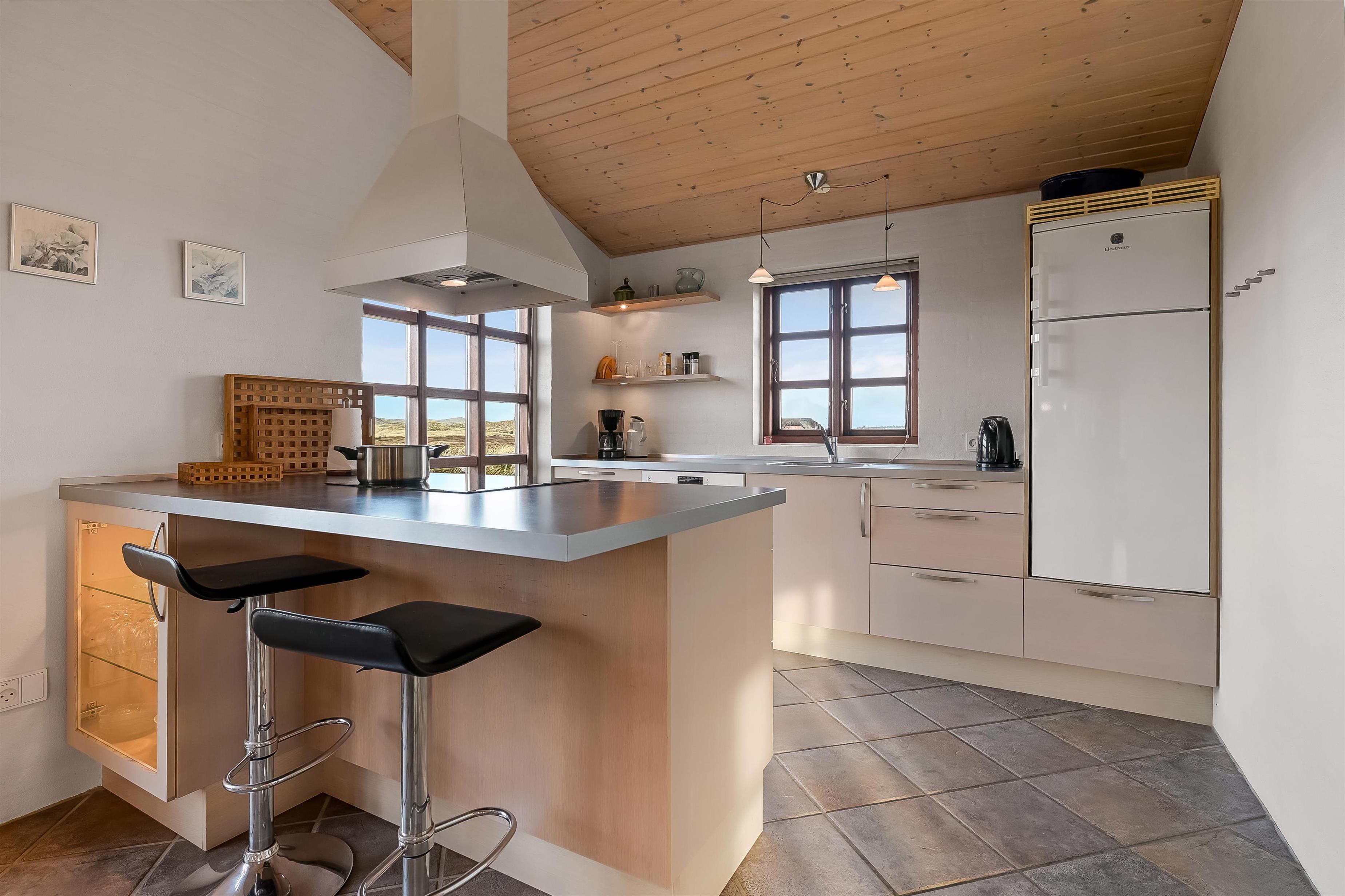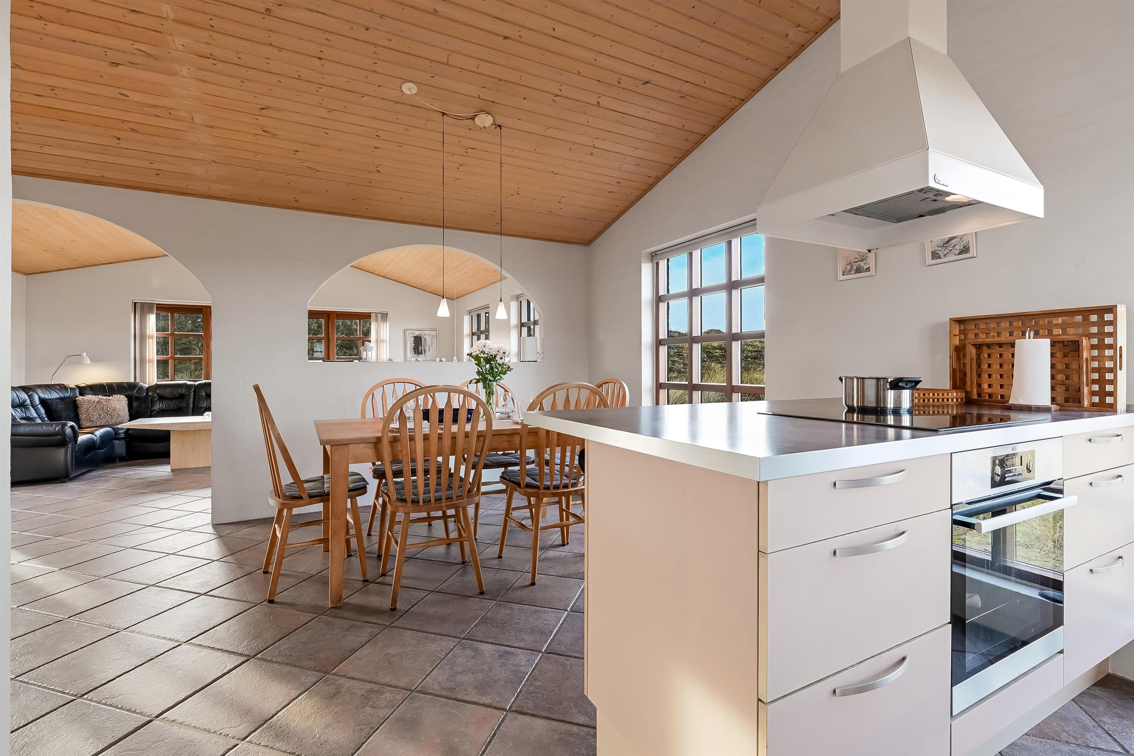 I det åbne køkken/alrum kan hele familien samles – her er der god plads, klinkegulve med gulvvarme og brændeovn, som spreder varme og feriestemning på de kølige dage.