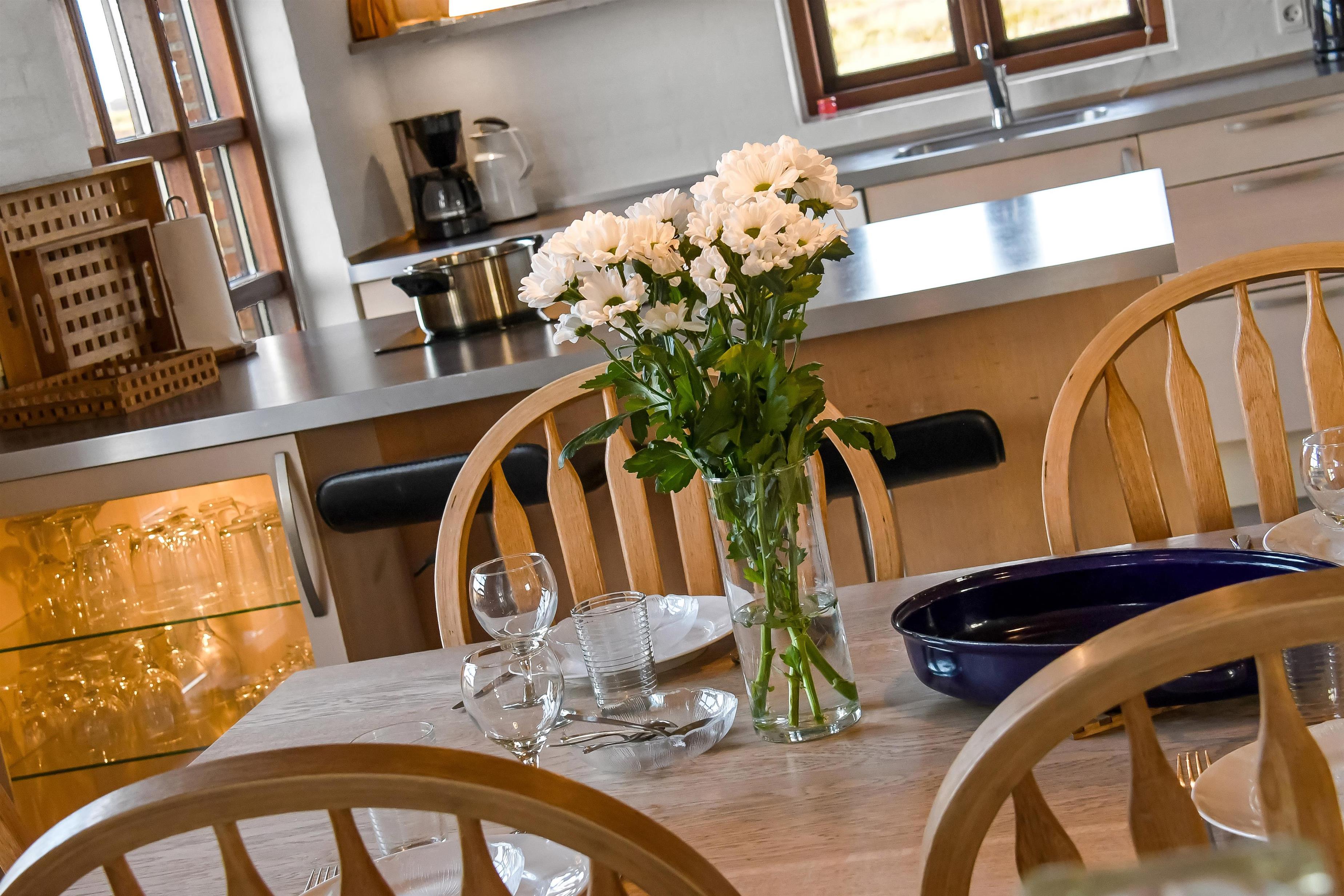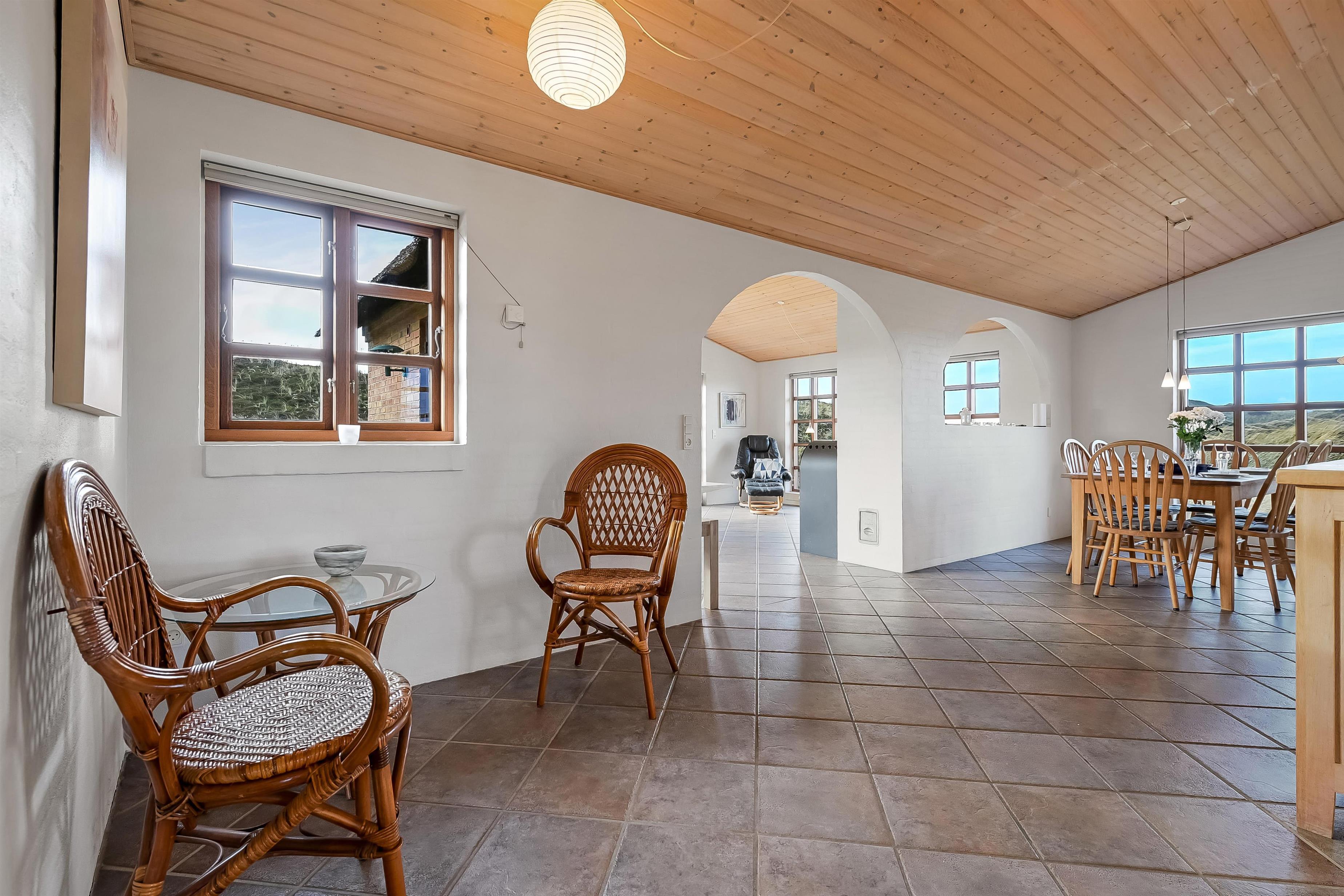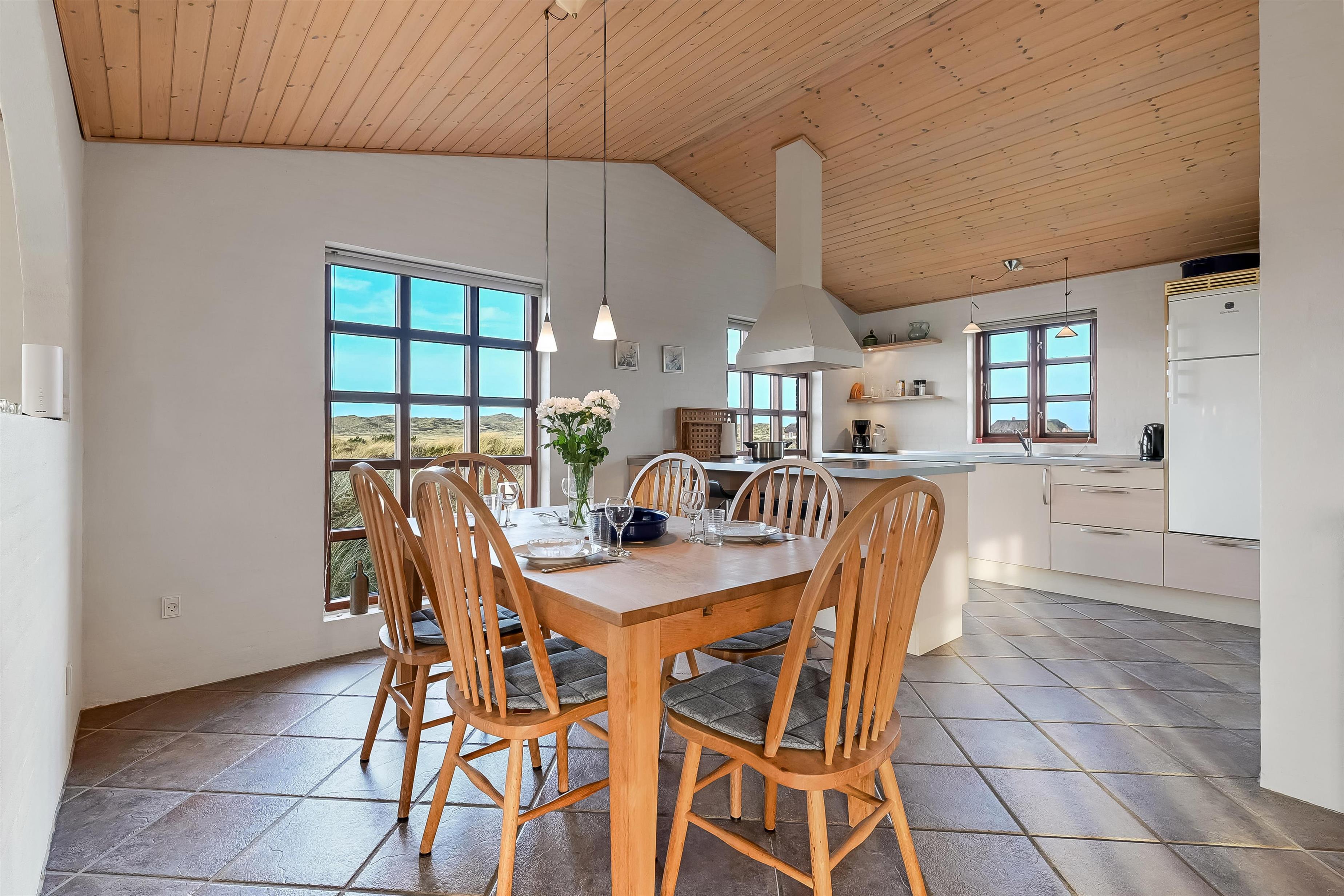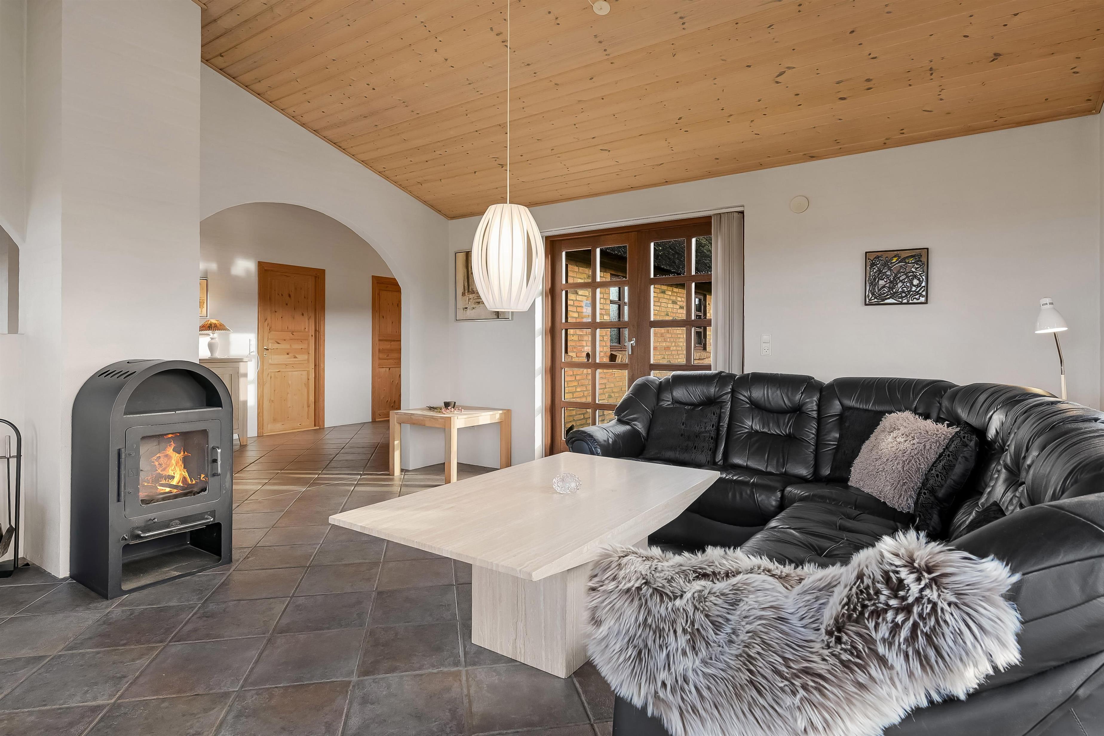 I det åbne køkken/alrum kan hele familien samles – her er der god plads, klinkegulve med gulvvarme og brændeovn, som spreder varme og feriestemning på de kølige dage.