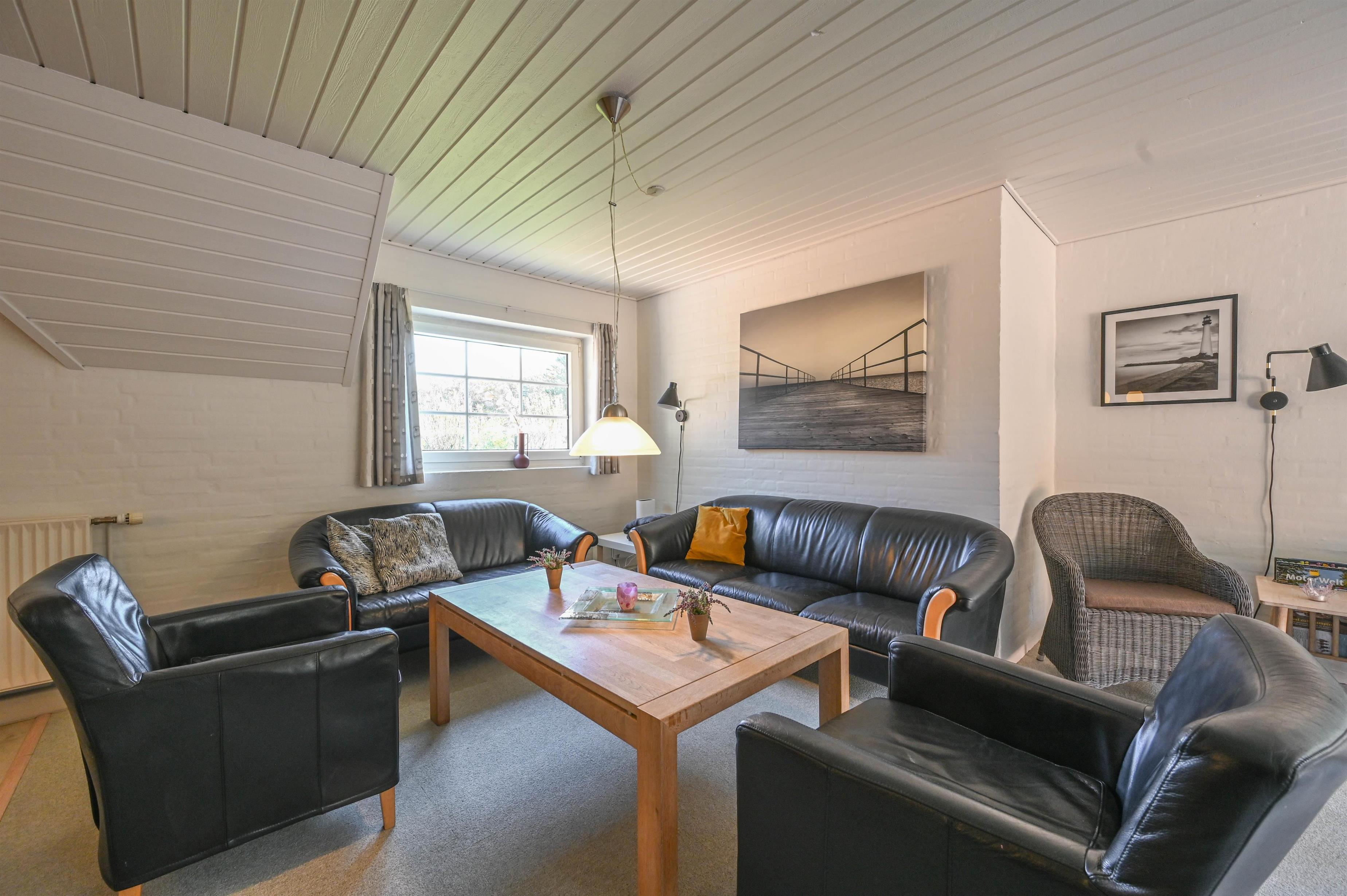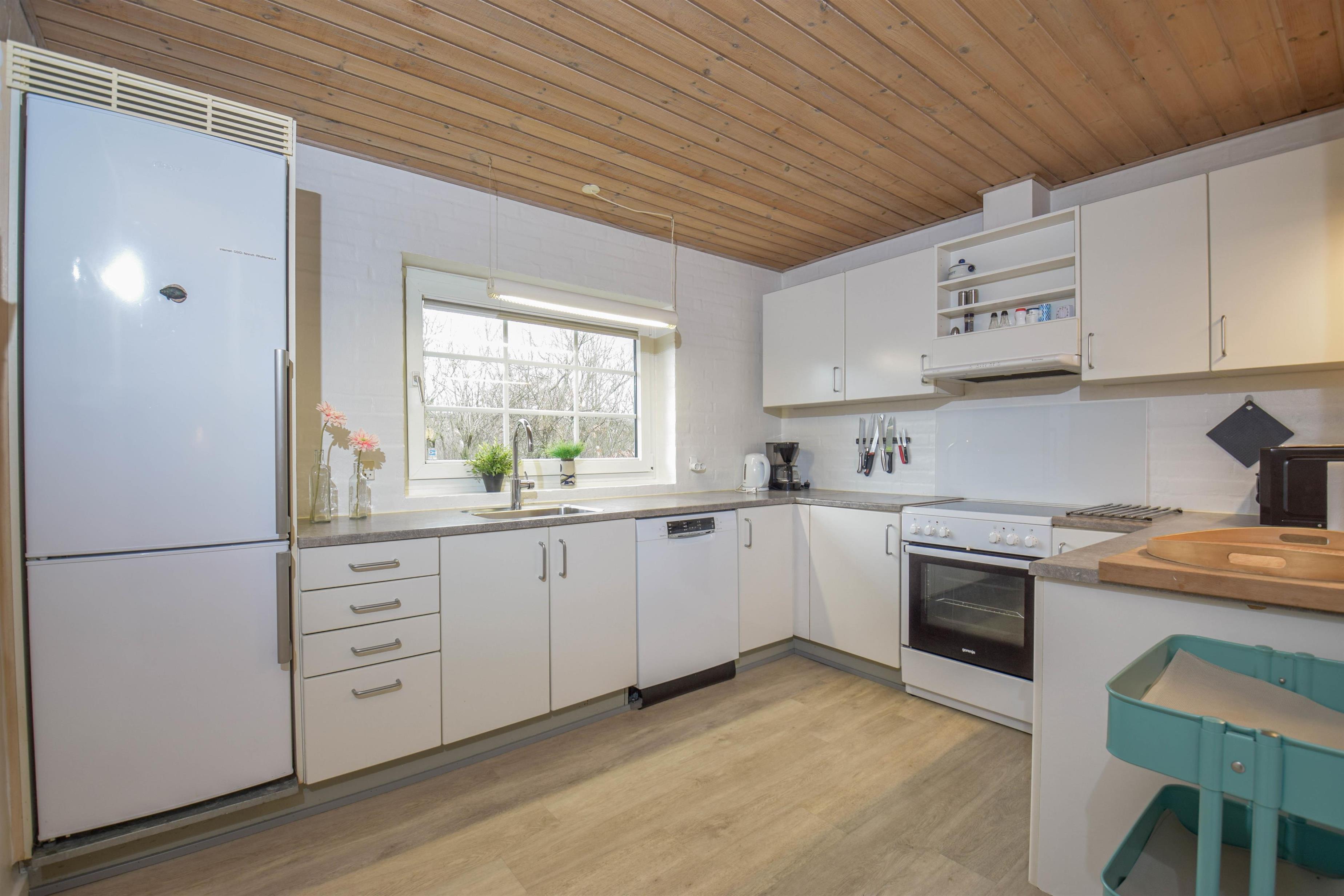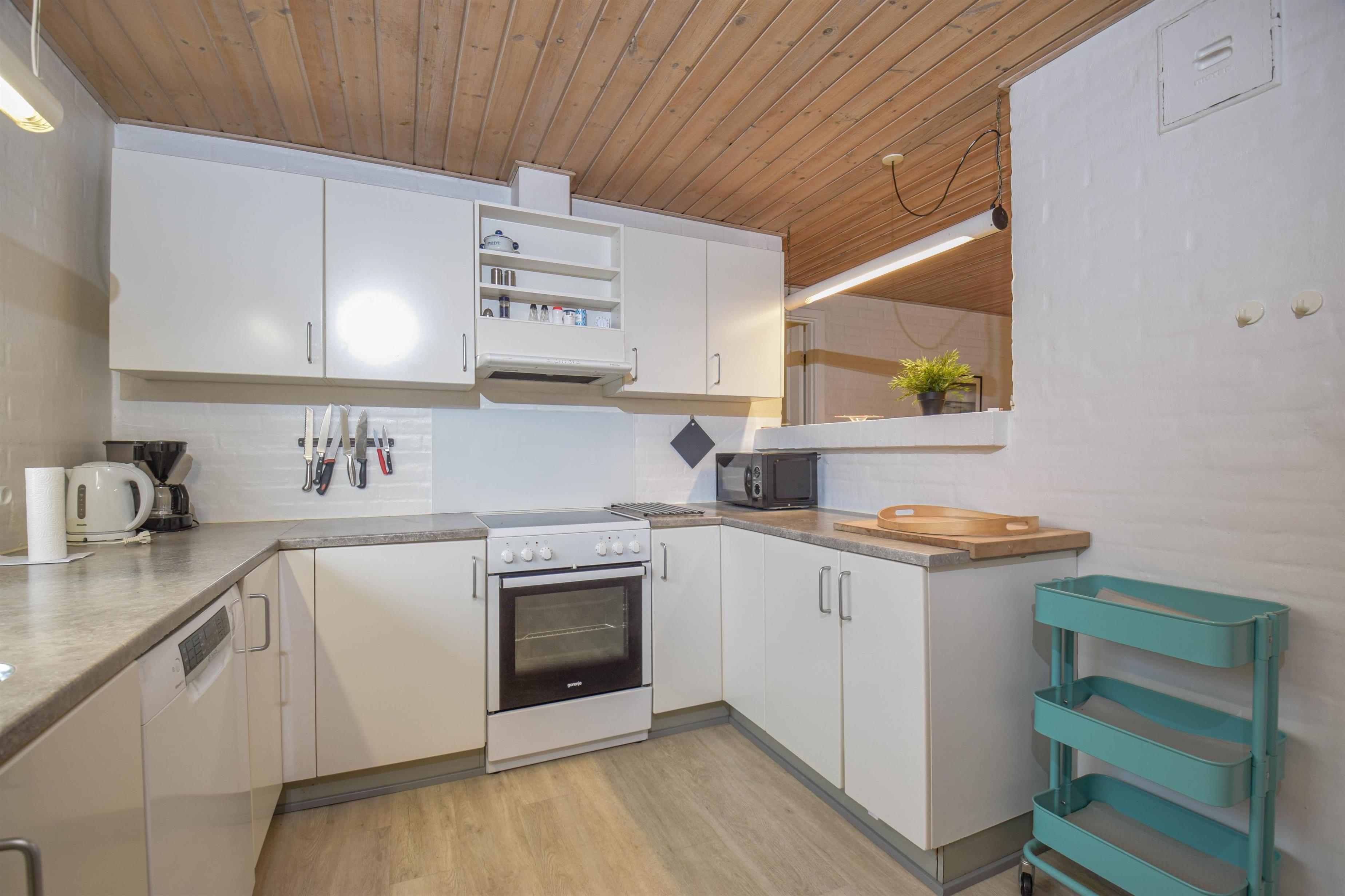 Køkkenet er veludstyret og ligger i åben forbindelse med stuen, som er indrettet med lædermøbler, stort spisebord og brændeovn – perfekt til hyggelige fællesmiddage og lange aftener.