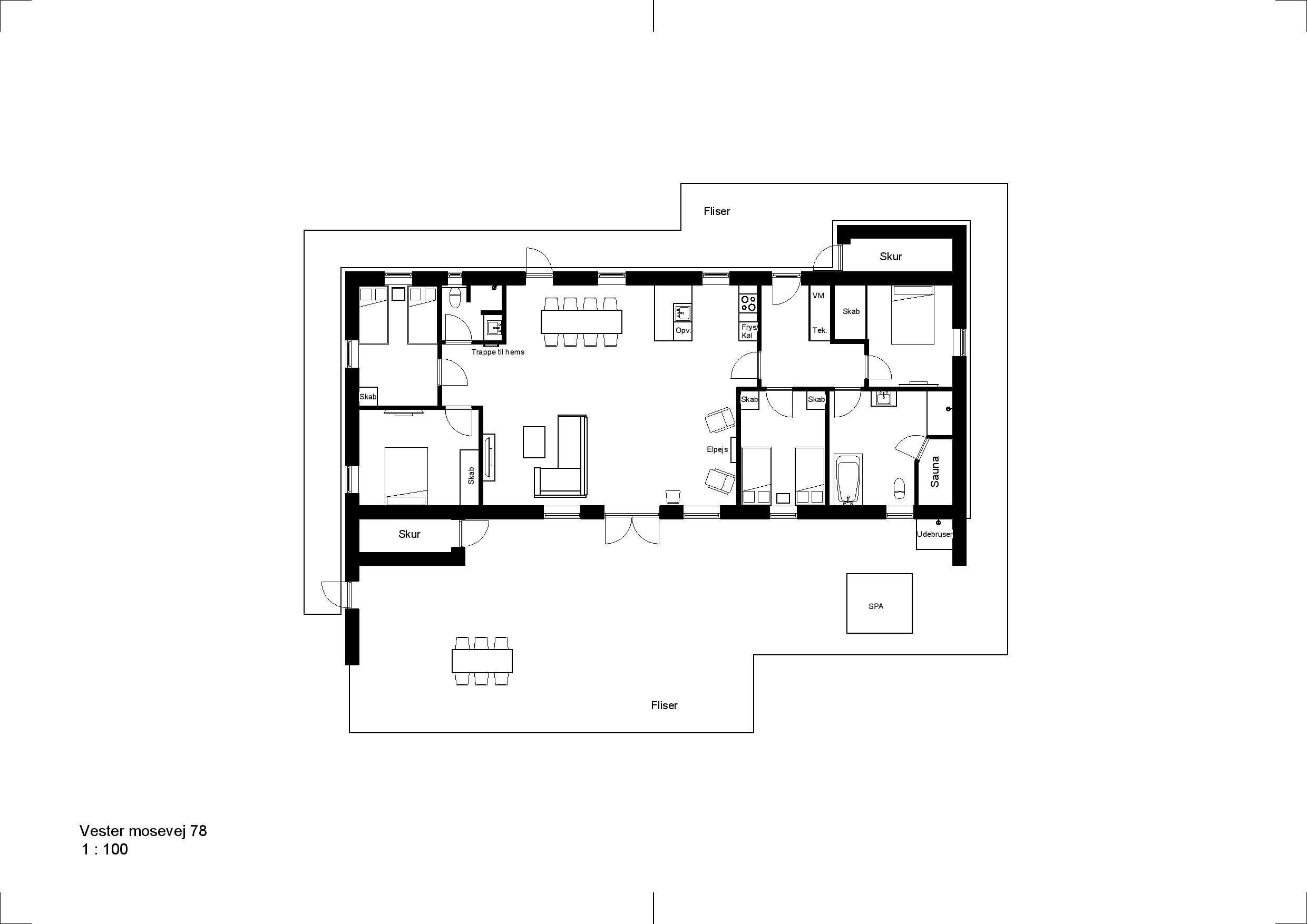 Fra det store alrum har I direkte udgang til den store terrasse. Her er der masser af plads til at nyde dagene, enten på en solseng eller i de gode havemøbler. Det er udespa i det ene hjørne af terrassen, hvor man kan sidde og nyde al slags vejr, uden at fryse.