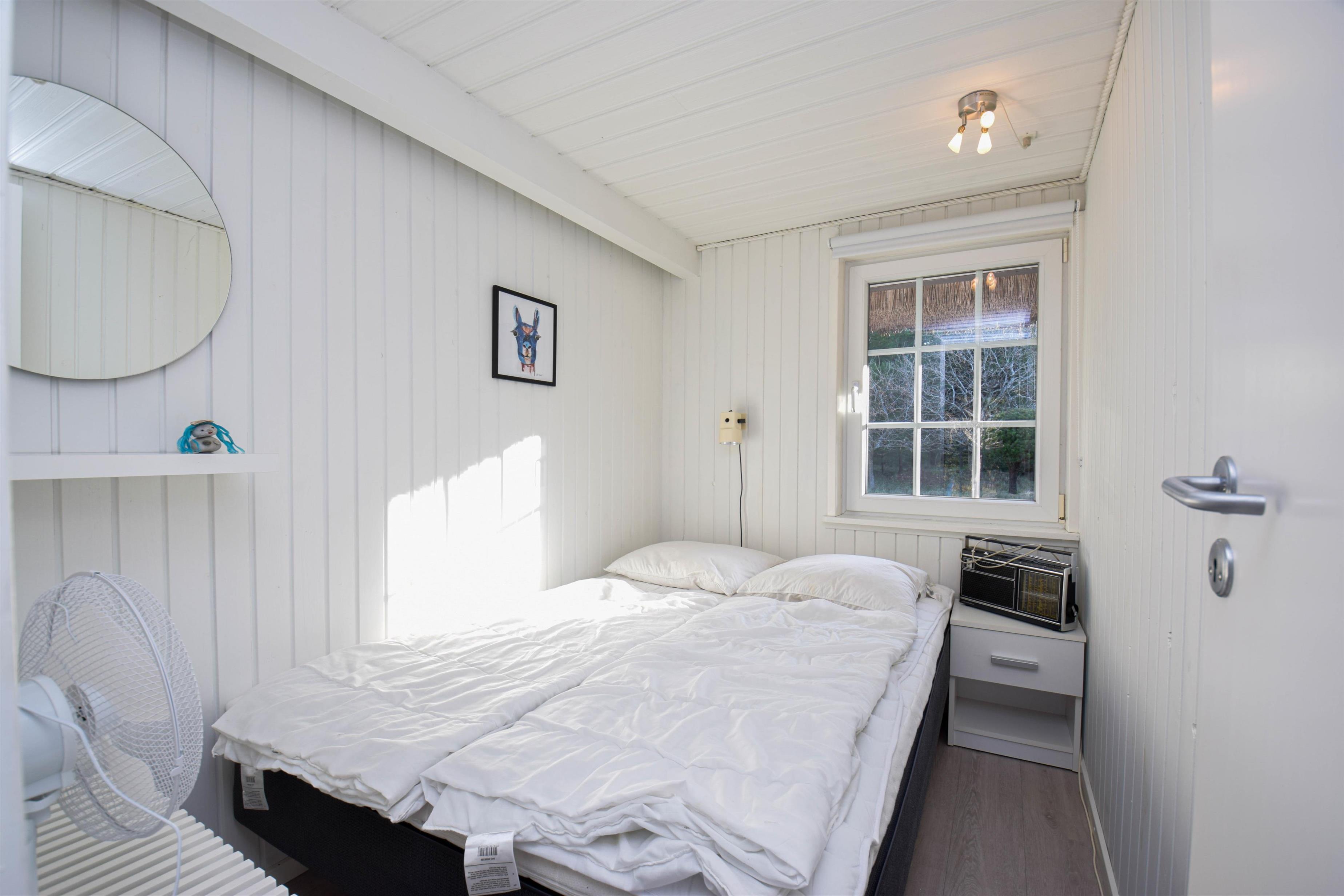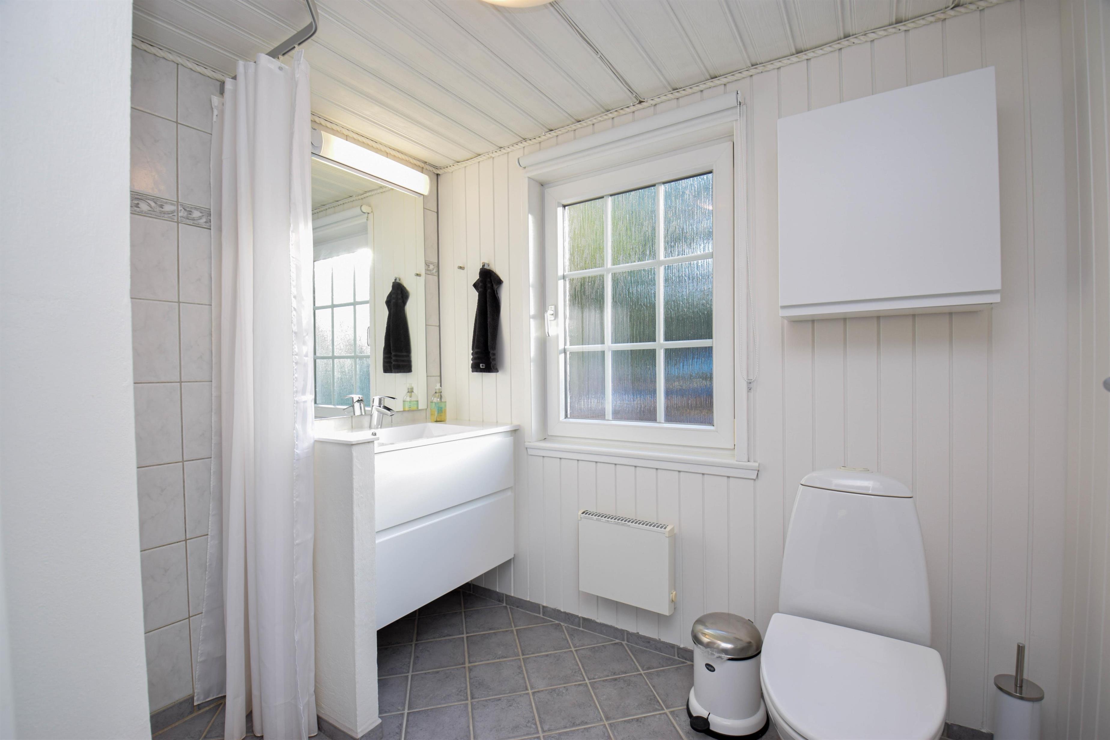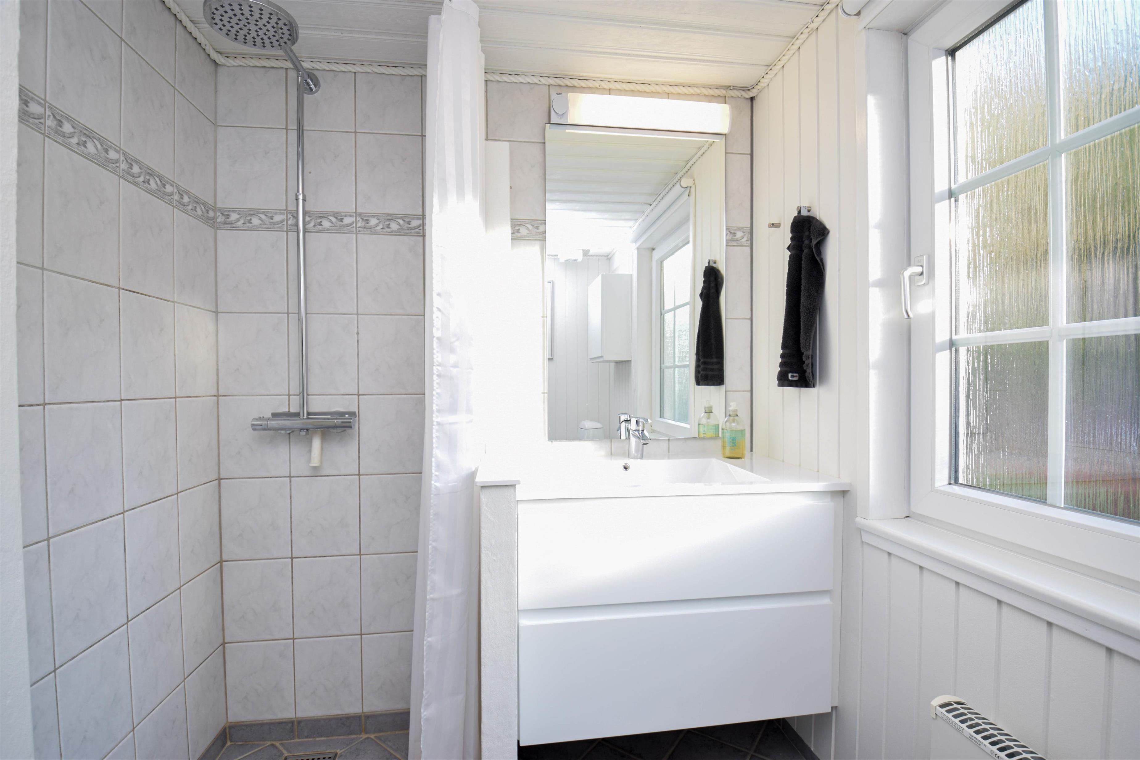 Huset har et lyst badeværelse med rummeligt brusehjørne samt to soveværelser – ét med dobbeltseng og ét med trekvartseng.