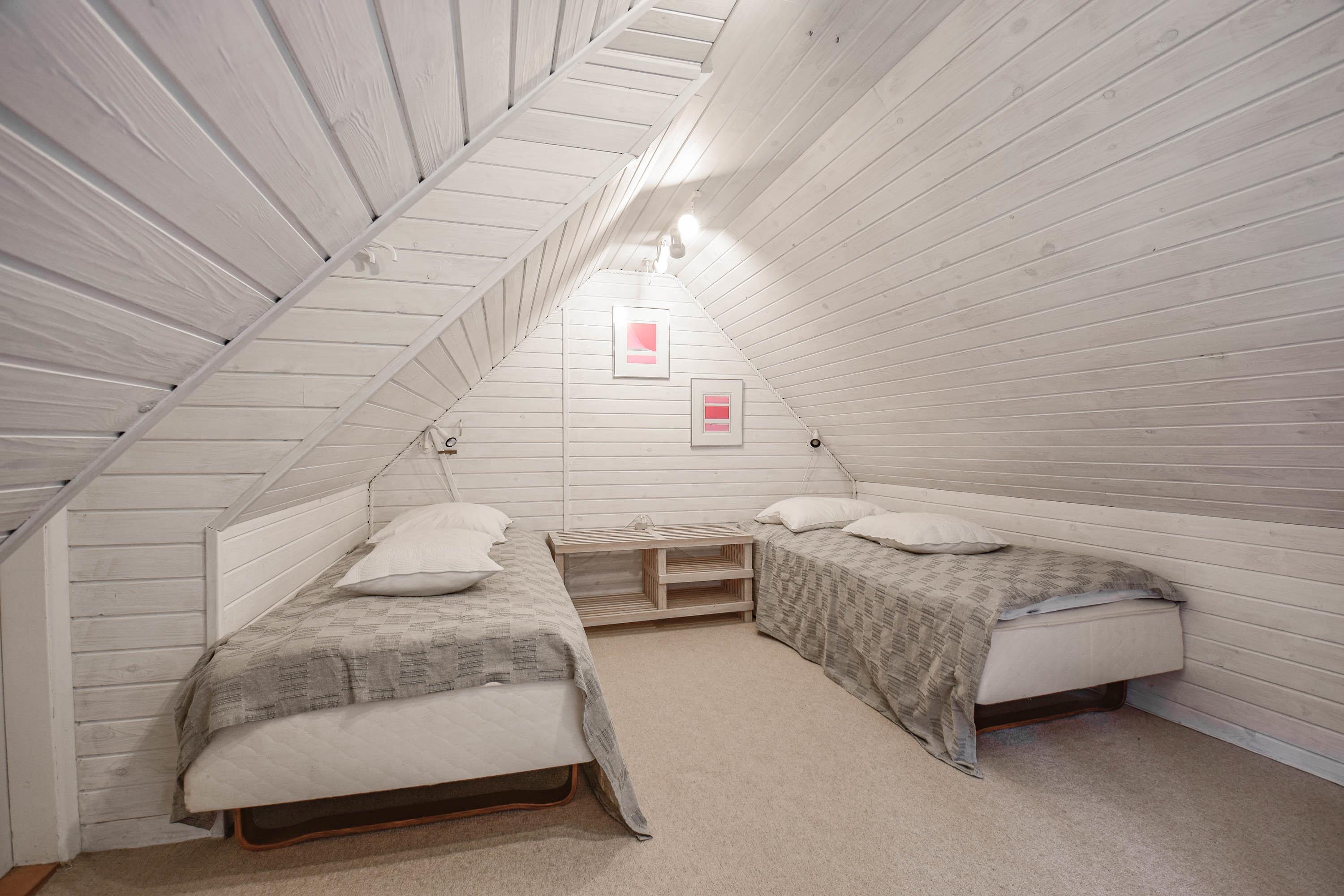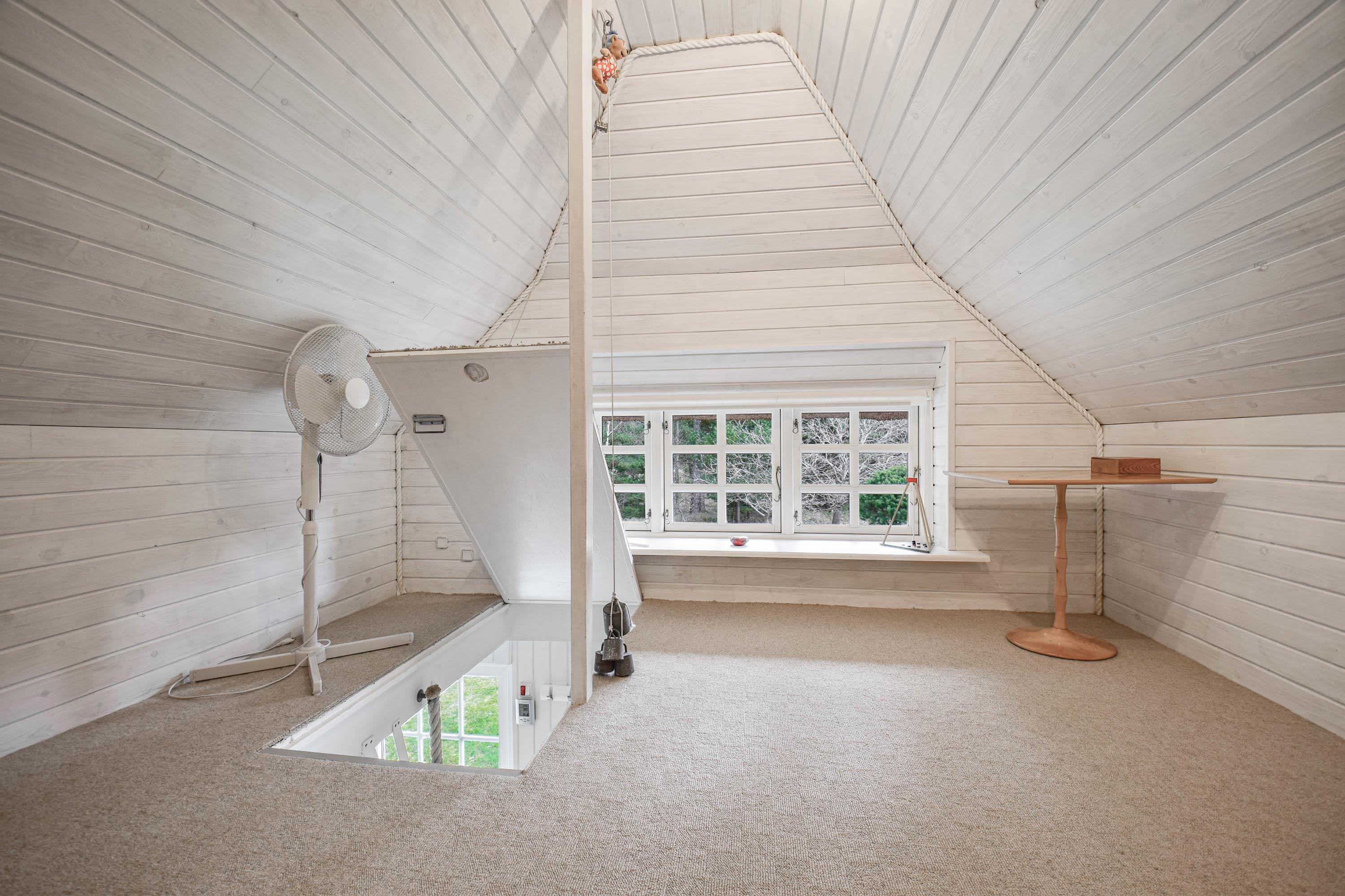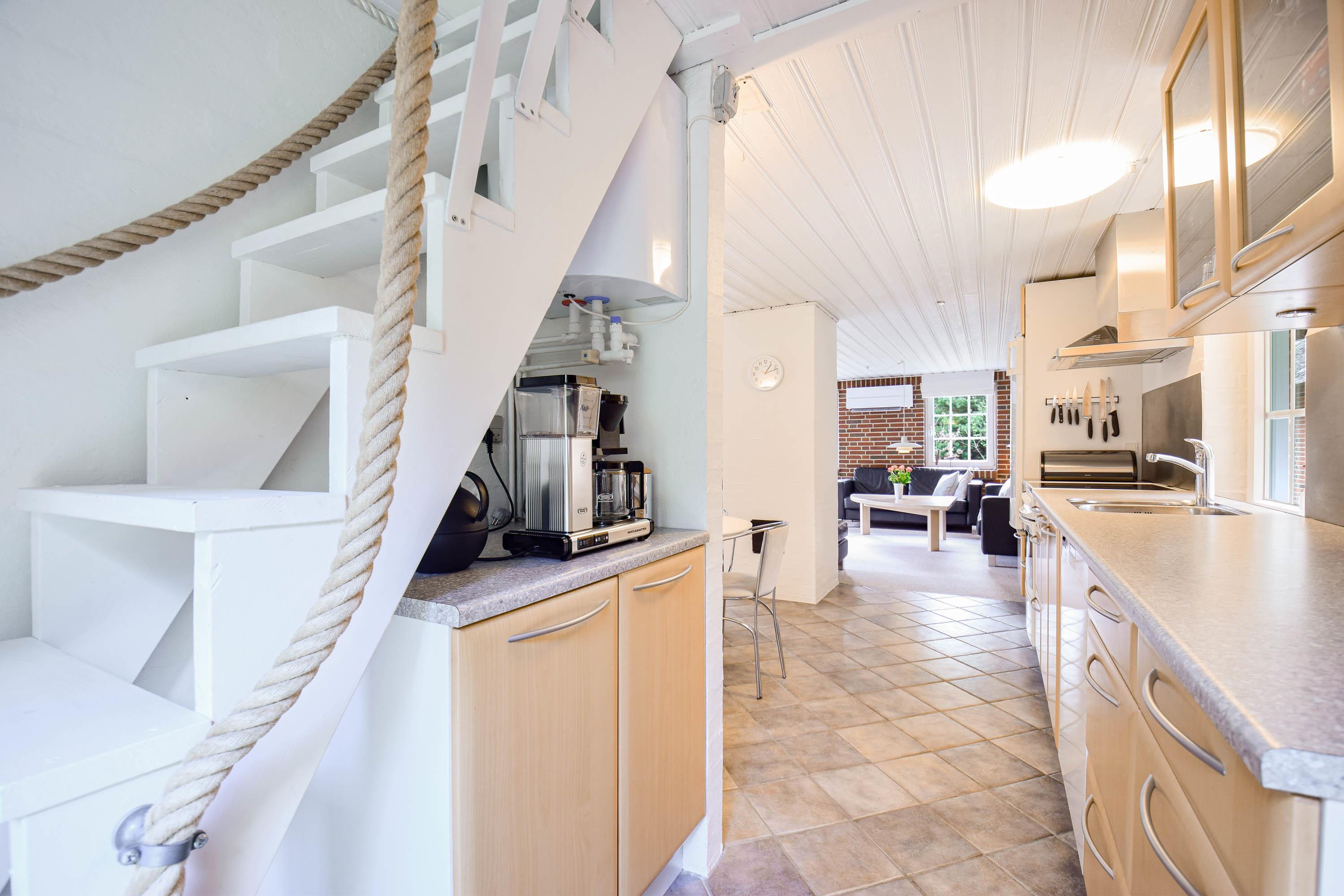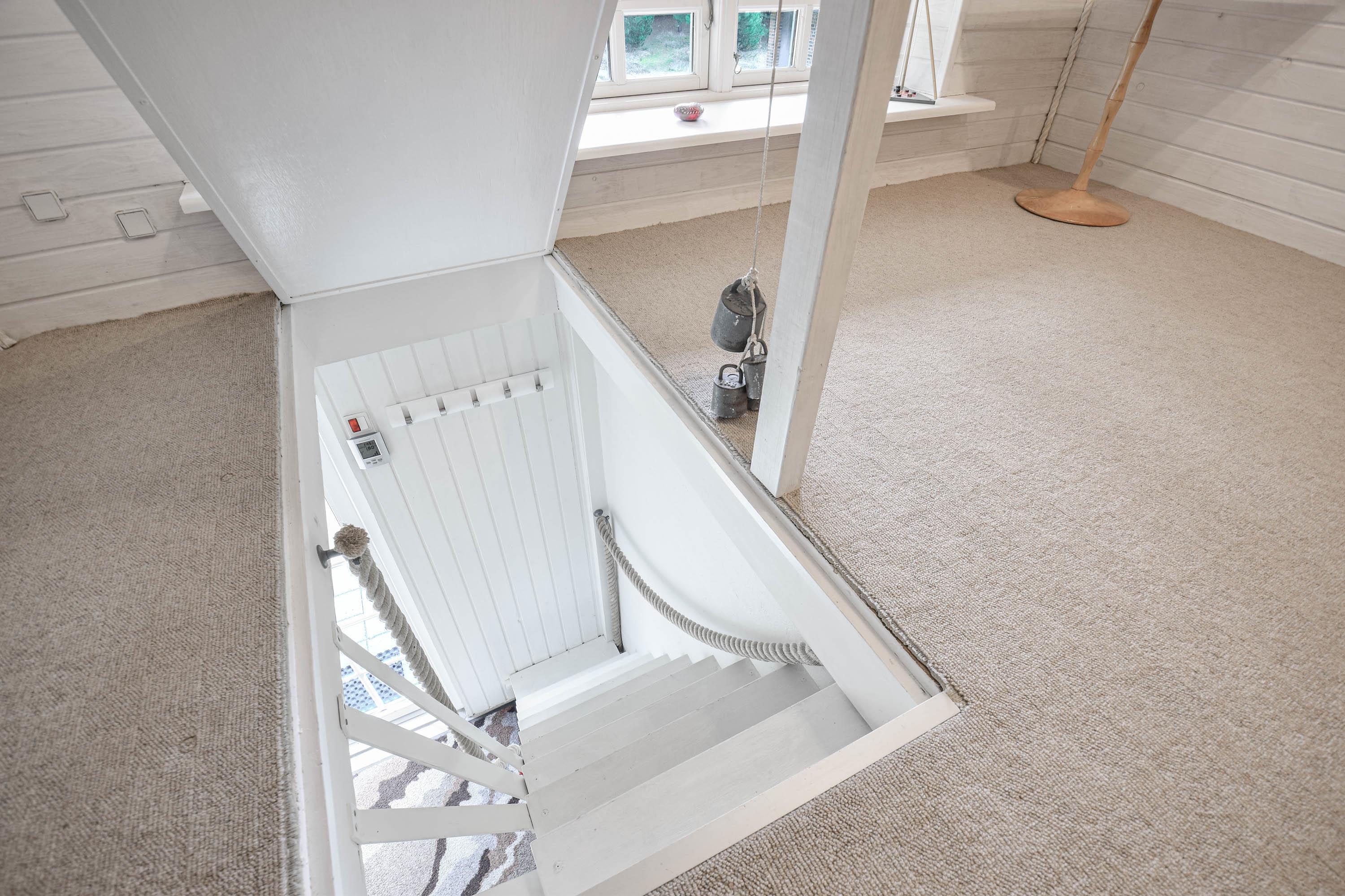 Fra køkkenet fører en smal trappe op til 1. sal, hvor et hyggeligt værelse med to enkeltsenge er indrettet – perfekt til børn eller gæster.