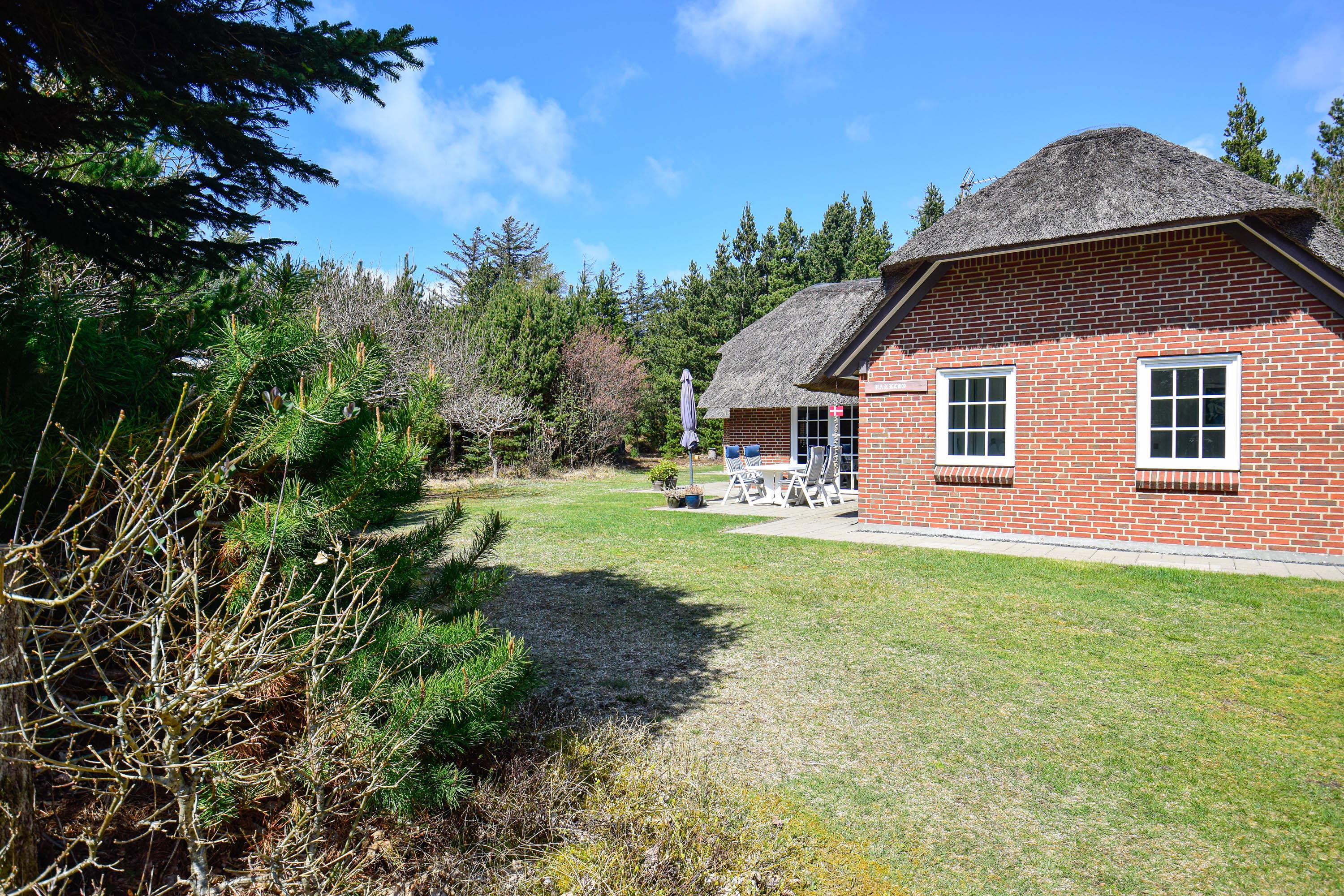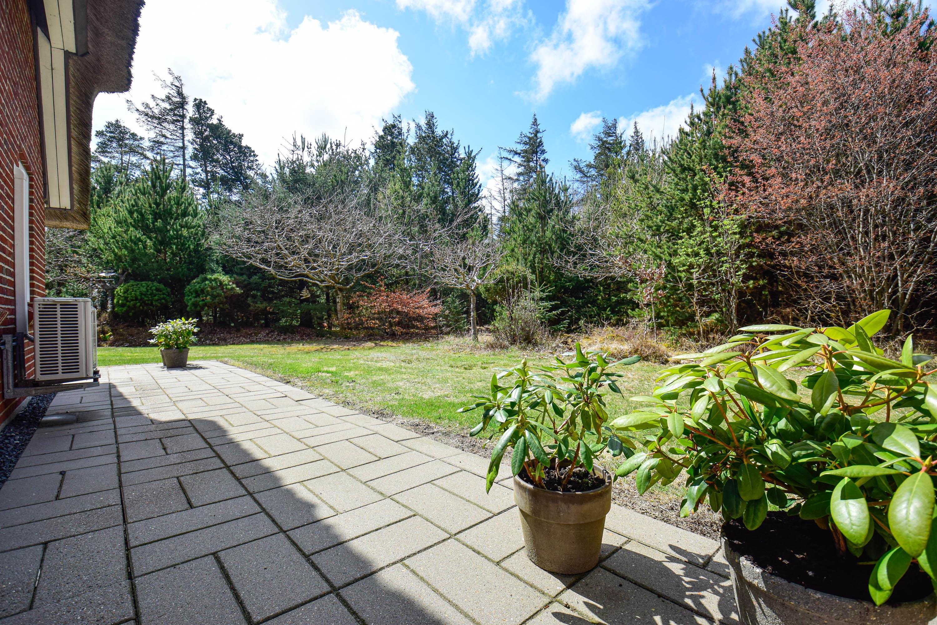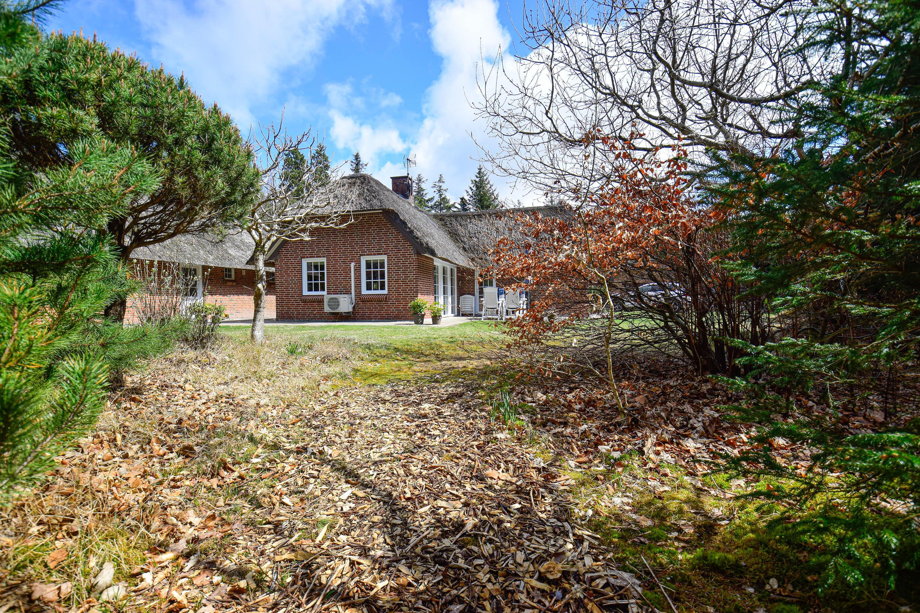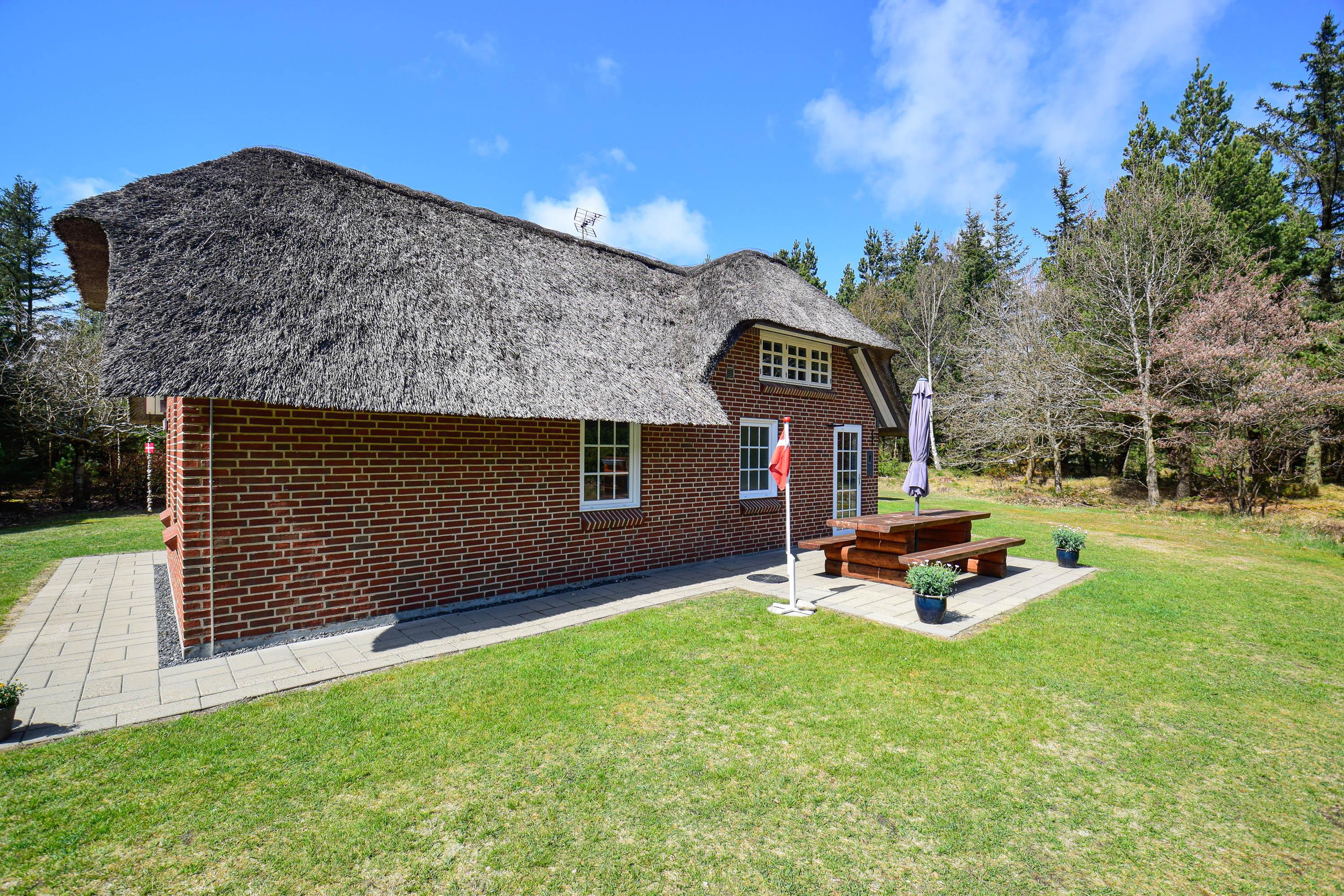 For enden af en rolig, lukket sidevej, omgivet af træer og buske, ligger dette dejlige feriehus midt i den vestjyske natur.