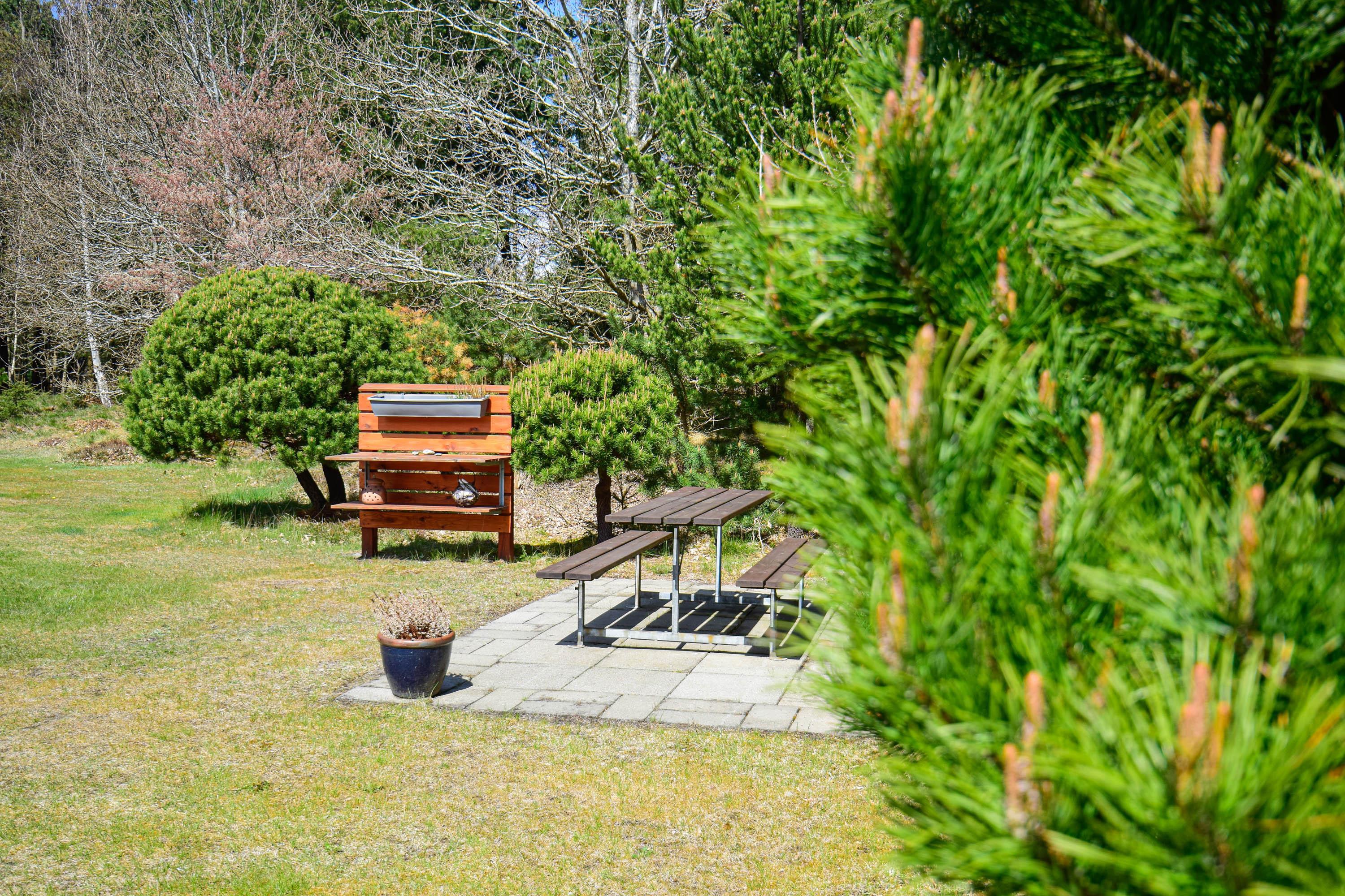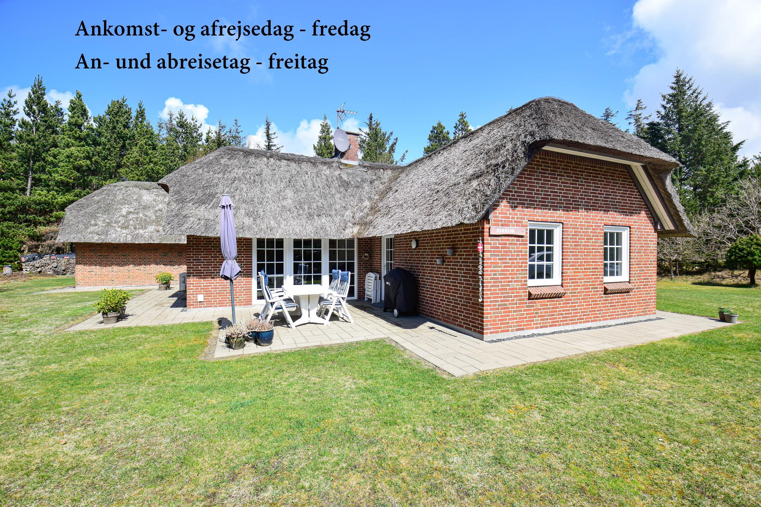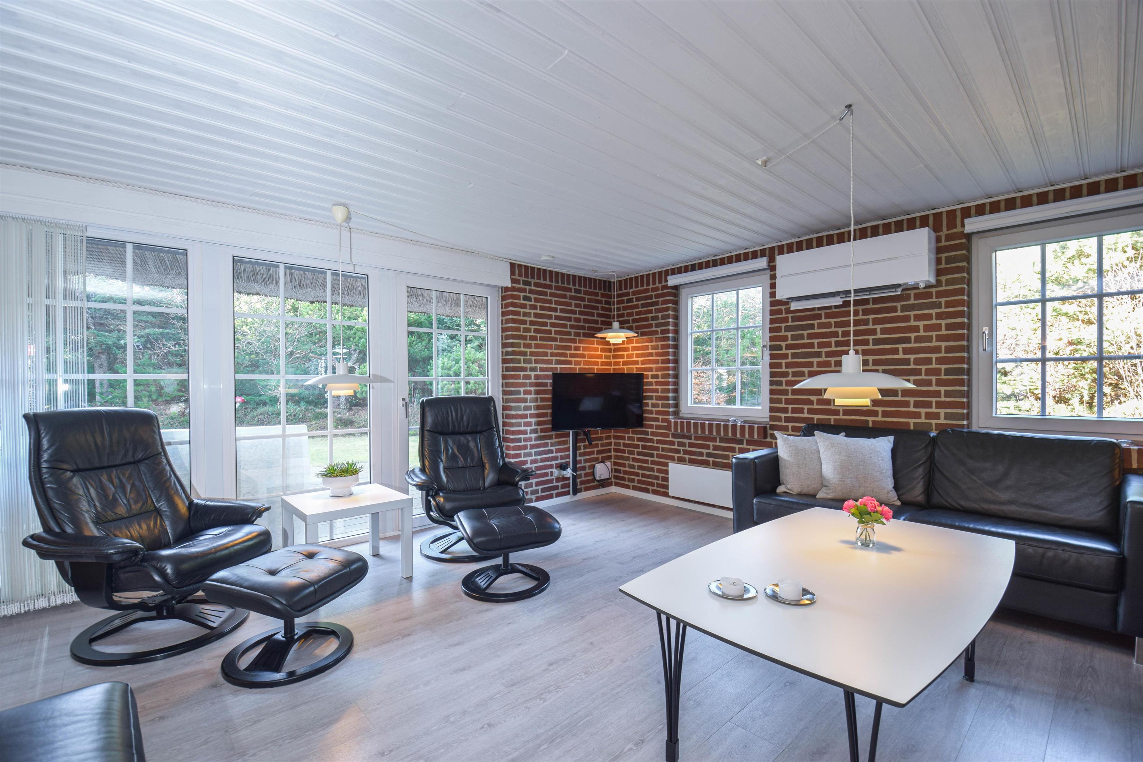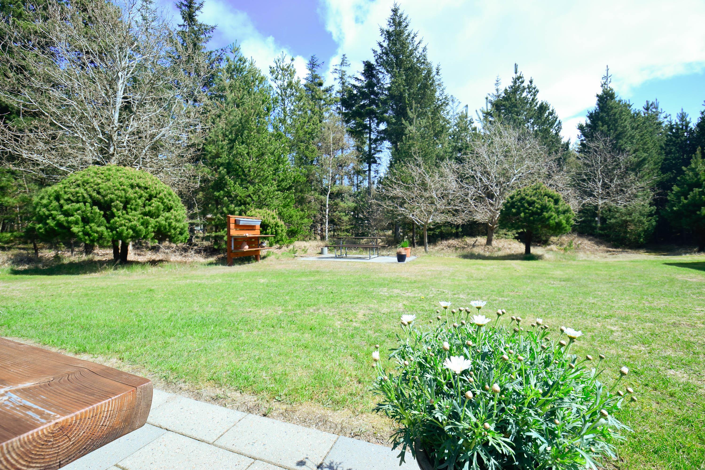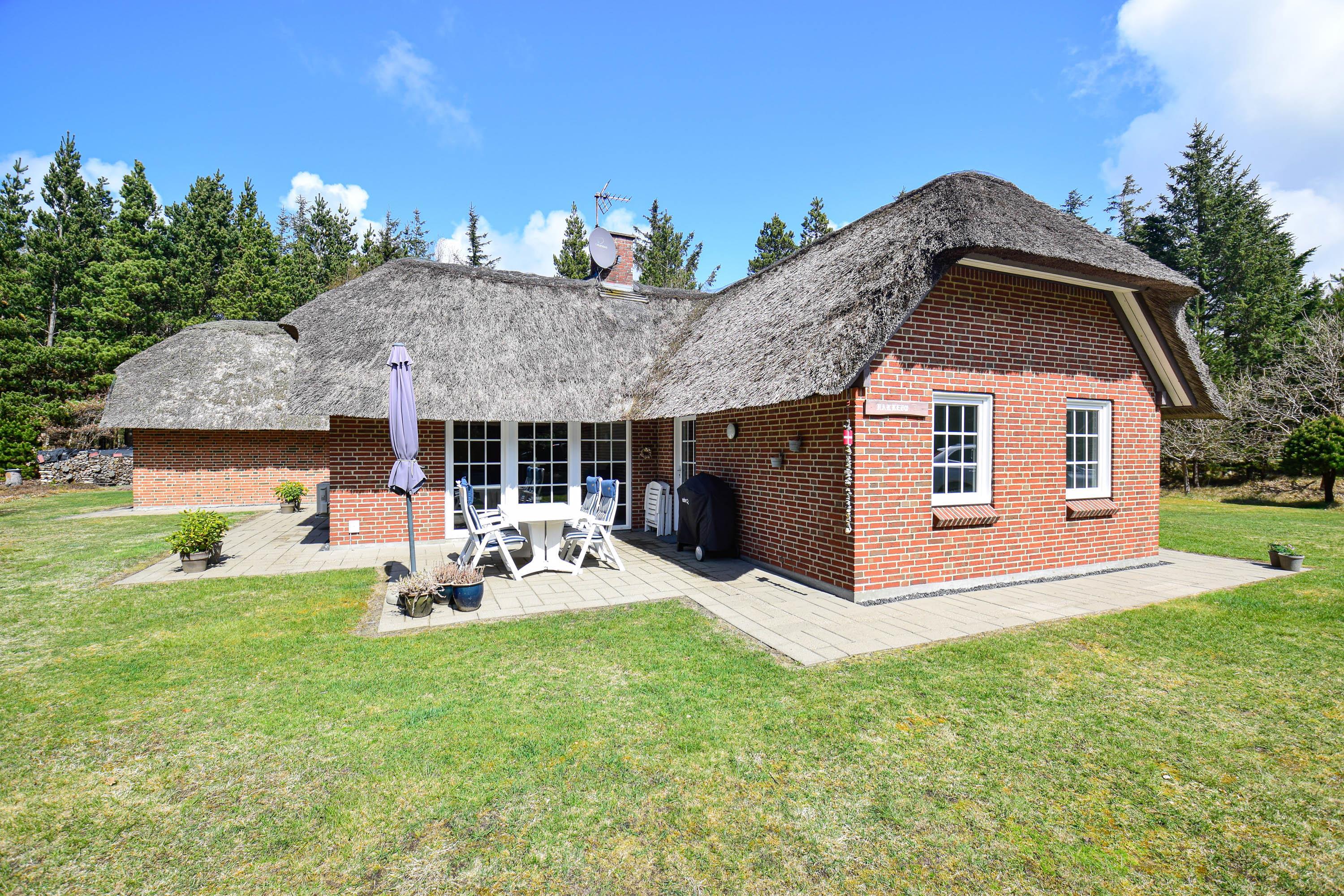 For enden af en rolig, lukket sidevej, omgivet af træer og buske, ligger dette dejlige feriehus midt i den vestjyske natur.