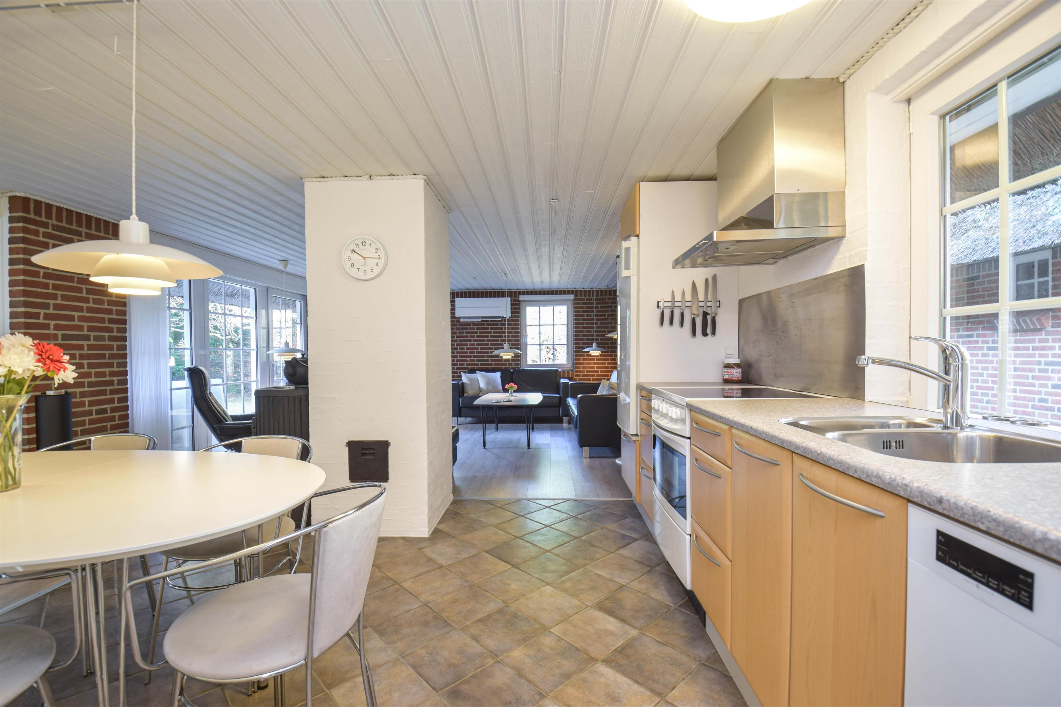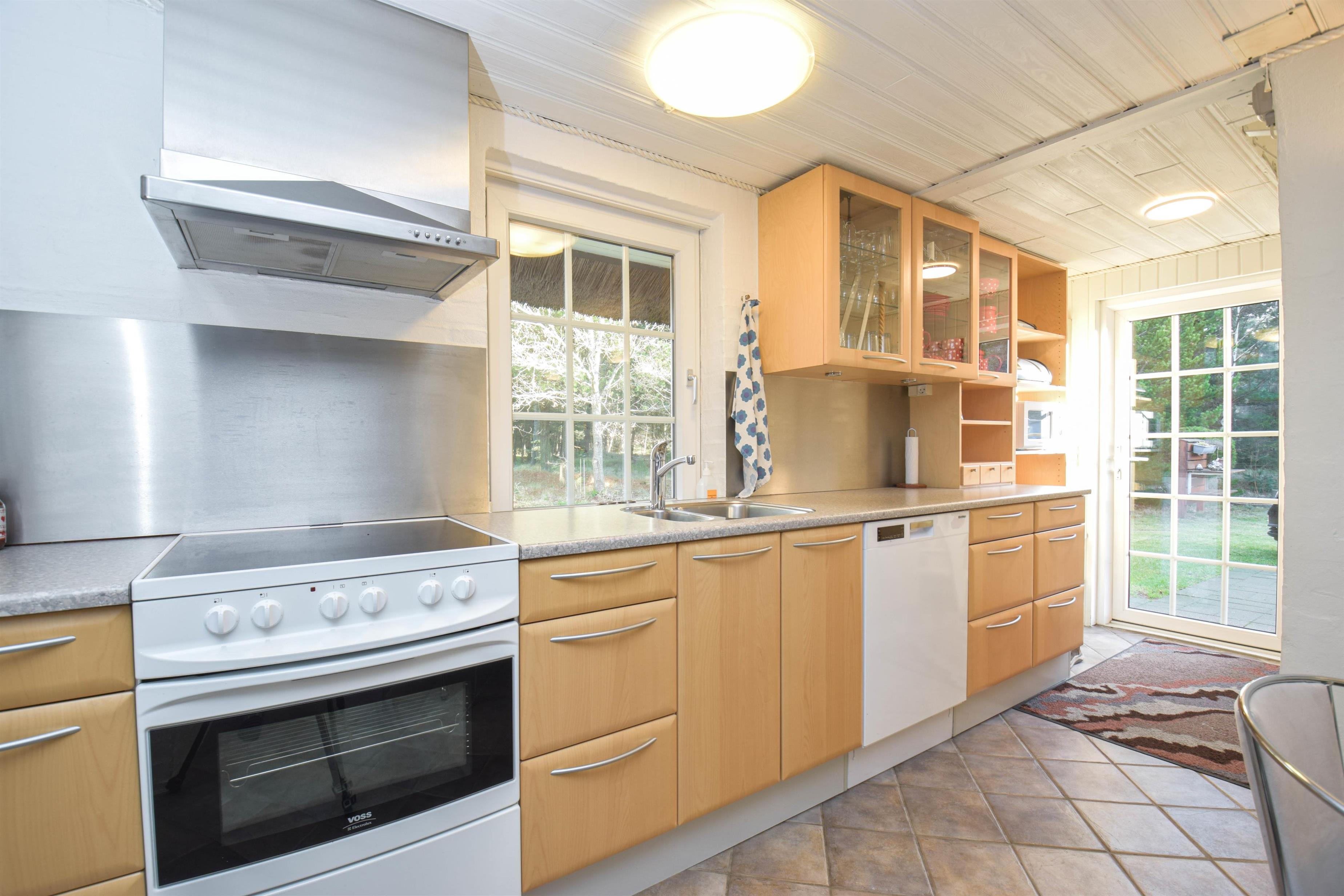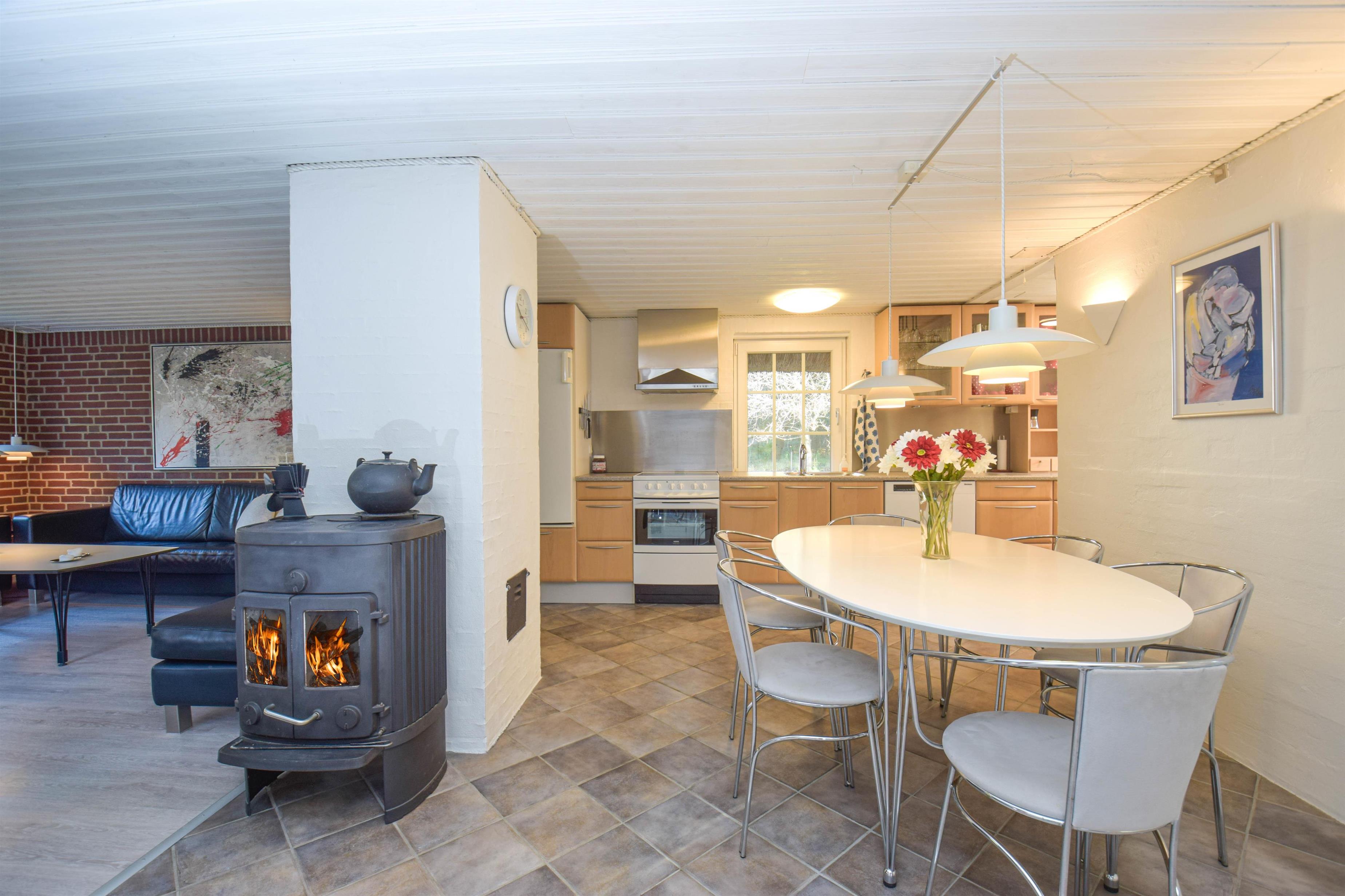 Køkkenet ligger i åben forbindelse med spiseplads og stue, hvor gode møbler, TV og en brændeovn sørger for både hygge og varme.