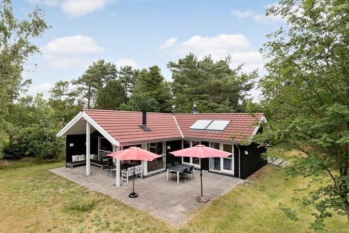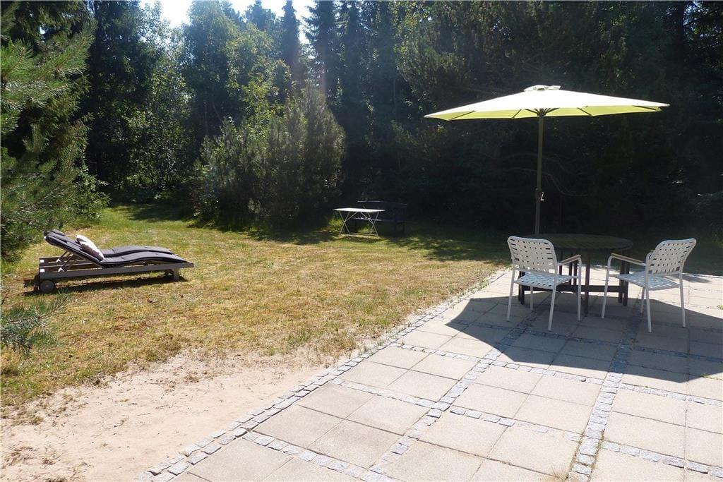 Haven ligger ugenert omgivet af høje træer og rummer plads nok til leg og aktivitet. Det store terrasseareal giver både mulighed for at sidde under halvtaget eller i det fri, ligesom liggestolene kan flyttes rundt efter solens bane dagen igennem. Den udendørs solopvarmede bruser vil du nyde at skylle dig under efter en tur i havet. Vinkelhuset ligger på en stille blind vej, og der er masser af gode spadseremuligheder og cykelture tæt på strandområdet.