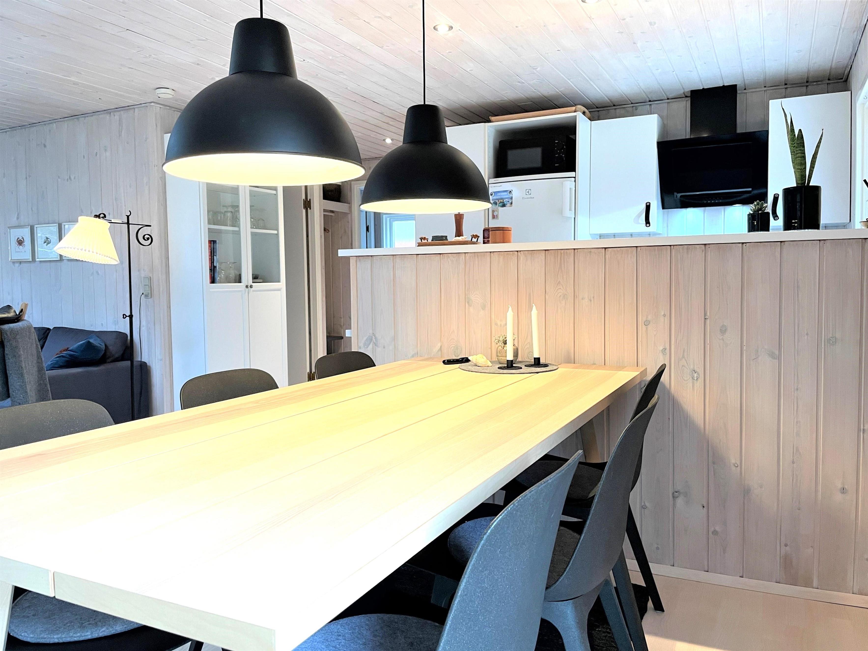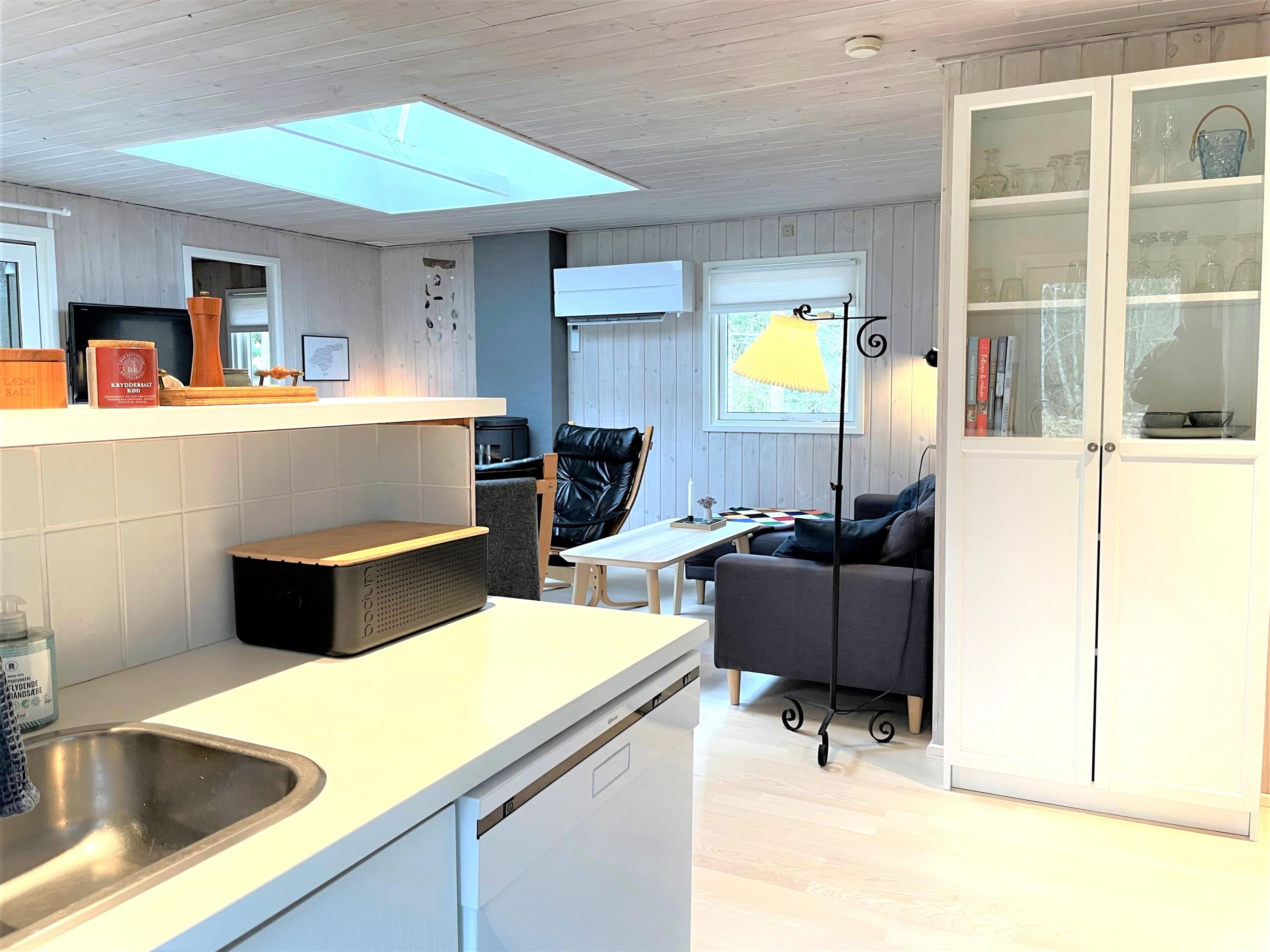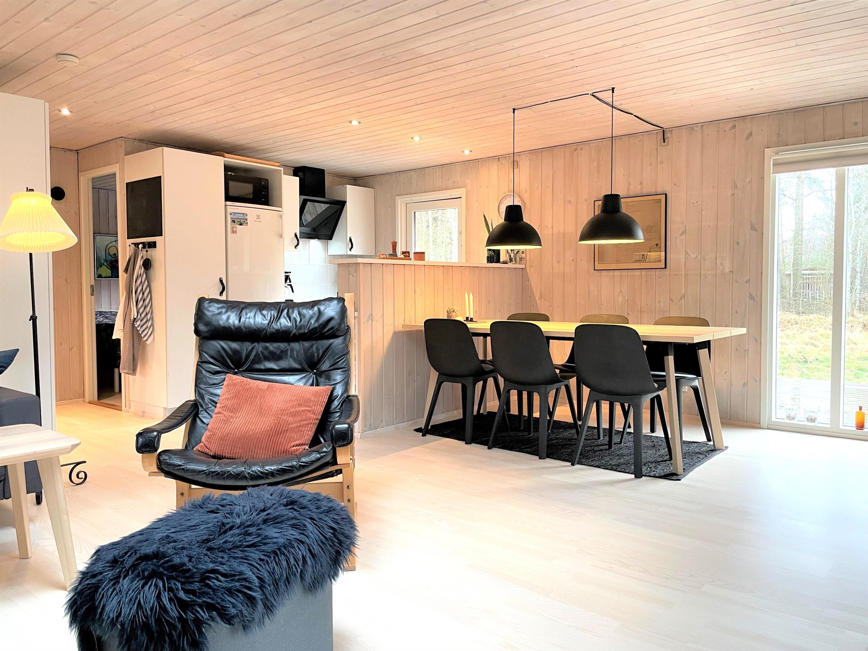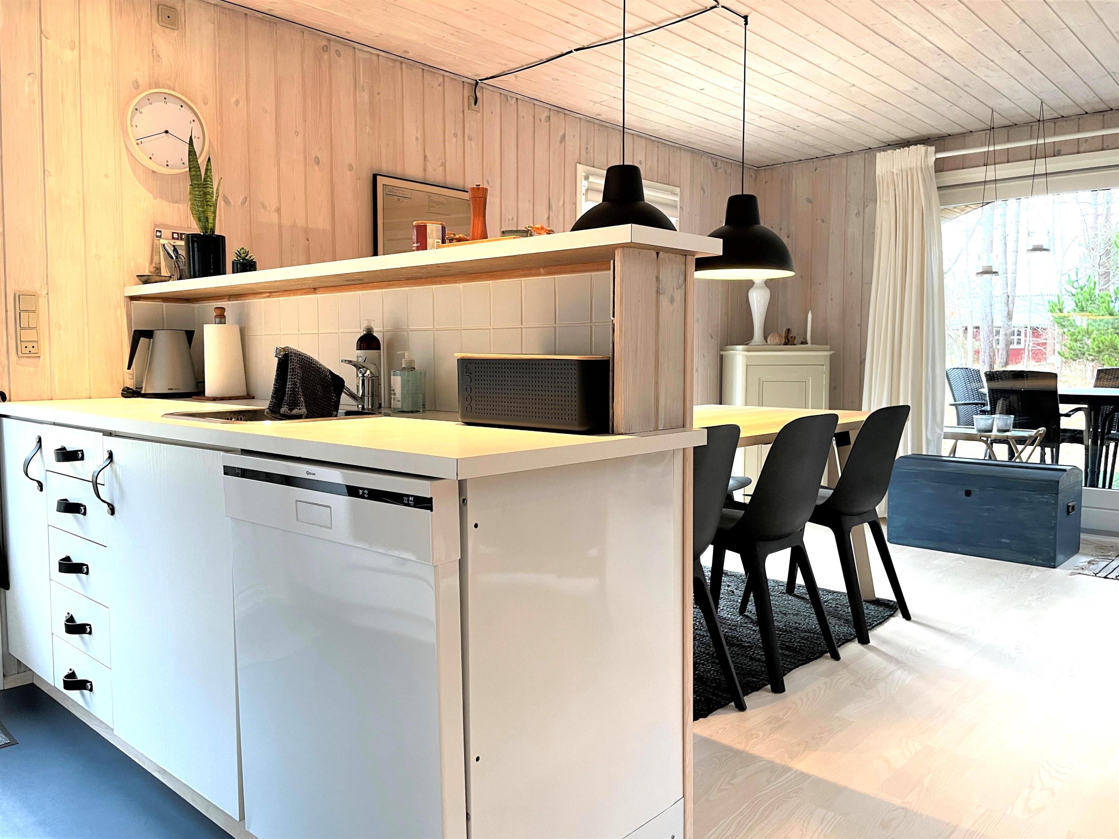 Huset har et funktionelt og veludstyret køkken i forbindelse med dejlig spiseplads. Tre gode soveværelser, hvoraf to værelser har dobbeltsenge og et værelse har køjeseng. Helt nyt badeværelse med gulvvarme. I dette hus fornemmer man straks den smagfulde, komfortable indretning og muligheden for ren afslapning. Stuens store vinduespartier og ovenlysvinduer skaber et flot lysindfald og fra stuen er der udgang til den store 50 kvm træterrasse, hvor flere sæt behagelige havemøbler og grill skaber den hyggelige sommerhusatmosfære. Her kan terrassevarmeren også benyttes. Fin shelter til rådighed på grunden og udendørsbruser.