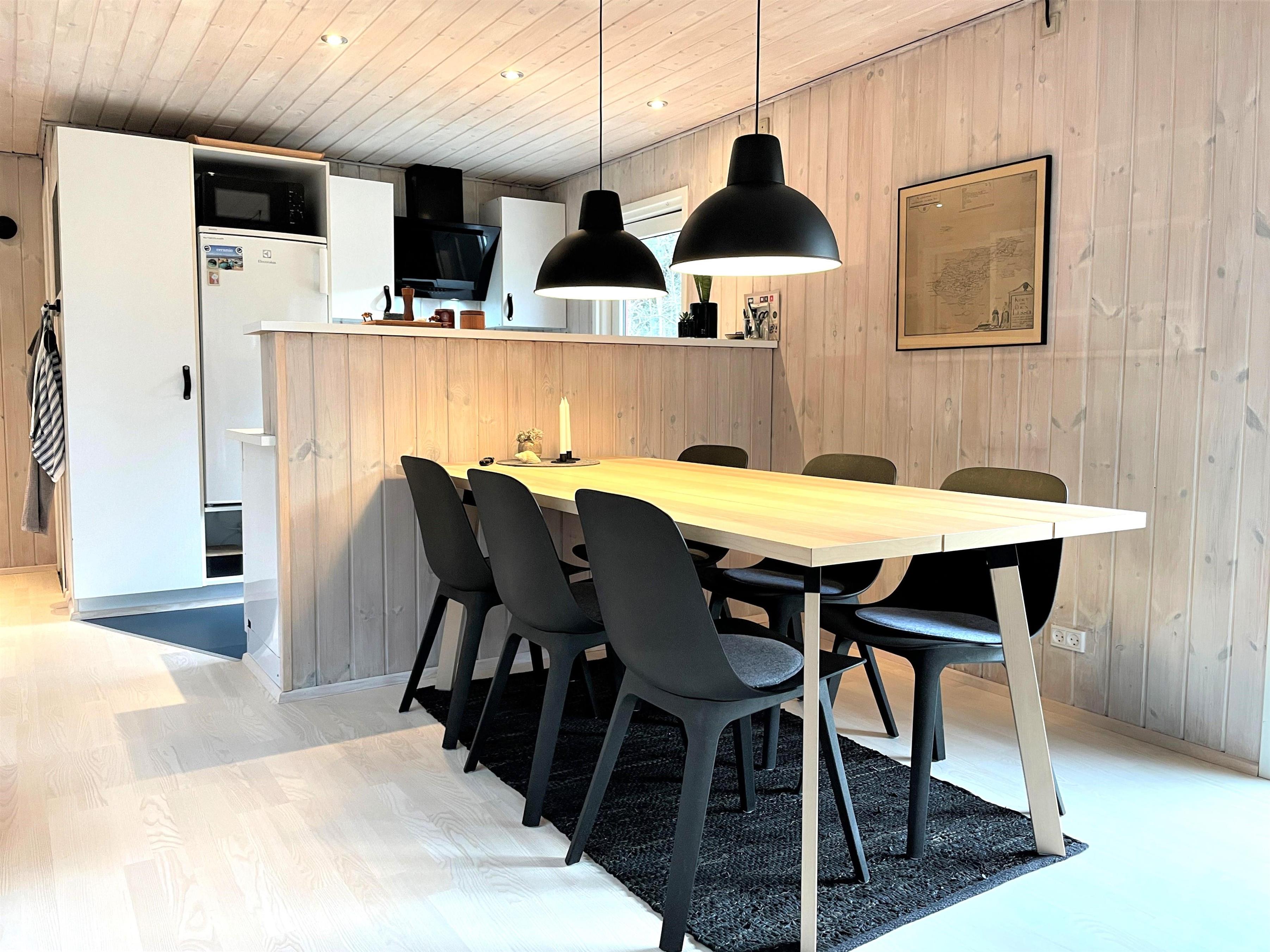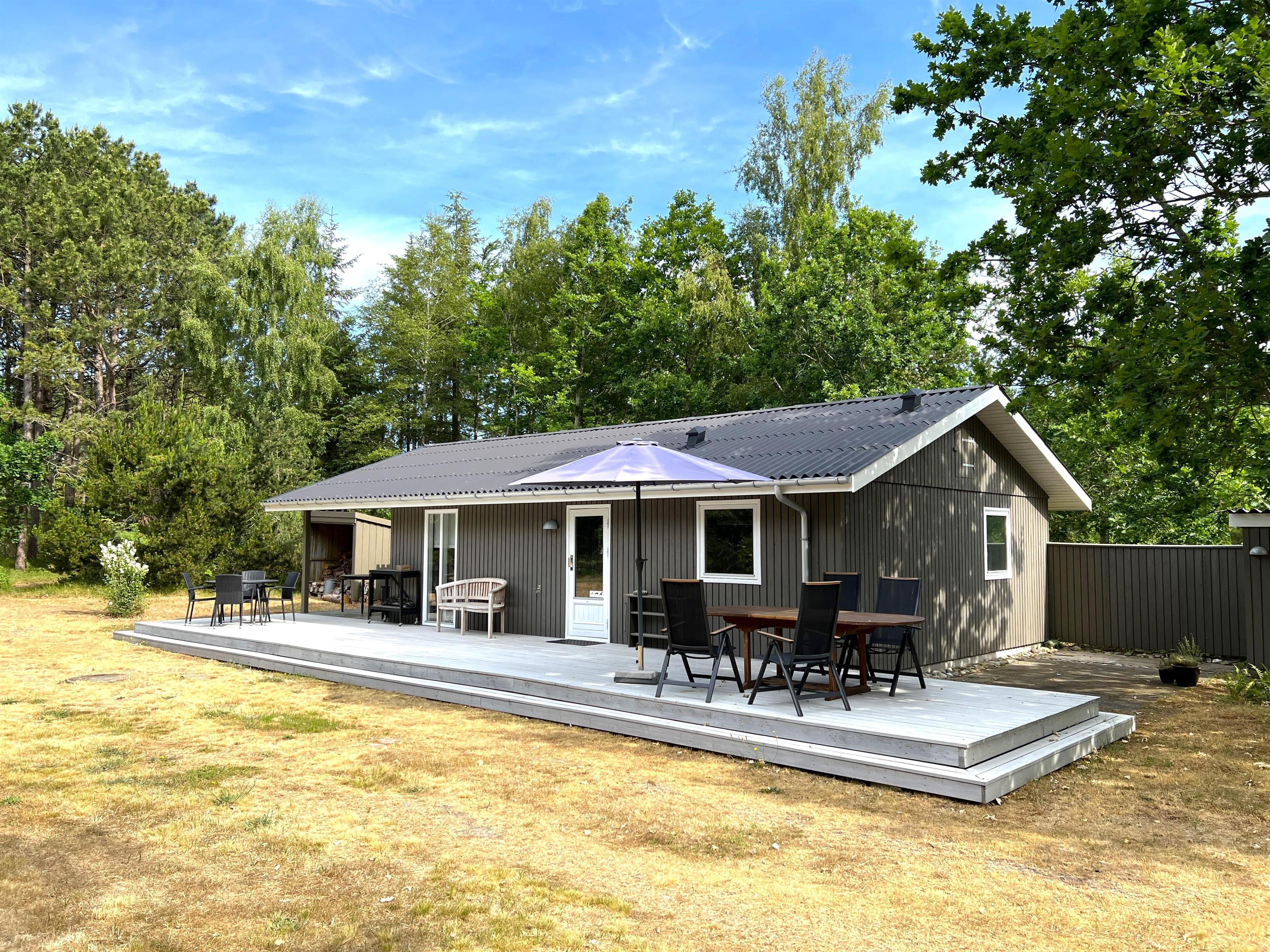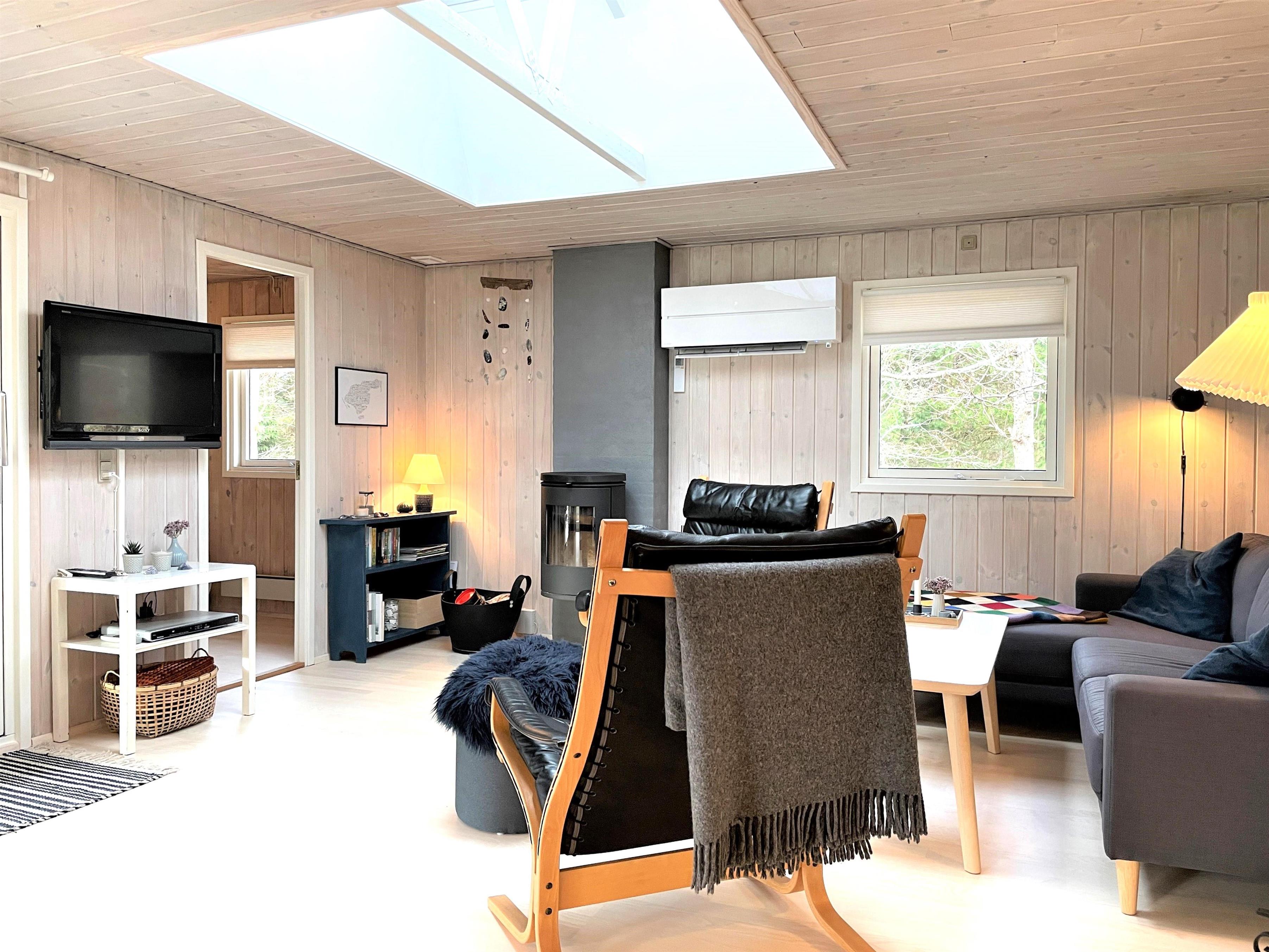 Huset har et funktionelt og veludstyret køkken i forbindelse med dejlig spiseplads. Tre gode soveværelser, hvoraf to værelser har dobbeltsenge og et værelse har køjeseng. Helt nyt badeværelse med gulvvarme. I dette hus fornemmer man straks den smagfulde, komfortable indretning og muligheden for ren afslapning. Stuens store vinduespartier og ovenlysvinduer skaber et flot lysindfald og fra stuen er der udgang til den store 50 kvm træterrasse, hvor flere sæt behagelige havemøbler og grill skaber den hyggelige sommerhusatmosfære. Her kan terrassevarmeren også benyttes. Fin shelter til rådighed på grunden og udendørsbruser.