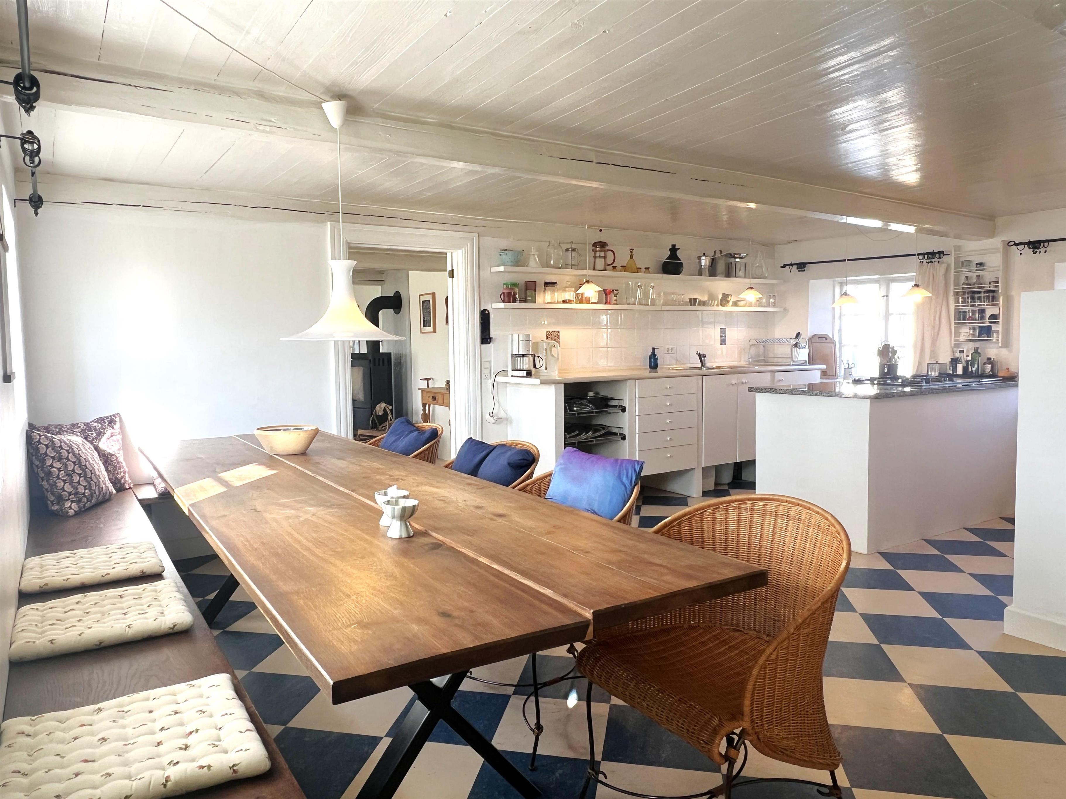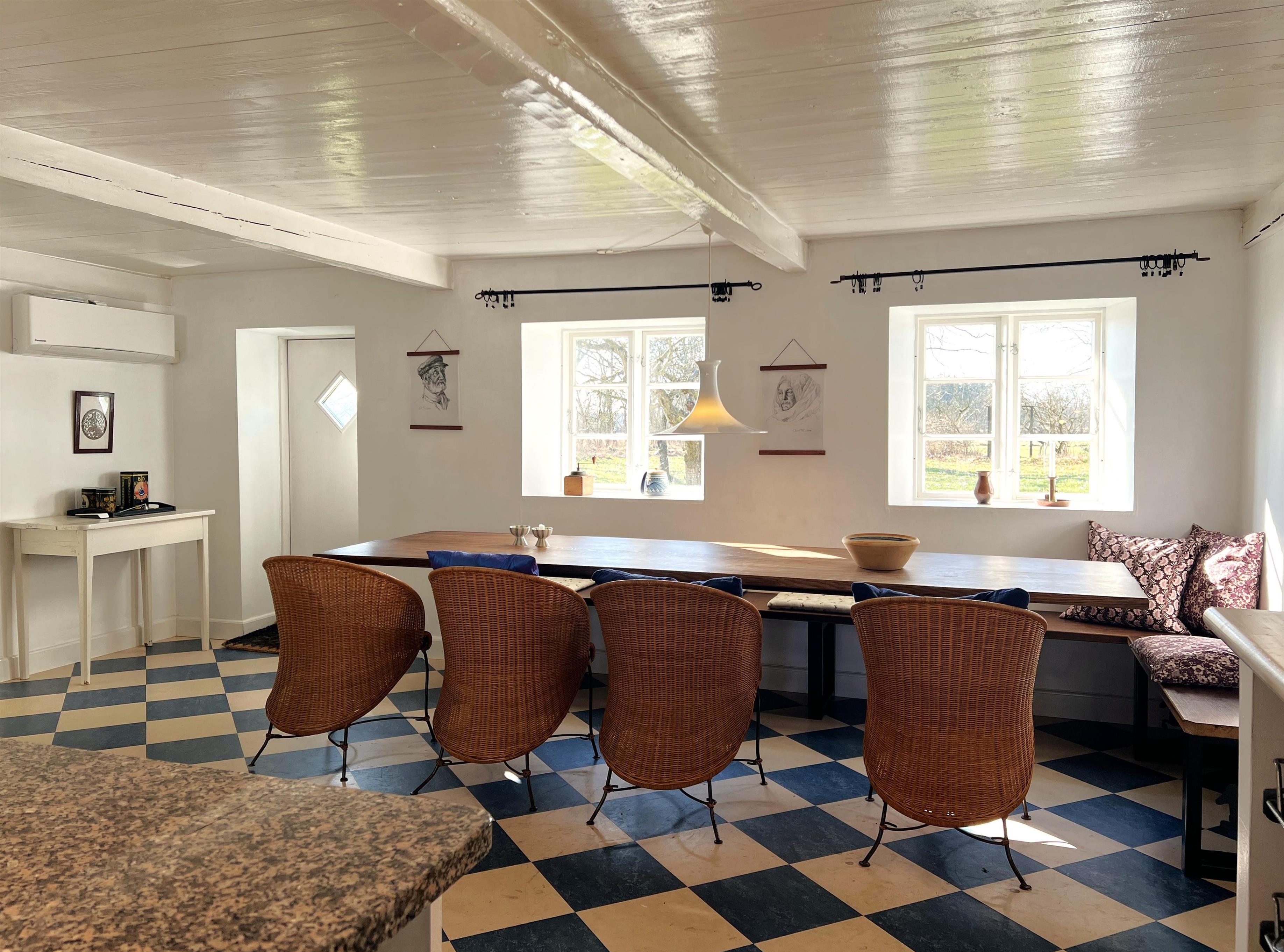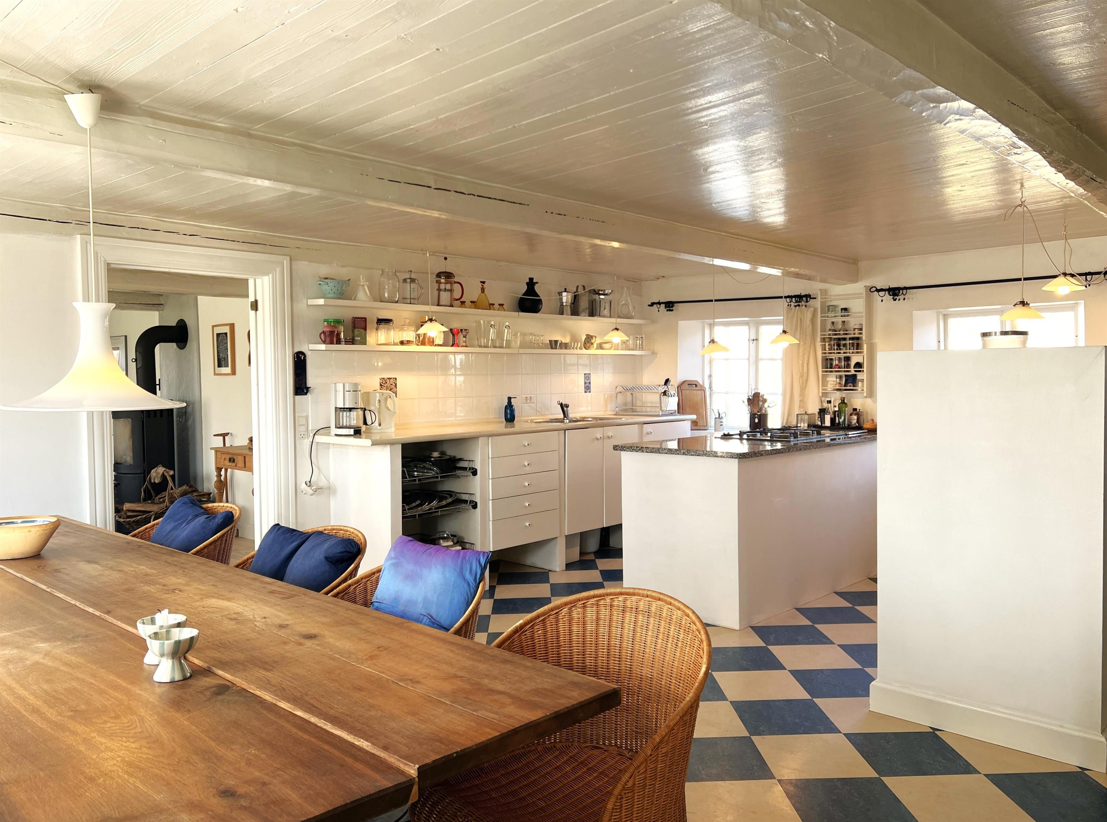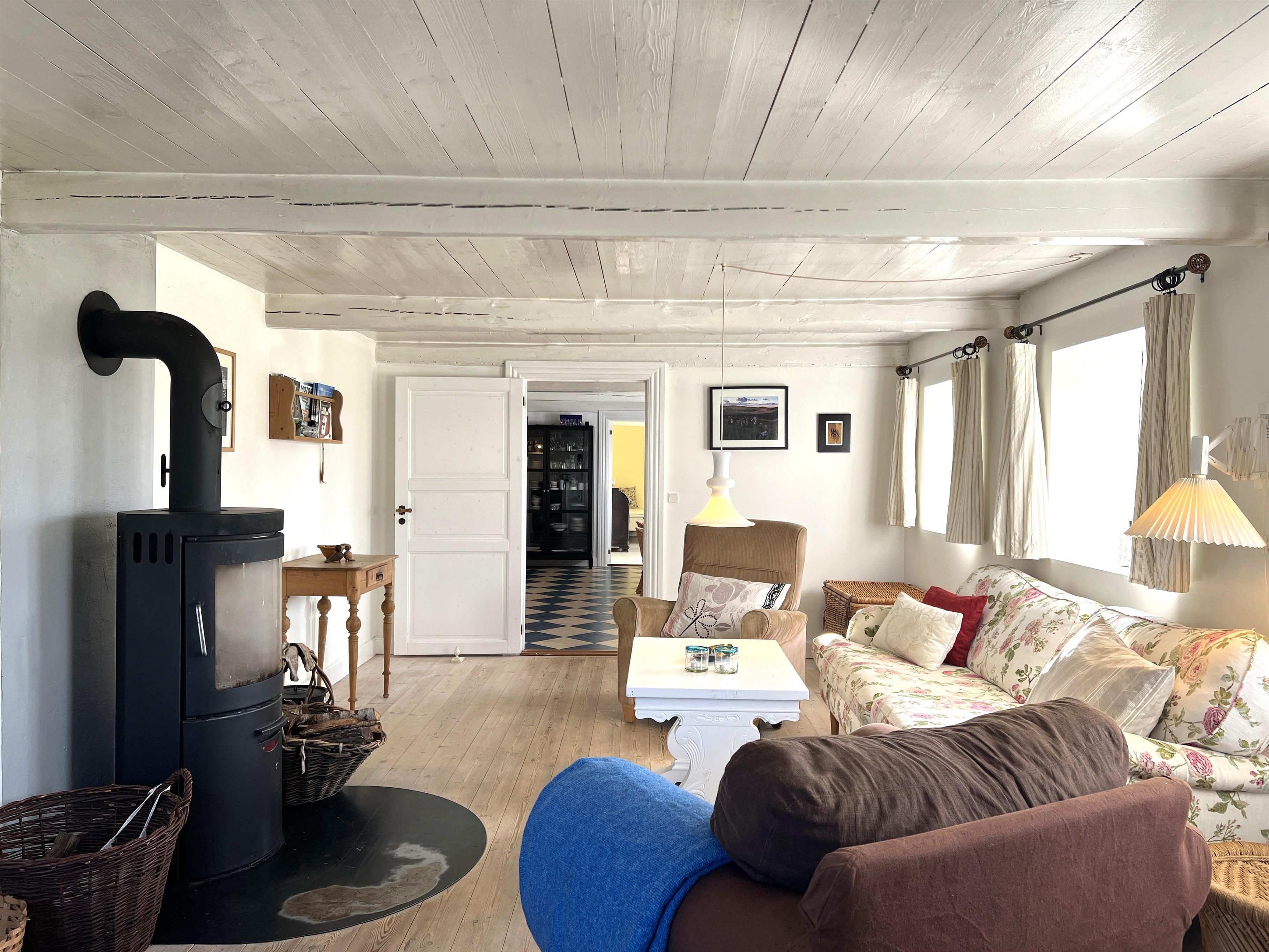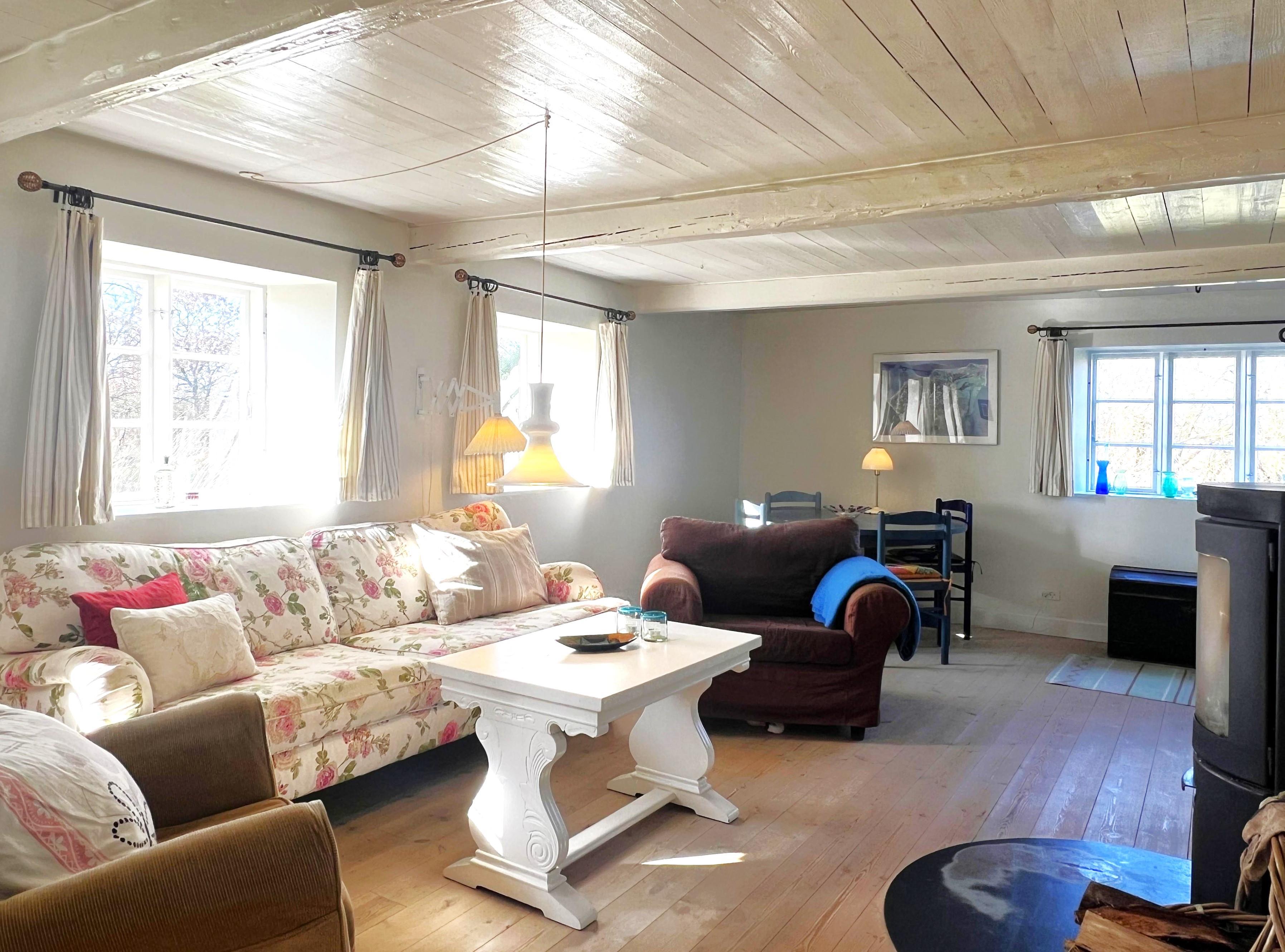 NYT hos Team Læsø: Denne gamle tolængede Læsøgård er en af Læsøs ældste. Her er mulighed for en dejlig ferieoplevelse for den store - eller måske to familier, der gerne vil bo i et fredeligt, naturskønt område. Gården ligger idyllisk placeret på Gårdenes Vej i Sydvesten med gåafstand til en af Læsøs bedste badestrande. Huset er smukt møbleret med lækre ældre møbler, og man fornemmer omgående den særegne hygge, der var og er i de velbevarede landsteder. Charmerende køkken med spise/langbord og to hyggelige stuer med sofaer, lænestole og TV. Der er fire soveværelser, hvoraf tre er med dobbeltsenge og et med to enkeltsenge, samt en ekstra seng, som står i den ene af stuerne. To badeværelser med brus. Stort grovkøkken med vaskemaskine og tørrestativ. Husets indretning gør, at hvis to familier rejser sammen, er der rigtig god mulighed for at bo sammen og alligevel trække sig tilbage fra selskabet, når man ønsker det. Der er flere gode sol/hyggekroge med havemøbler, og i den store smukke, gamle have findes også en bålplads. I gå/cykelafstand mod syd findes det unikke naturområde med sandrevlen, Stokken og Fannemandsfærgen, som bringer dig sikkert over kanalen på vandreturen til Vesterø. Cykelafstand til Vesterø Havn, hvor der er lokal fiskehandler, shopping, restauranter og dagligvarebutikker.
