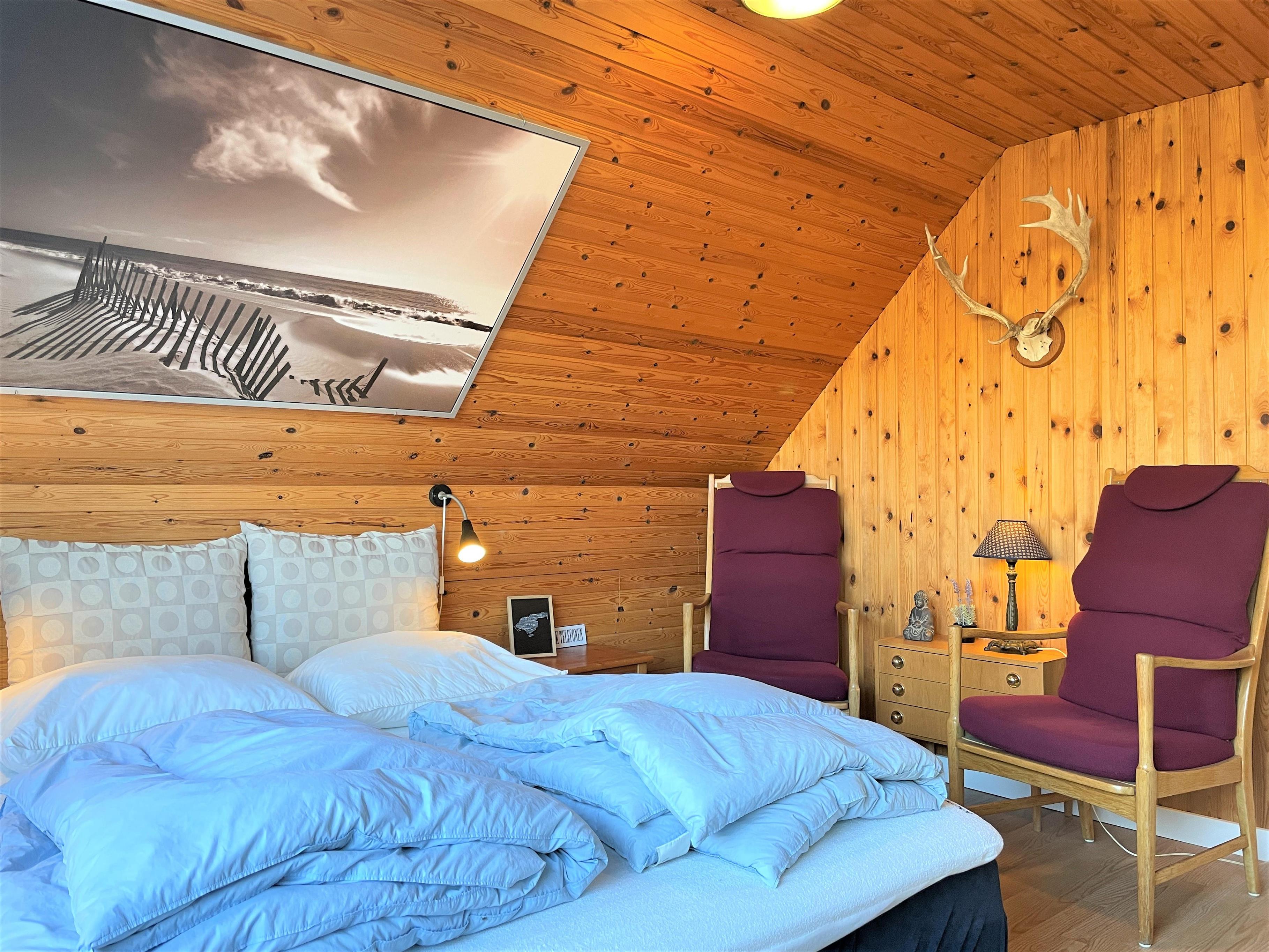 Huset indeholder fint køkken med spiseplads samt stue med hyggelig møblering. Pænt badeværelse med brus. Der er et soveværelse i stueplan med to enkeltsenge samt to soverum på 1.salen med dobbeltsenge. Der er brændeovn i stuen. Hunden er velkommen i husets underetage.