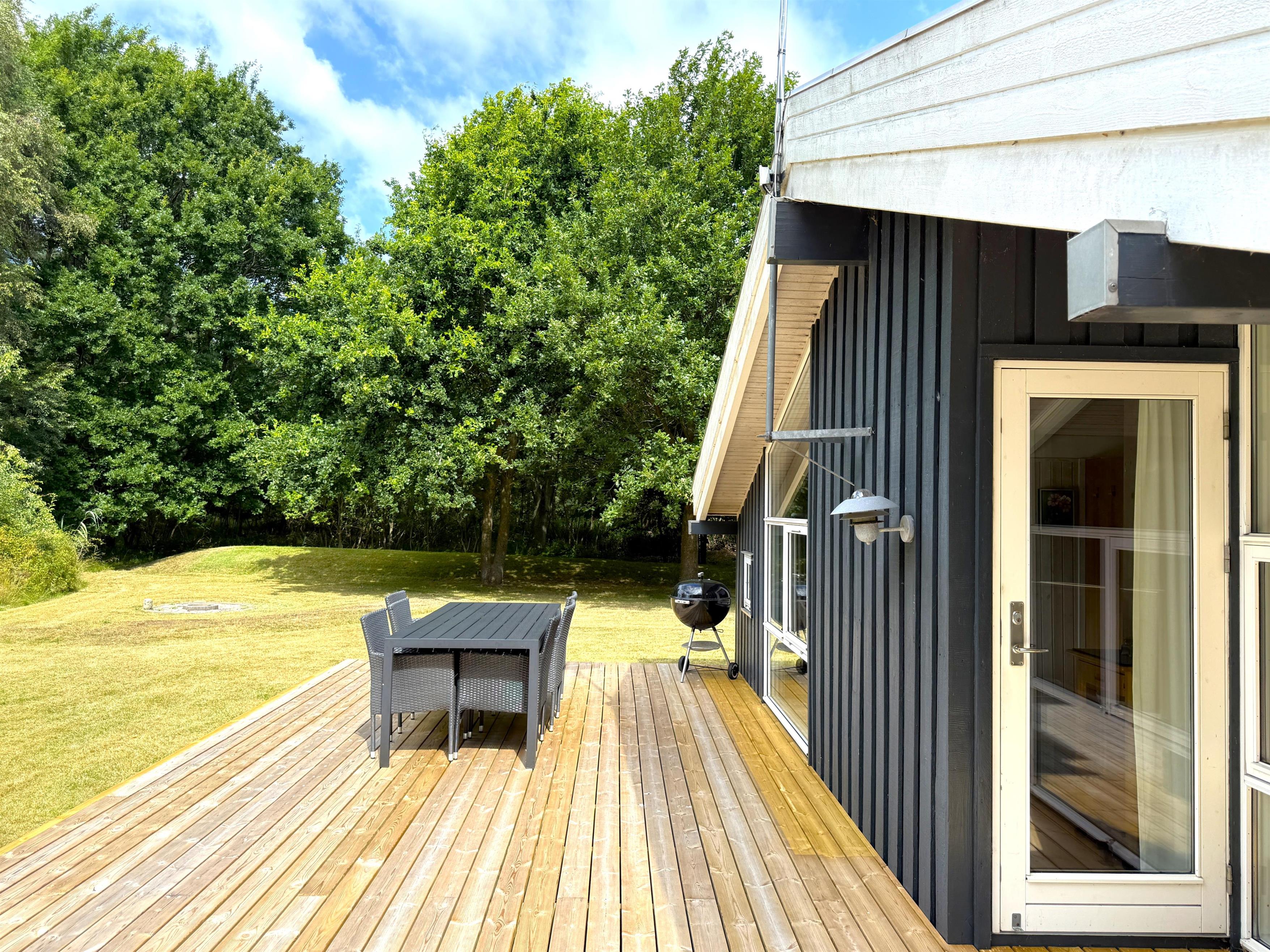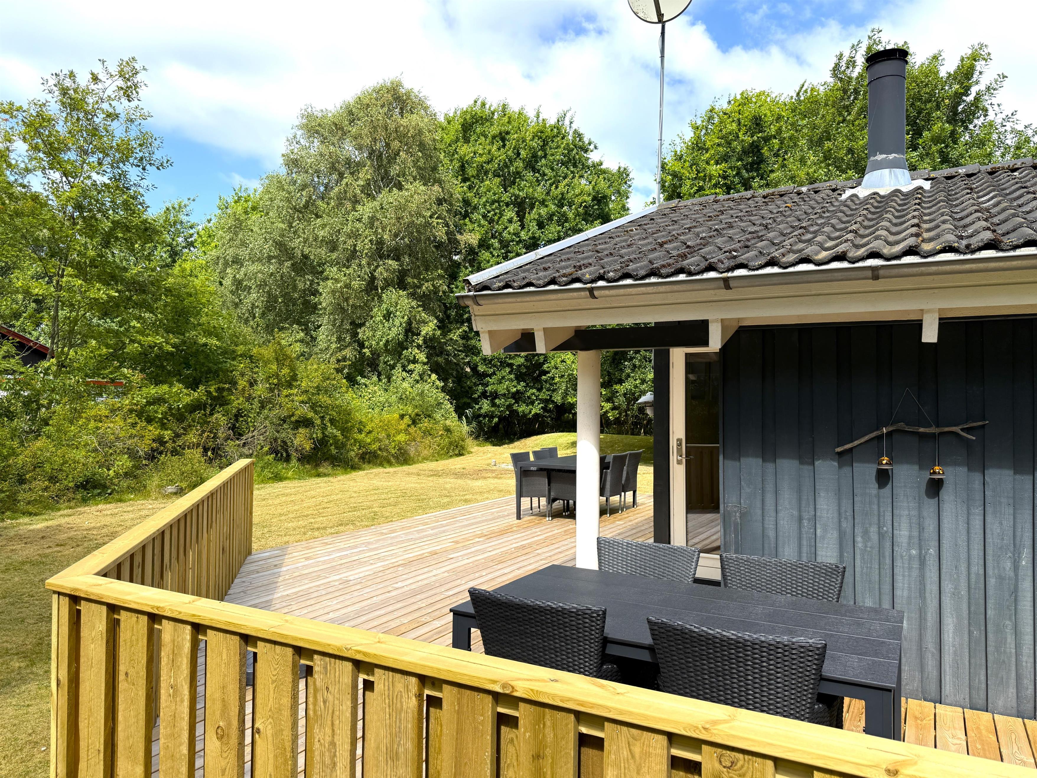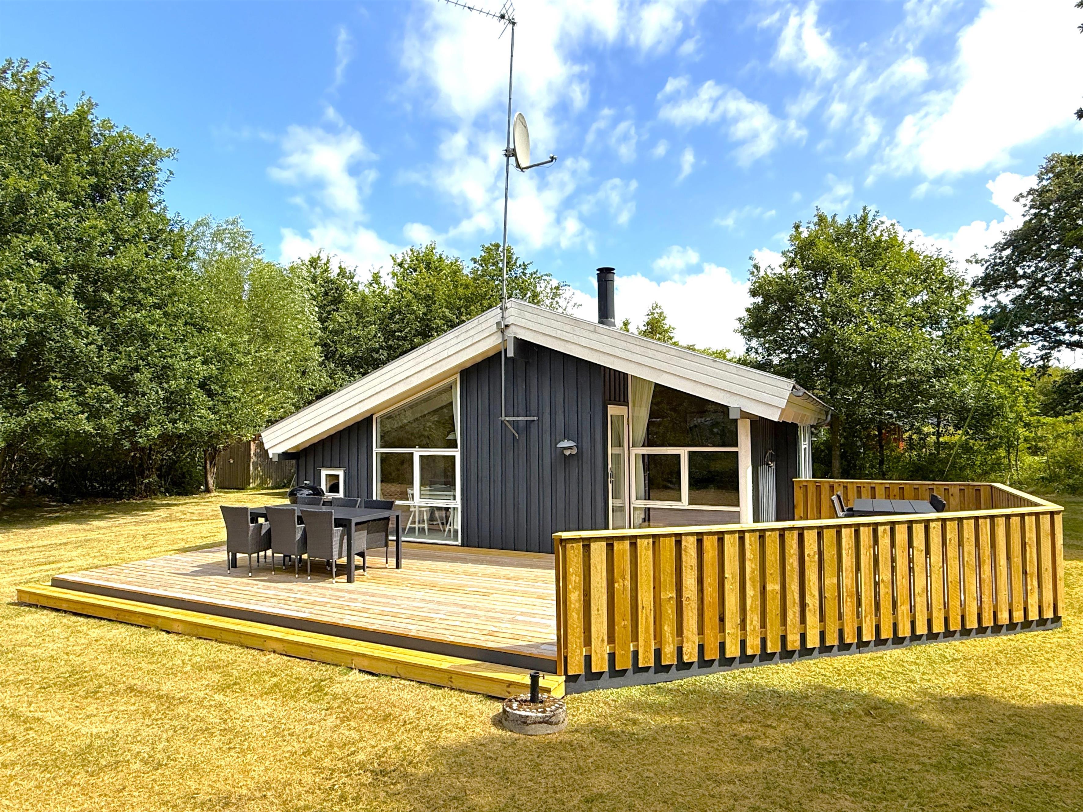 Velholdt feriehus nær Kongestranden med moderne faciliteter og stor træterrasse på Læsø.