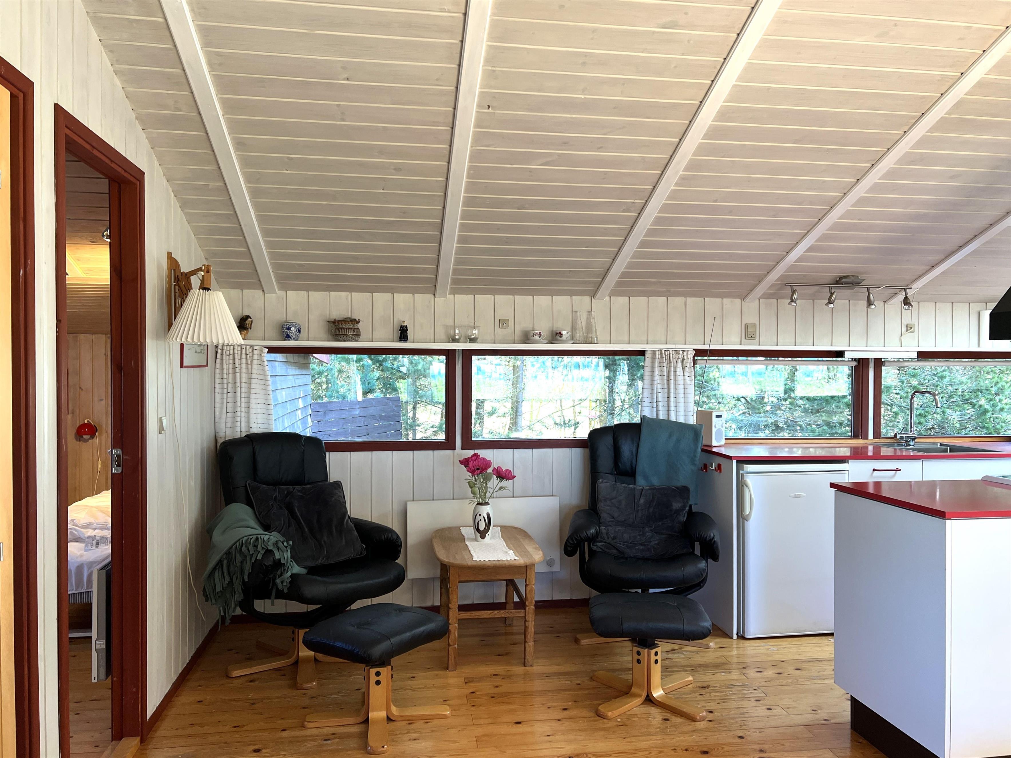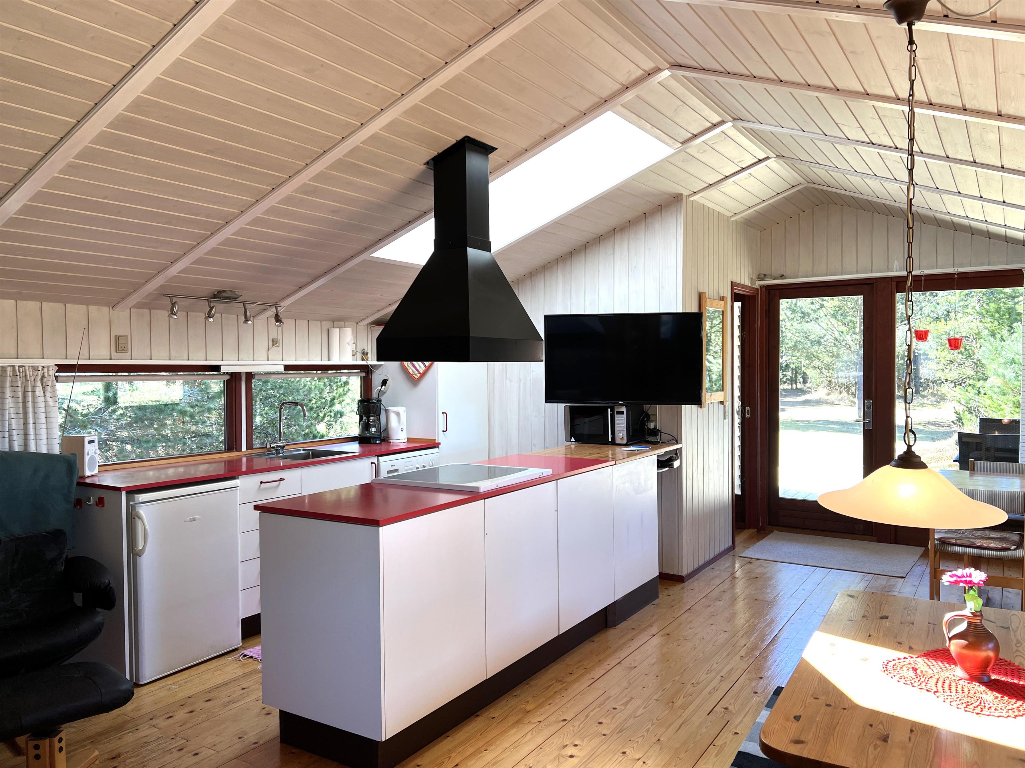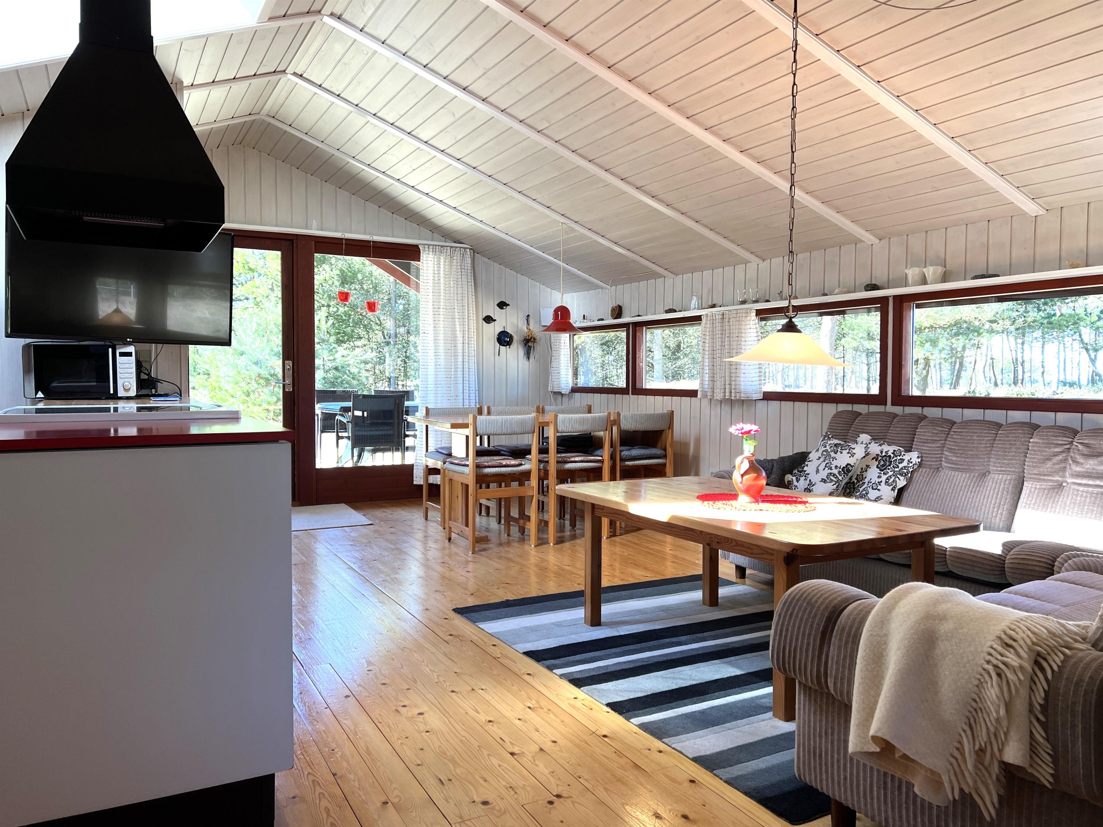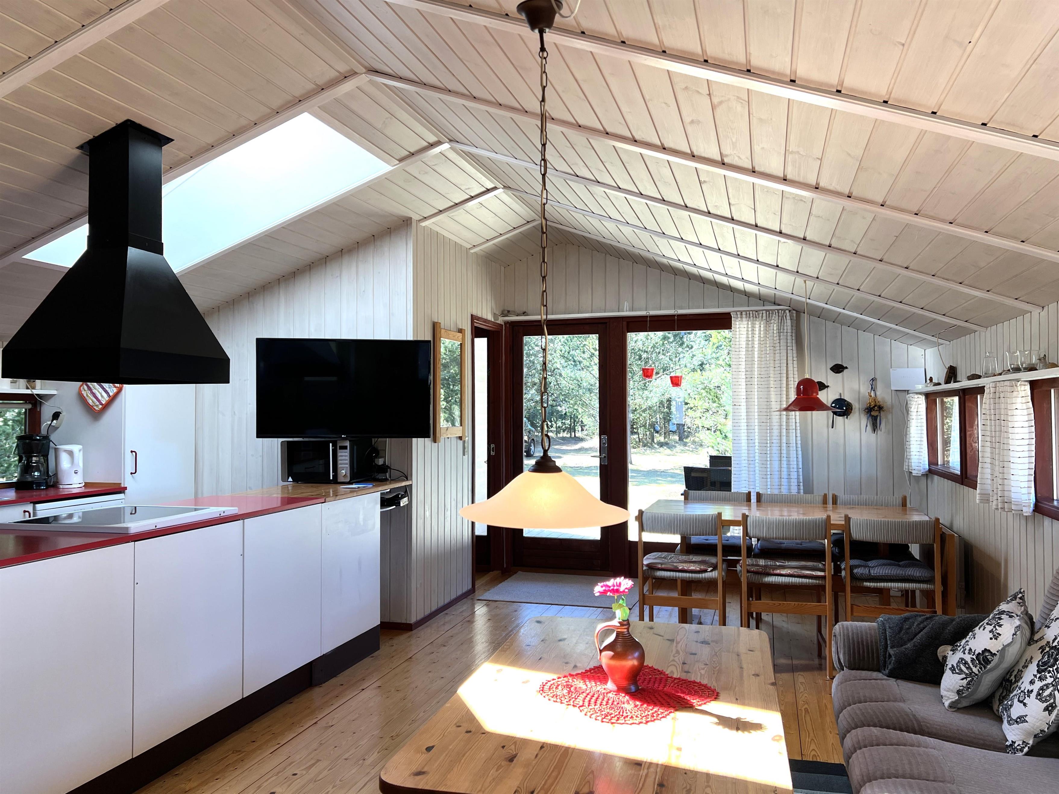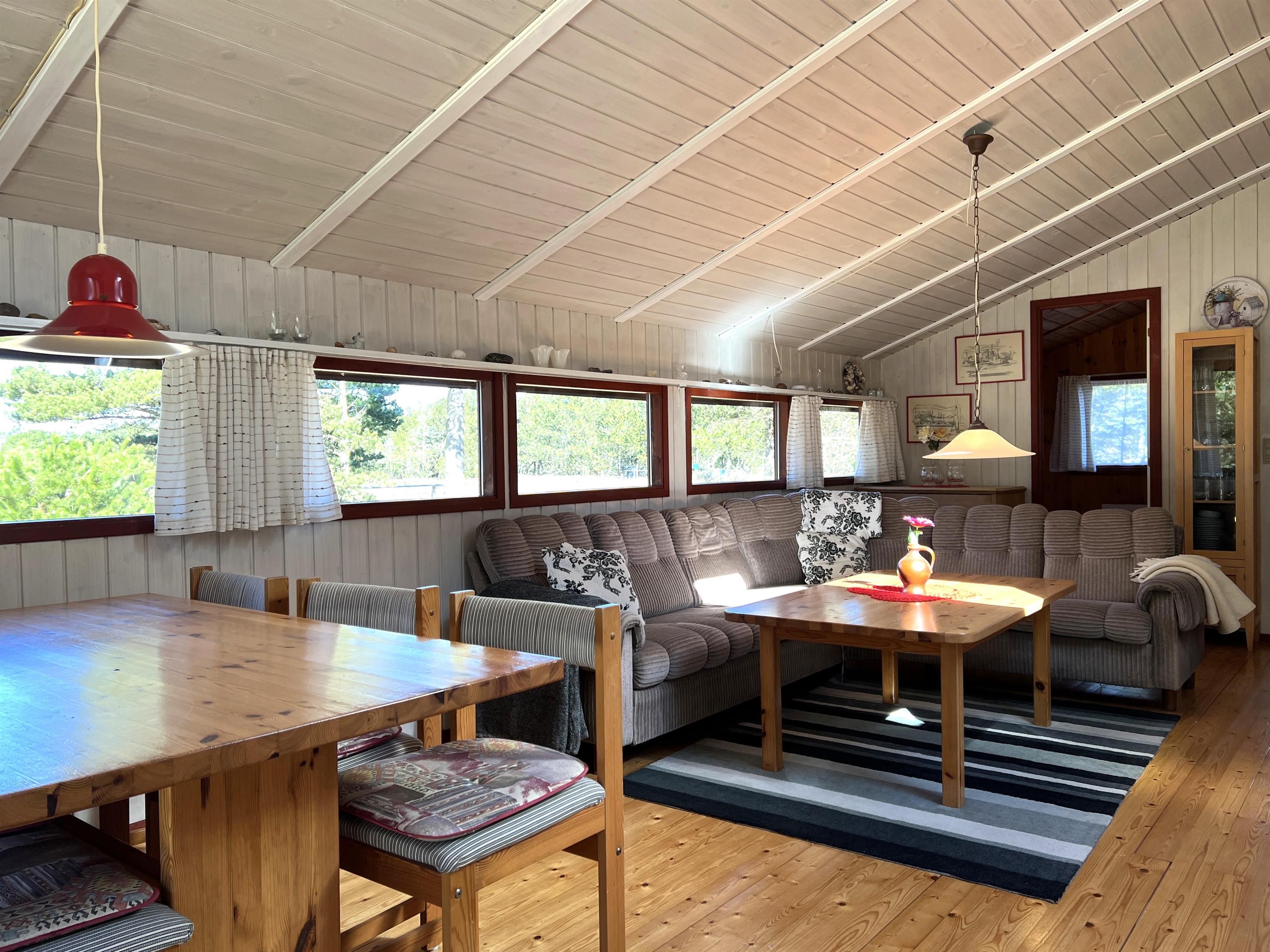 Huset er lyst og praktisk indrettet. Funktionelt fint køkken, som ligger i i forbindelse med spisestue og sofaafdeling og udgang til træterrasse. Vinduespartierne mod vandet giver et flot lysindfald i fællesrummene. Der er desuden tre soveværelser i huset: Et med to enkeltsenge, et med køjeseng (kun til børn), og et med enkeltseng. Lille fint badeværelse.