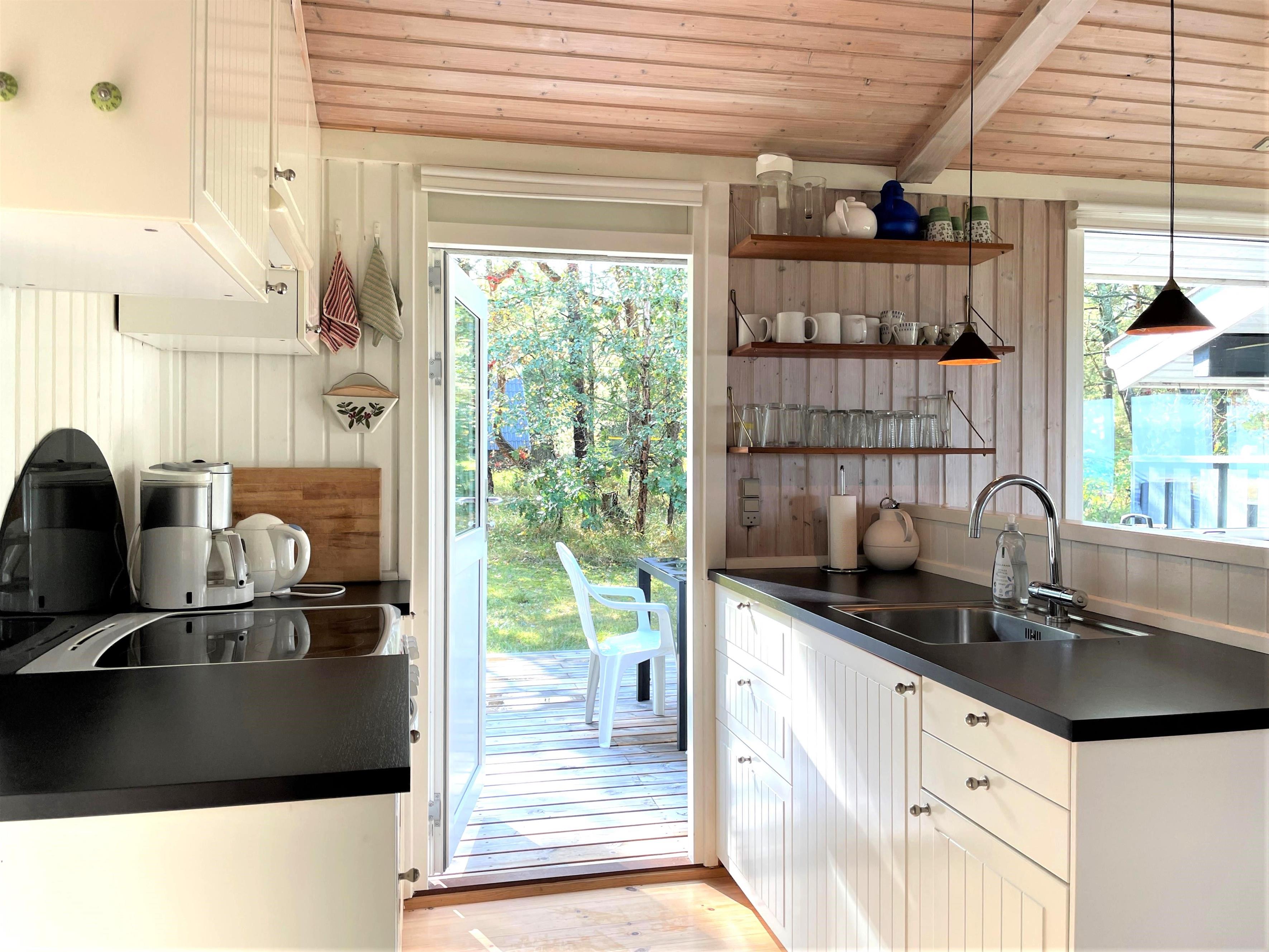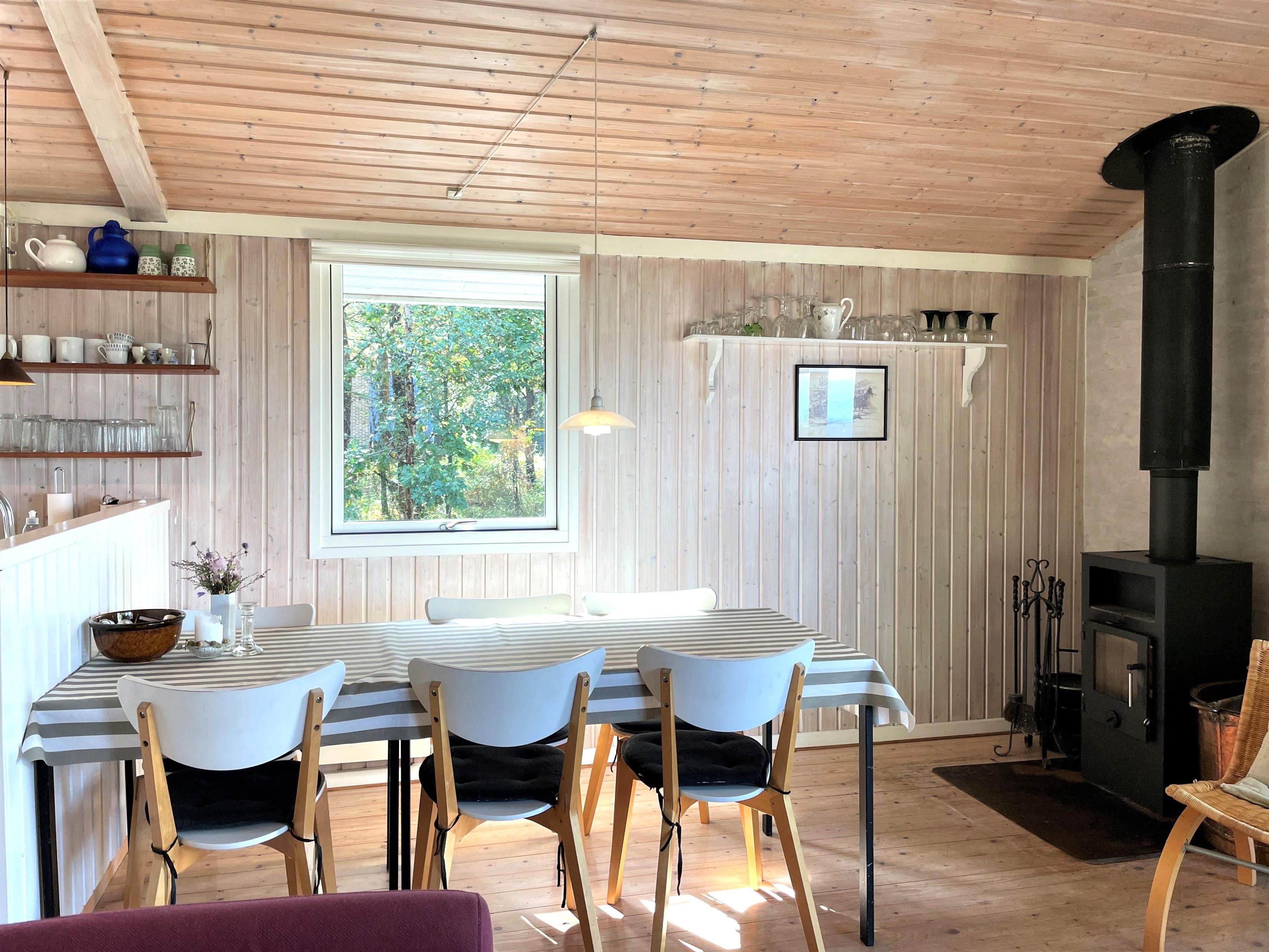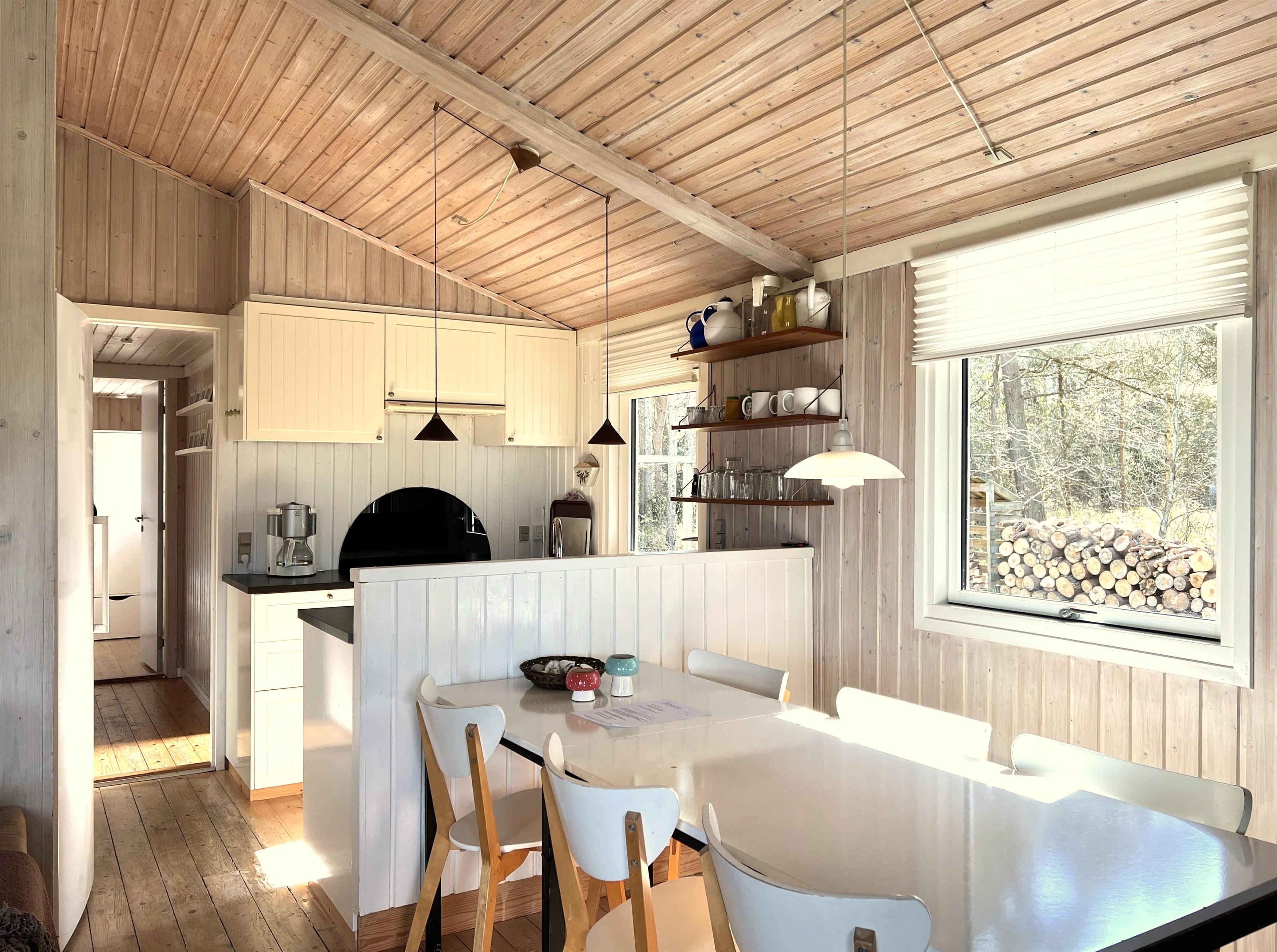 Huset er lyst og fint indrettet. Funktionelt, dejligt køkken med udgang til træterrasse. Køkkenet ligger i i forbindelse med spisestue og sofaafdeling med brændeovn og endnu en udgang til træterrasse. De store vinduespartier mod vandet givet et flot lysindfald i fælles rummene. Der er desuden tre soveværelser i huset; ét med dobbeltseng og udgang til træterrasse, et med køjeseng og i forlængelse af stuen ligger et ekstra værelse med dobbeltseng ( str 140). Lille, fint badeværelse.