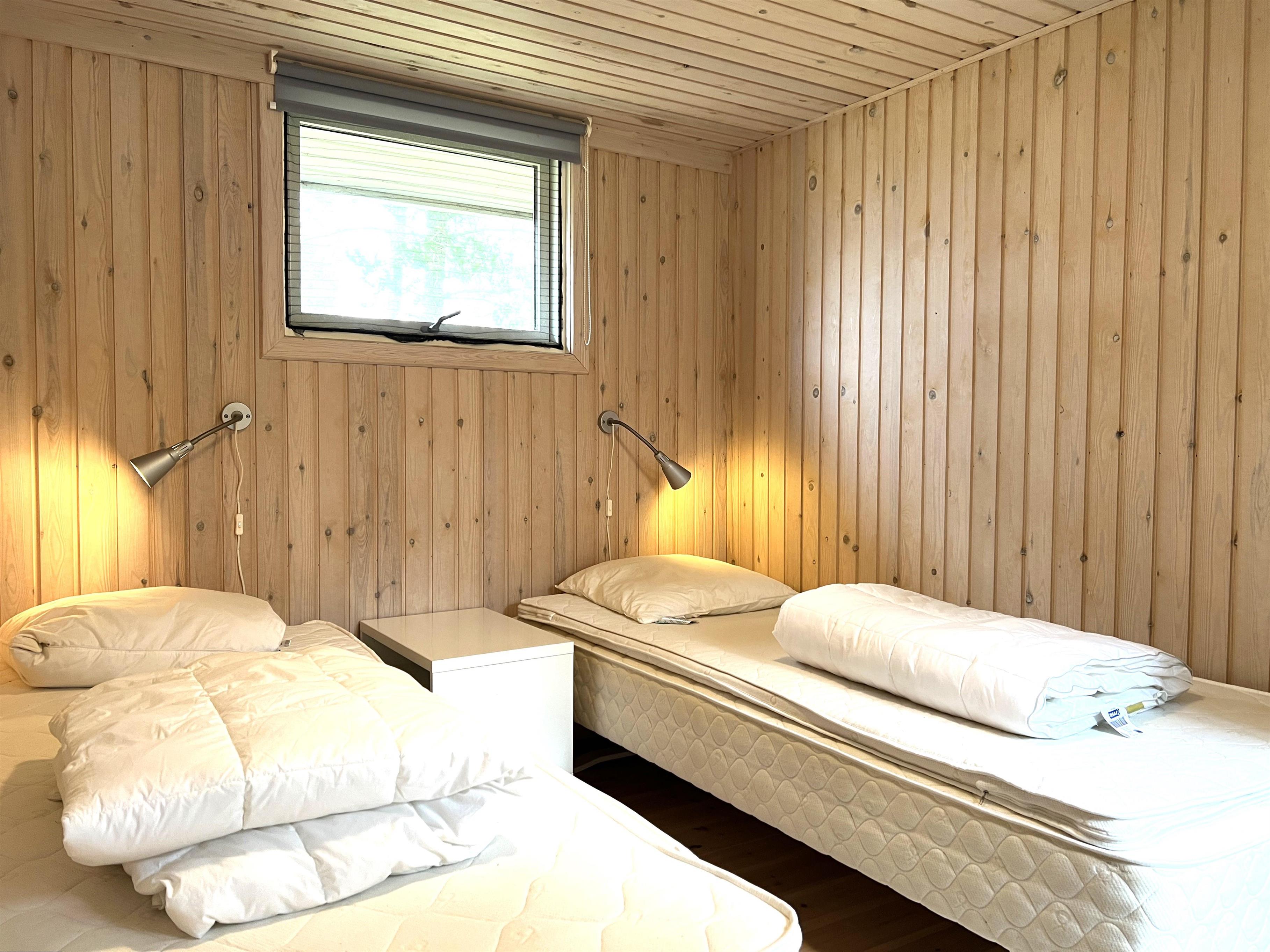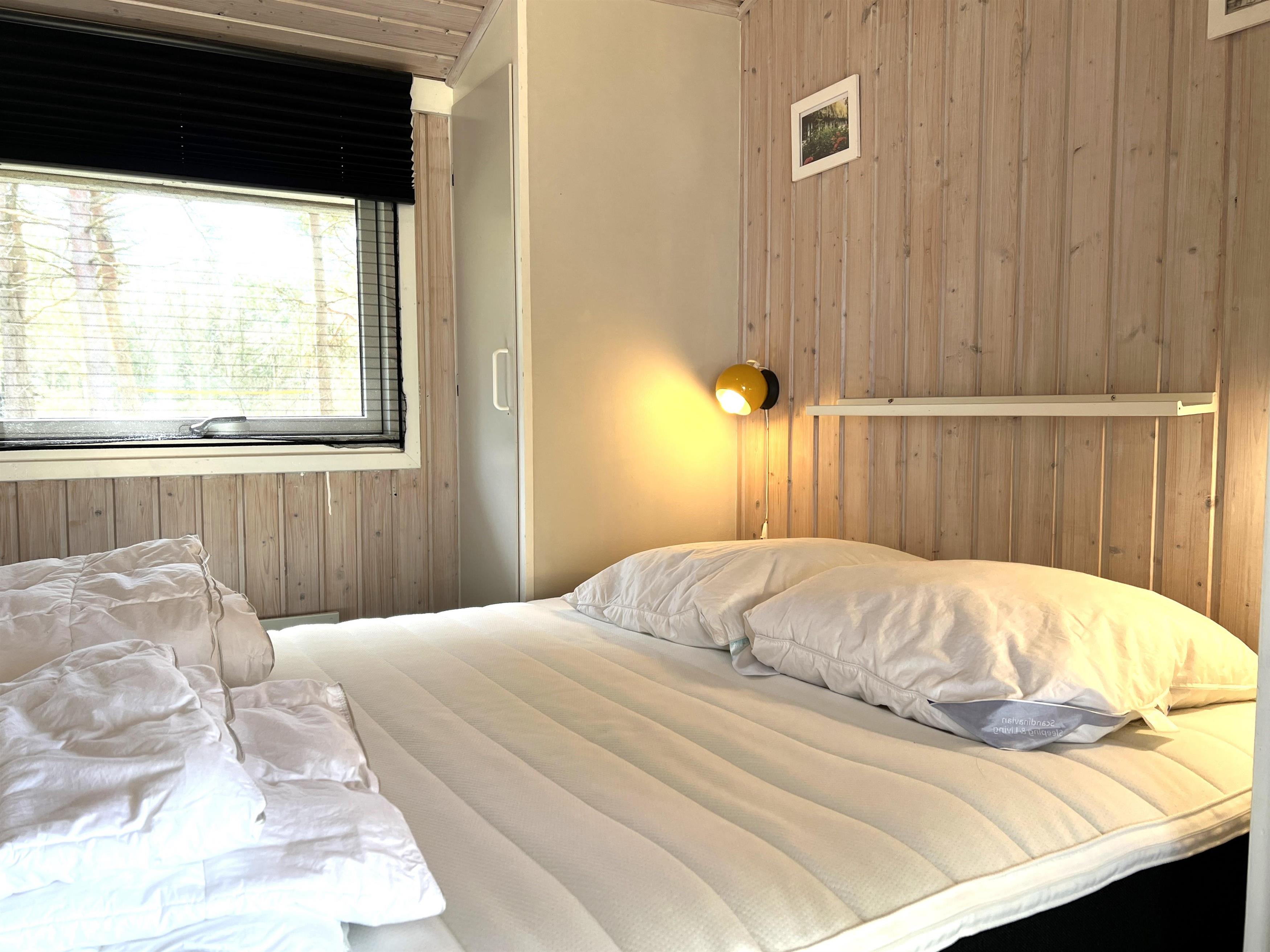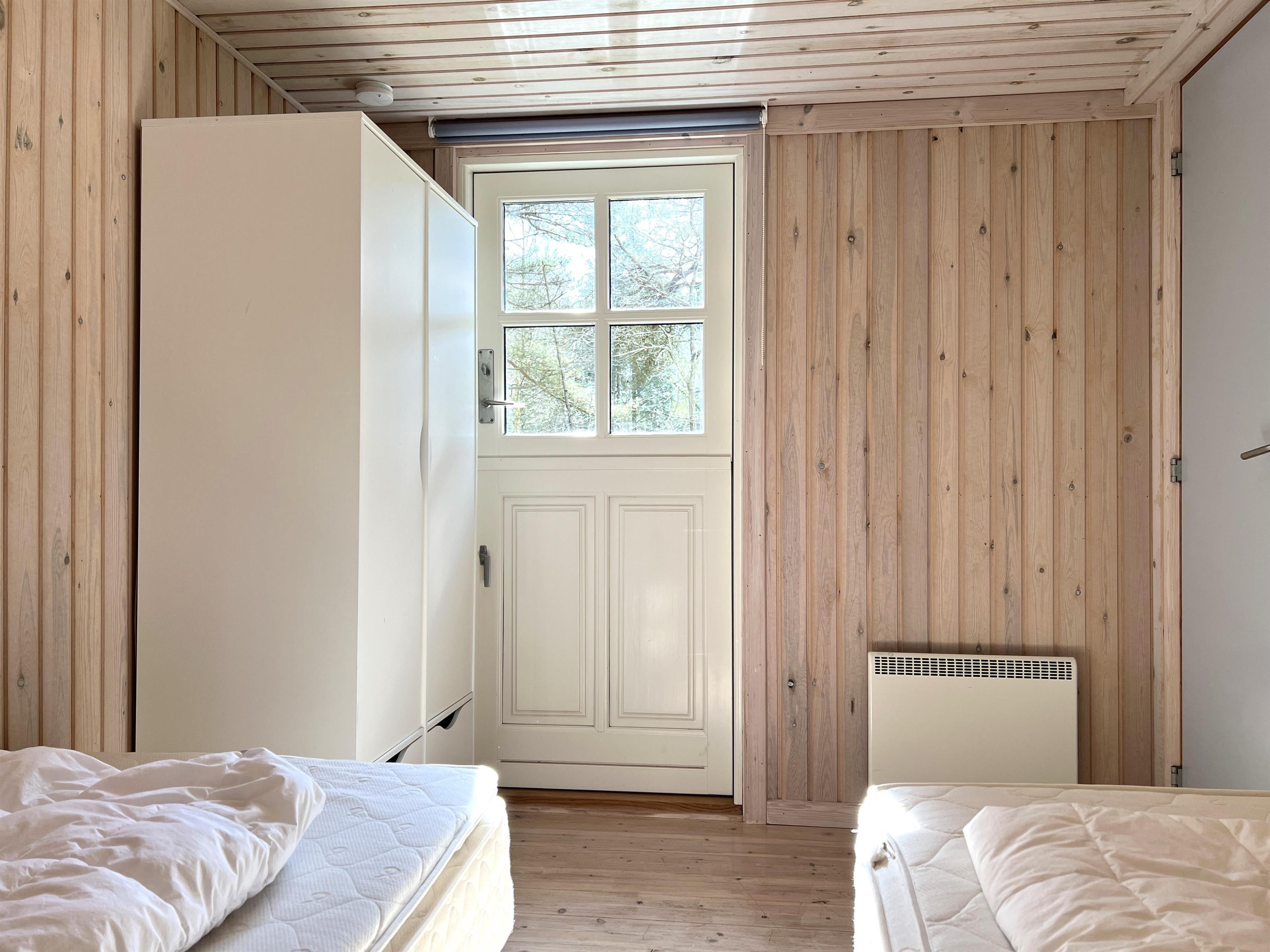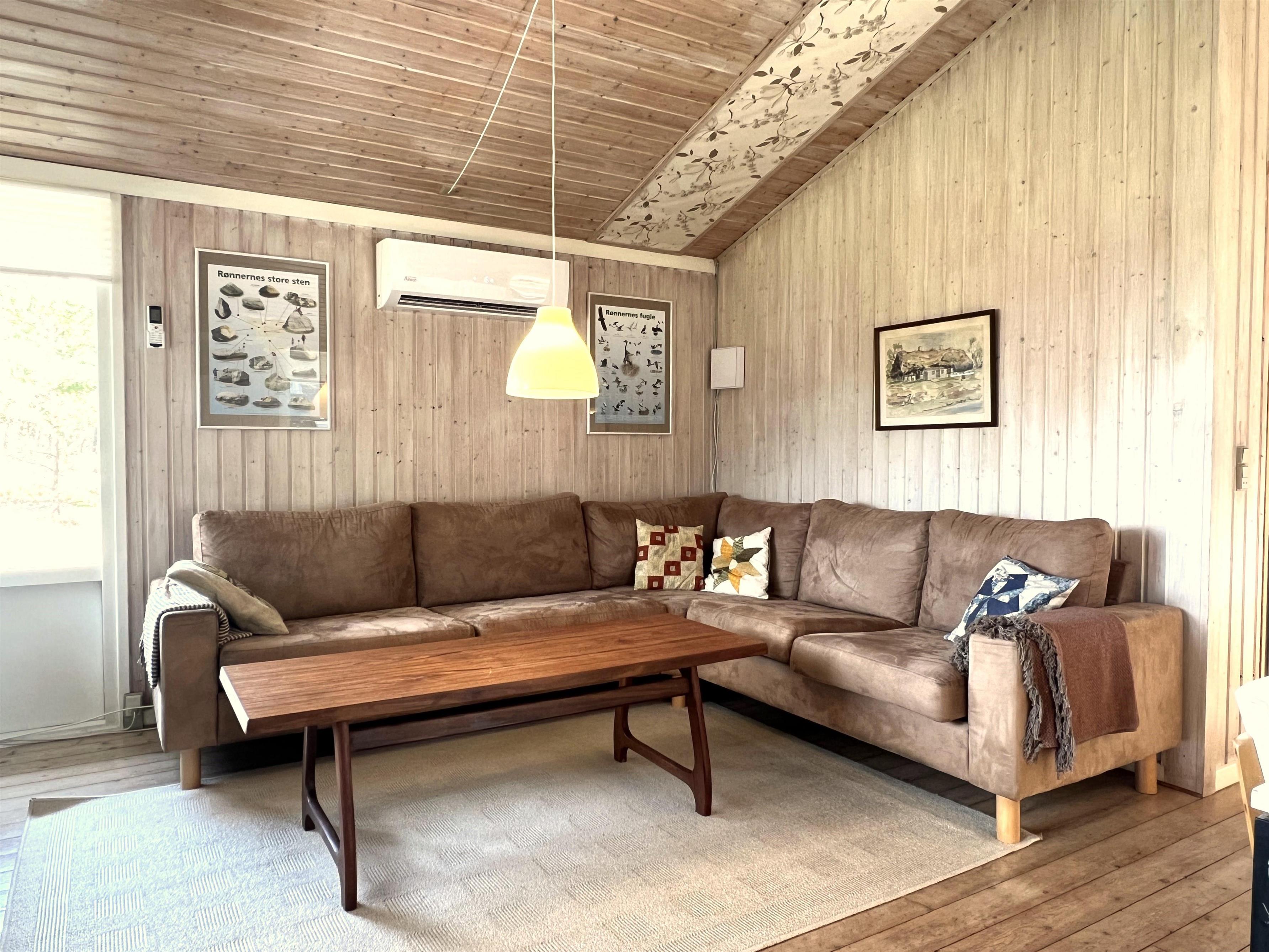 Huset er lyst og fint indrettet. Funktionelt, dejligt køkken med udgang til træterrasse. Køkkenet ligger i i forbindelse med spisestue og sofaafdeling med brændeovn og endnu en udgang til træterrasse. De store vinduespartier mod vandet givet et flot lysindfald i fælles rummene. Der er desuden tre soveværelser i huset; ét med dobbeltseng og udgang til træterrasse, et med køjeseng og i forlængelse af stuen ligger et ekstra værelse med dobbeltseng ( str 140). Lille, fint badeværelse.