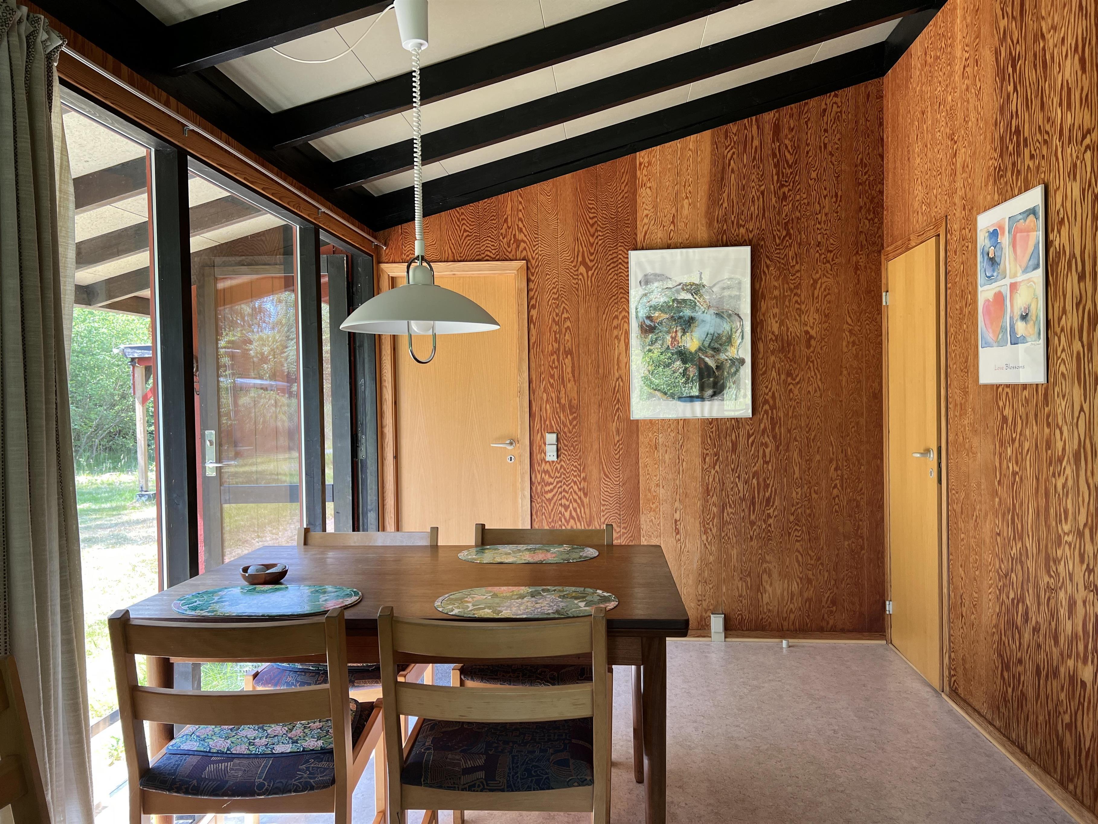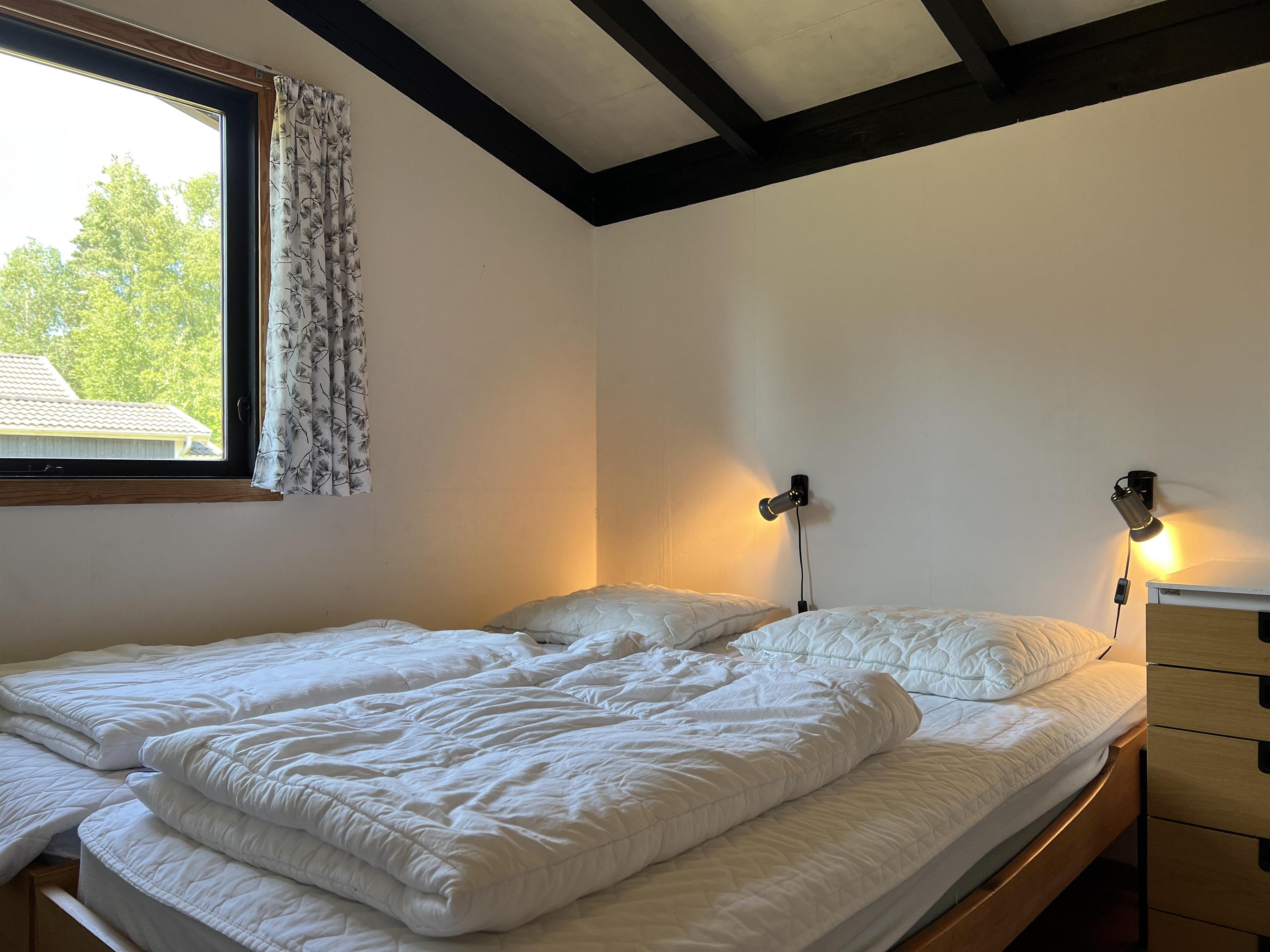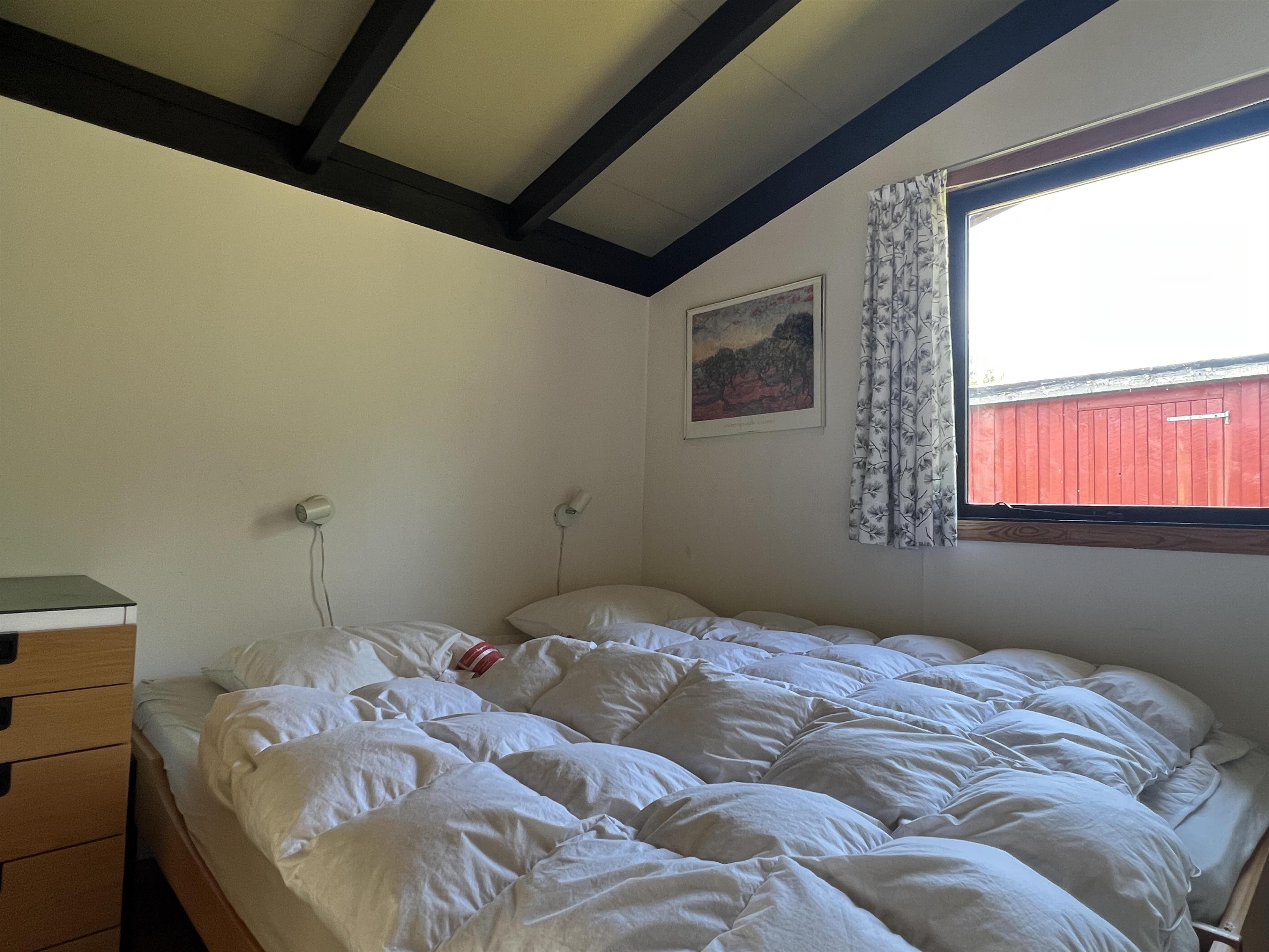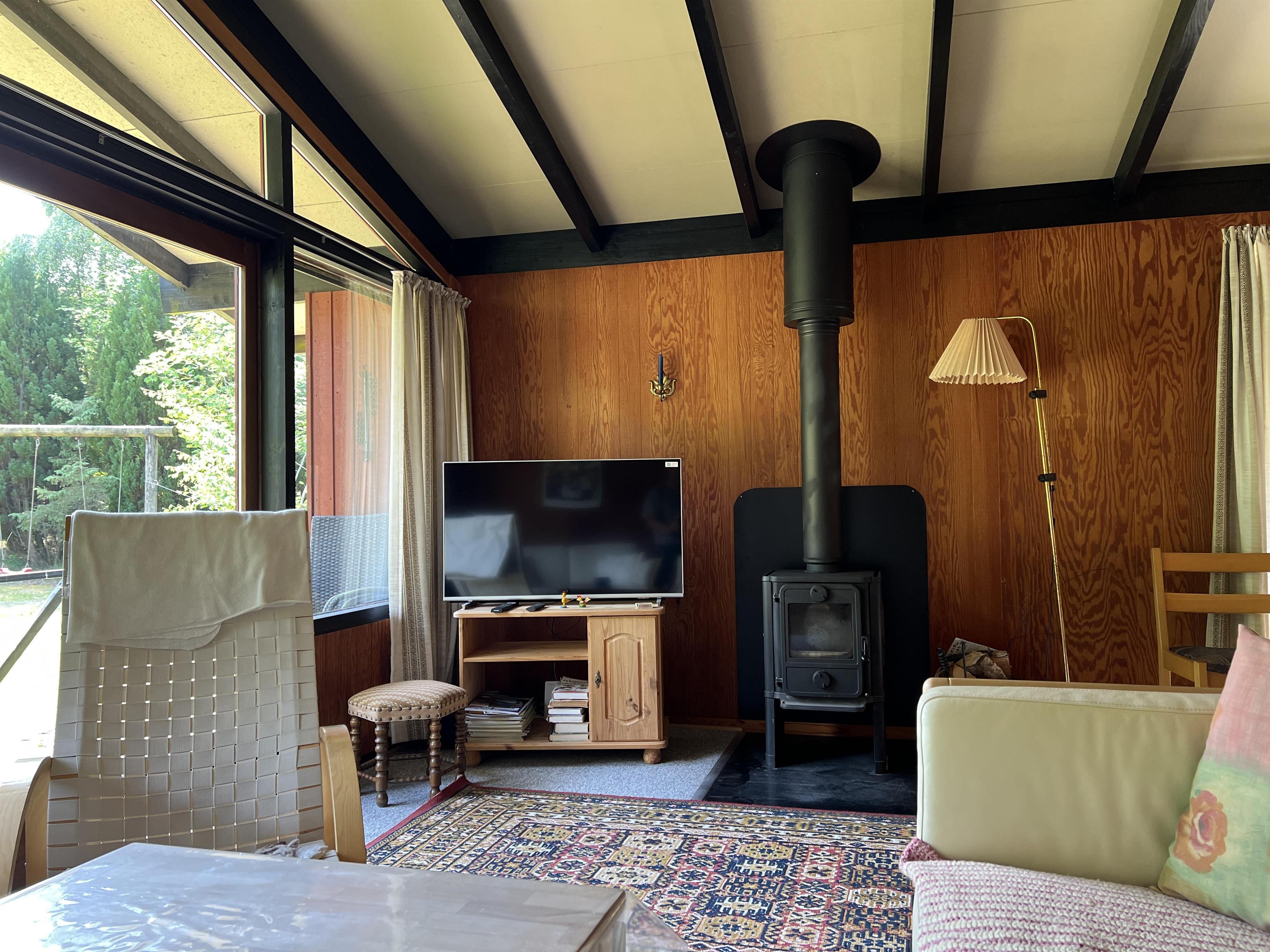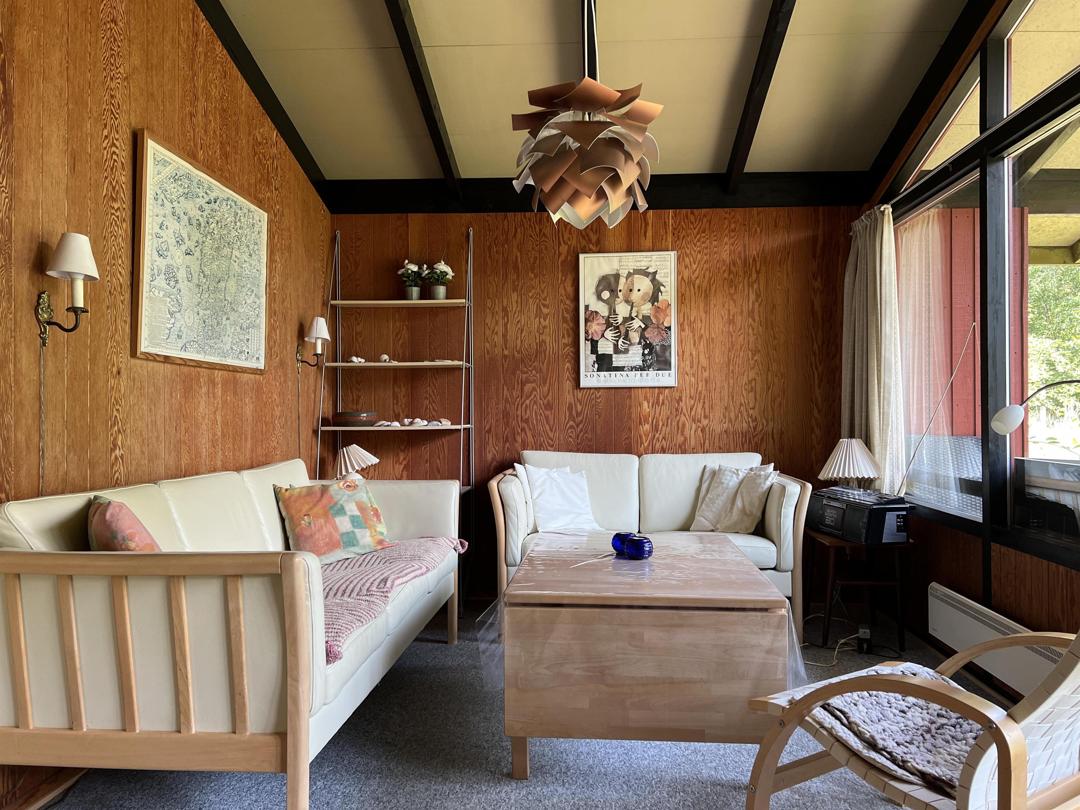 Stuen er indrettet med komfortable møbler og der er brændeovn. Tre soverum, hvoraf to er med dobbeltseng og et med en sovesofa.