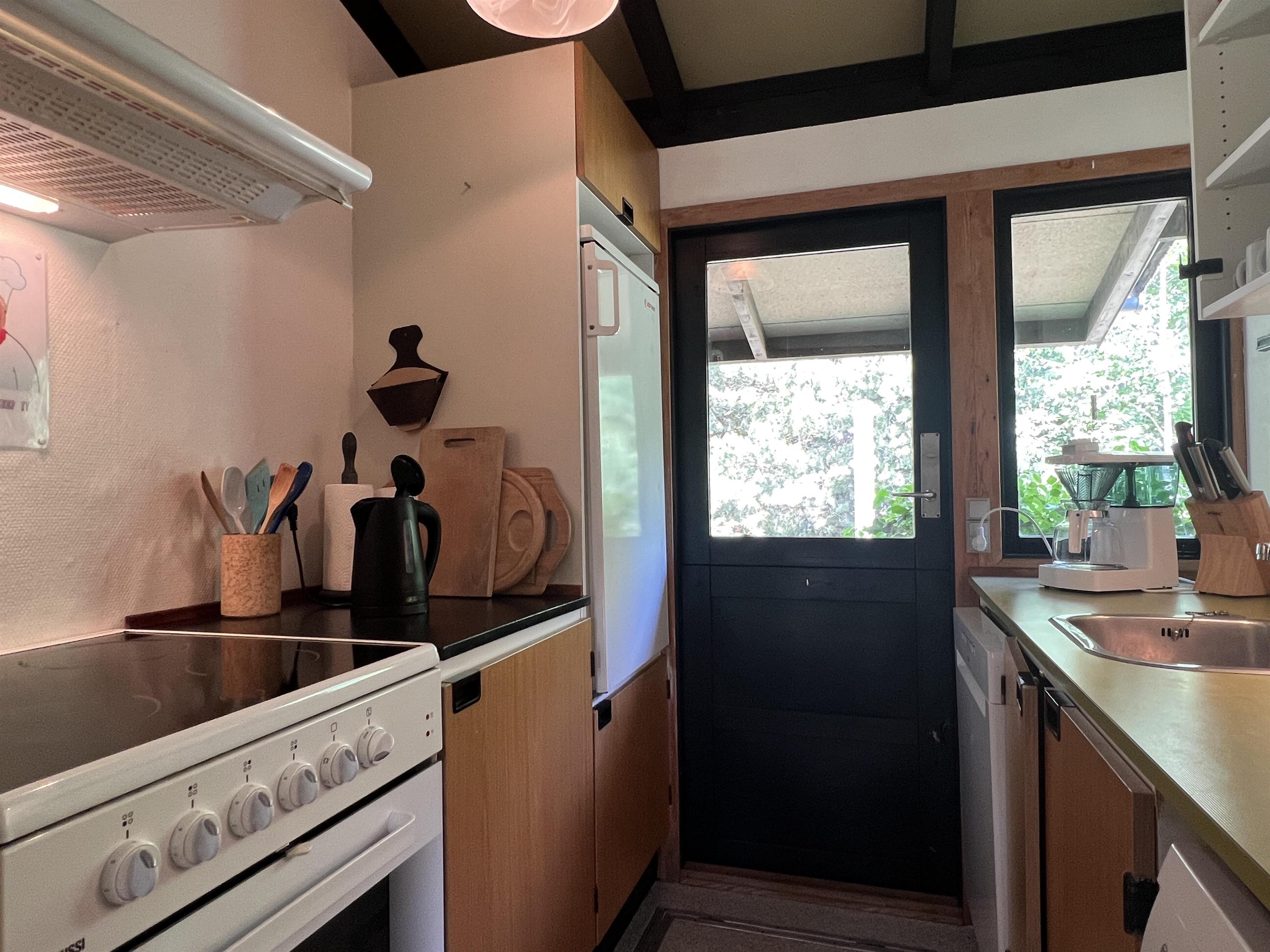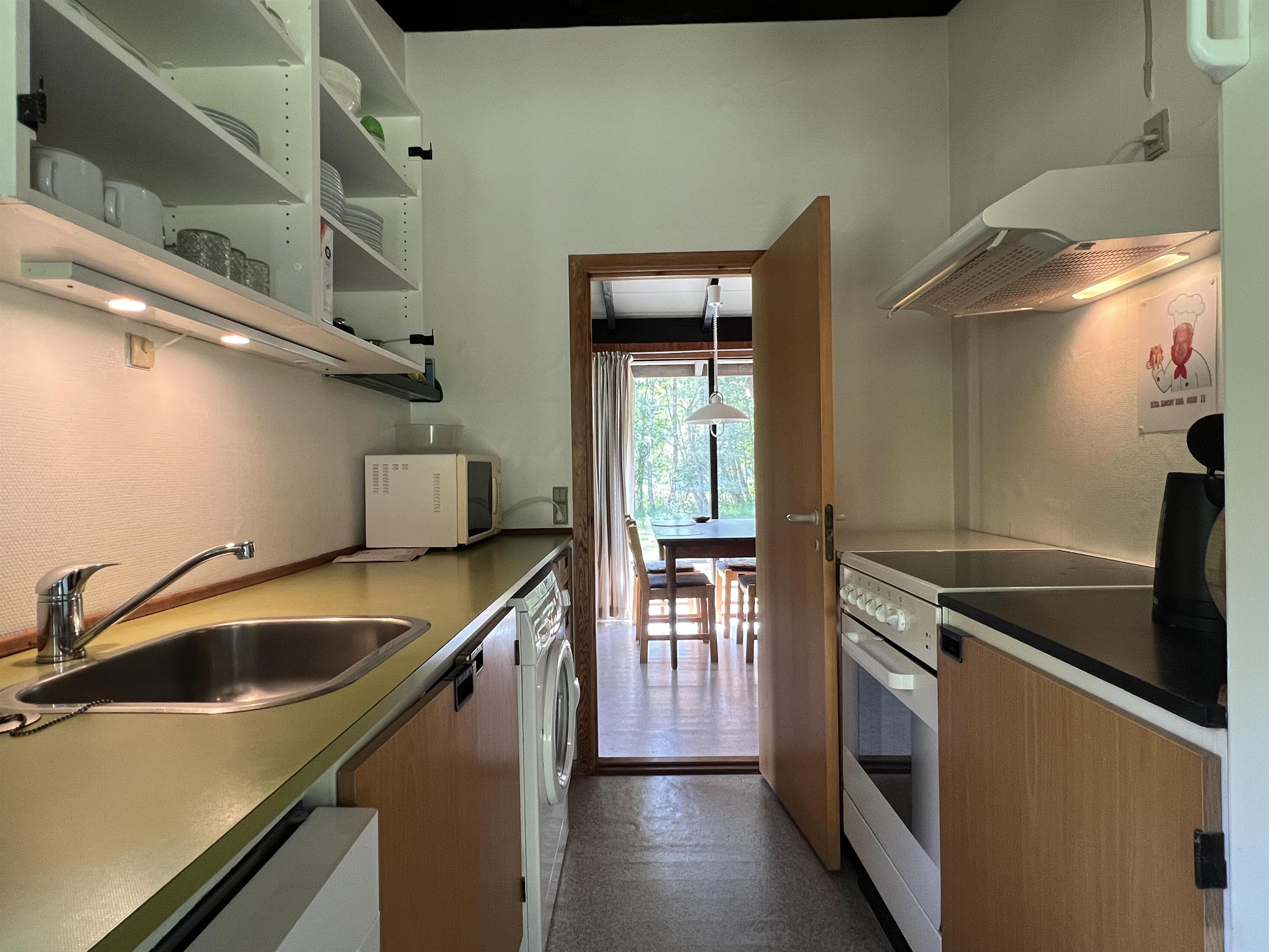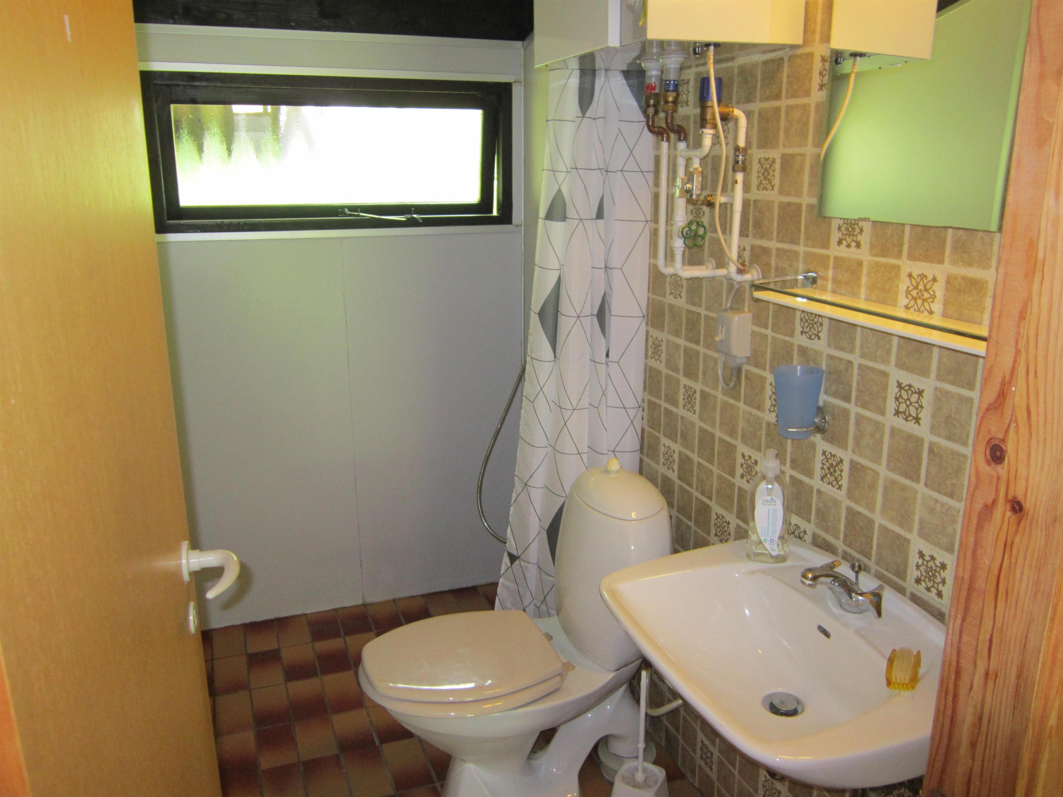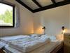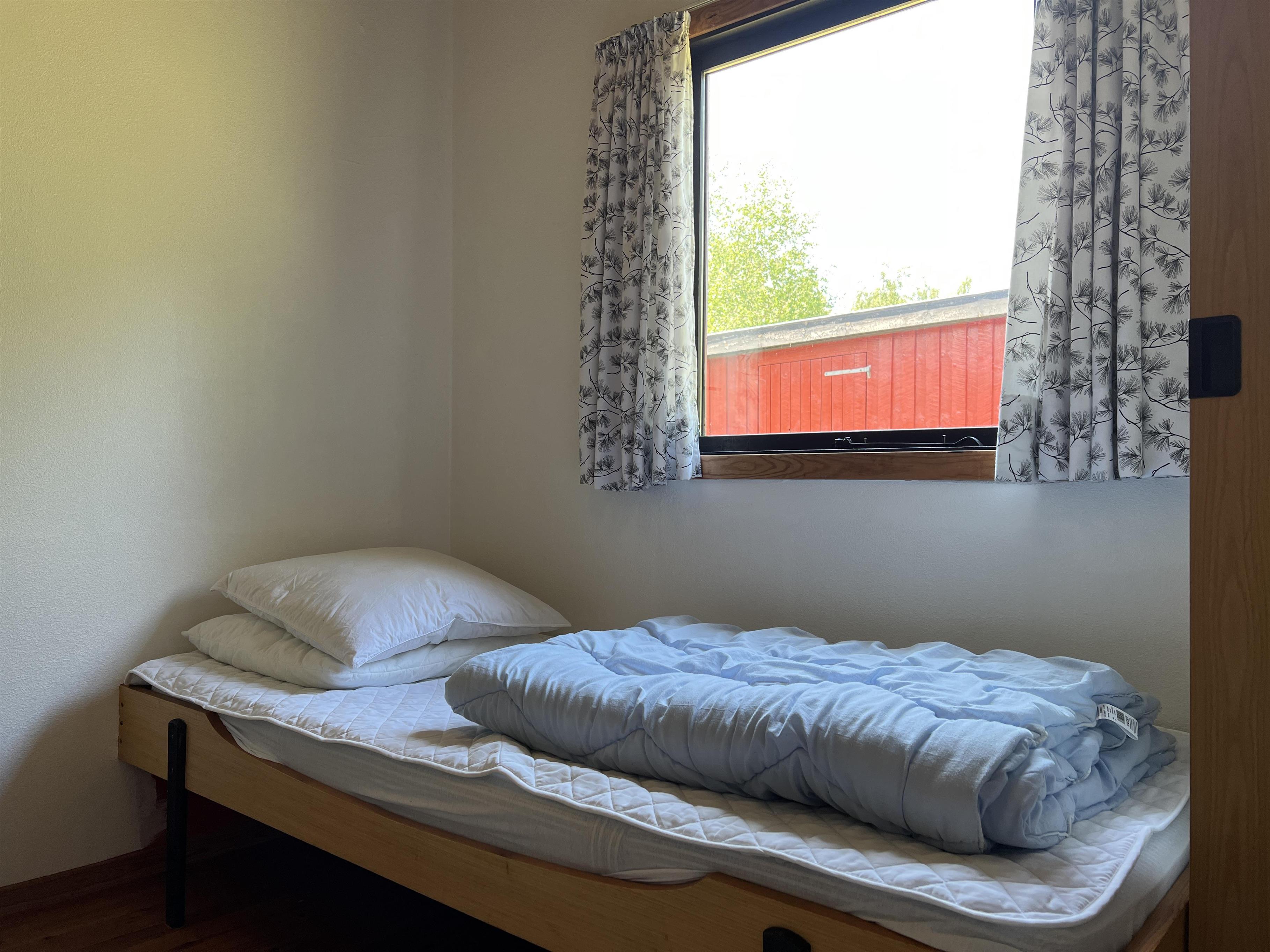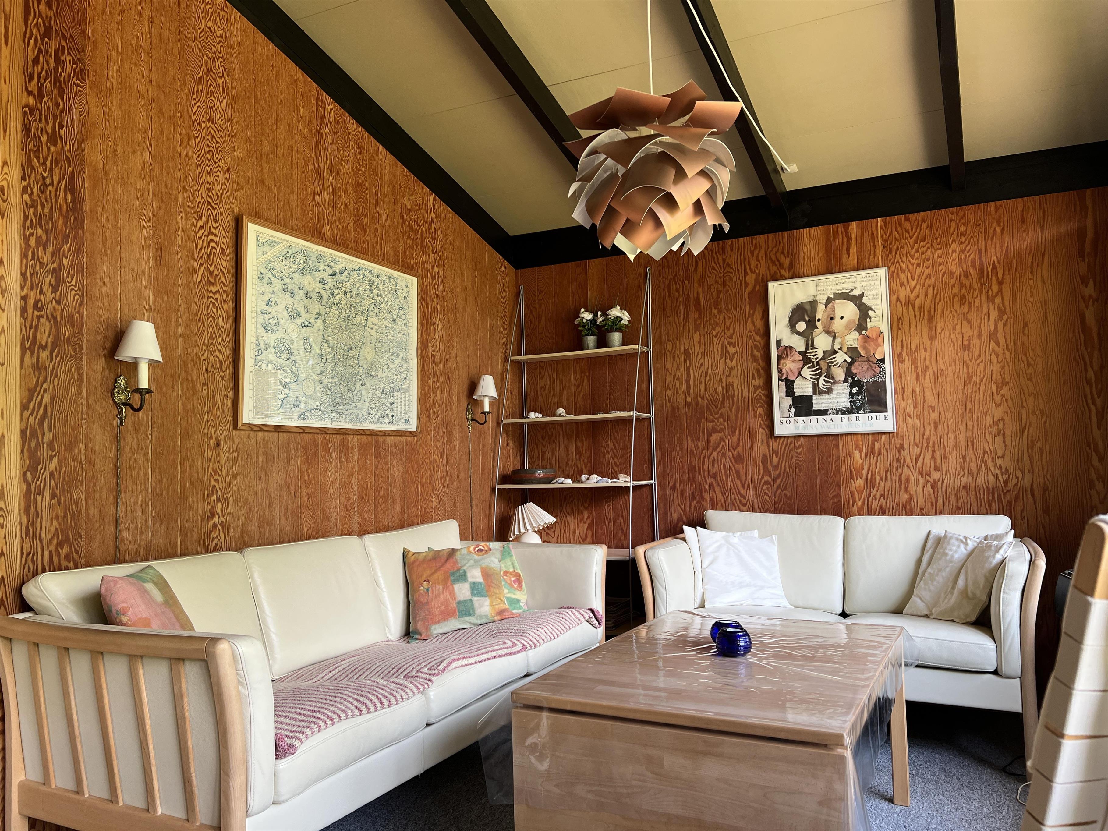 Stuen er indrettet med komfortable møbler og der er brændeovn. Tre soverum, hvoraf to er med dobbeltseng og et med en sovesofa.