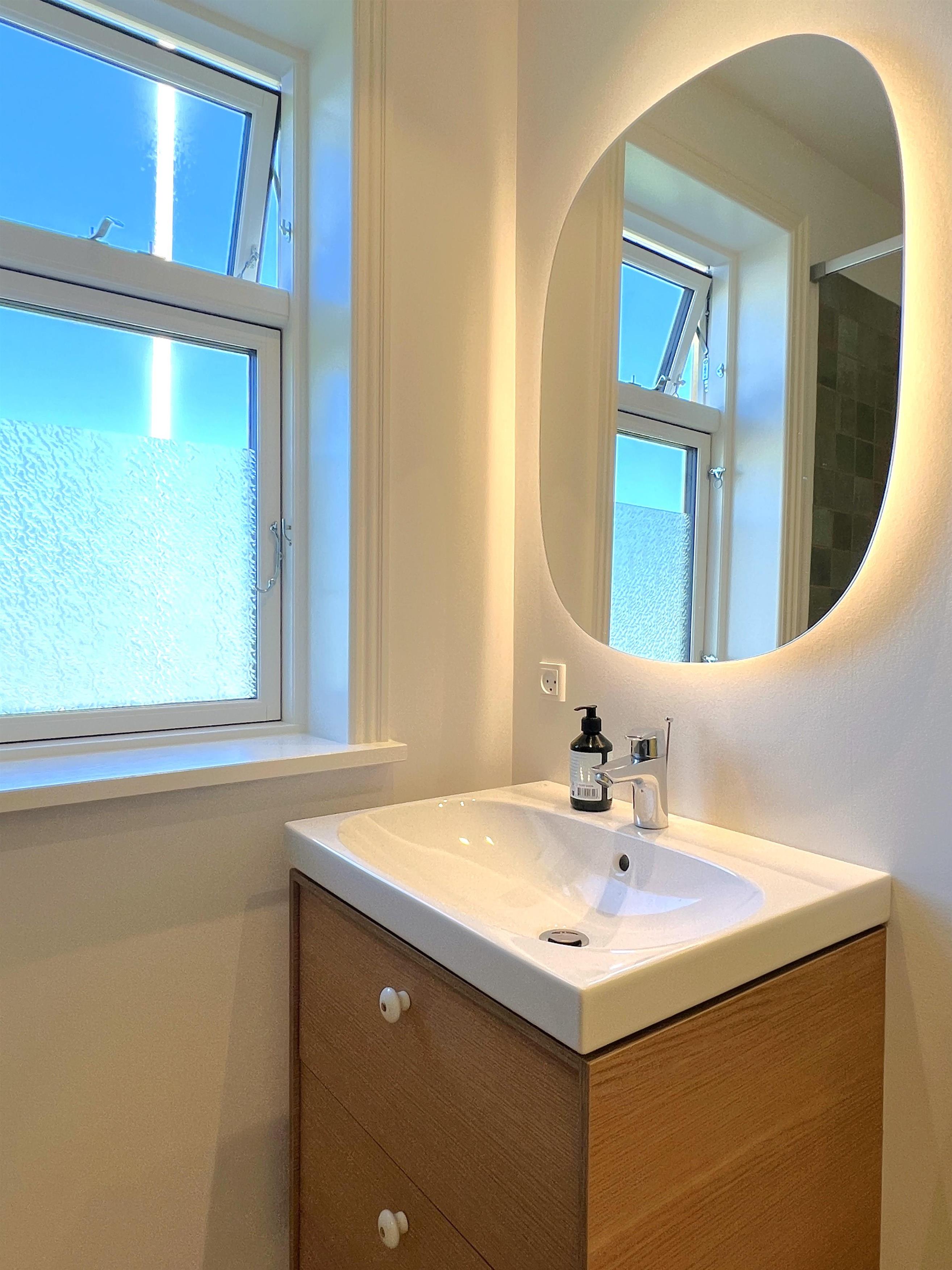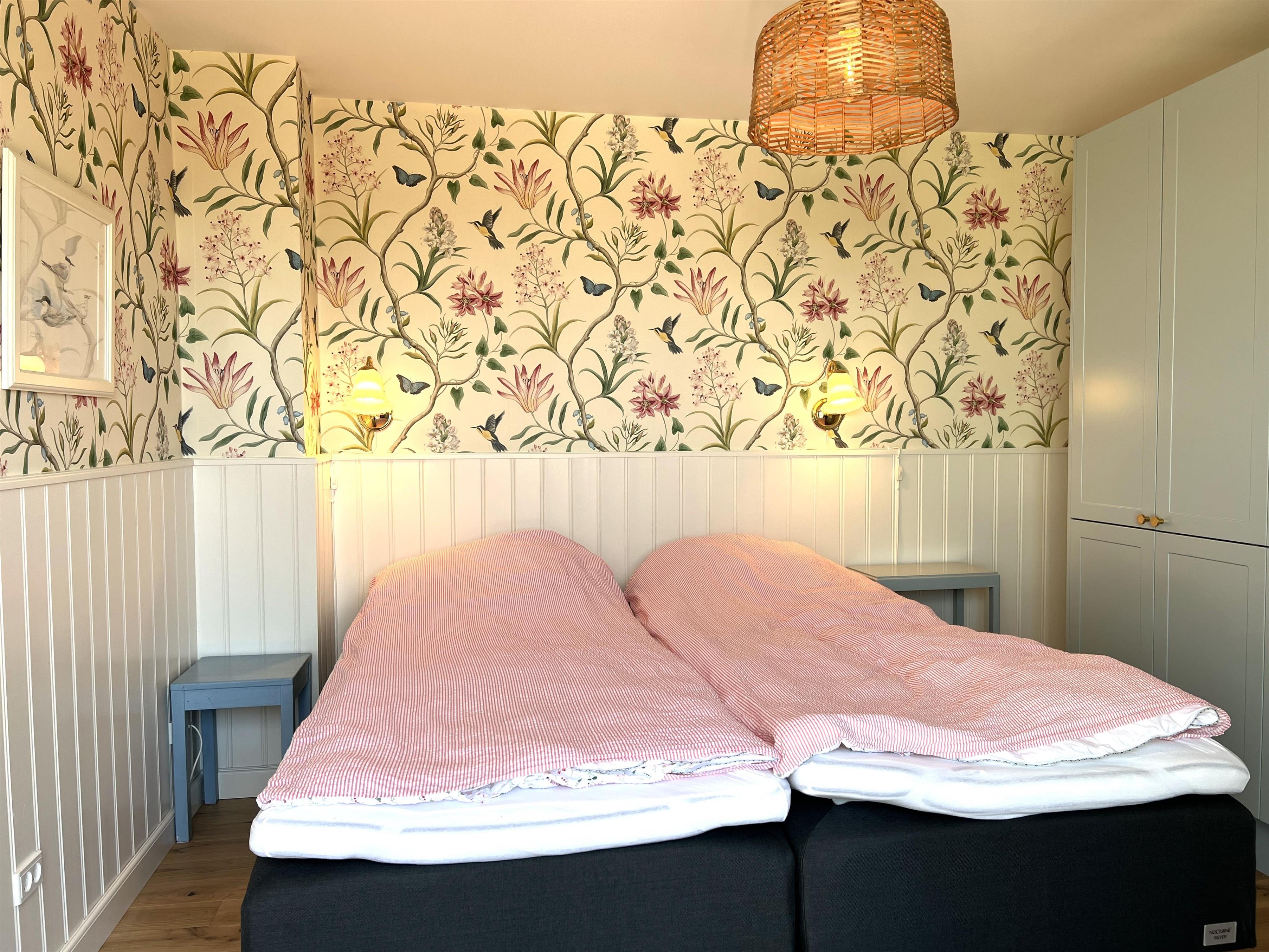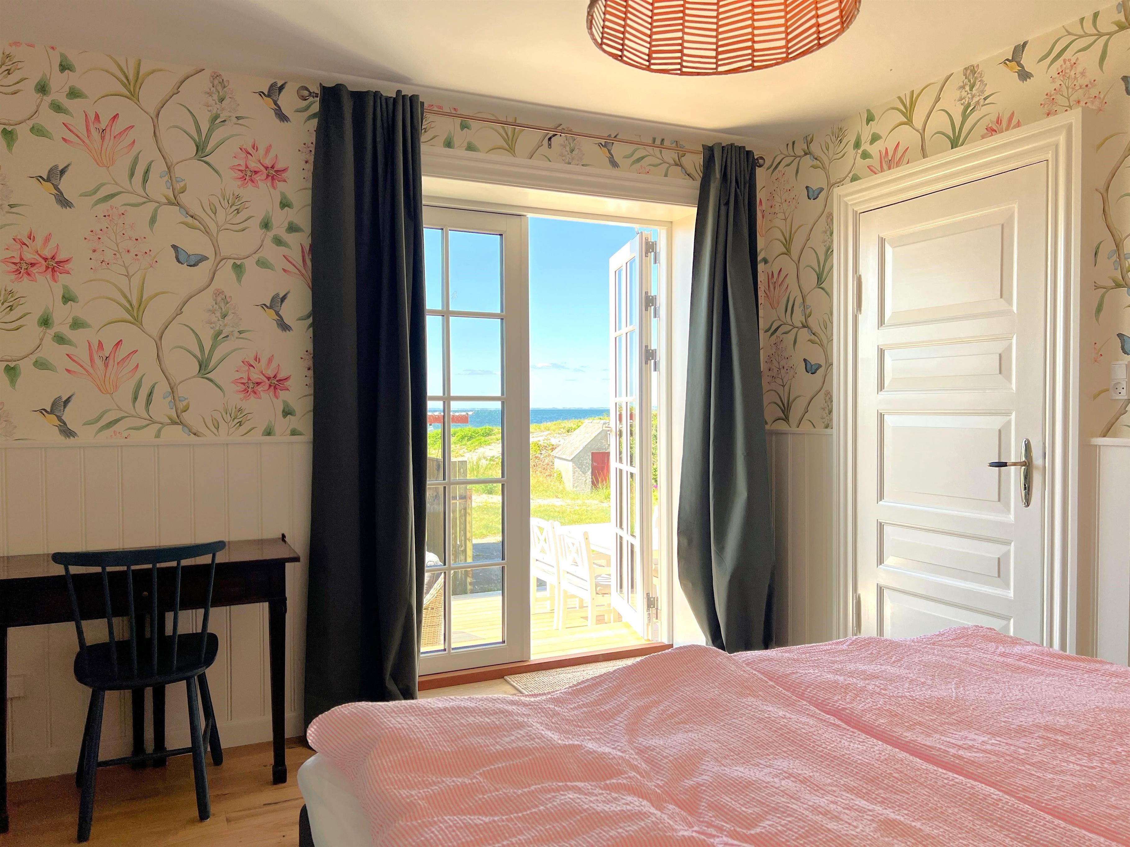 Der er et stort soveværelse med dobbeltseng, og rigtig god skabsplads. Soveværelset har, som de andre rum i huset, helt sin egen charmerende stil, og man vågner op til det smukkeste view over Kattegat. Fint nyt badeværelse med brus.