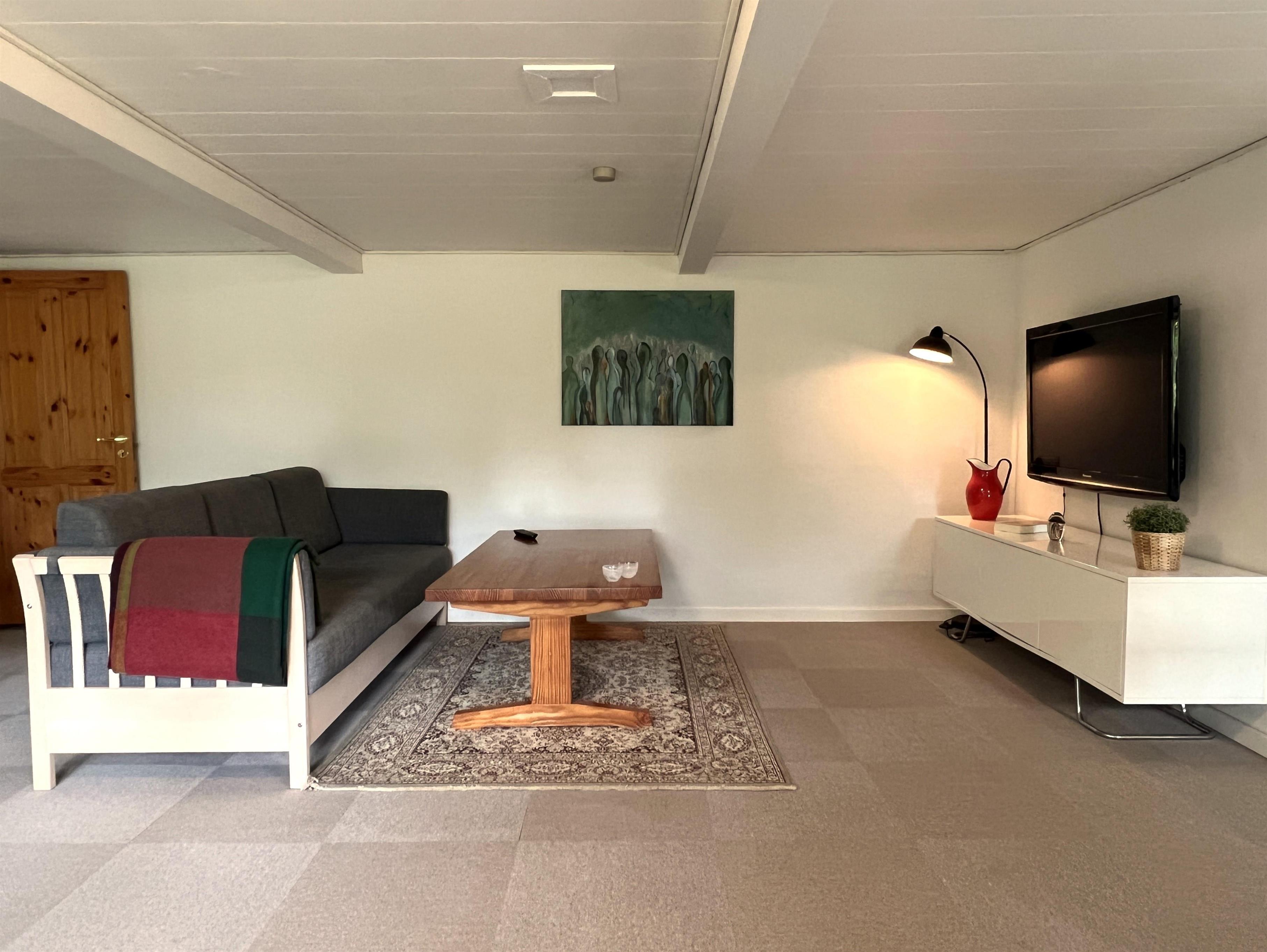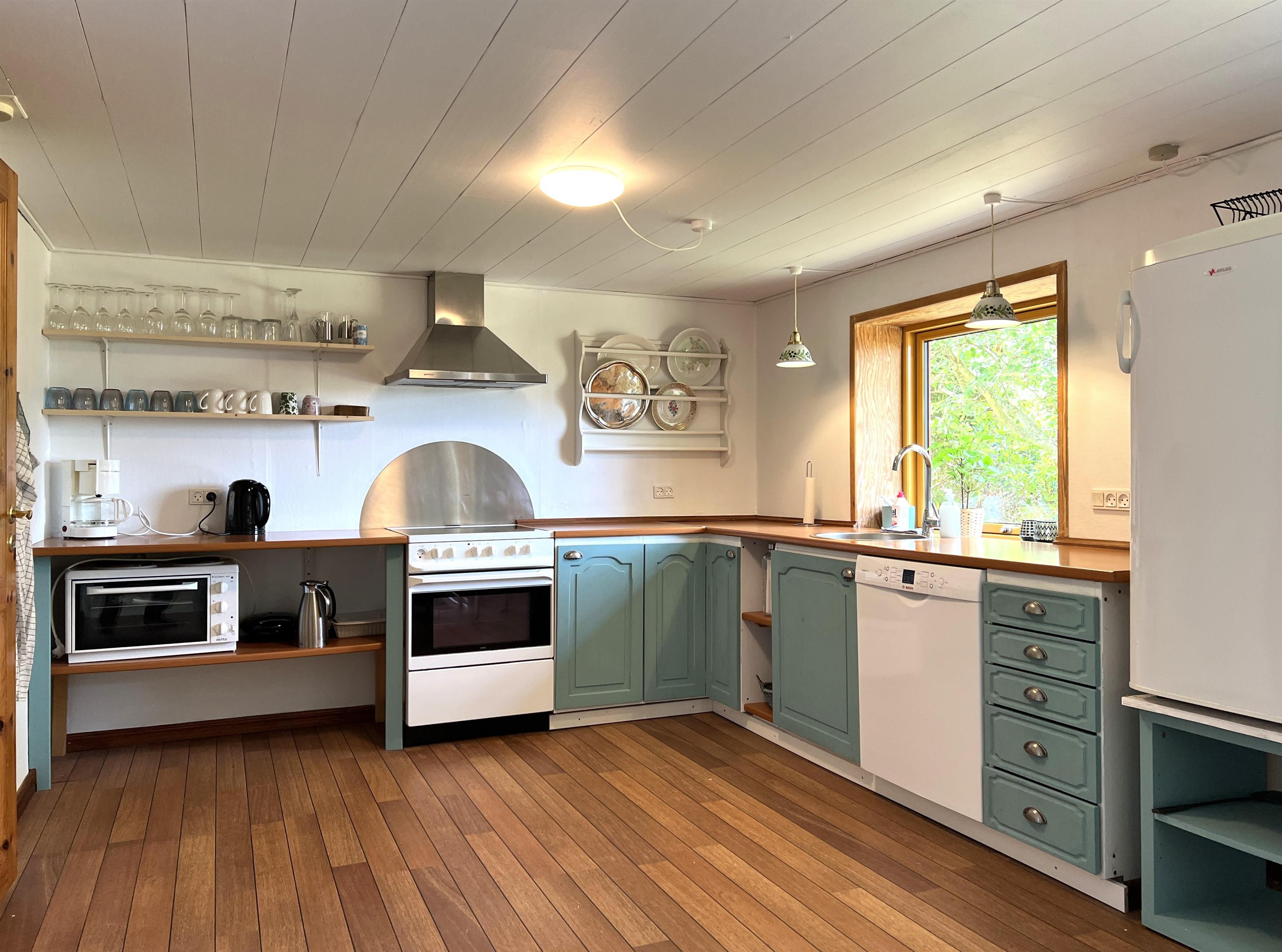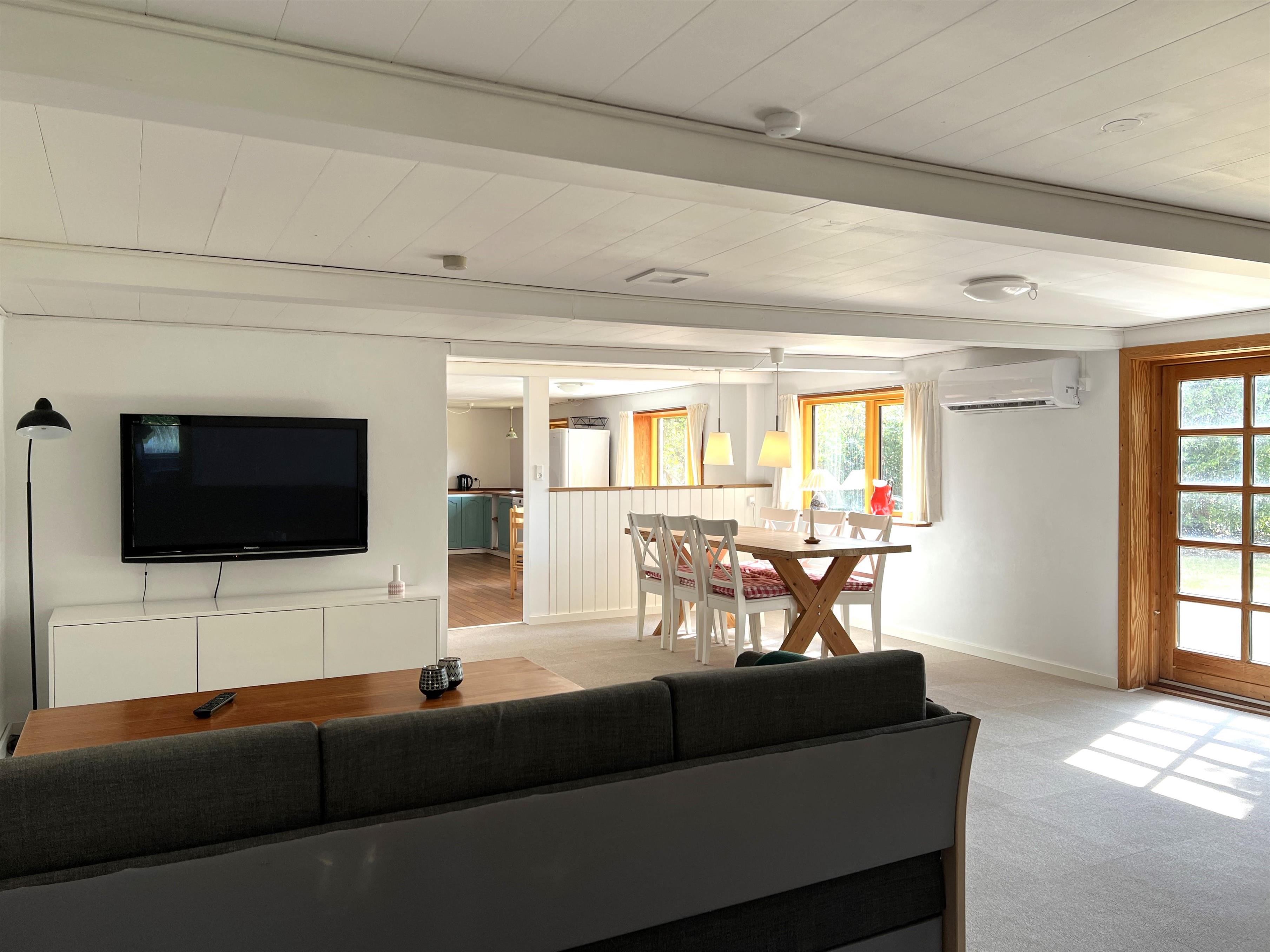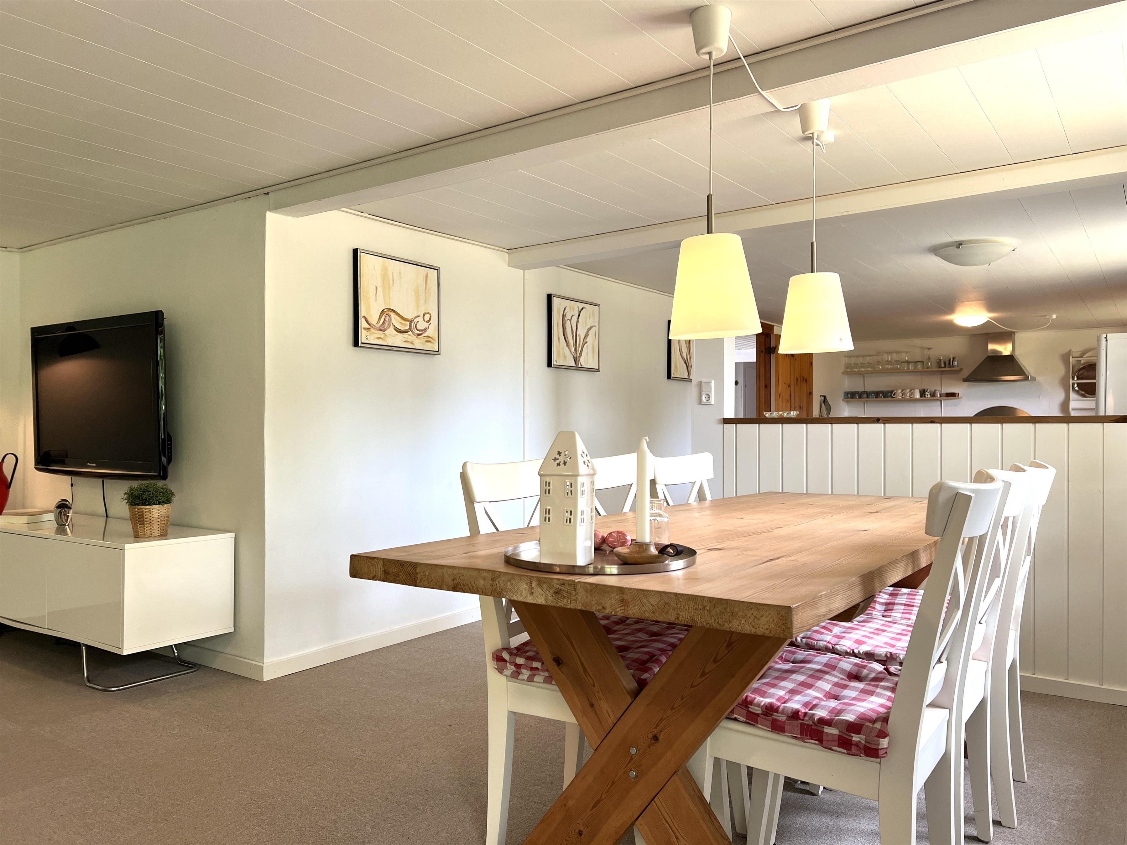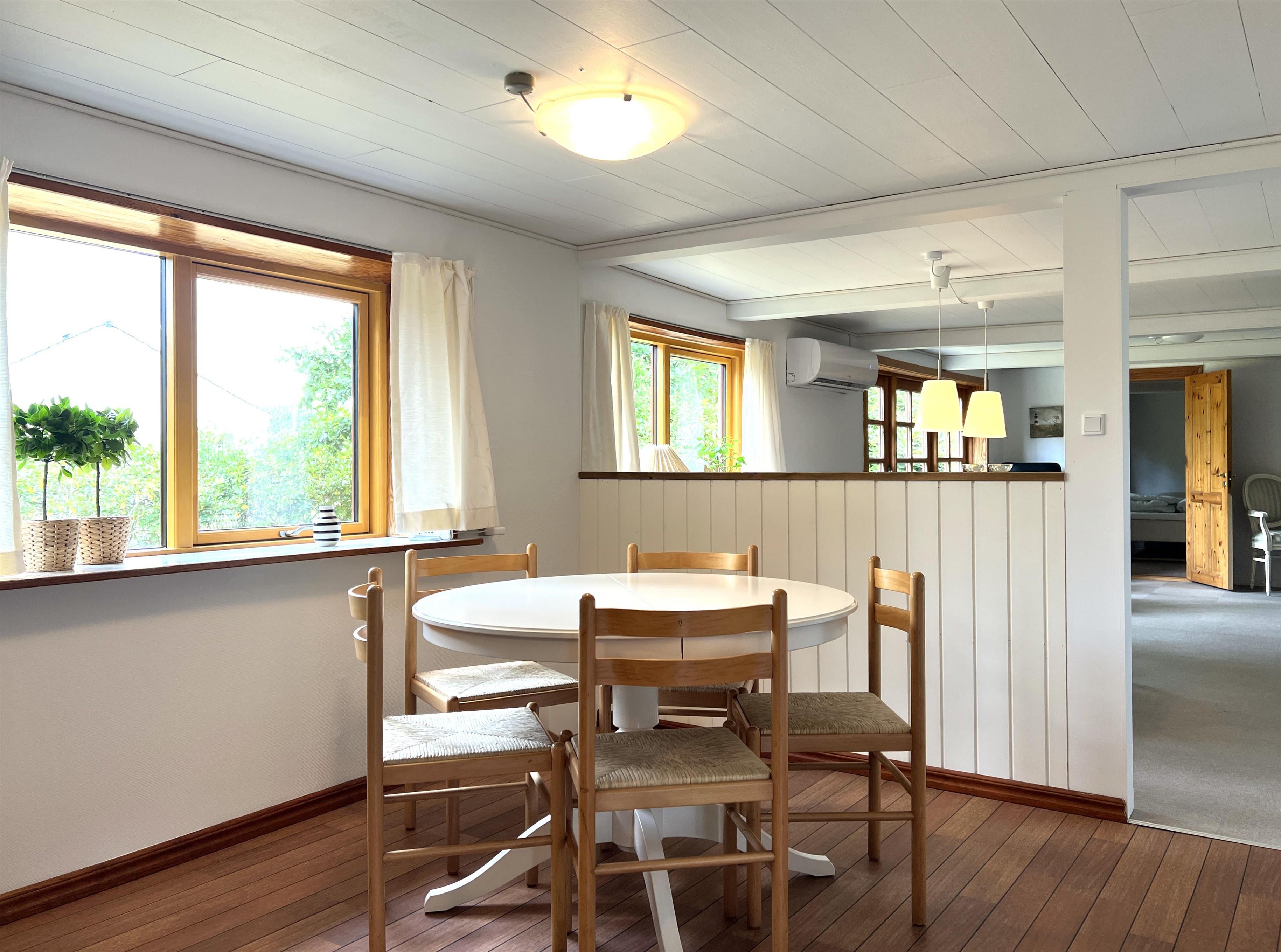 Selve huset har plads til ni personer fordelt på tre soveværelser med dobbeltsenge og et soveværelse med tre enkeltsenge. Stort, funktionelt køkken i forbindelse med spiseplads og meget fin, rummelig stue. I stuen findes endnu et spisebord til den store familie. Udgang til terrasse med have og gode solkroge. Fint badeværelse med brus.