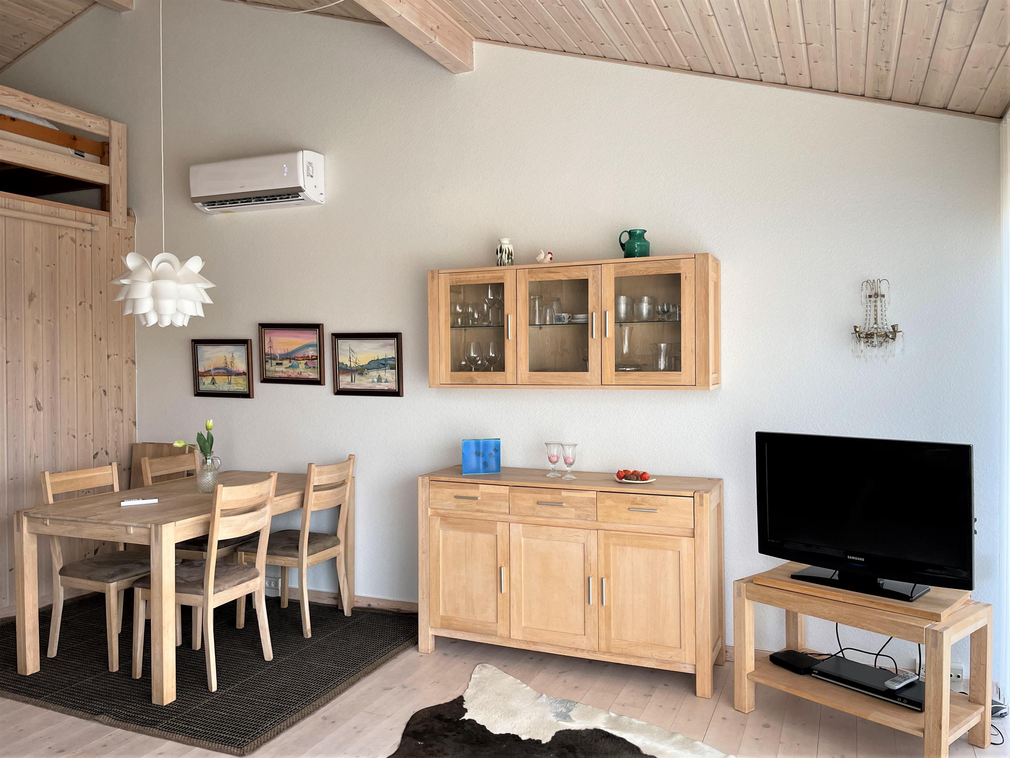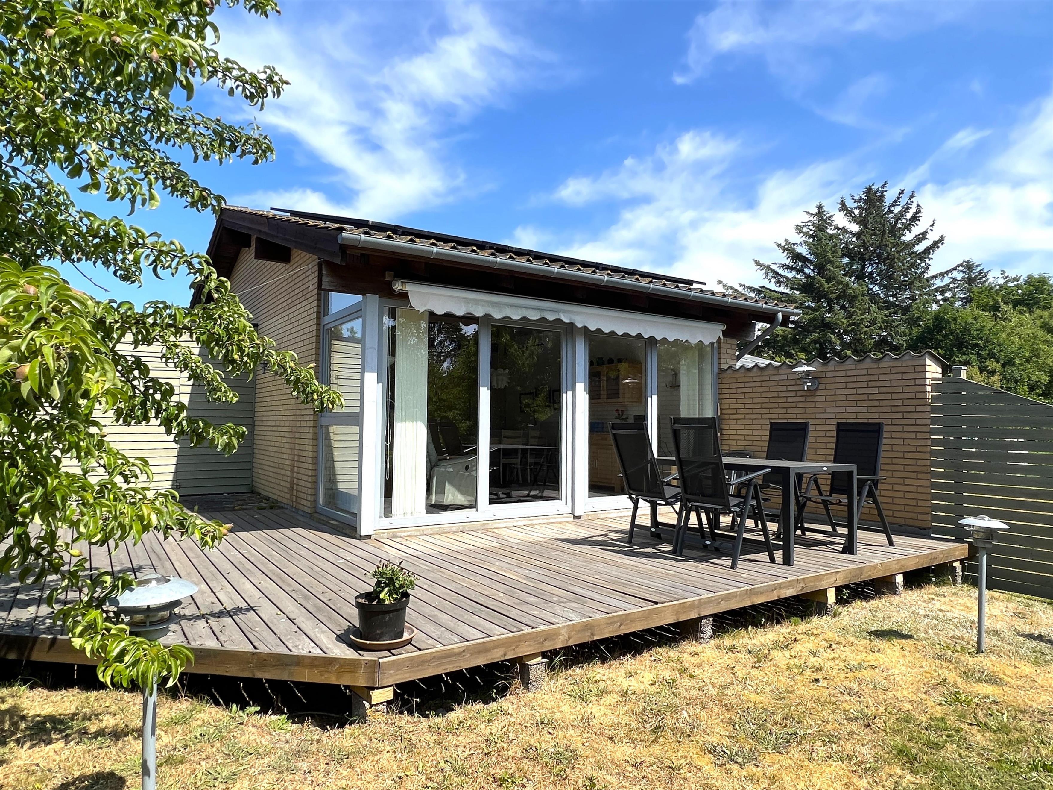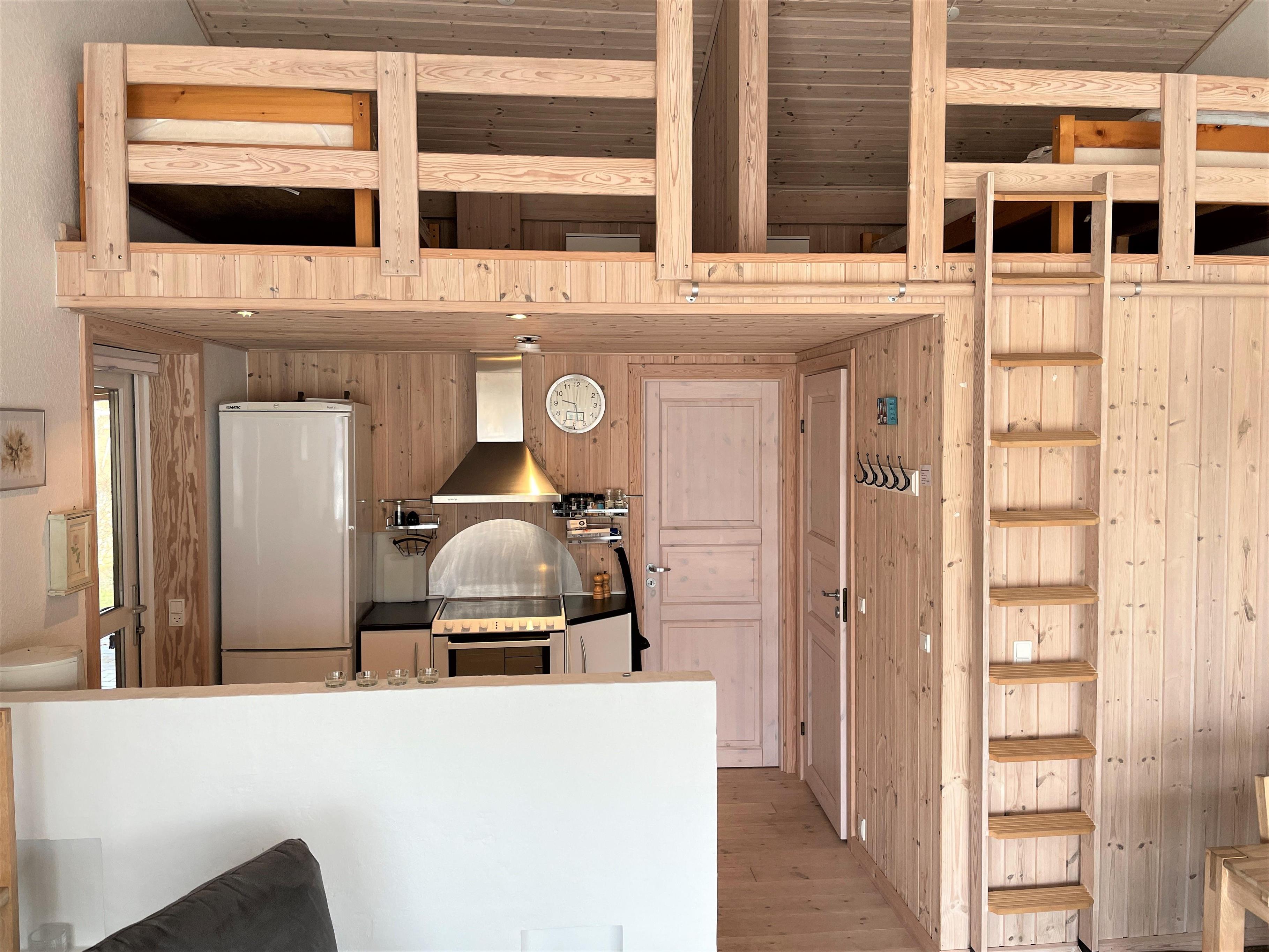 Ferielejlighed med loft til kip. Skøn ugenert sydvendt træterrasse. Kun 200 m til fantastisk badestrand, samt gåafstand til hyggelig havnemiljø med restauranter, fiskehandel og butikker. Denne skønne feriebolig er et halvt rækkehus. Flot istandsat, moderne indrettet. Stue, køkken/alrum i et, stort glasparti ud til sydvendt terrasse. Flot badeværelse med sauna. Soveværelse med dobbeltseng (140 cm bred) samt sovesofa i stuen. Tilbygget anneks med køjeseng ( 120 cm bred forneden ) Hems med ekstra sovepladser, (obs stejl trappestige).