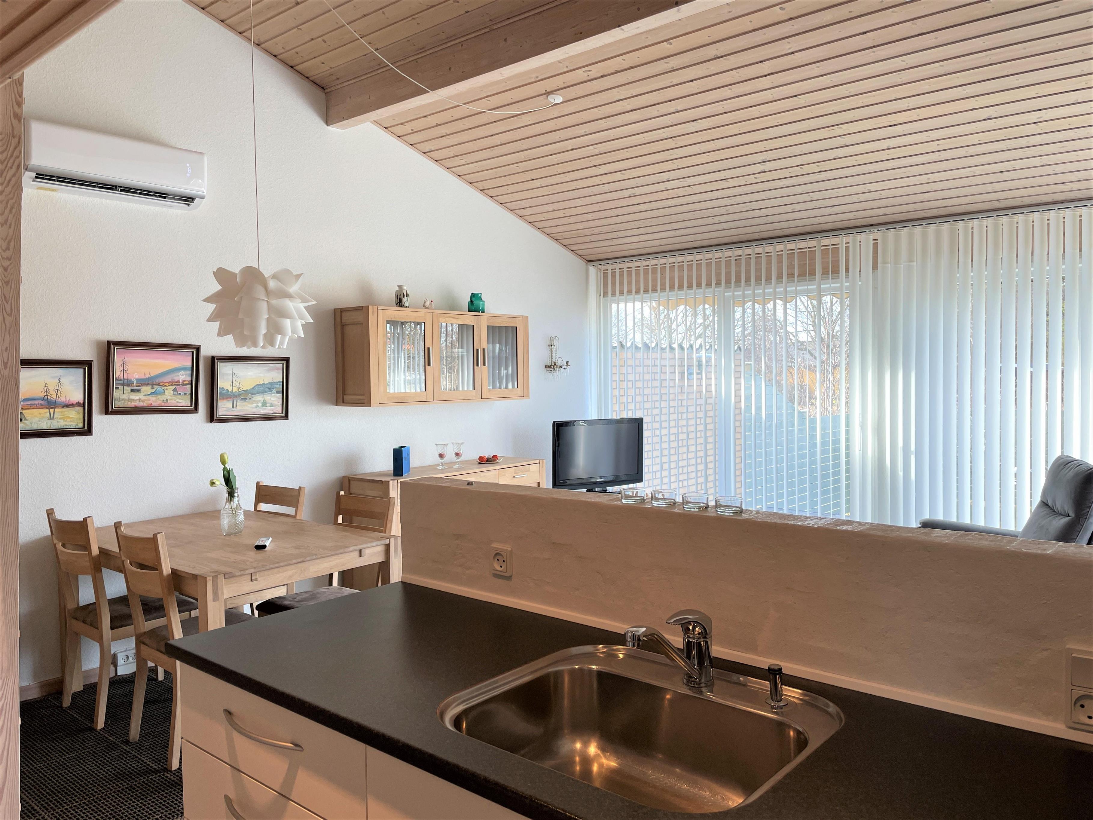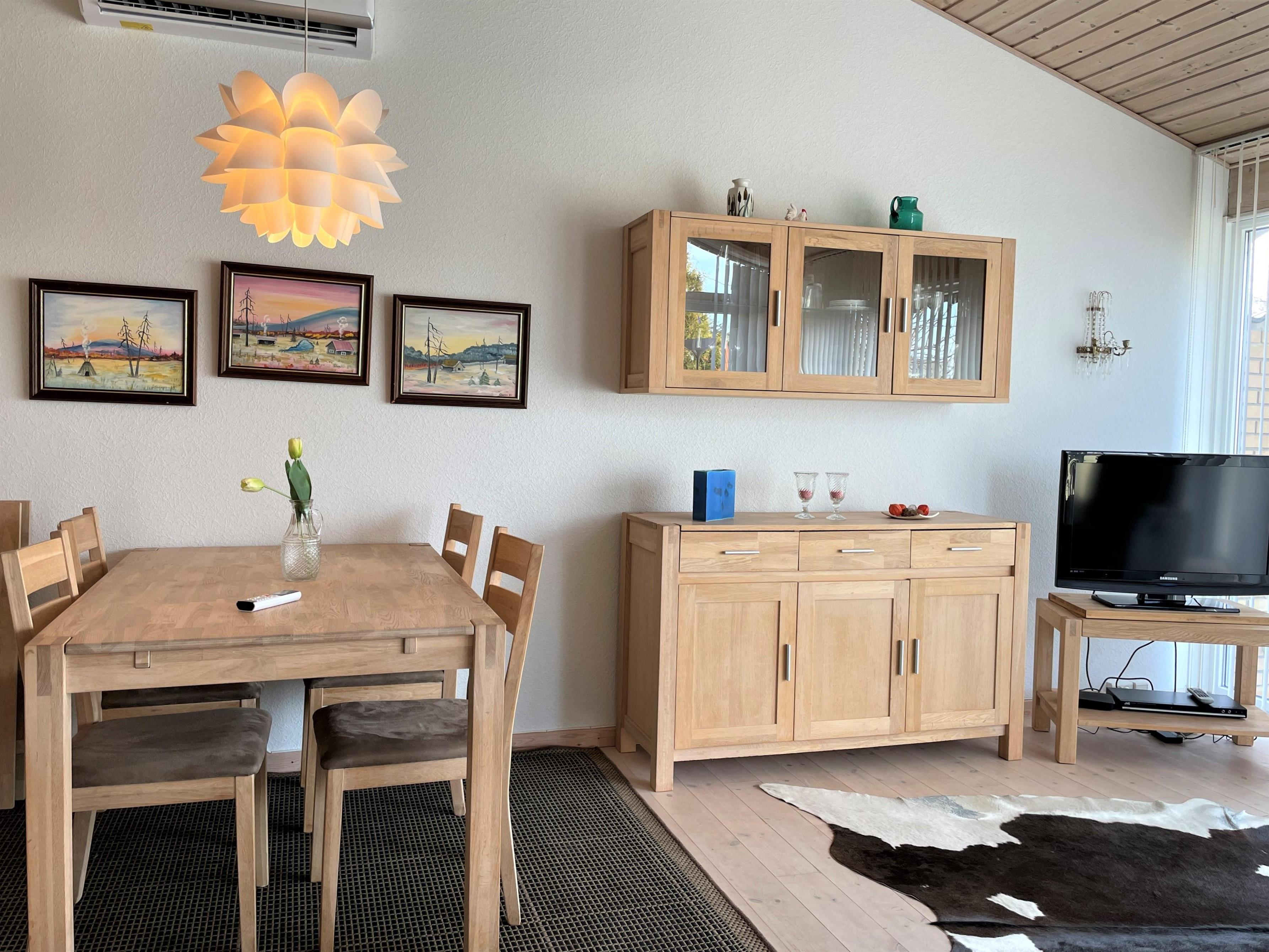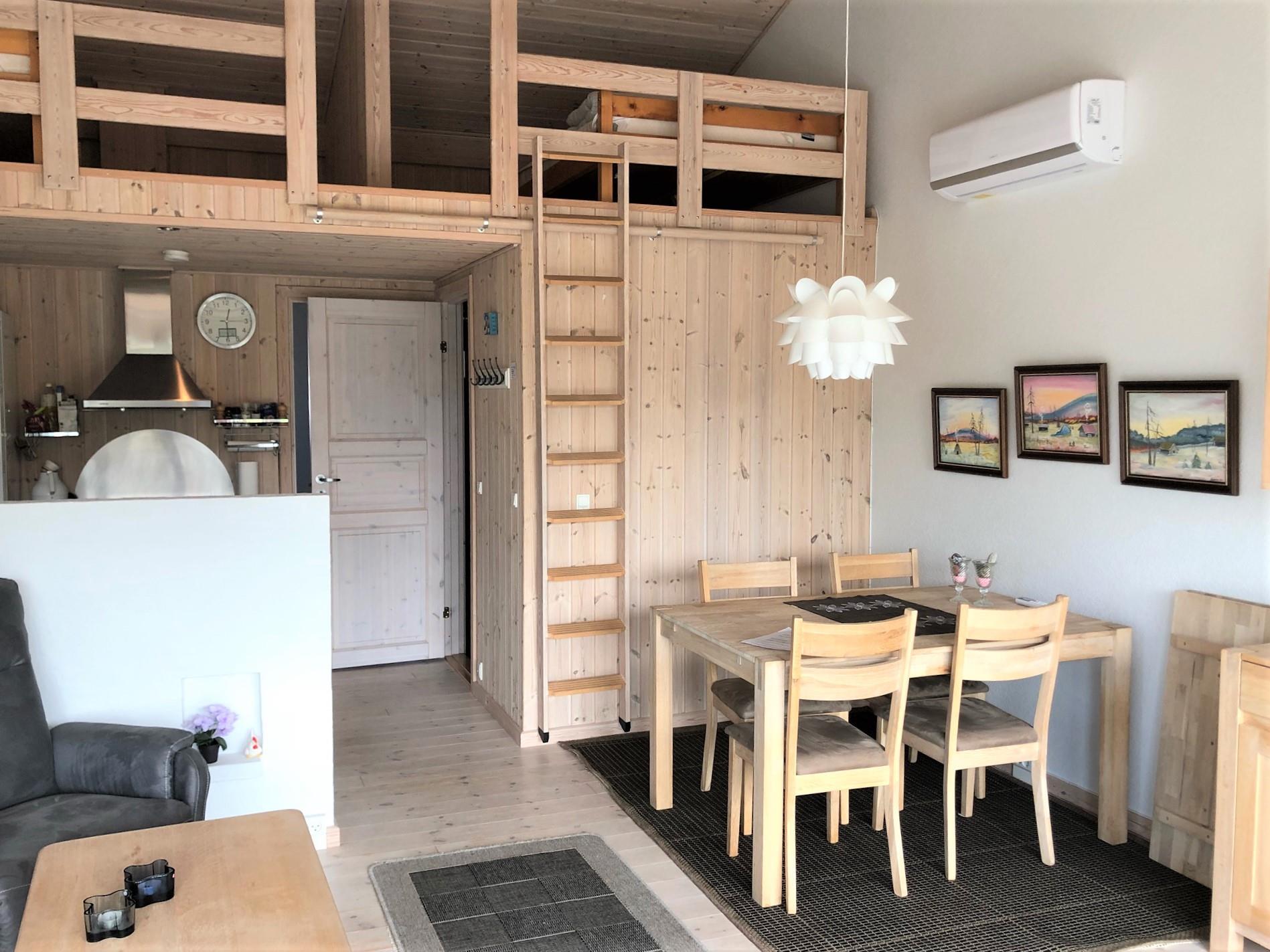 Ferielejlighed med loft til kip. Skøn ugenert sydvendt træterrasse. Kun 200 m til fantastisk badestrand, samt gåafstand til hyggelig havnemiljø med restauranter, fiskehandel og butikker. Denne skønne feriebolig er et halvt rækkehus. Flot istandsat, moderne indrettet. Stue, køkken/alrum i et, stort glasparti ud til sydvendt terrasse. Flot badeværelse med sauna. Soveværelse med dobbeltseng (140 cm bred) samt sovesofa i stuen. Tilbygget anneks med køjeseng ( 120 cm bred forneden ) Hems med ekstra sovepladser, (obs stejl trappestige).