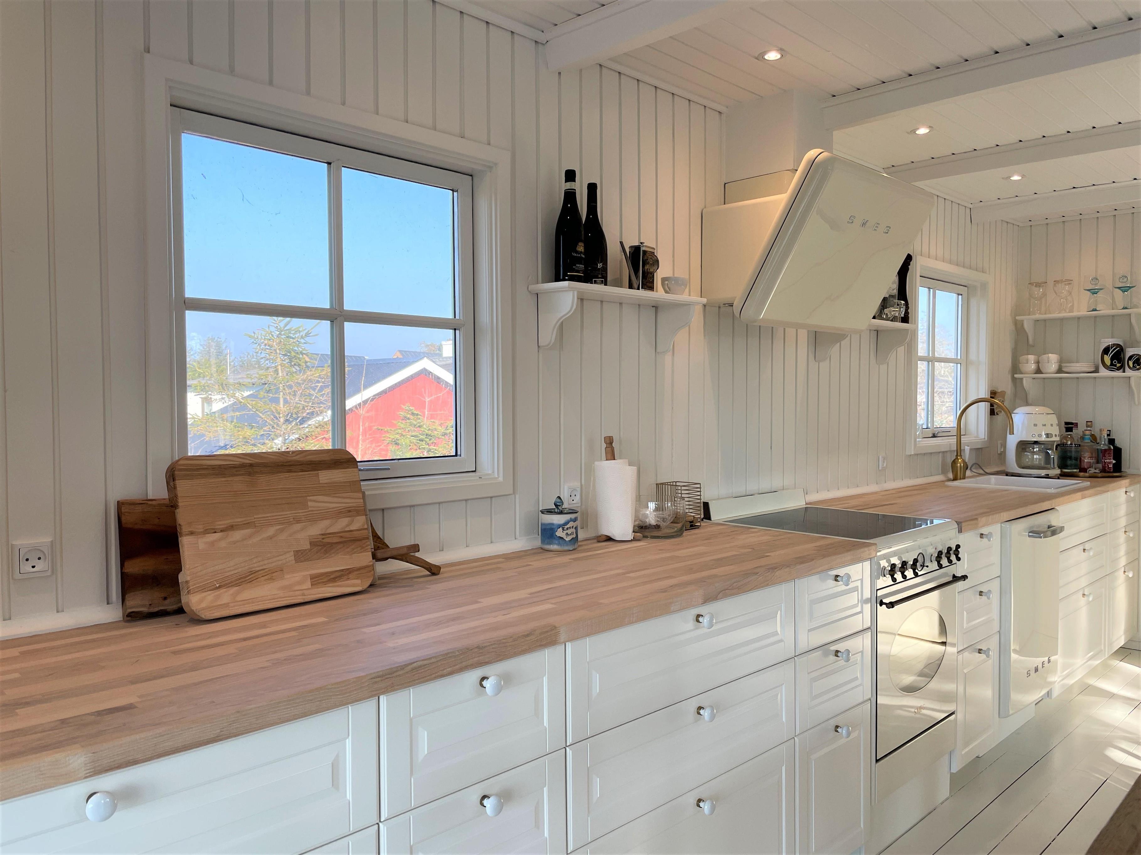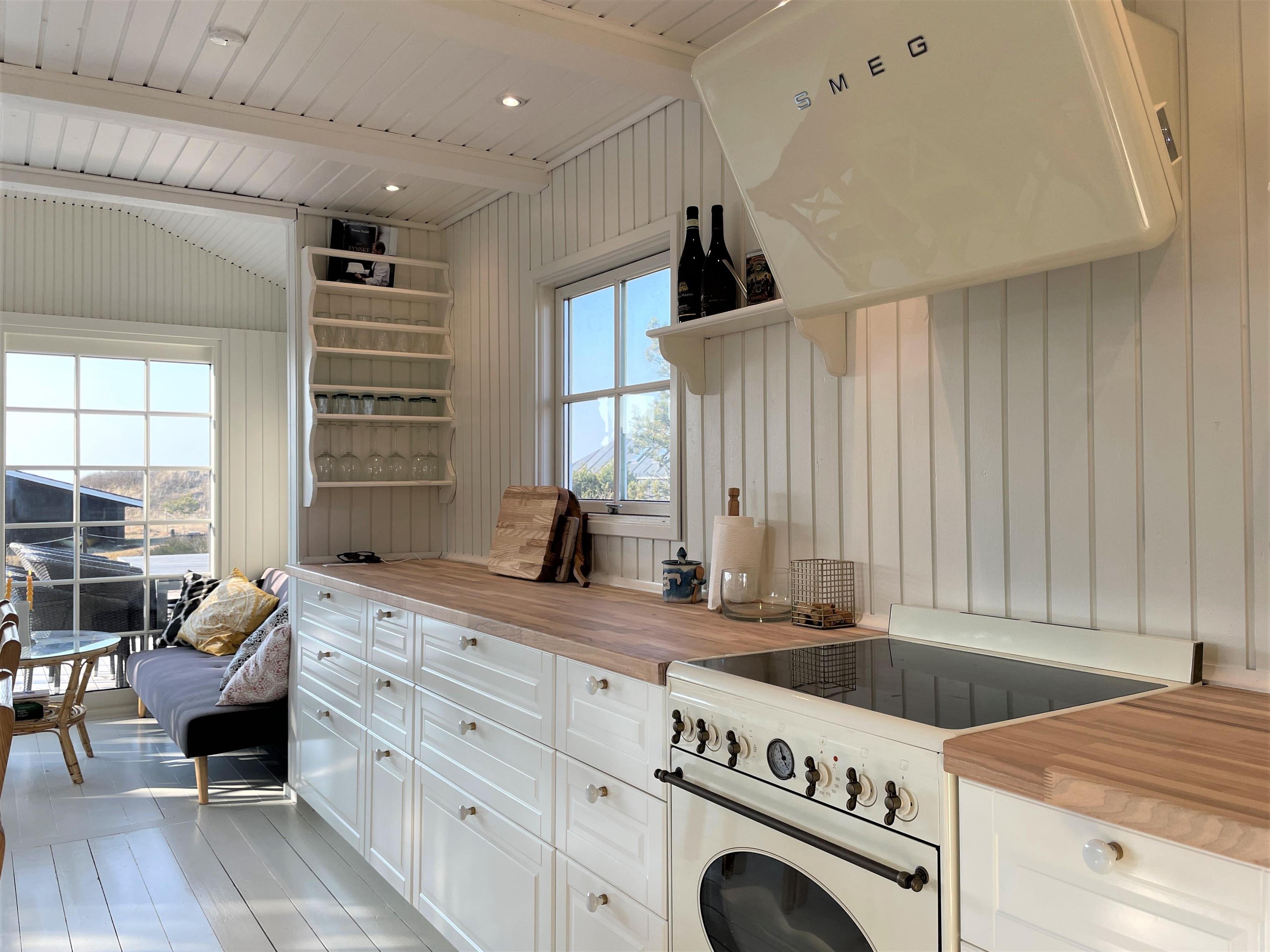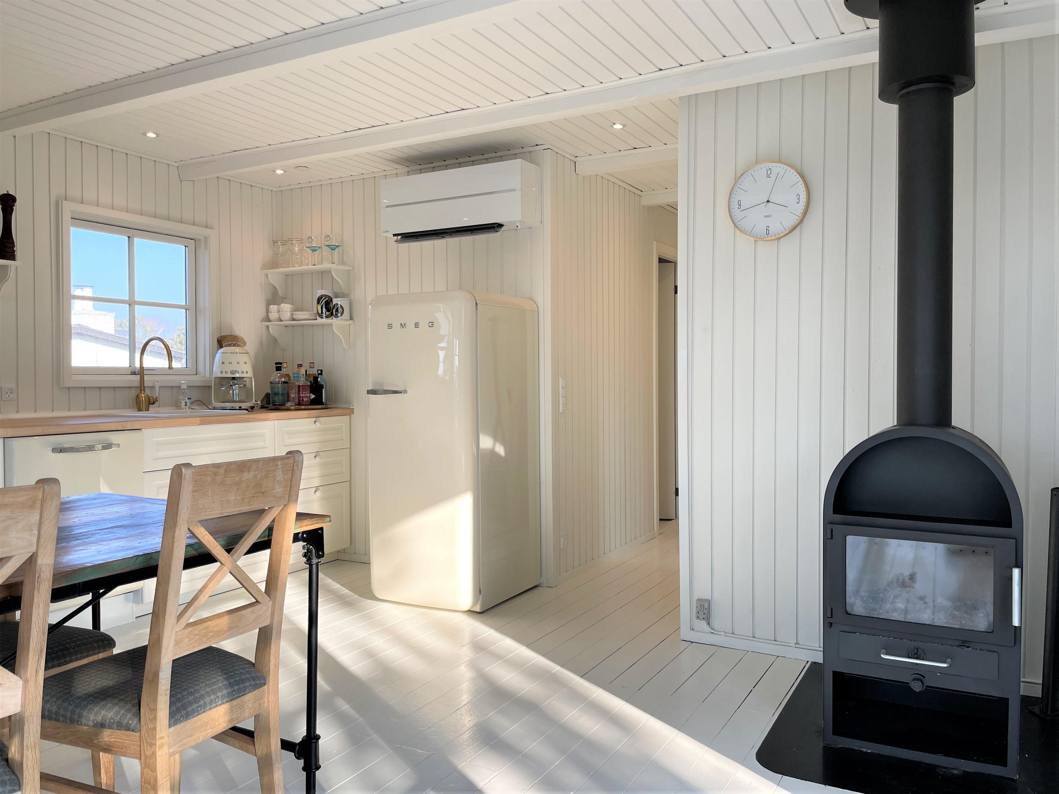 Huset er smagfuldt indrettet og med respekt for at bevare den hyggelige sommerhusstil. Lyst, lækkert køkken-alrum med moderne køkken, som er forsynet med hårde hvidevarer fra kvalitetsproducenten, SMEG. Flot, stort spisebord midt i rummet, som giver mulighed for at invitere gæster samt hyggelig sofaafdeling ud mod vandet. De store dobbeltdøre sikrer et flot lysindfald i hele rummet, og der er let adgang til den store træterrasse, hvor havemøbler og solstole findes. Huset har desuden tre soveværelser, et med dobbeltseng, et med to enkeltsenge samt et med køjeseng, der måler 190 cm. Nyt, moderne badeværelse med gulvvarme.