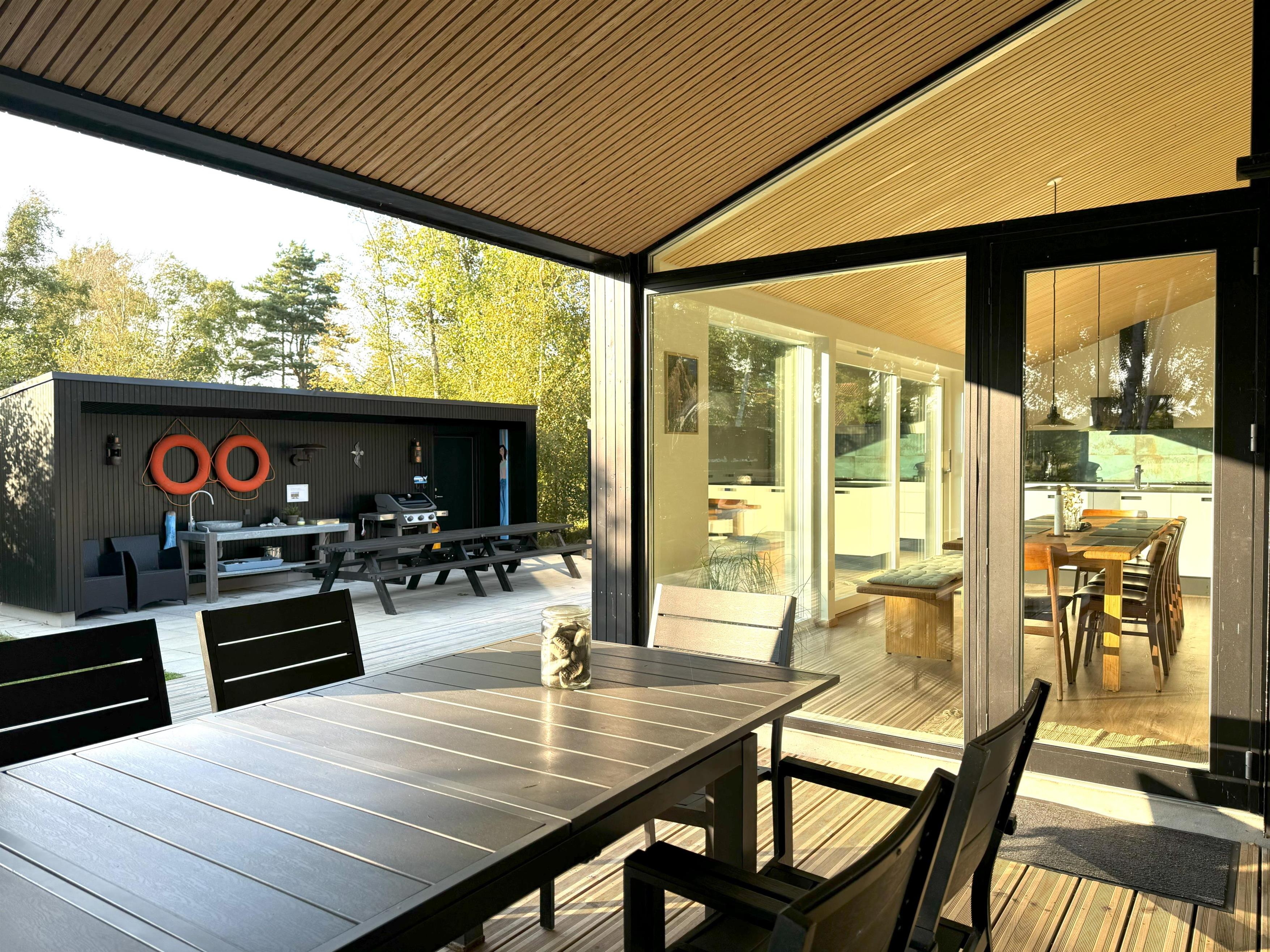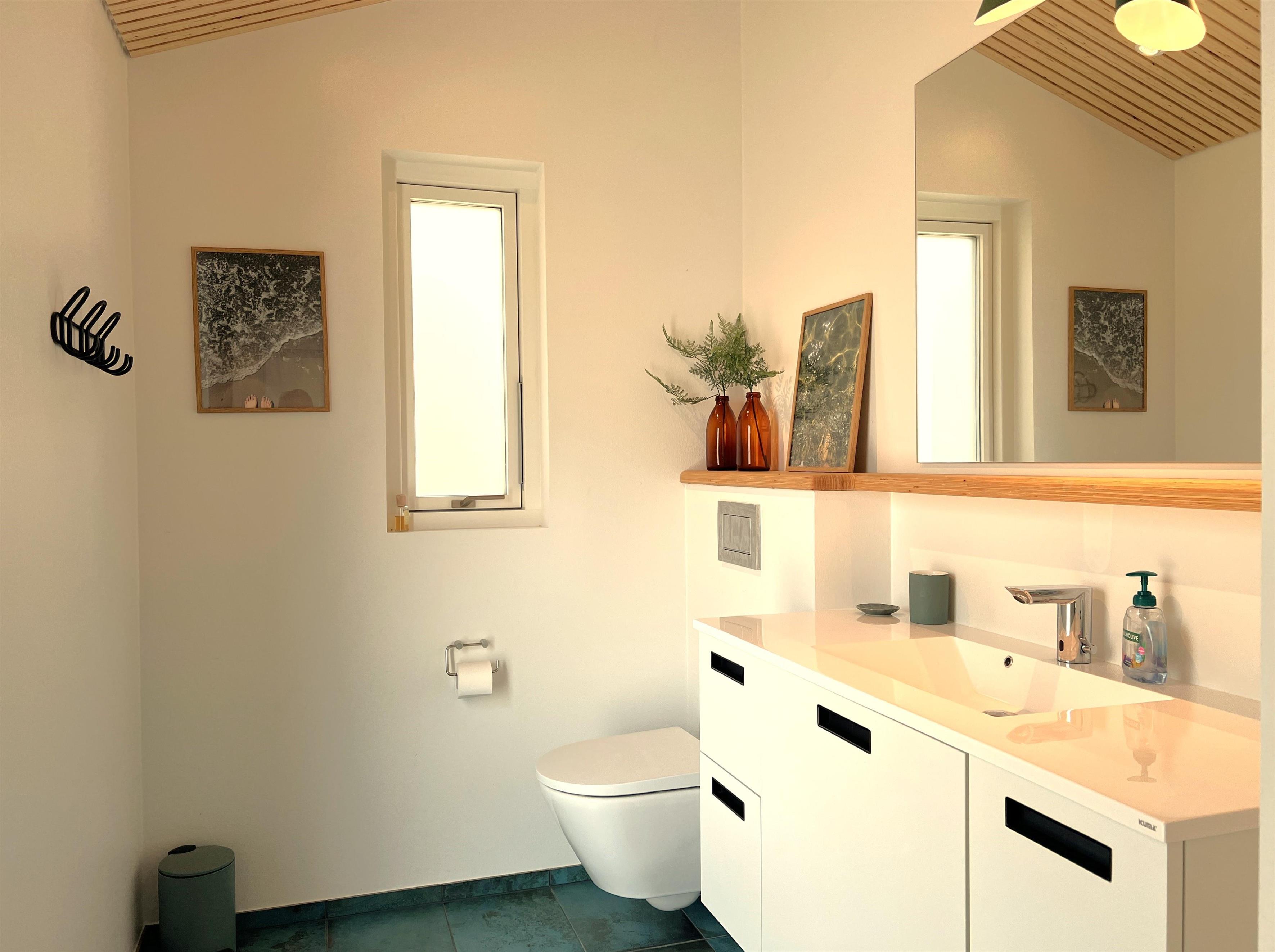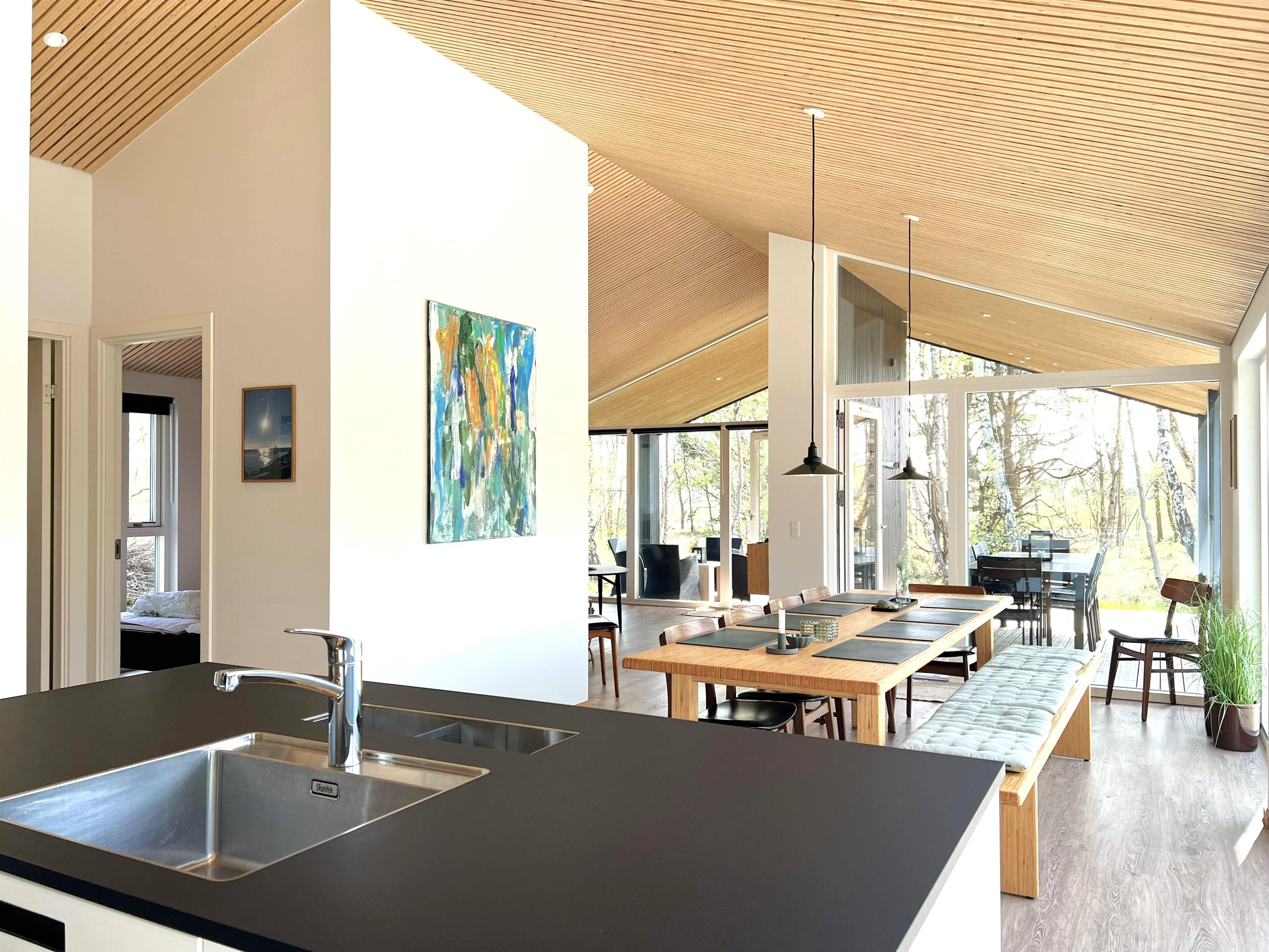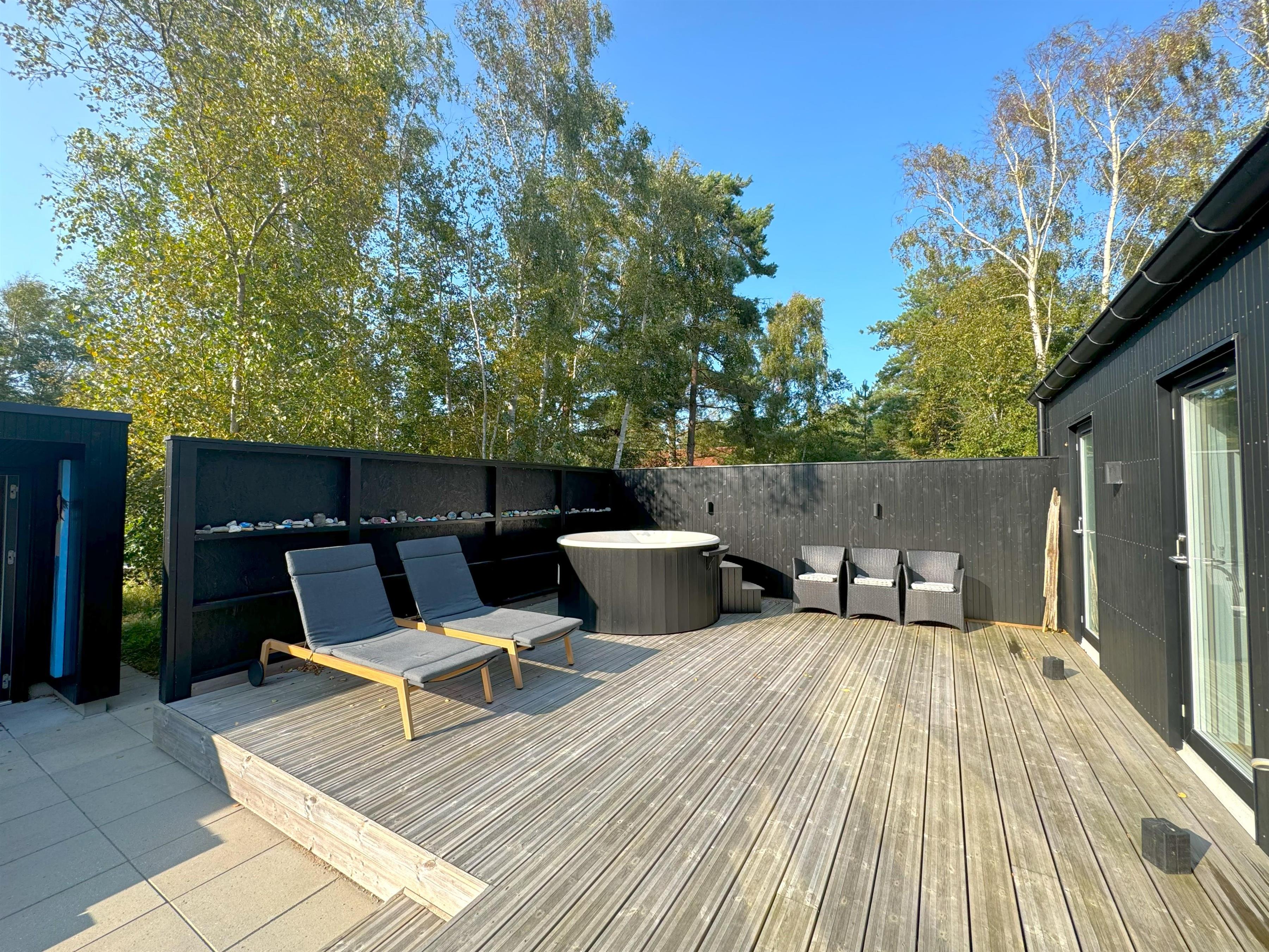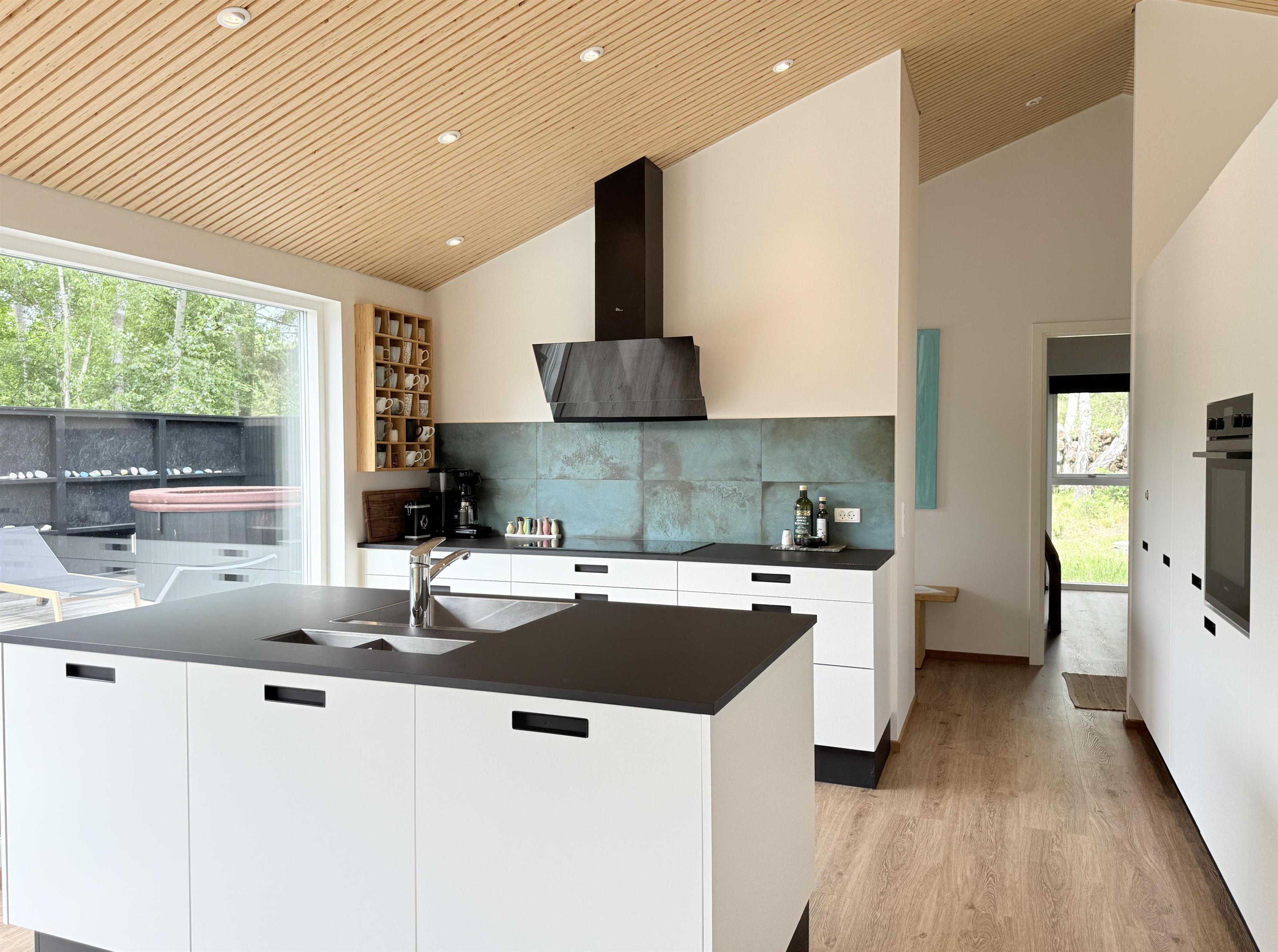 NYT hos Team Læsø. I hjertet af Vesterø ligger dette fantastiske, splinternye feriehus, som nemt rummer hele 9 personer. Huset har alle moderne faciliteter, og der er bare kælet for detaljerne overalt i huset. Der er et imponerende, flot, lyst, velindrettet og rummeligt køkken-alrum med køkken-ø, spisebord og sofa/TV-afdeling. Der er flere udgange til husets skønne terrasser, hvoraf en del er overdækket og man kan altid finde en solkrog, hvor man kan nyde både morgen og aftensolen. Der er endvidere etableret en fin gårdhave med grill og udekøkken,og vildmarksbadet frister konstant med sin placering i forlængelse af gårdhaven. Huset har fire gode soveværelser, hvoraf tre er med dobbeltsenge og et er med køjeseng, hvor nederste seng er 140 cm. Der er to moderne, fine badeværelser, og der er direkte udgang til terrasse fra det ene. Huset opvarmes med energivenlig luft/vand varmepumpe, og ved husets P-plads er der installeret ladestation til elbil.