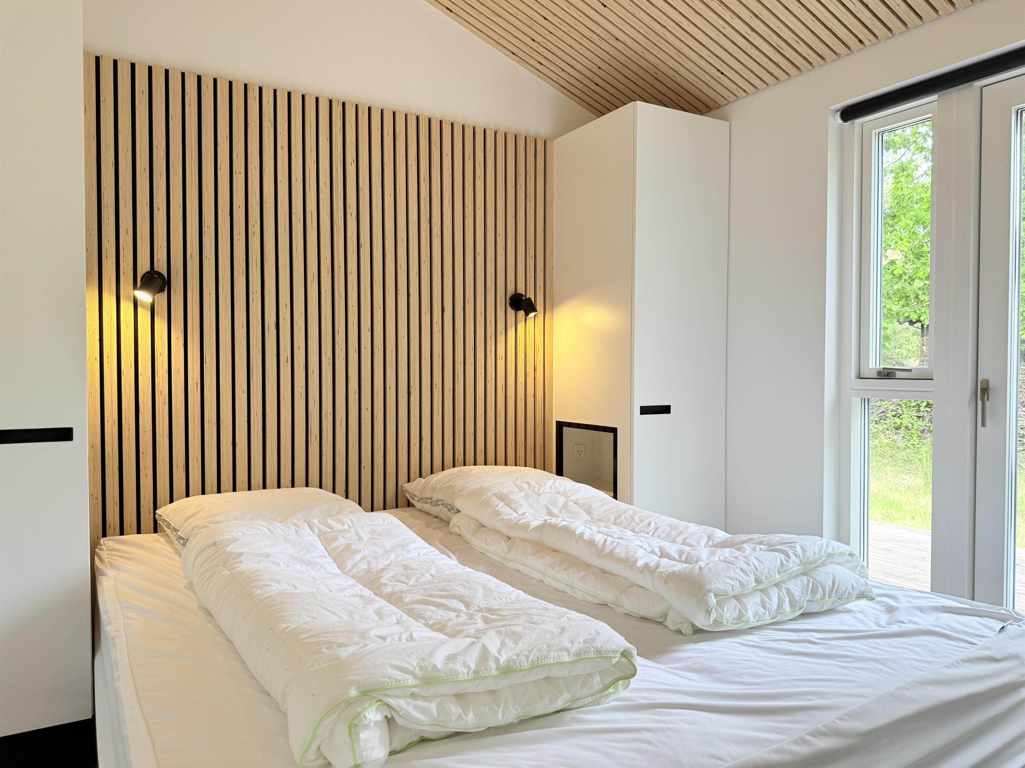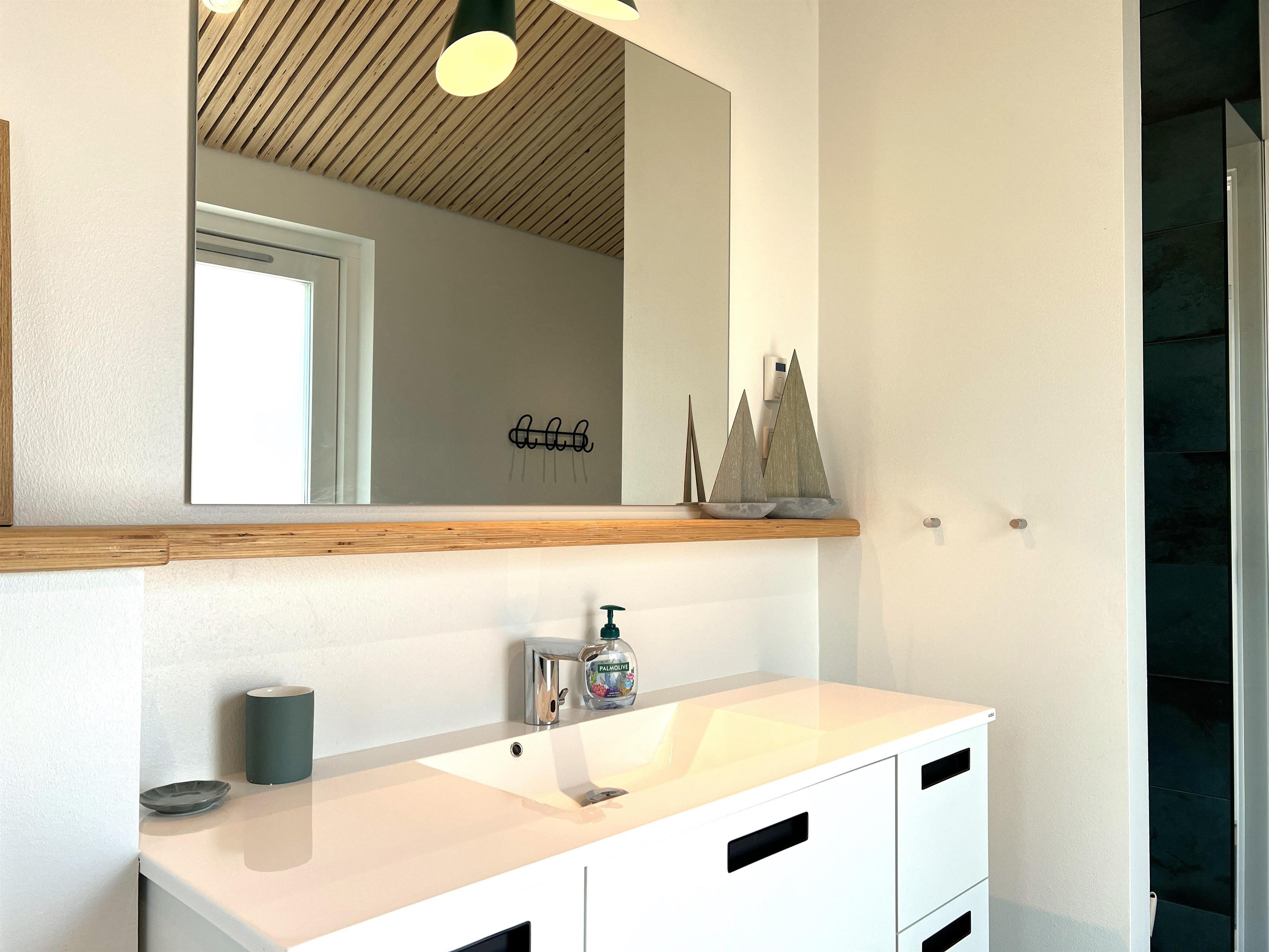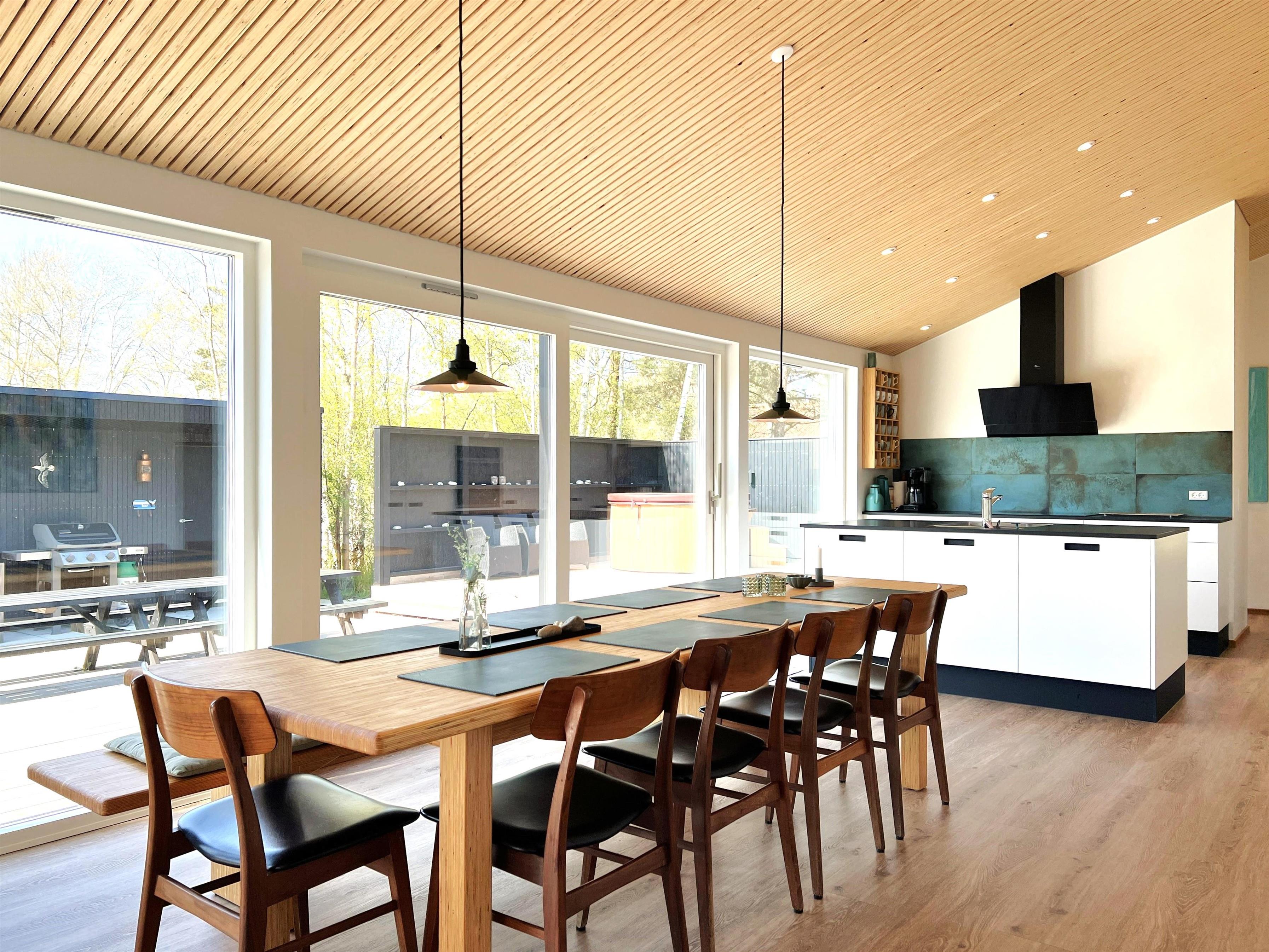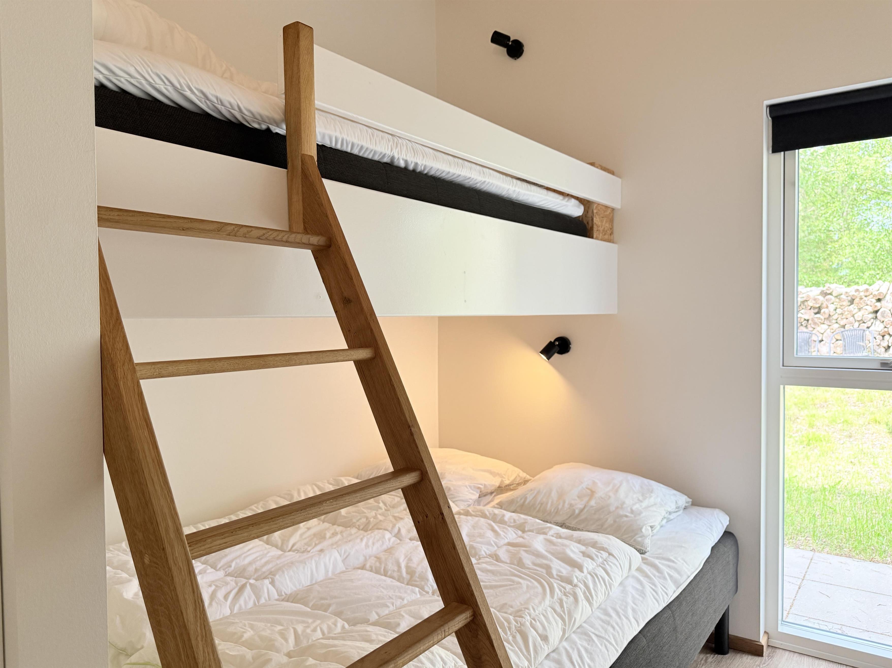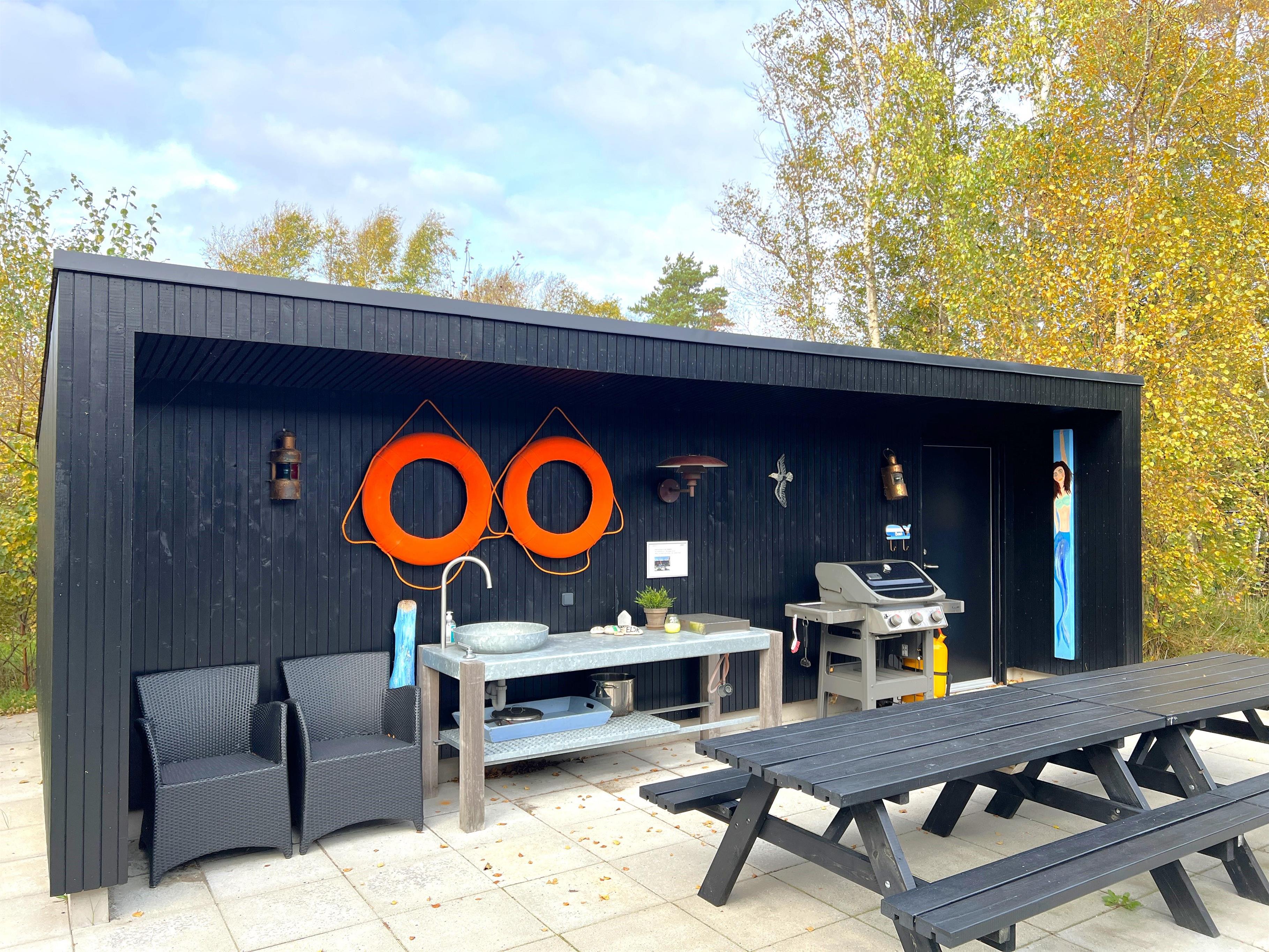 NYT hos Team Læsø. I hjertet af Vesterø ligger dette fantastiske, splinternye feriehus, som nemt rummer hele 9 personer. Huset har alle moderne faciliteter, og der er bare kælet for detaljerne overalt i huset. Der er et imponerende, flot, lyst, velindrettet og rummeligt køkken-alrum med køkken-ø, spisebord og sofa/TV-afdeling. Der er flere udgange til husets skønne terrasser, hvoraf en del er overdækket og man kan altid finde en solkrog, hvor man kan nyde både morgen og aftensolen. Der er endvidere etableret en fin gårdhave med grill og udekøkken,og vildmarksbadet frister konstant med sin placering i forlængelse af gårdhaven. Huset har fire gode soveværelser, hvoraf tre er med dobbeltsenge og et er med køjeseng, hvor nederste seng er 140 cm. Der er to moderne, fine badeværelser, og der er direkte udgang til terrasse fra det ene. Huset opvarmes med energivenlig luft/vand varmepumpe, og ved husets P-plads er der installeret ladestation til elbil.