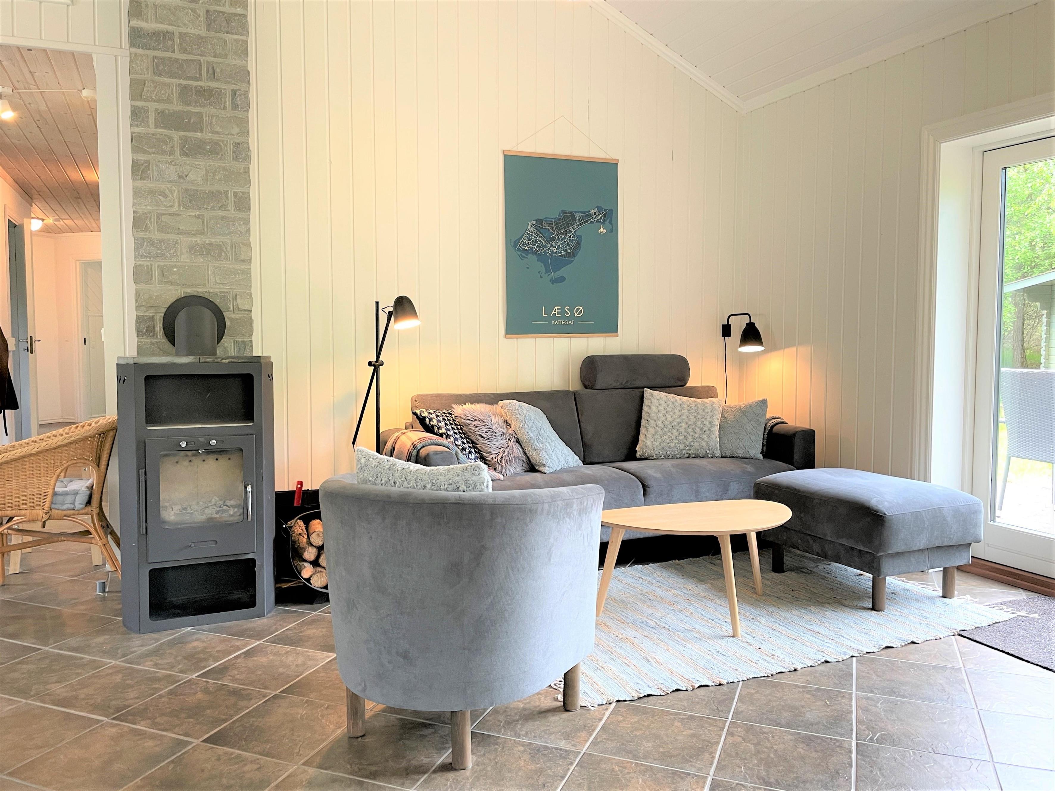 Dette flotte, store sommerhus med tre badeværelser har en dejlig ugenert beliggenhed i det attraktive, naturskønne feriehusområde nord for Vesterø Havn tæt på både stranden og det smukke hede/skovområde. Huset er lyst og lækkert indrettet med stor stue med brændeovn og komfortabelt køkken/alrum med spiseplads. Der er i alt fire soveværelser, to med dobbeltsenge og et med to enkeltsenge, - derudover anneks med dobbeltseng. Havedør til terrassen fra det ene soveværelse. Der er fint lysindfald i alle rum fra de mange vinduer. Huset er, som nævnt, udstyret med hele tre badeværelser, hvoraf et er med badekar. Trappe til overetagen, hvor der er et stort opholdsrum.