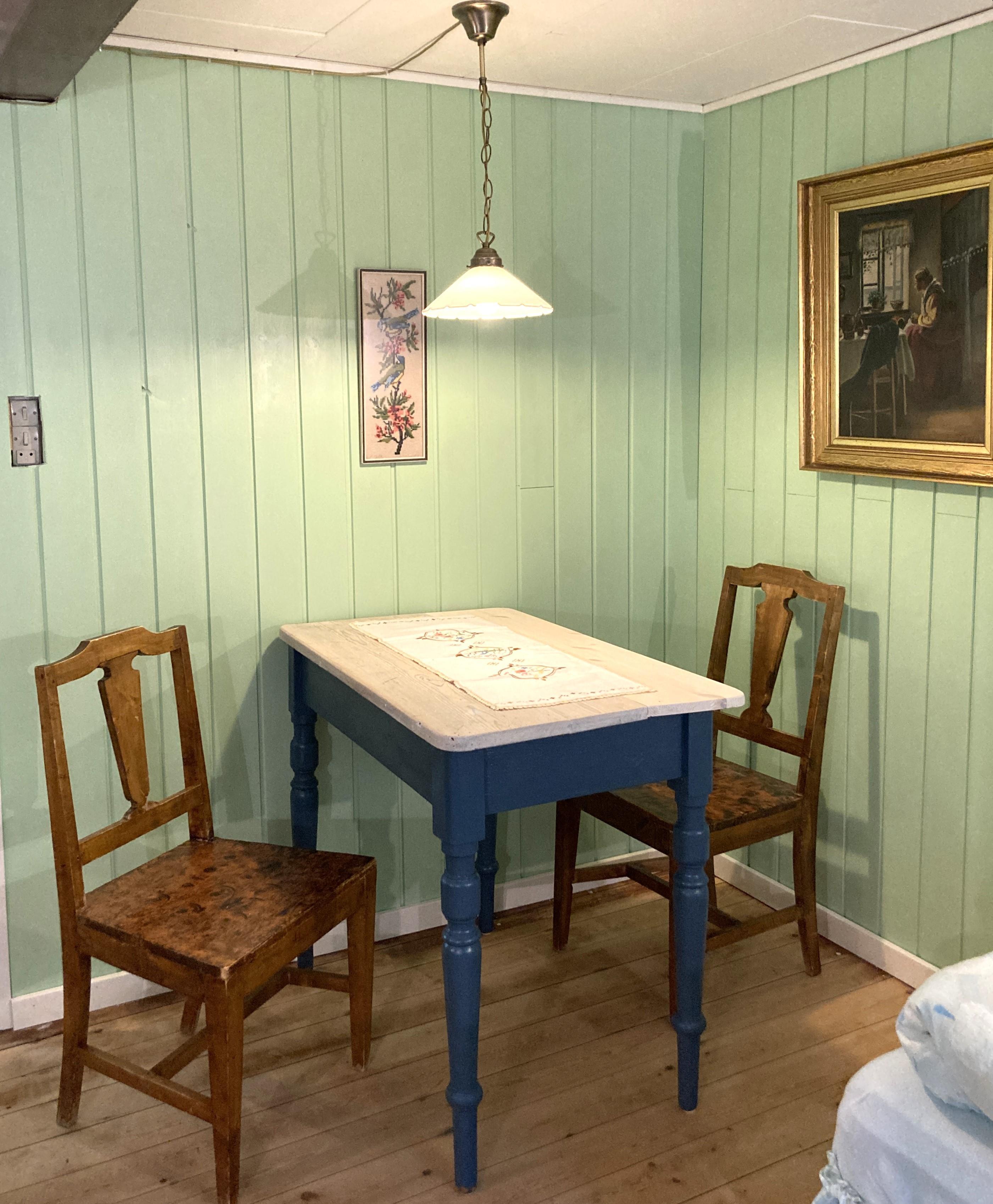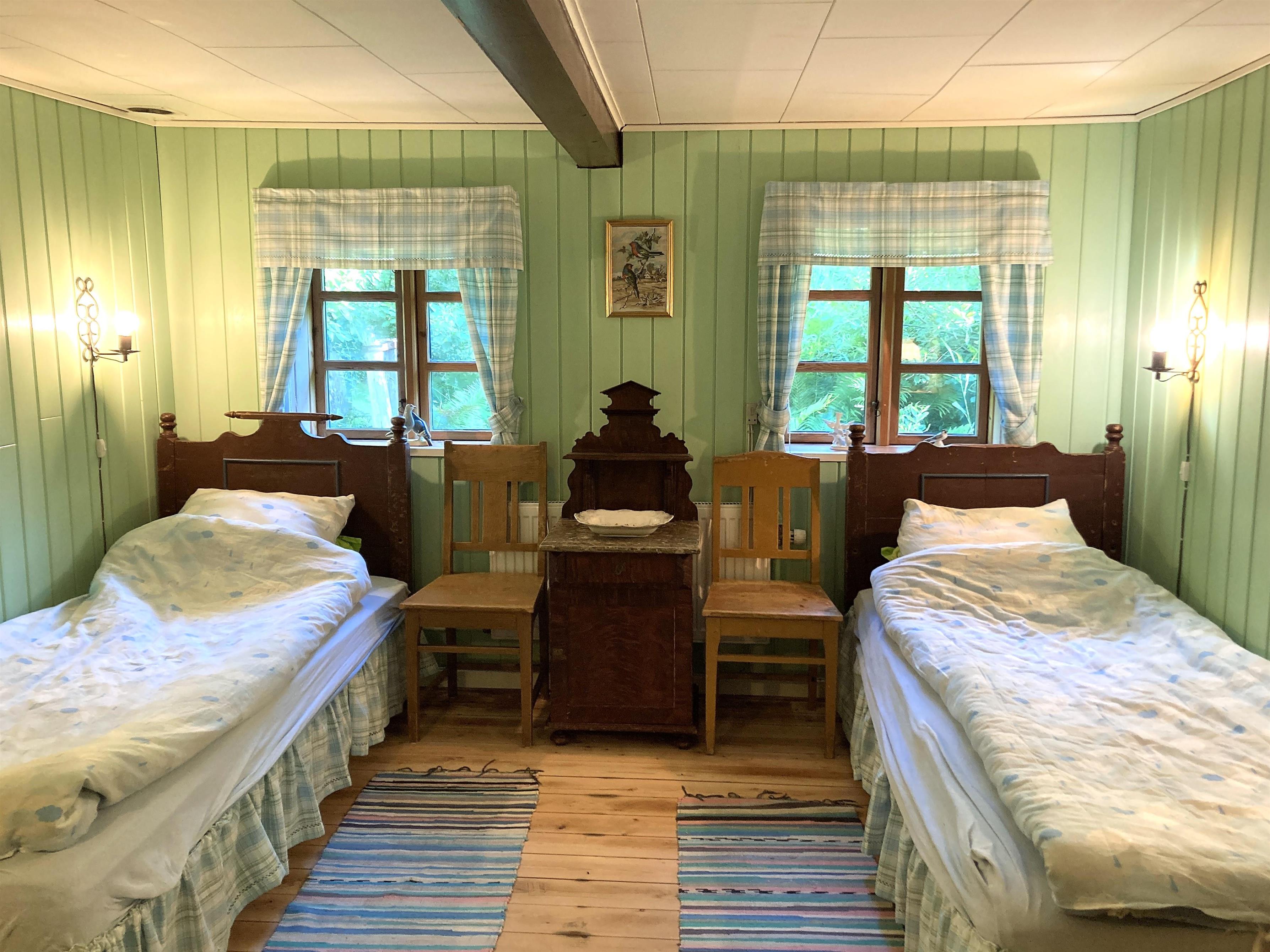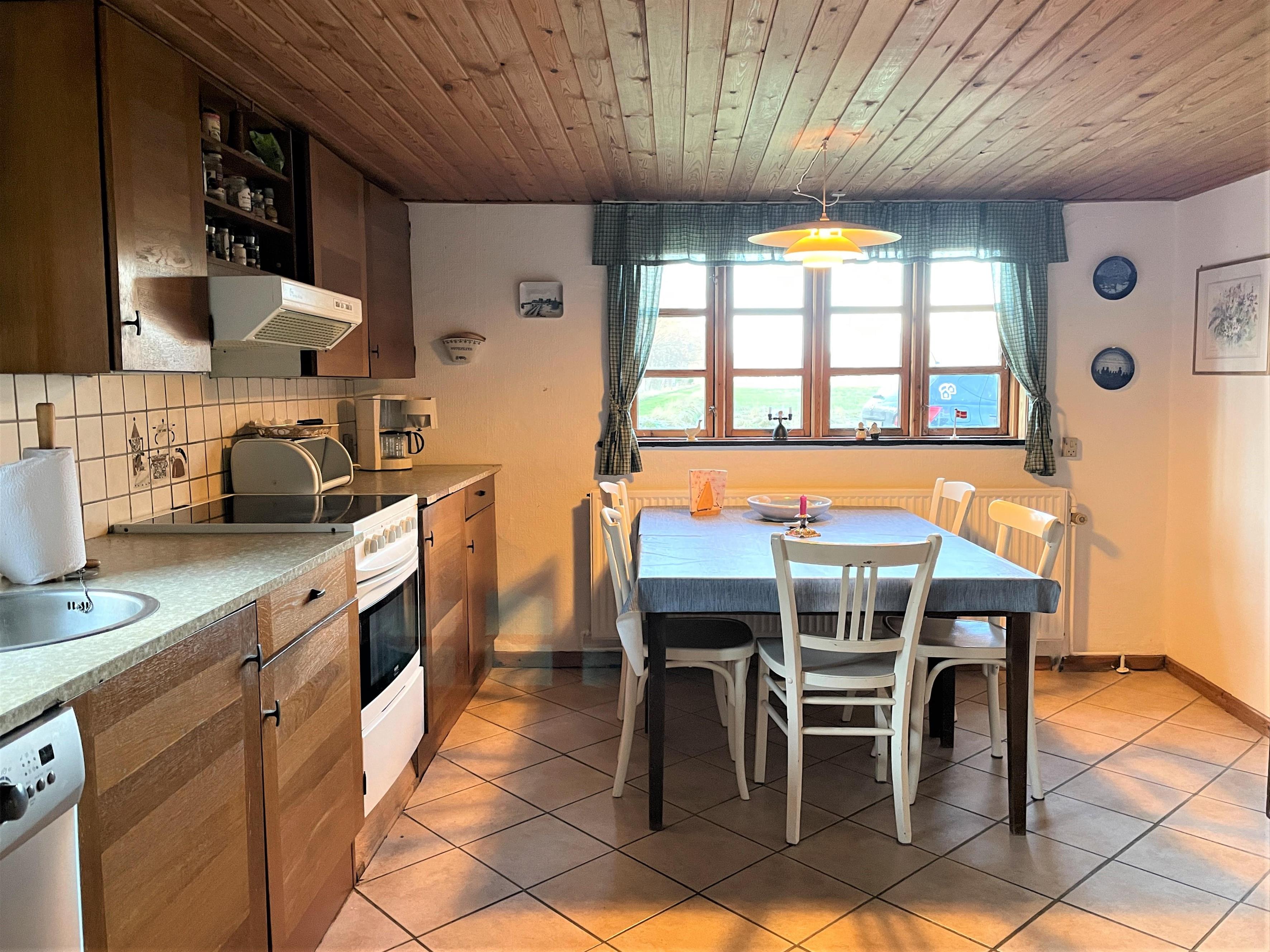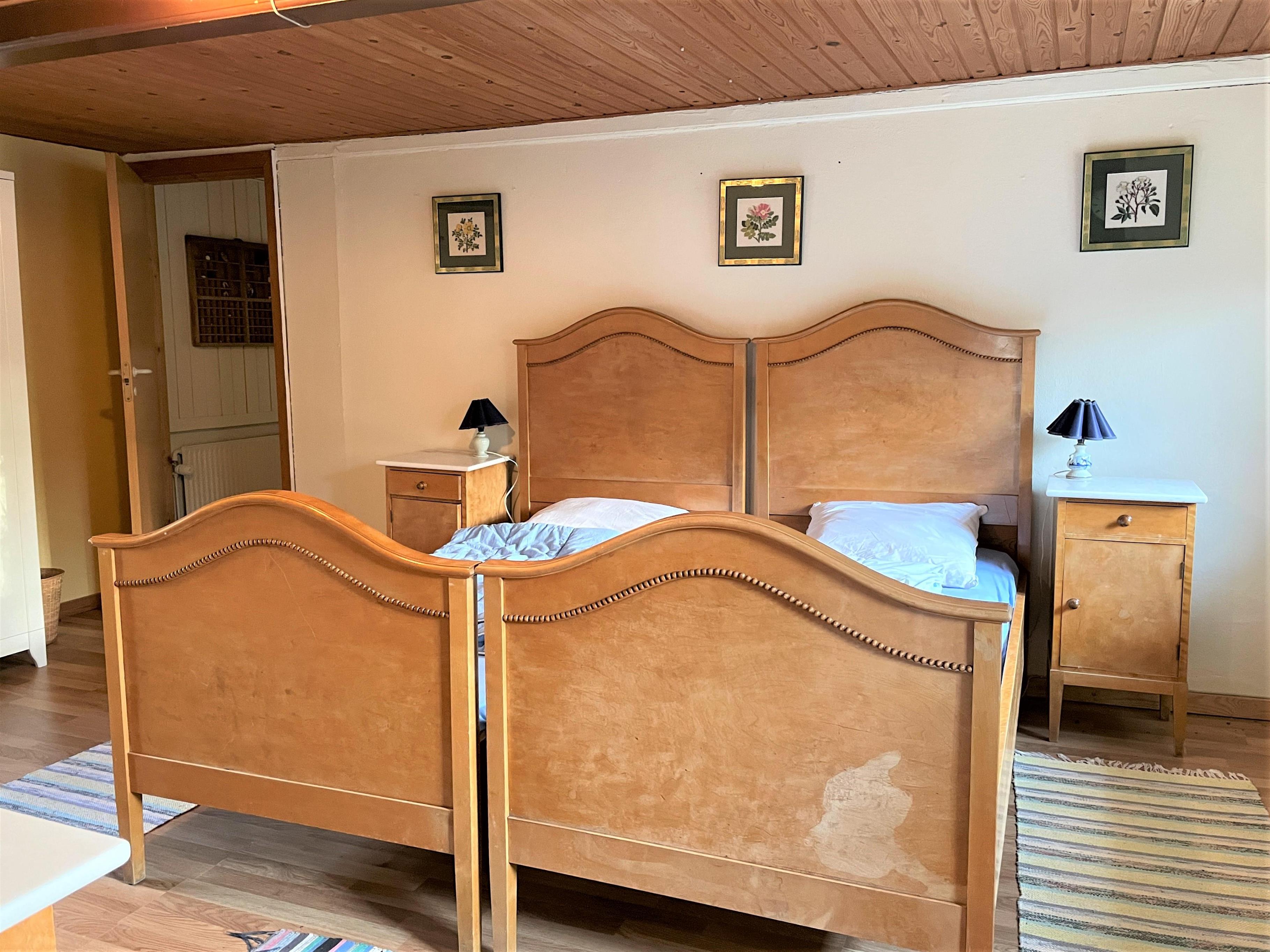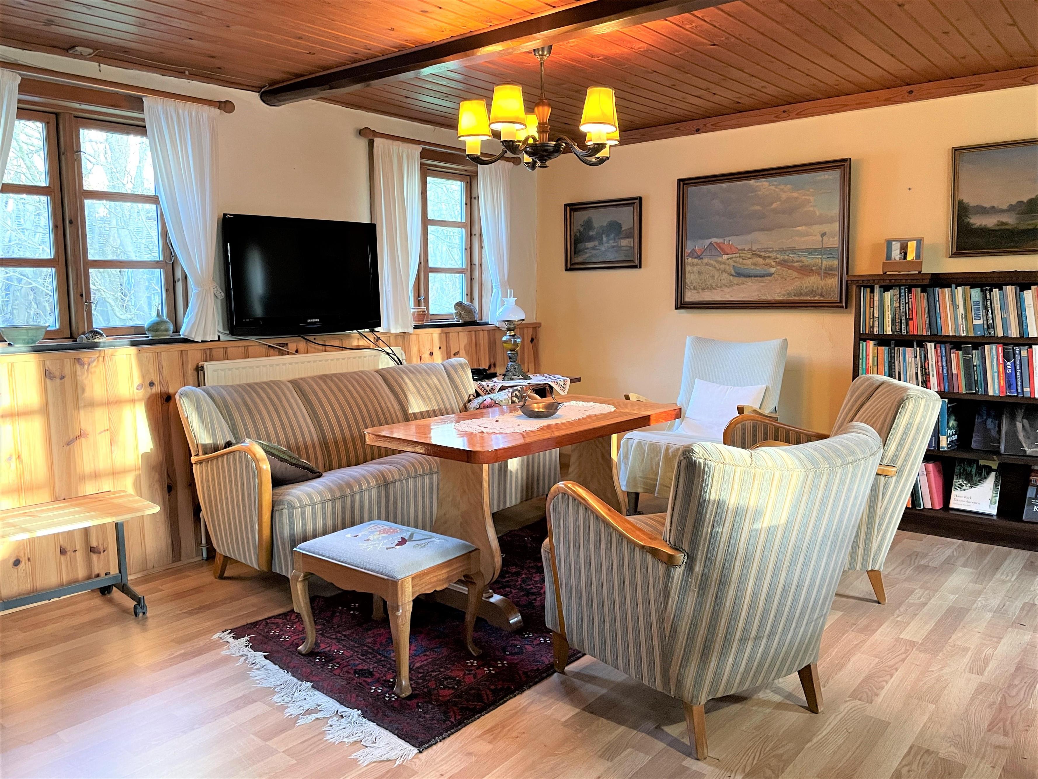 Hyggelig indretning med møblering, som virkelig passer til husets stil. Tre soveværelser; to med dobbeltseng, et med to enkeltsenge. To badeværelser med brus.