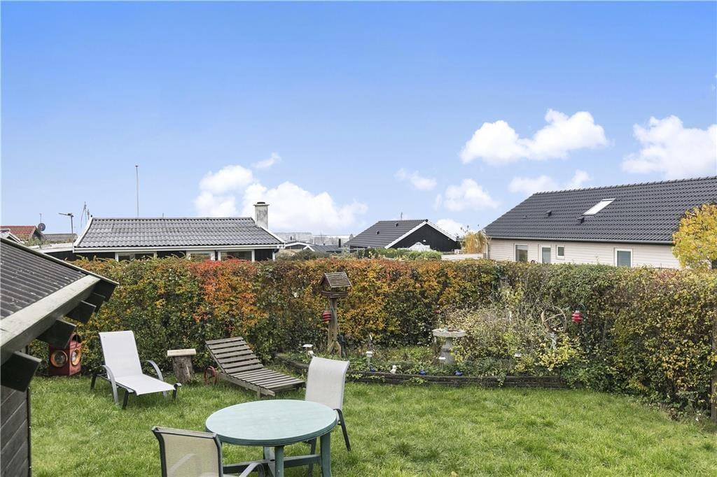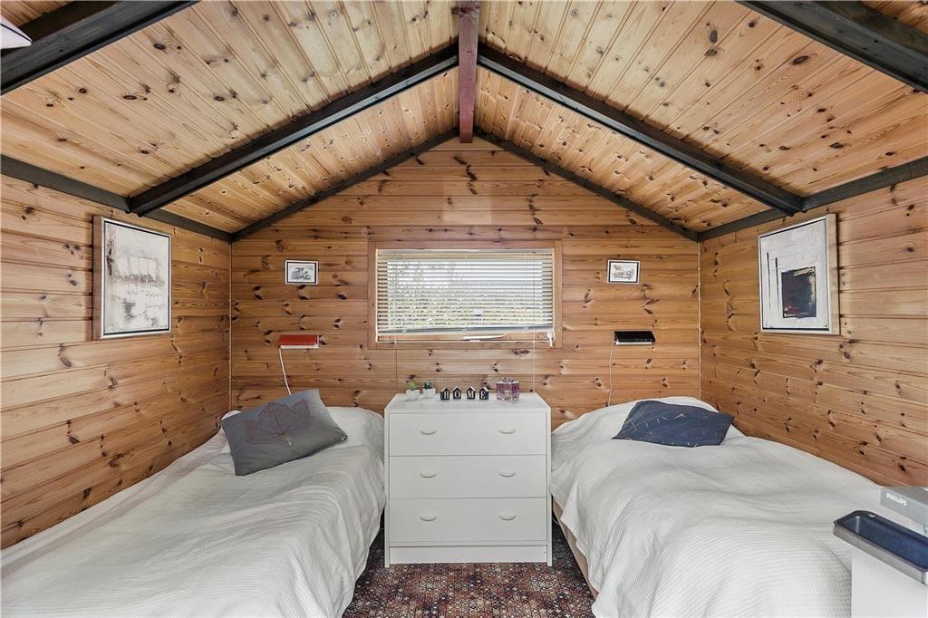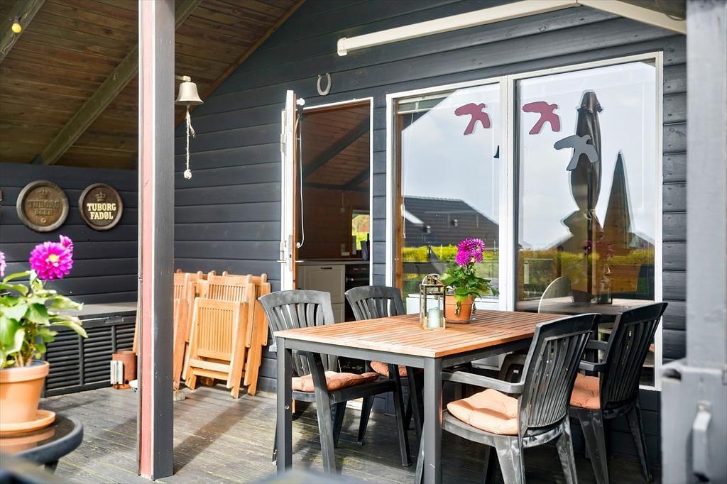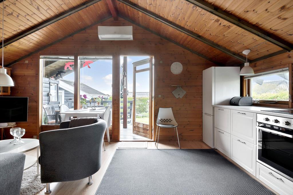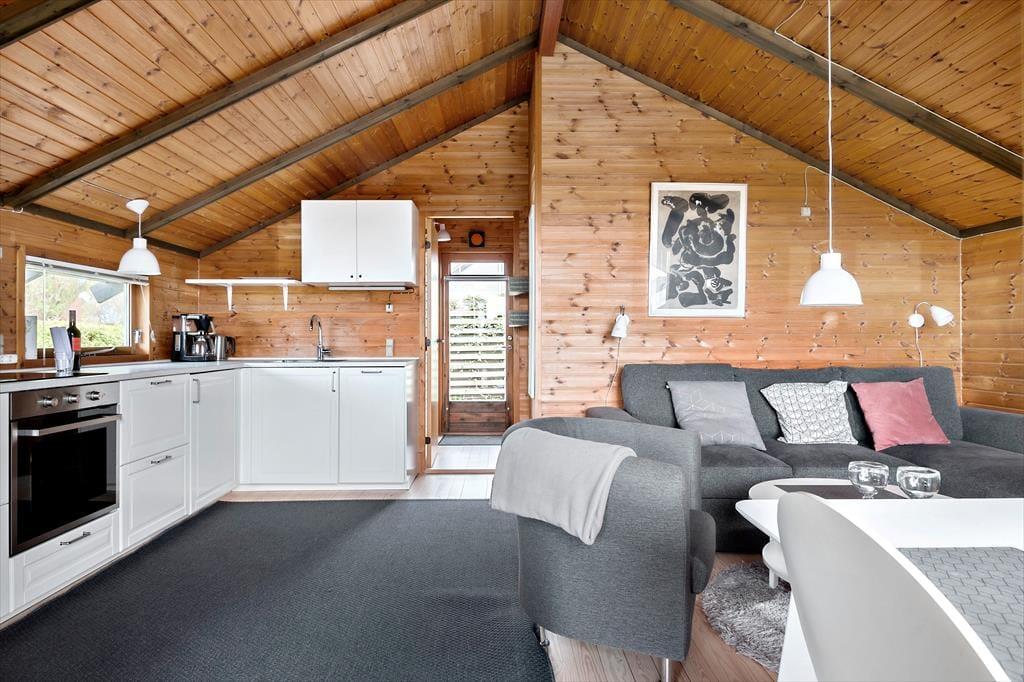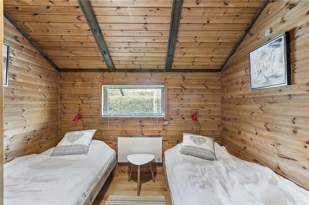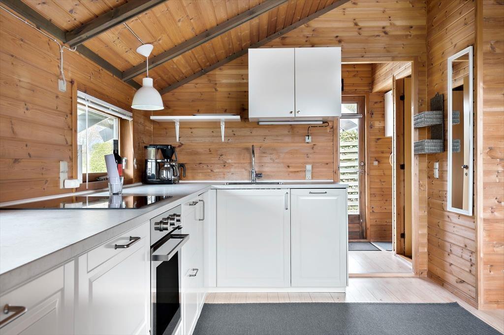 Træhus, beliggende på lukket stikvej og delvis udsigt til havet. Entré, komb. opholds-/spisetue med udgang til terrasse. Åbent køkken med køleskab inkl. frostboks, ovn, 2 kogeplader. 1 soverum med 2 enkeltsenge. Bad med bruseniche, håndvask, toilet. Endvidere anneks med 2 enkeltsenge. Annex kan kun anvendes maj-sept.