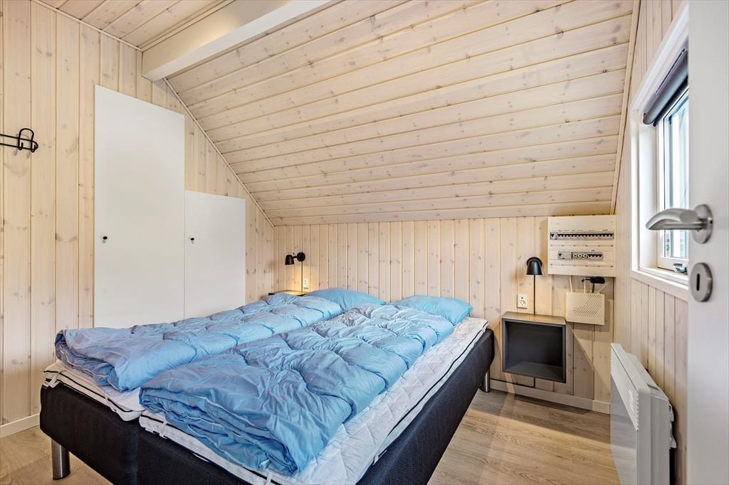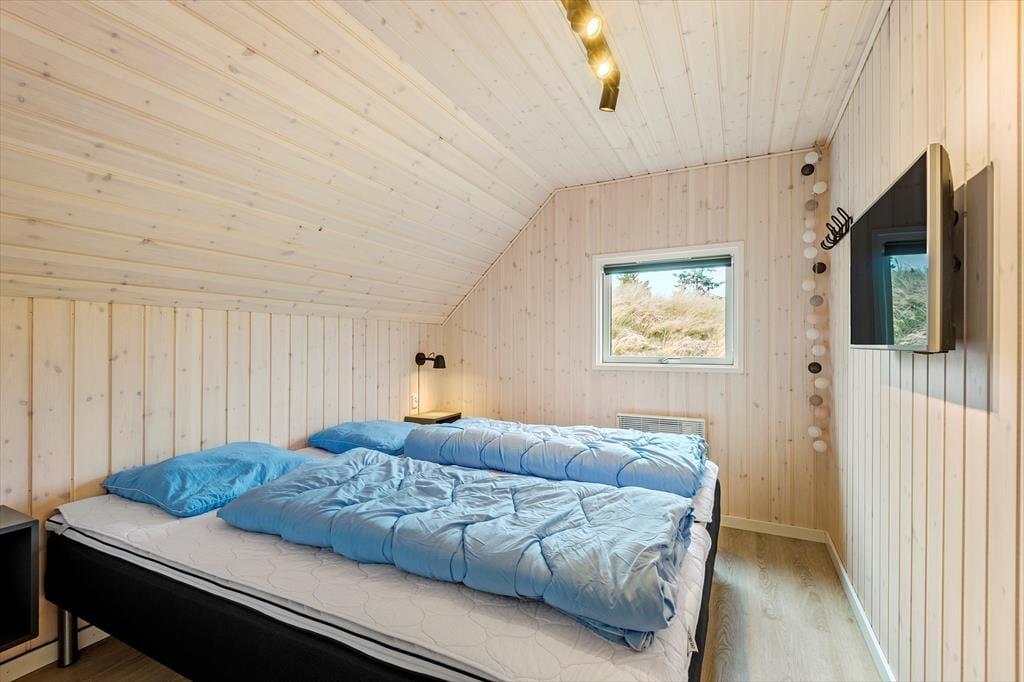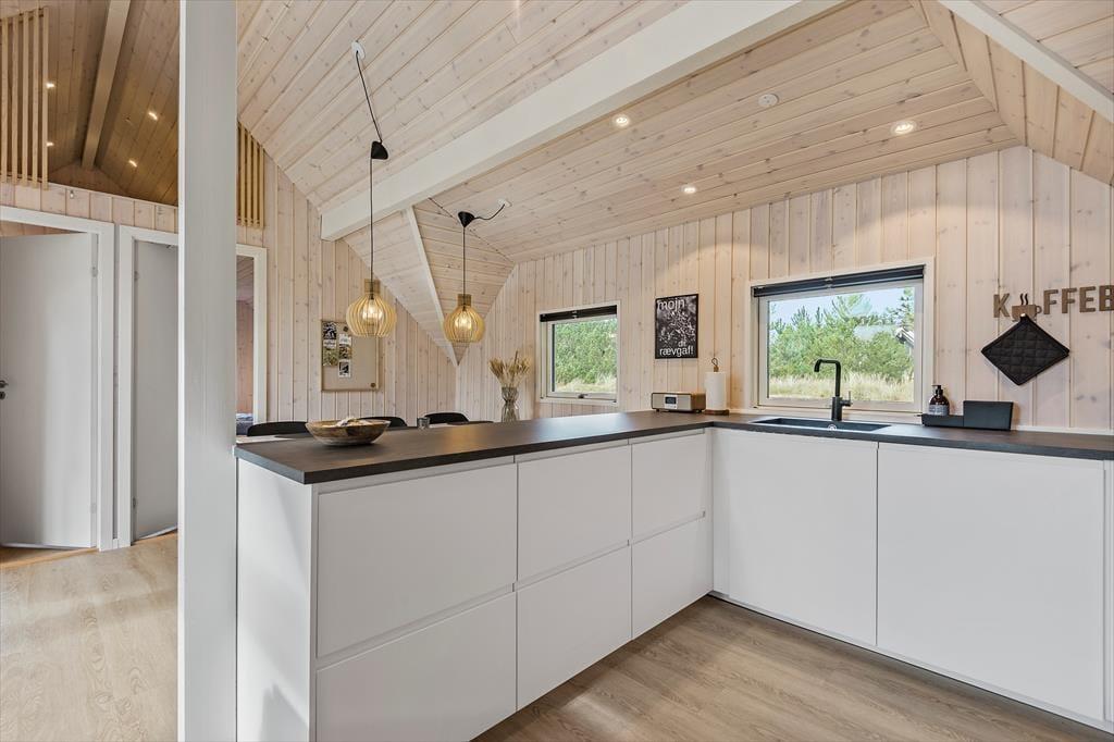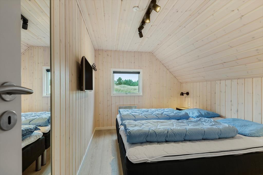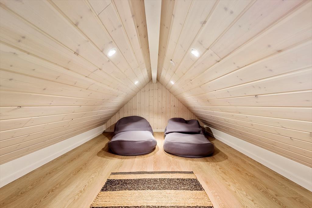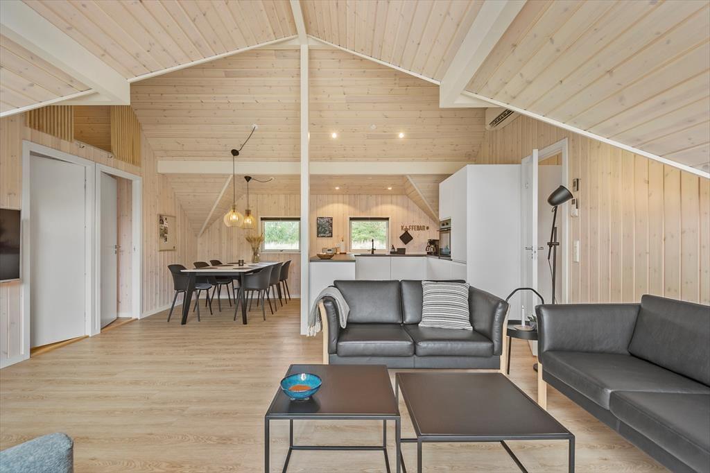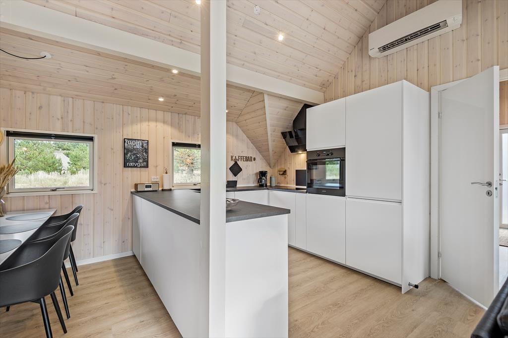 De lyse farvetoner, det stilrene møblement og loftet, der går helt til kip, er med til at skabe en let og indbydende atmosfære inden døre. Stuen og det moderne køkken ligger samlet midt i huset, og her er der brændeovn og varmepumpe såvel som et stort gavlvindue og direkte udgang til husets sydvestvendte terrasse. Rummets fladskærm med både kabel-tv og Apple TV sørger for underholdning, hvis du trænger til en pause i sofaen – og derudover er der også tv på to af de tre soveværelser, der alle er udstyret med gode dobbeltsenge. Planløsningen byder også på et lækkert badeværelse med bruseniche, og fra stuen kan du tage en stige op til hemsen, der fungerer som en glimrende hyggekrog.