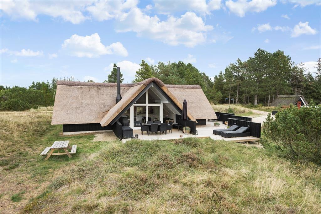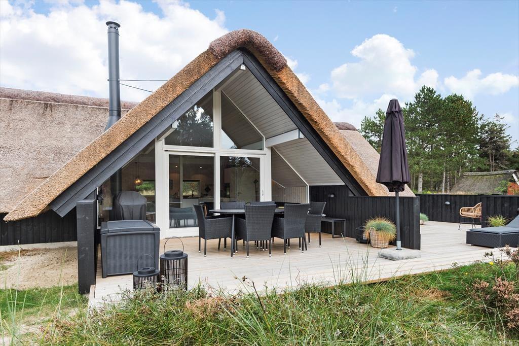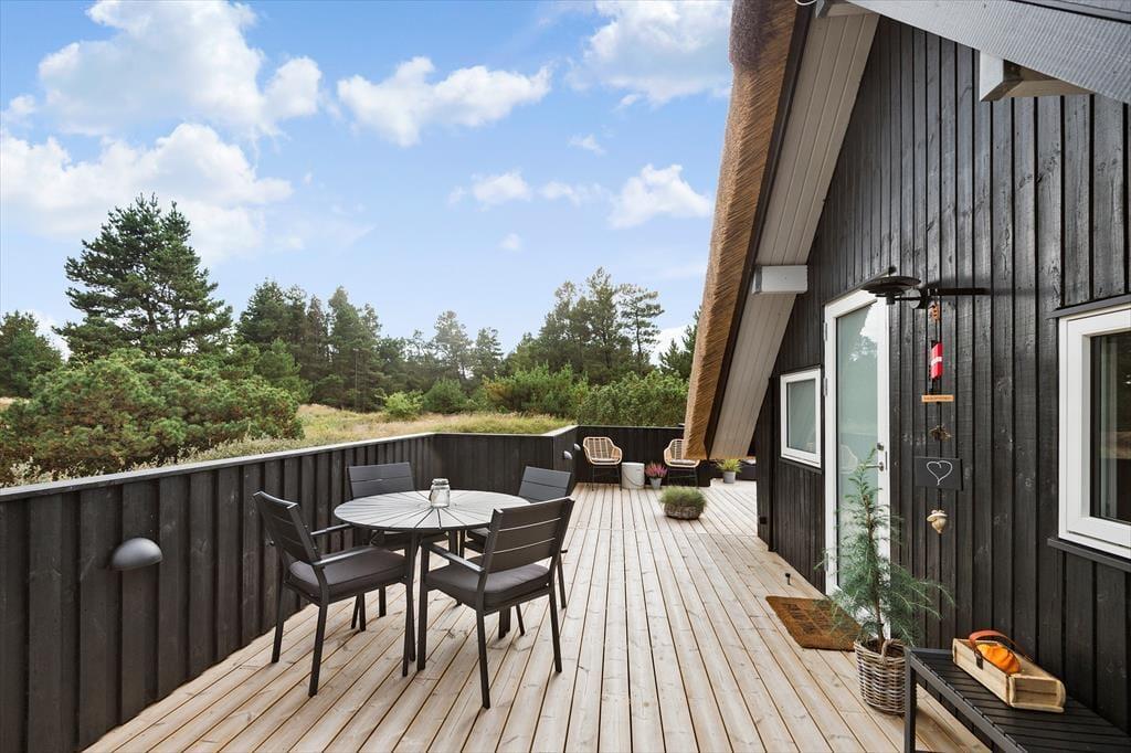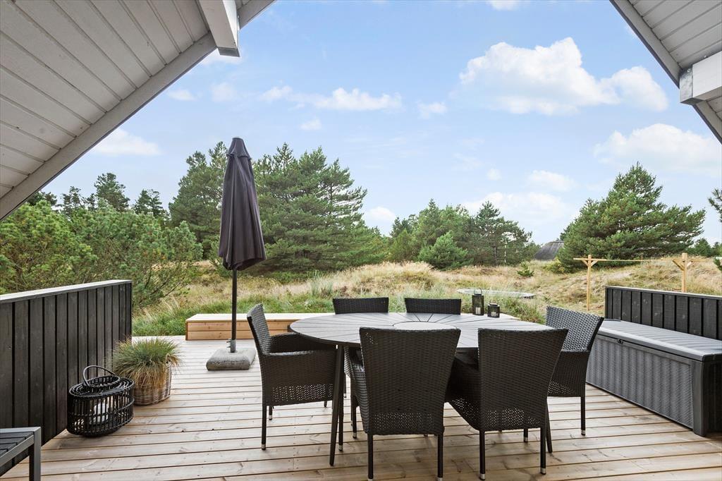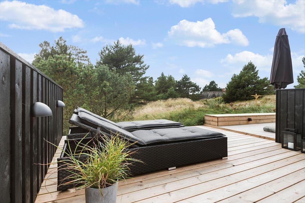 Også ude i det fri er der godt at være på den 2.500 m² store naturgrund. Her får lyng, krogede fyrretræer og anden vild beplantning lov til at vokse frit, så du får fornemmelsen af at være ude i naturen og langt væk fra hverdagen. Ferielivet kan foregå på det store terrassemiljø, der byder på afskærmede, overdækkede og helt åbne opholdspladser, og derfor er det nemt at finde en passende opholdsplads, uanset om du vil slikke sol eller tage en slapper i skyggen.
