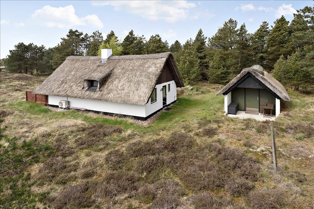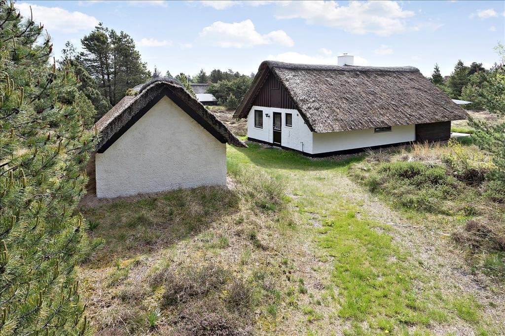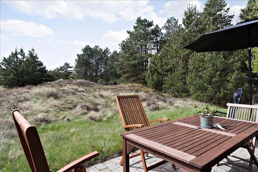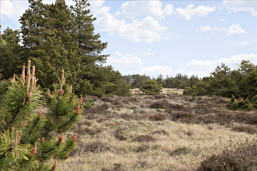 Stuens havedør giver jer direkte adgang til en dejlig sydvendt terrasse, hvor I kan slænge jer i havemøblerne og nyde solskin, fuglesang og feriefred. Ved udhuset har I også en mindre, delvist overdækket terrasse, der er østvendt og derfor et herligt sted at nyde dagens første solstråler. Den lyngklædte naturgrund måler 2.500 m², så der er god afstand til naboerne og plads til store armbevægelser.