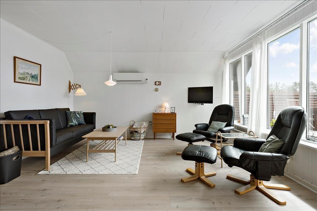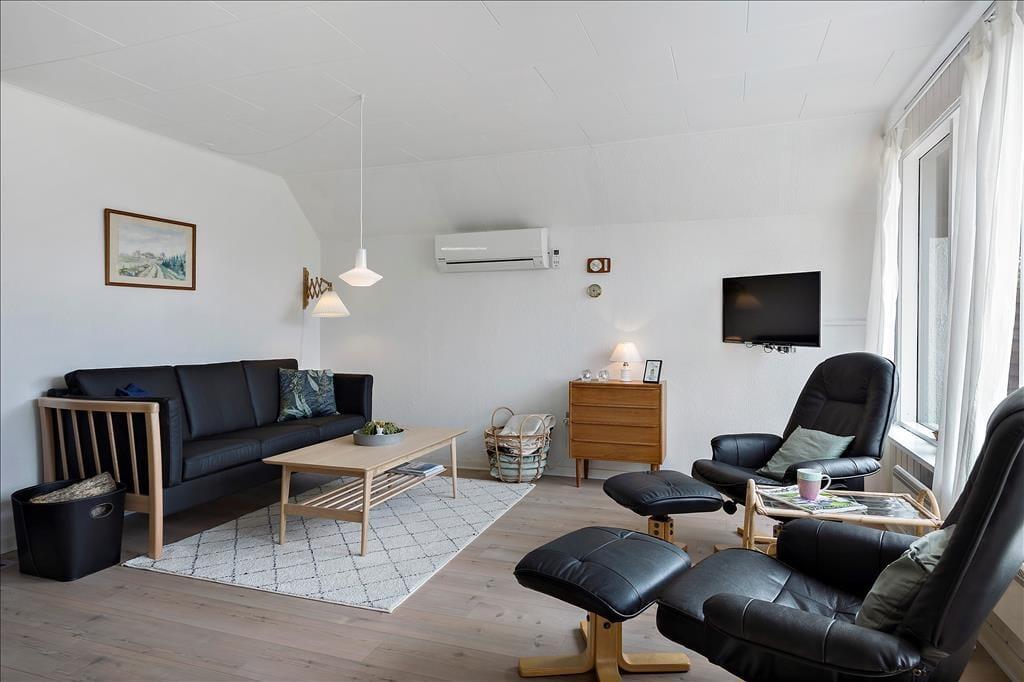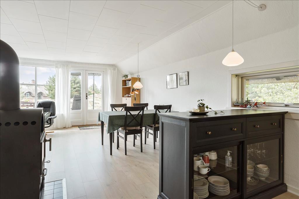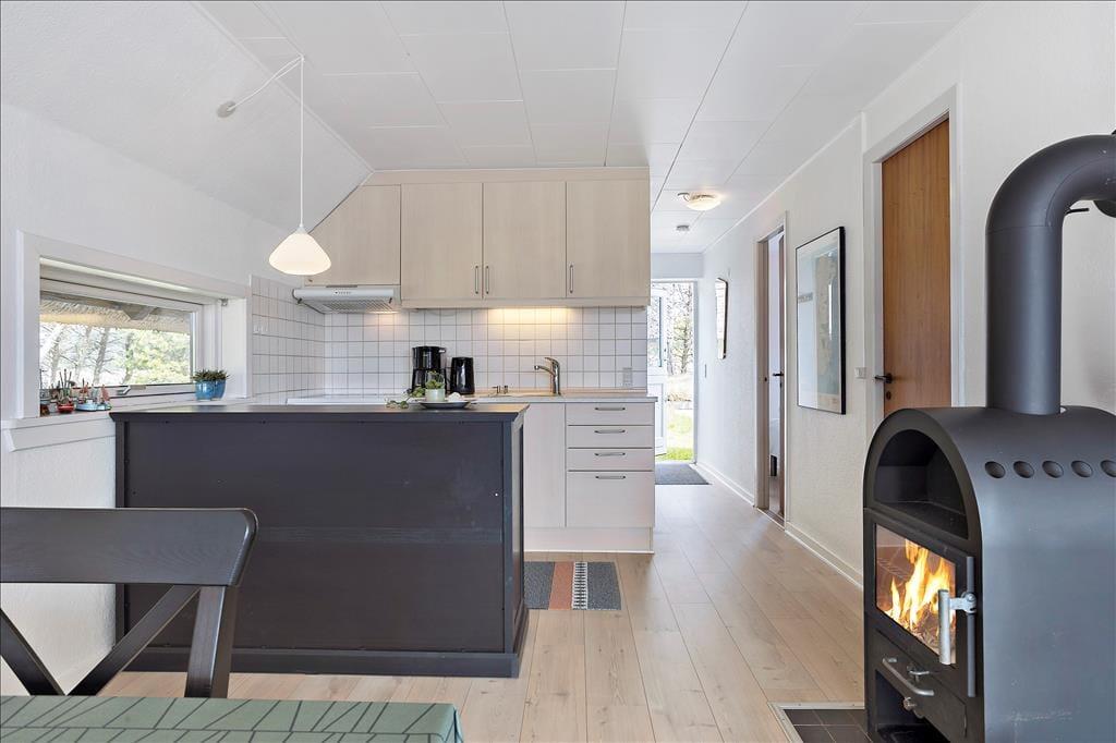 Med sit stråtag, mørke gavle og hvide facader passer sommerhuset smukt ind i de grønne omgivelser. Arkitekturen er klassisk, men samtidig pænt og velholdt – og også inden døre, hvor den seneste renovering fandt sted i 2011. I forbindelse med moderniseringen blev der også installeret en varmepumpe, der sørger for frisk luft og en lav varmeregning. Flest kvadratmeter er dedikeret til opholdsrummet, som består af stue og køkken i åben forbindelse. Et stort sydvendt vinduesparti inviterer den flotte udsigt og sollyset indenfor, og midt i rummet står en brændeovn, som er perfekt til kølige aftener, når I hygger jer med en lækker middag ved spisebordet eller en god film på fladskærmen. Planløsningen rummer også et badeværelse, som er udstyret med bruseniche og vaskemaskine.