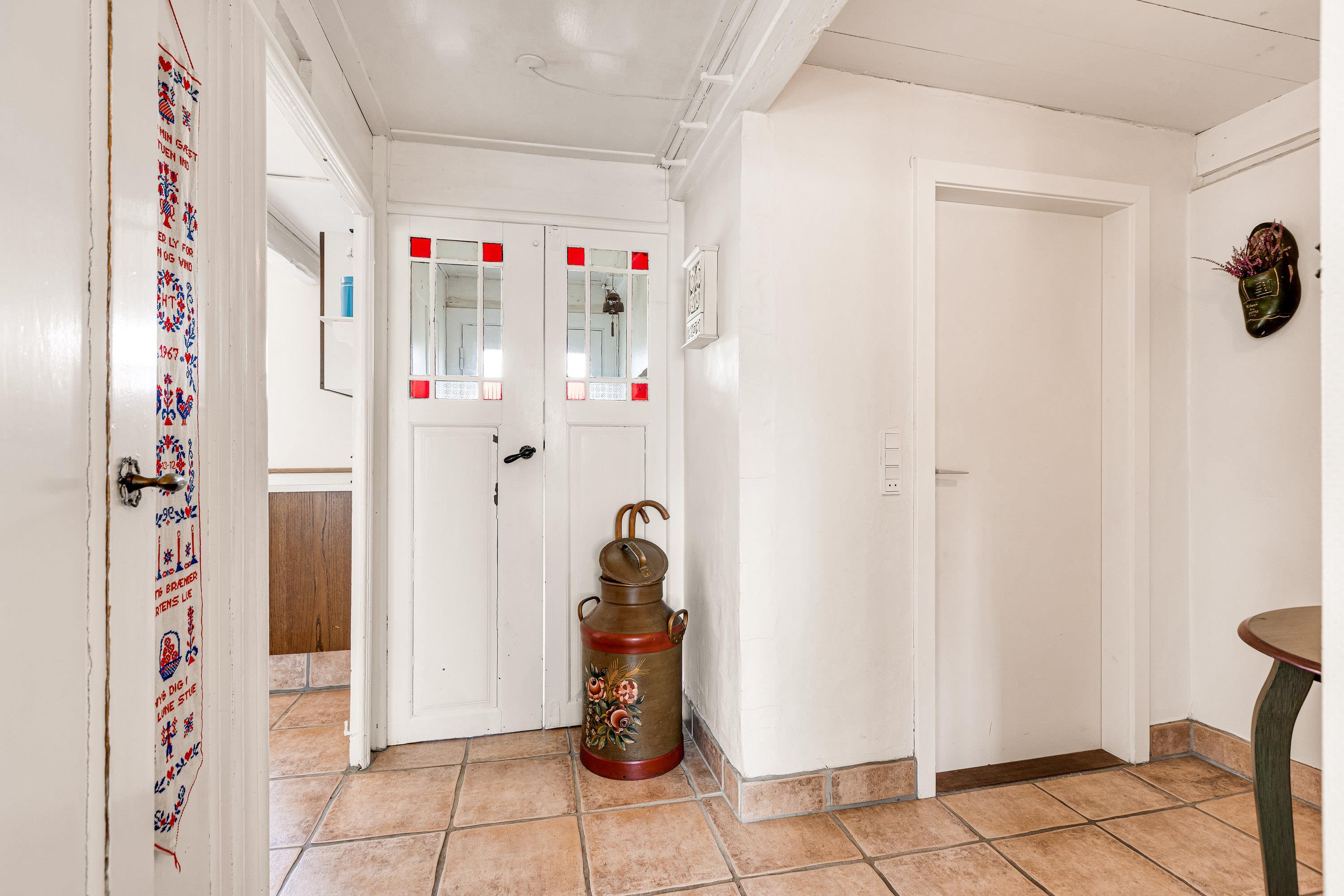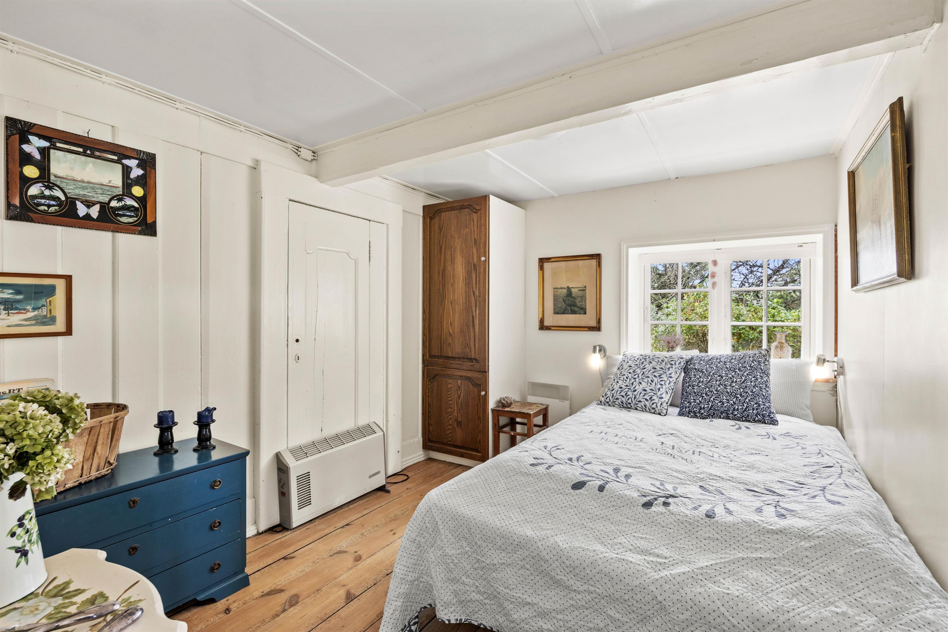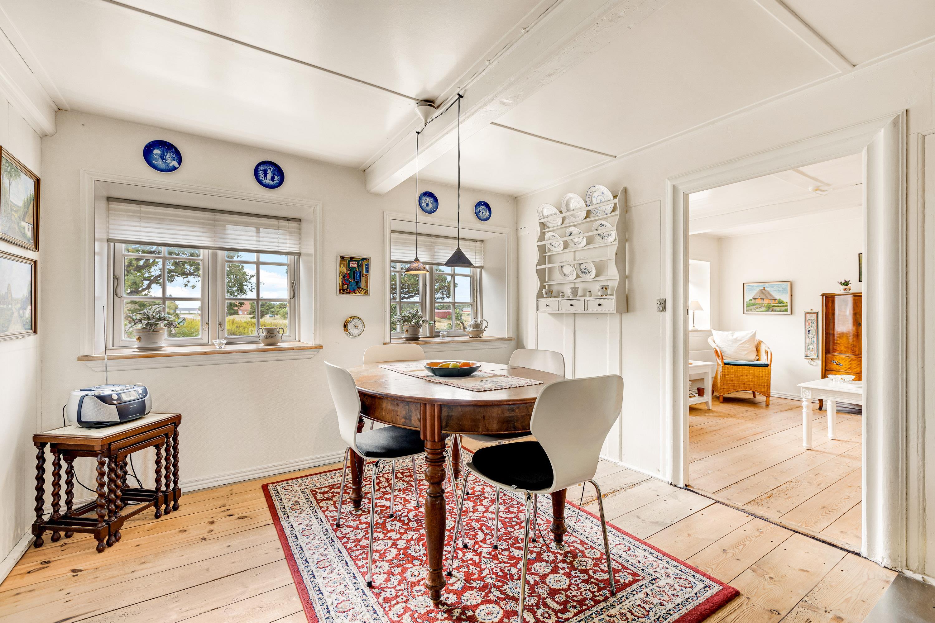 Indvendigt finder du lyse rum som er hyggelige og velindrettede med charmerende møbler, der bevarer husets alder og karakter. Samtidig er der i de 2 soverum med dobbeltseng samt stuen og spisestuen et stort trægulv, som bevarer husets charme. Husets varierende lave loftshøjde gør også, at dets karakter er bevaret. Derudover emmer møbleringen af ægte sommerhushygge, hvorved familien kan samles i sofaen og se en film på husets fjernsyn, imens brændeovnen står tændt og luner i spisestuen ved siden af.