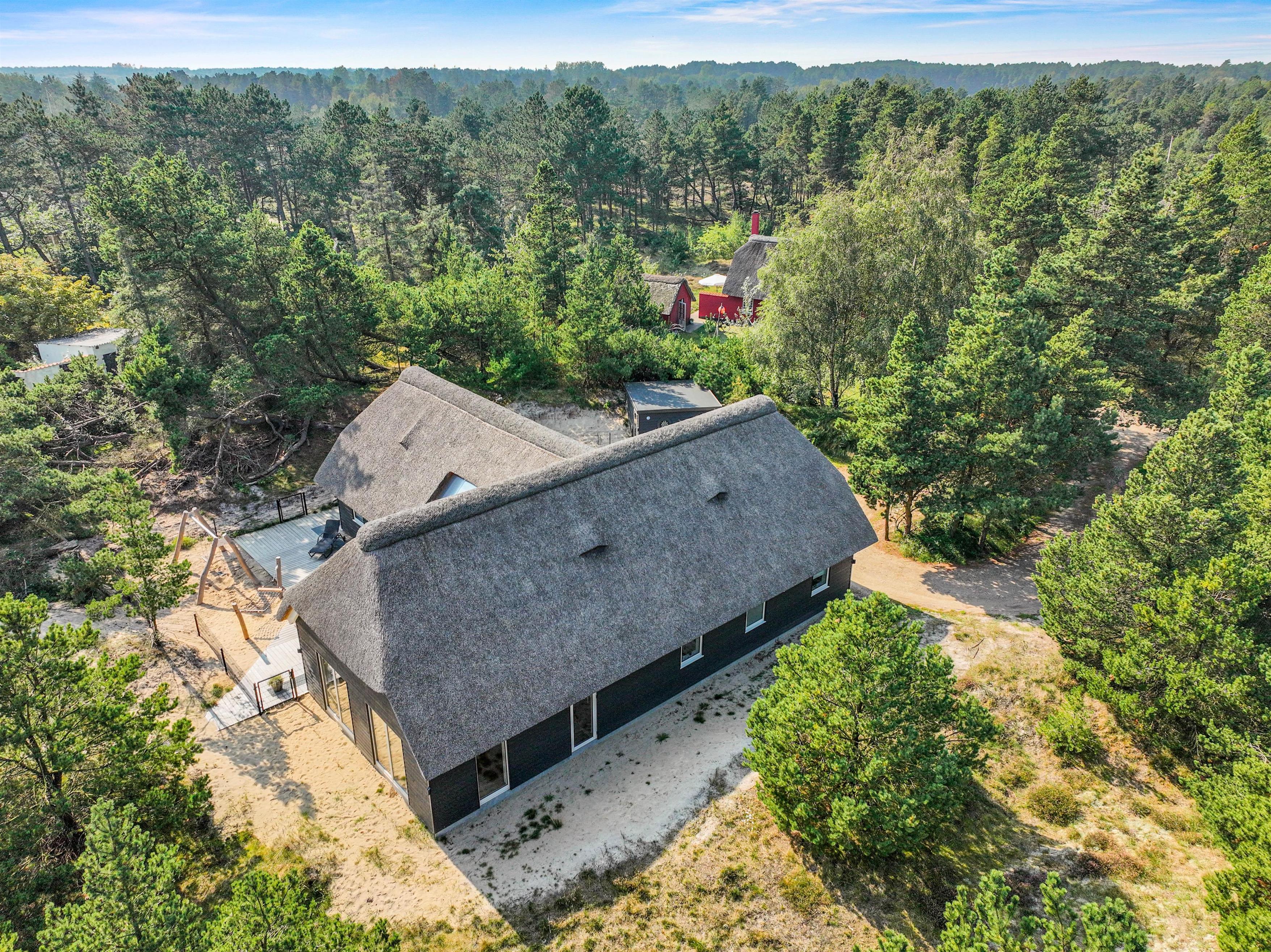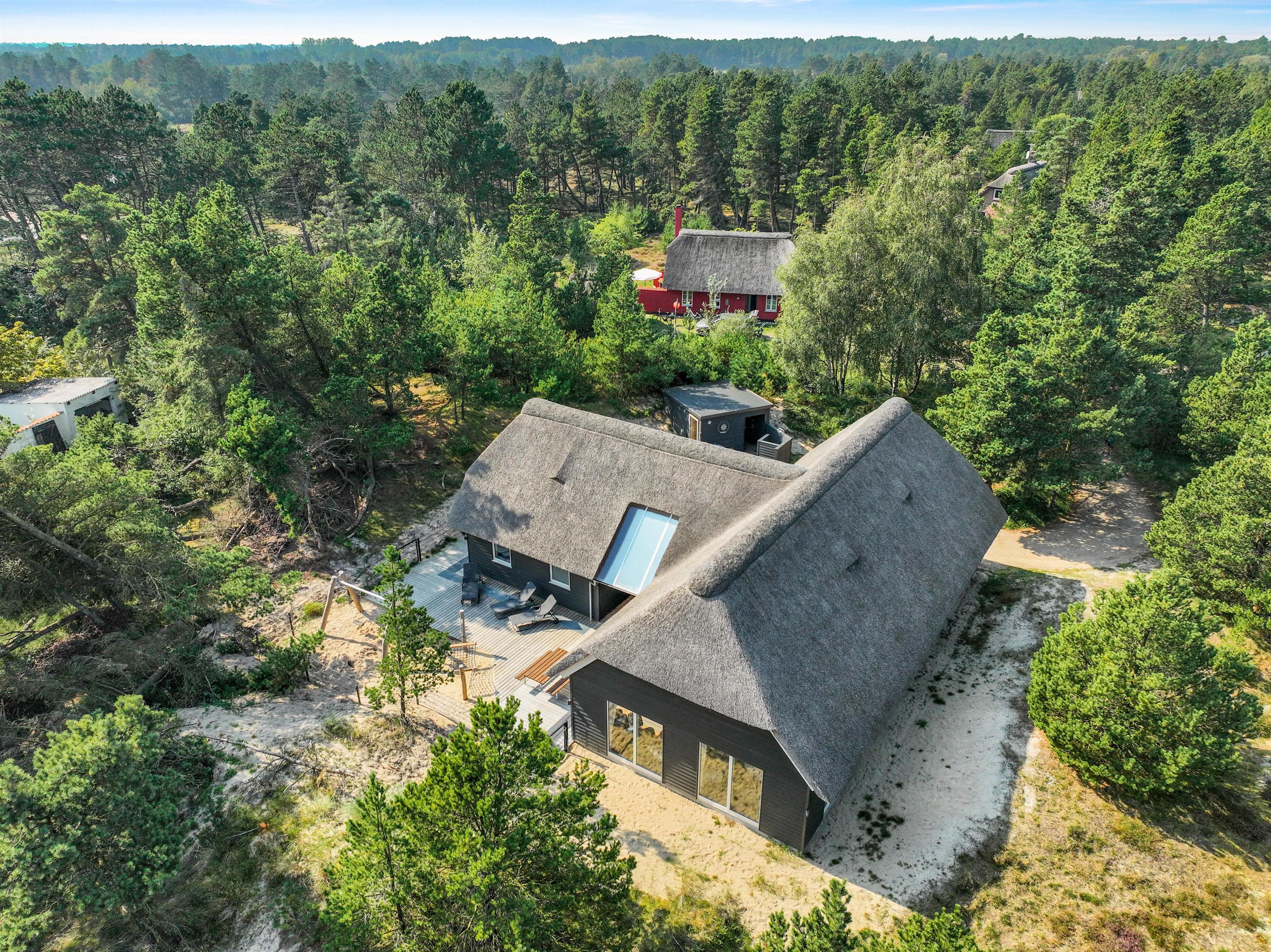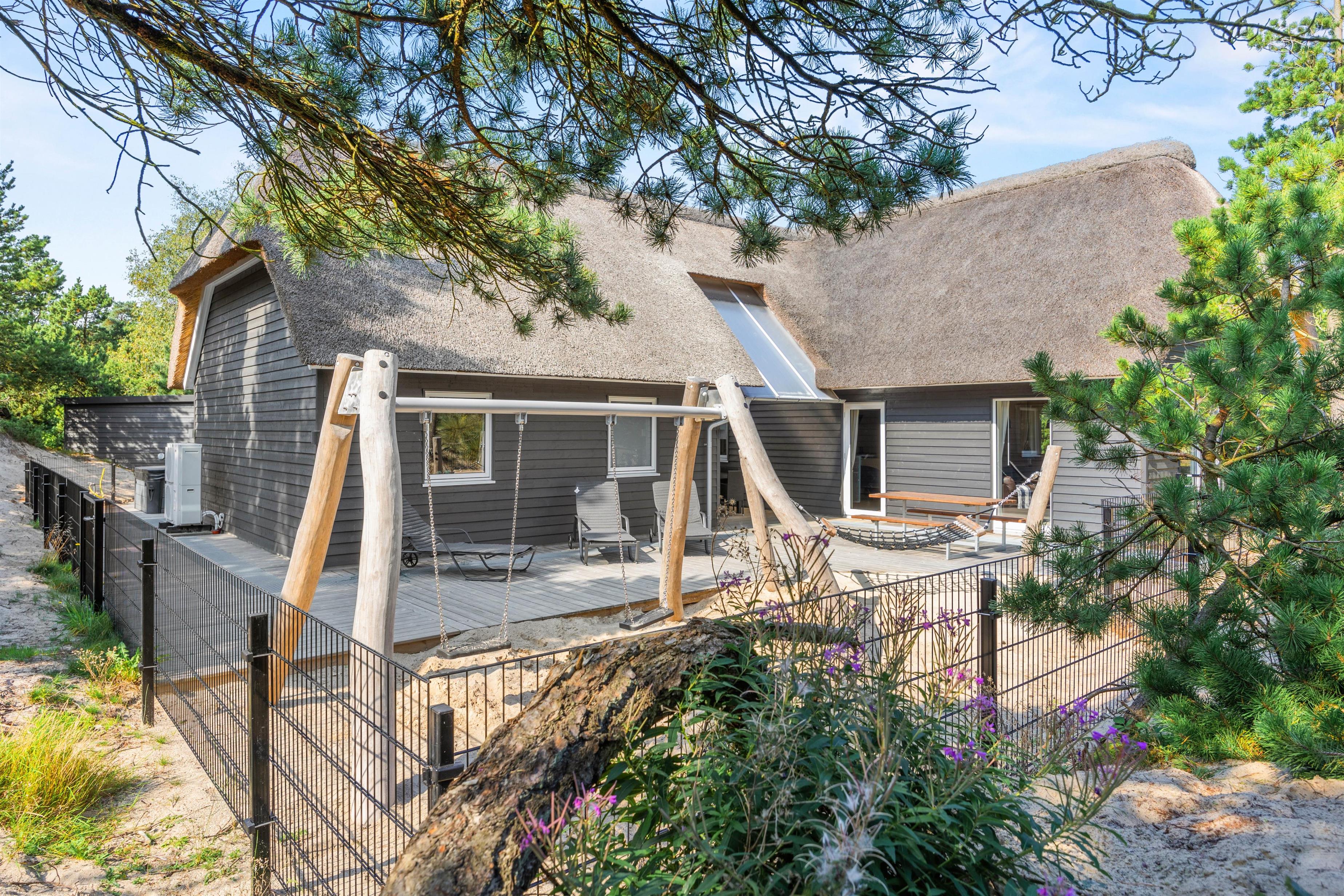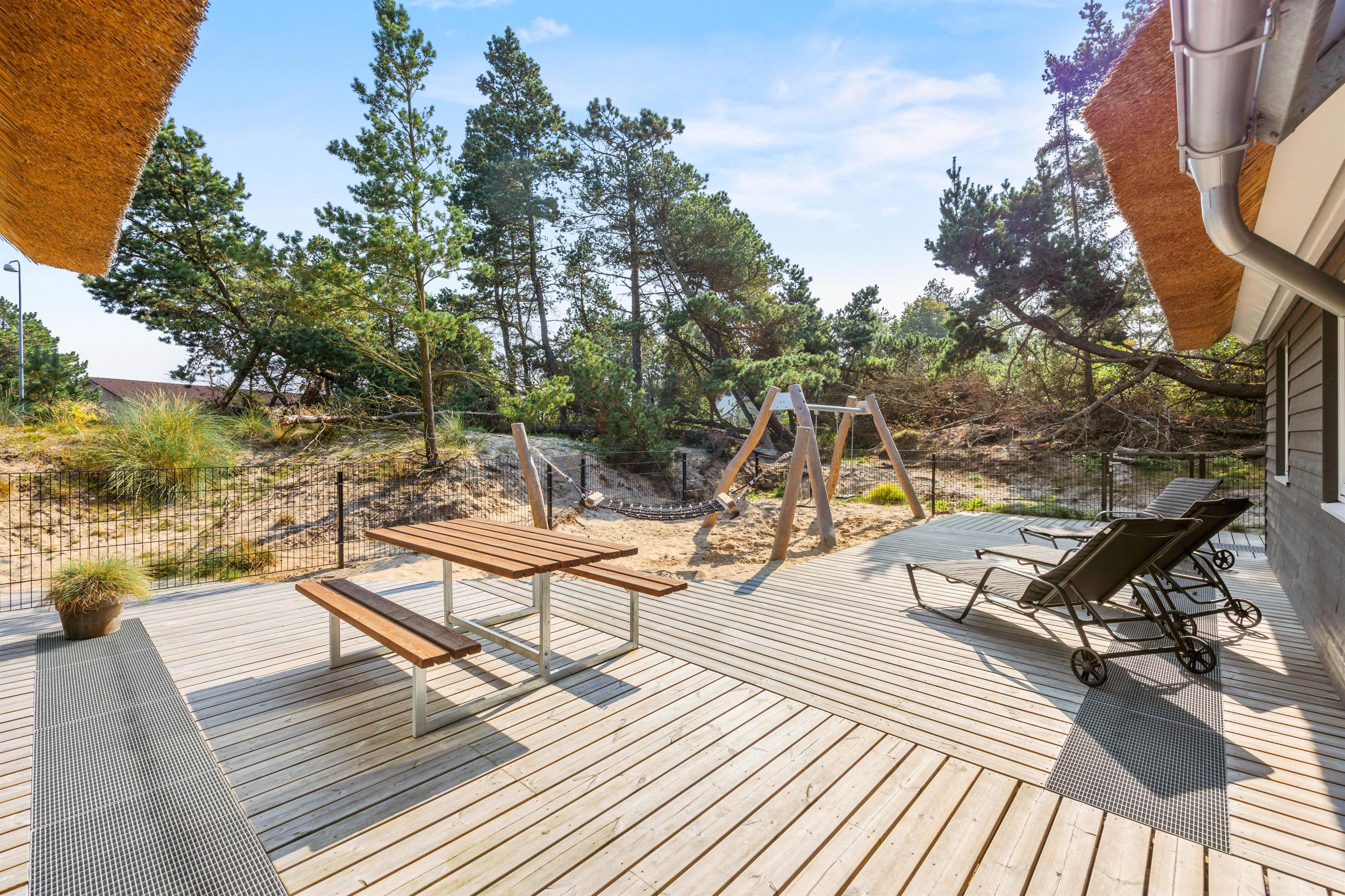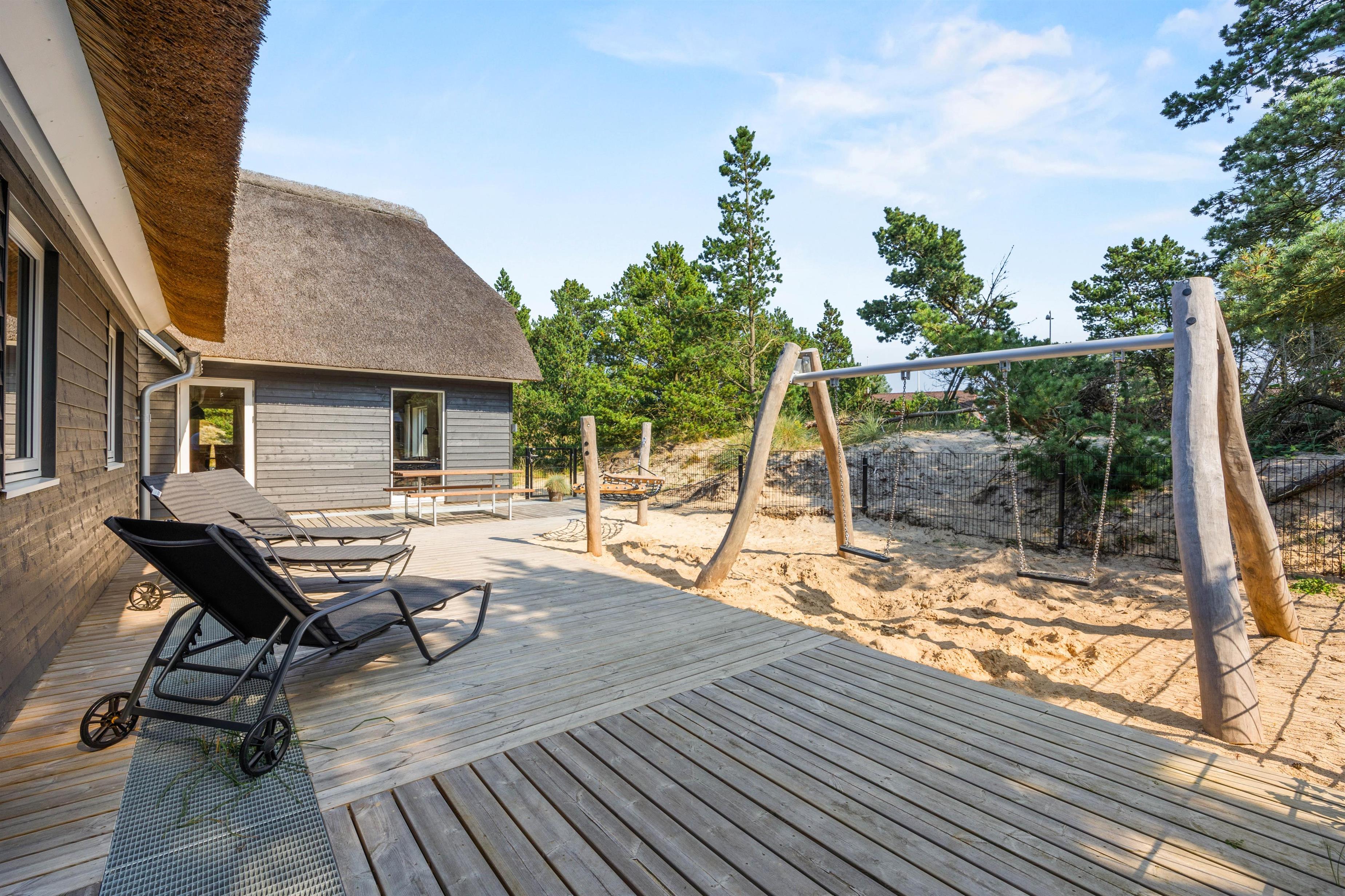 Der er luft og god plads på den smukke og rummelige naturgrund. De forskellige terrasseområder er udstyret med liggestole og havemøbler af høj kvalitet, og her kan du slappe af i den friske vesterhavsluft. Nyd en kop friskbrygget kaffe, imens dine børn brænder energi af i legetårnet med gynger og rutsjebaner.