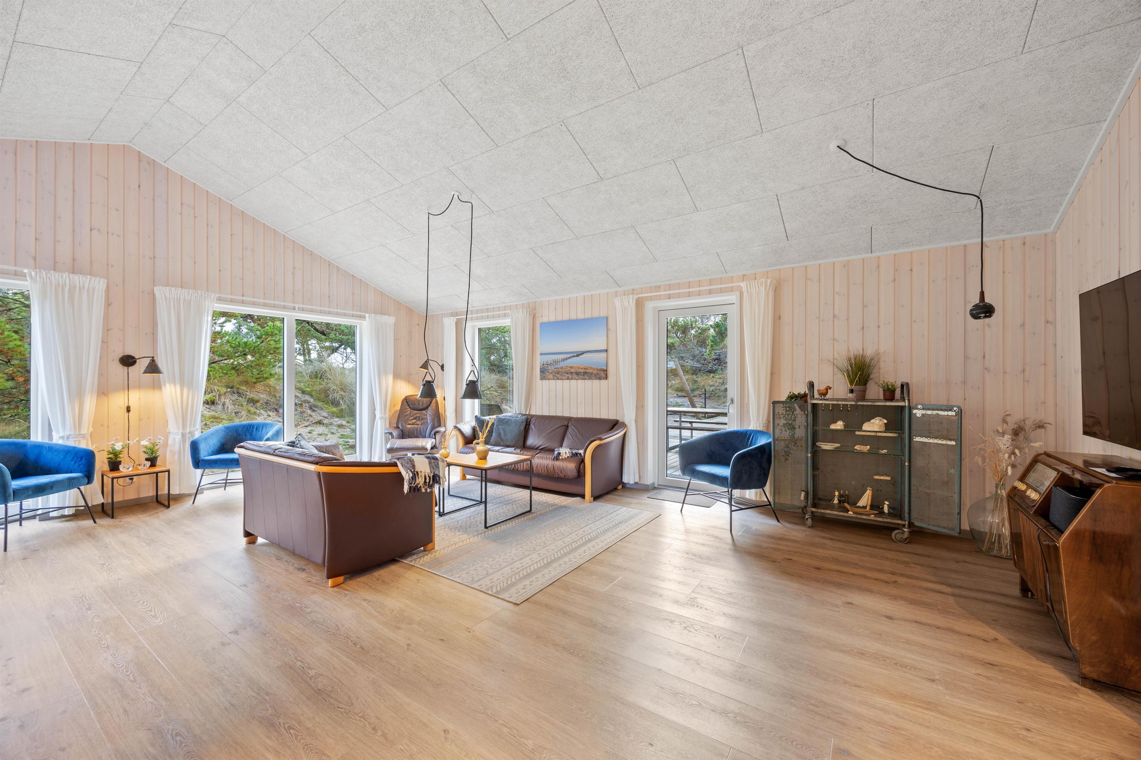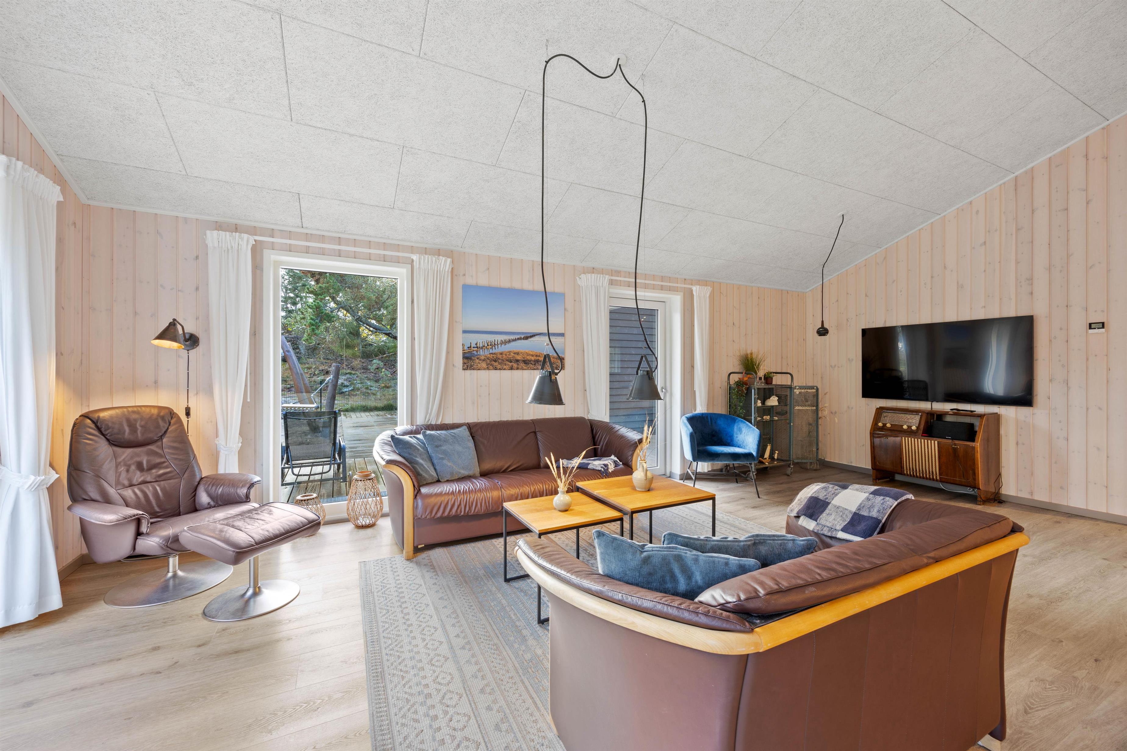 I den lyse, rummelige opholdsstue med rustikt trægulv finder du et hyggeligt sofahjørne med fladskærms-TV og et lækkert multifunktionelt spillebord. Her kan du tilbringe spilleaftener med bordfodbold, billard eller et brætspil. Det store plankebord er en perfekt spiseplads til alle, eller hvis I arrangerer en spilaften. Nogle ønsker måske i stedet at hygge med en god bog i sofagruppen – i dette sommerhus kan alle ønsker opfyldes.