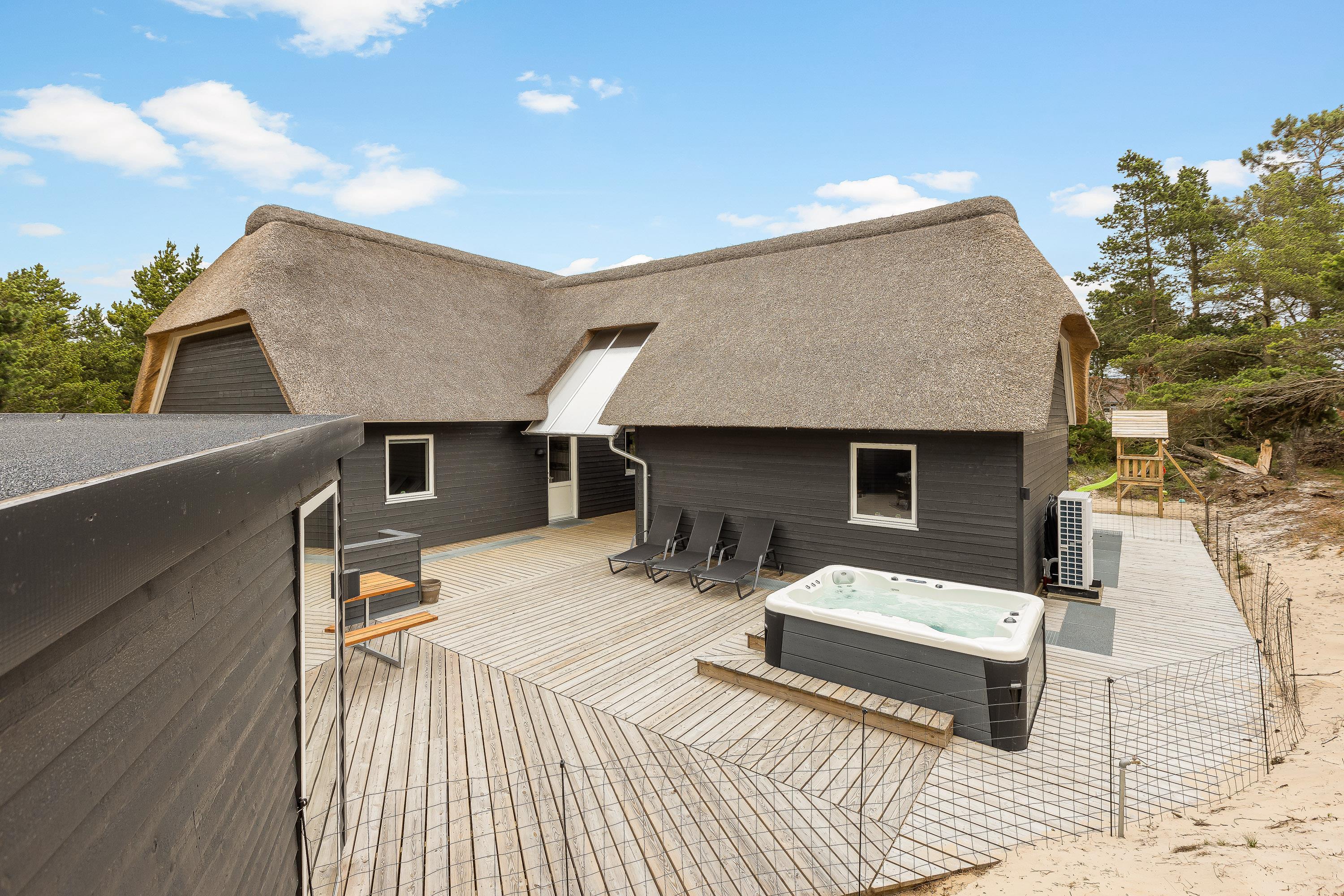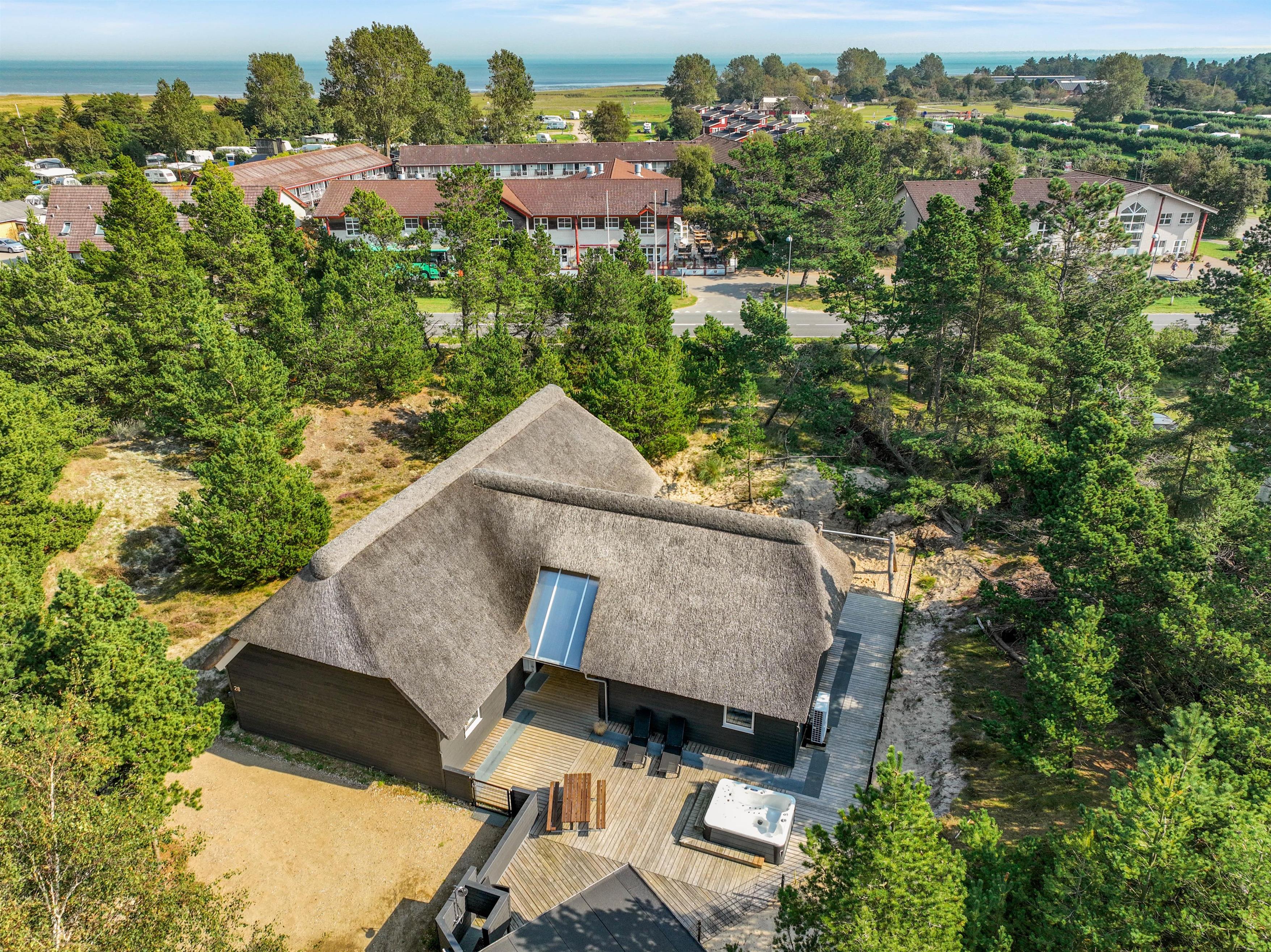 Leder du efter et hyggeligt stråtækt sommerhus med høj kvalitet i forhold til udendørs spa, sauna og indretning? Så er A Hveyselsvej 28 på Rømø et rigtig godt bud. Dette stilfulde sommerhus fra 2021 har god plads til op til 10 personer, og er også ideelt til 2 familier takket være opdelingen i et hovedhus og et anneks. Din hund er også velkommen, og sammen kan I nyde lange gåture ved stranden.