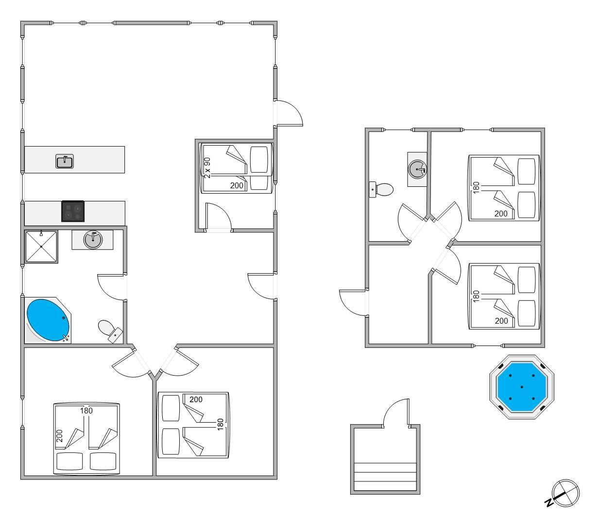 Opholds- og soveafdelingerne samt badeværelserne er udstyret med gulvvarme, og du kan også bruge den energibesparende varmepumpe til opvarmning. Opdelingen i hovedhus og anneks er særlig praktisk for 2 familier. I hovedhuset finder du et badeværelse med spabad og bruser, 2 soveværelser med dobbeltsenge og et soveværelse med køjesenge.