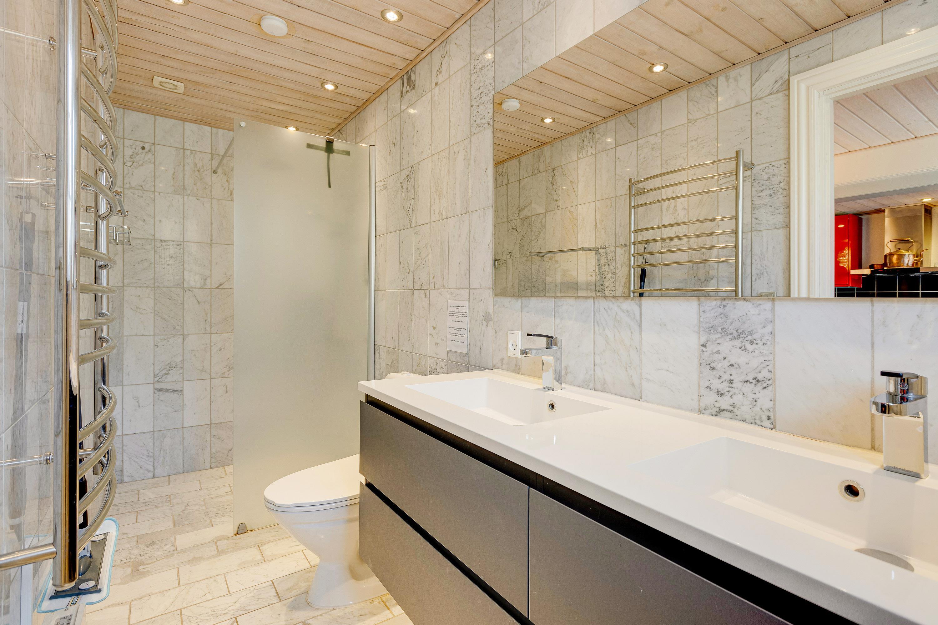 Ferielejlighedens badeværelse ligger i stueetagen, og her er der gulvvarme, så I ikke fryser fødderne. Som et ekstra plus er der et fint gæstetoilet på første salen, så der ikke opstår lang kø om morgenen.