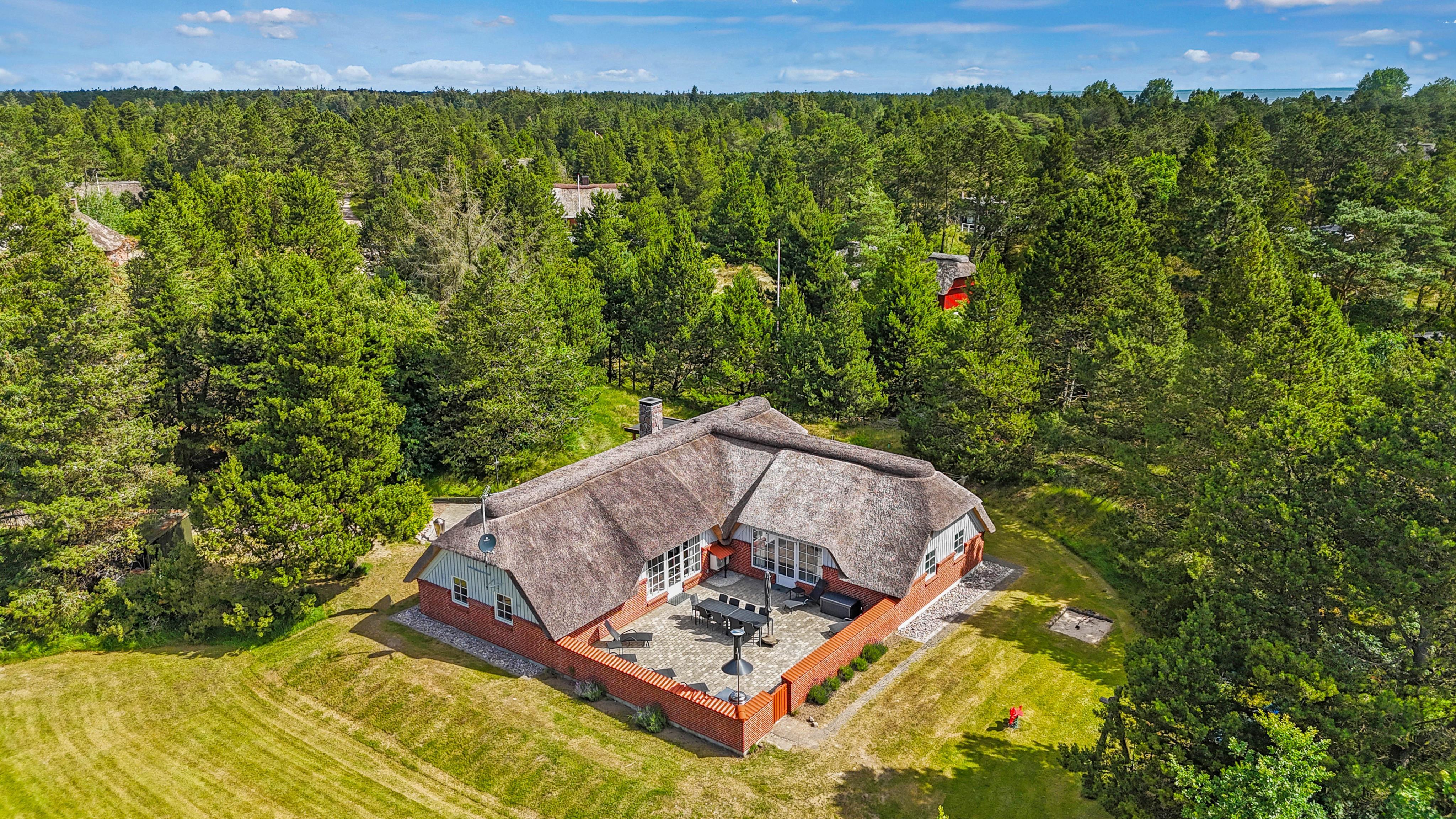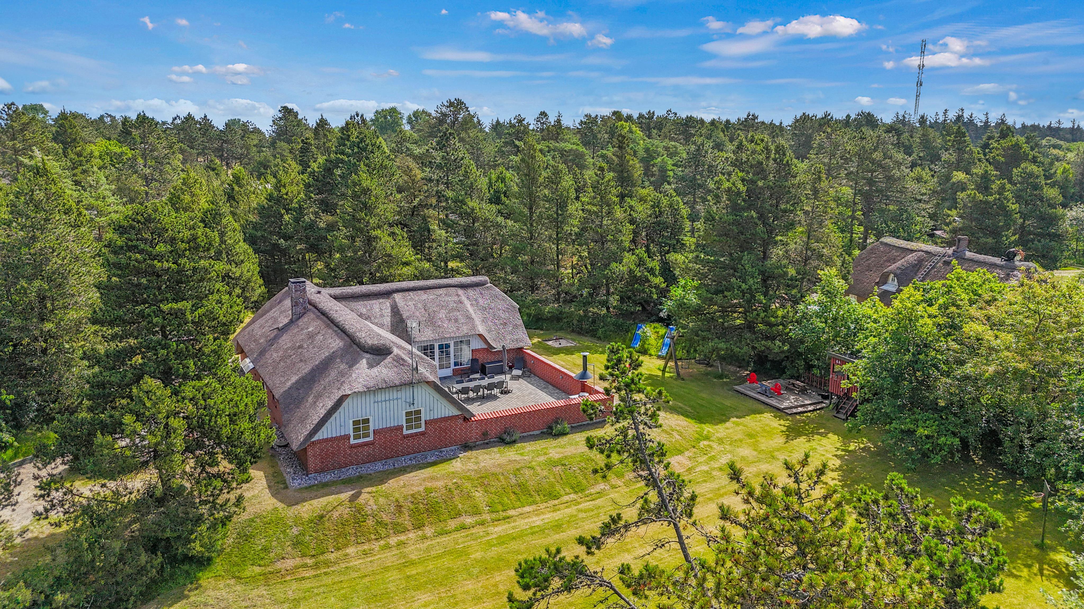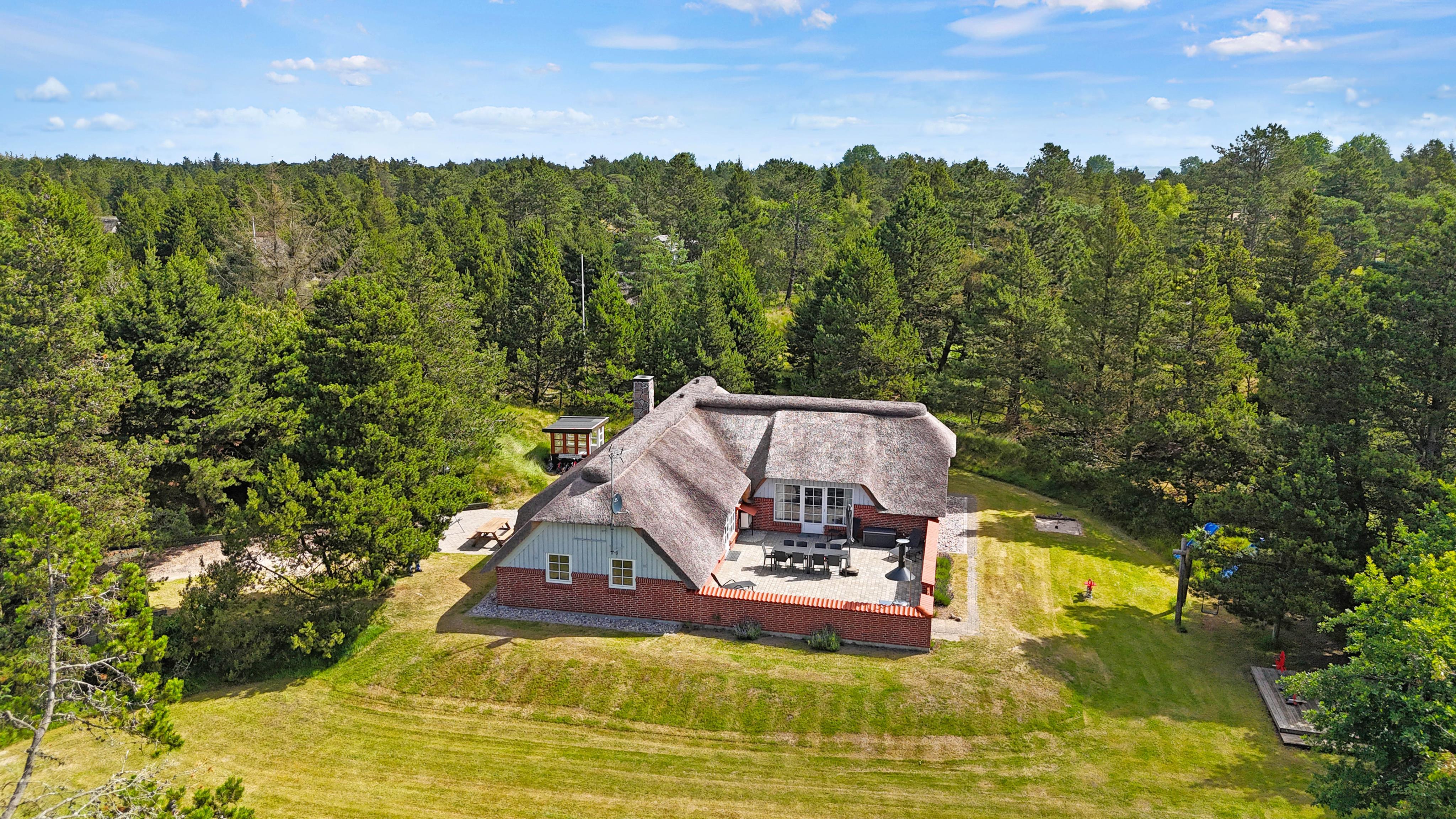 På A Hveyselsvej 4, Vesterhede finder I dette charmerende, stråtækte sommerhusets til 8 personer. Her kan I have en dejlig ferie sammen, med swimmingpool, spa og sauna. Ideelt til den store børnefamilie eller nogle vennepar, som ønsker at holde ferie sammen. Hunden er også velkommen. Nyd denne ferie i et skønt naturområde.