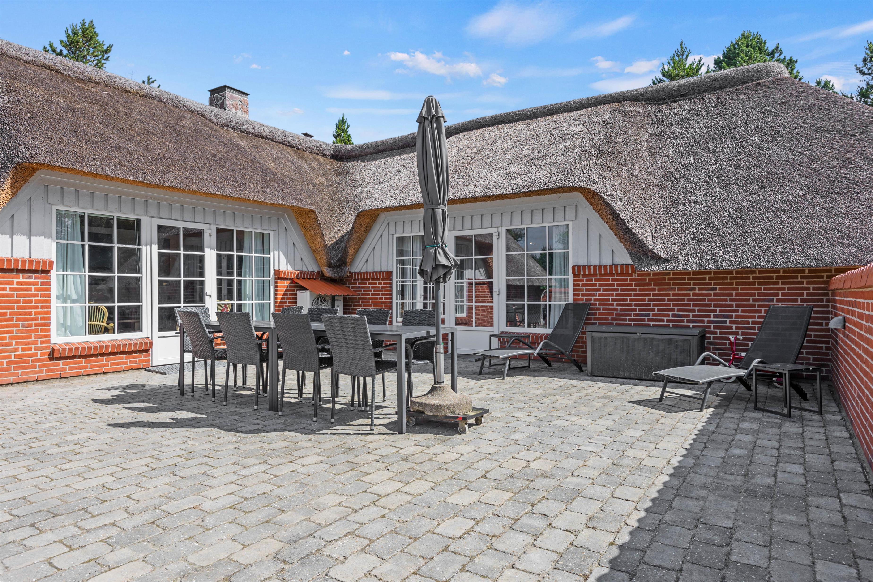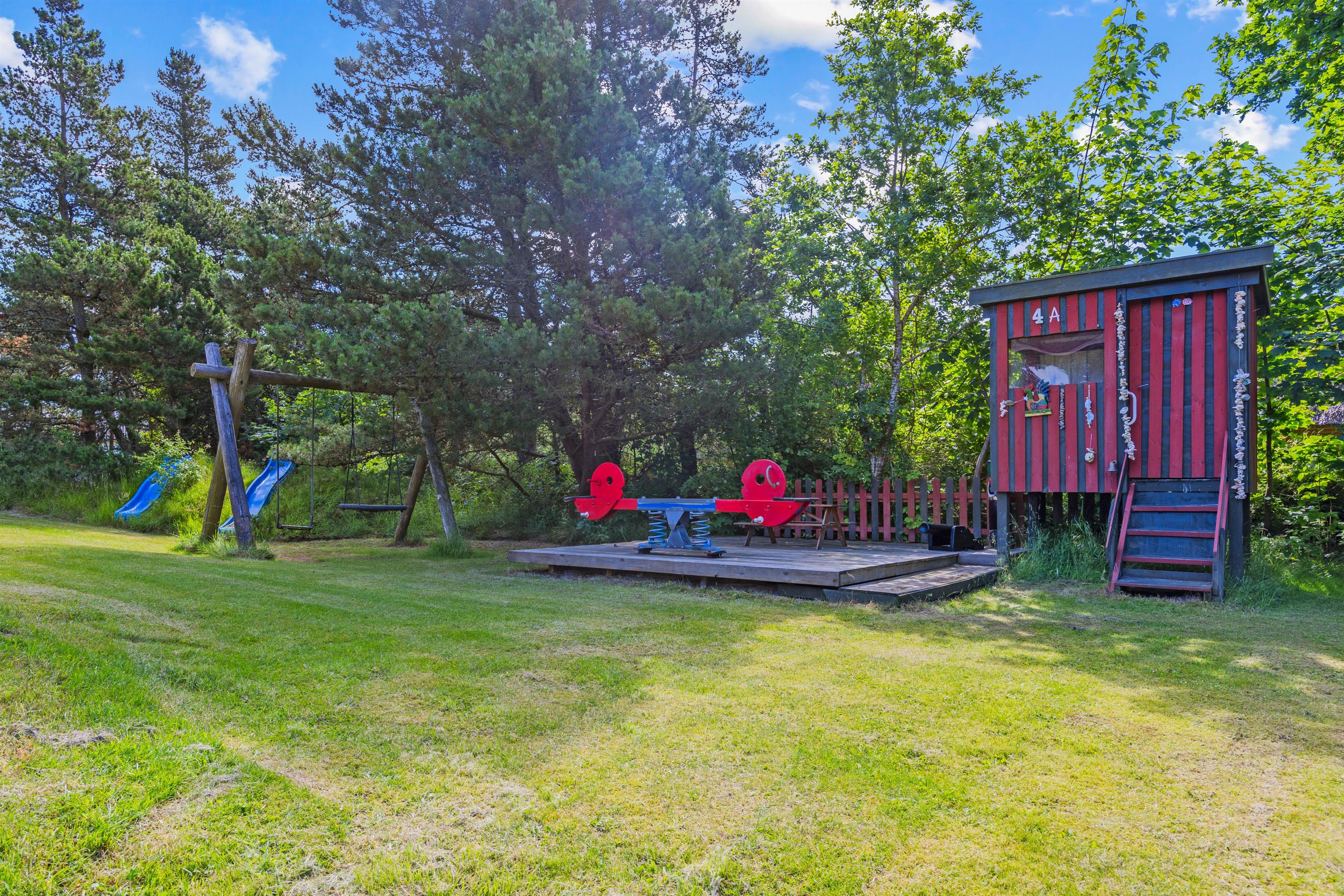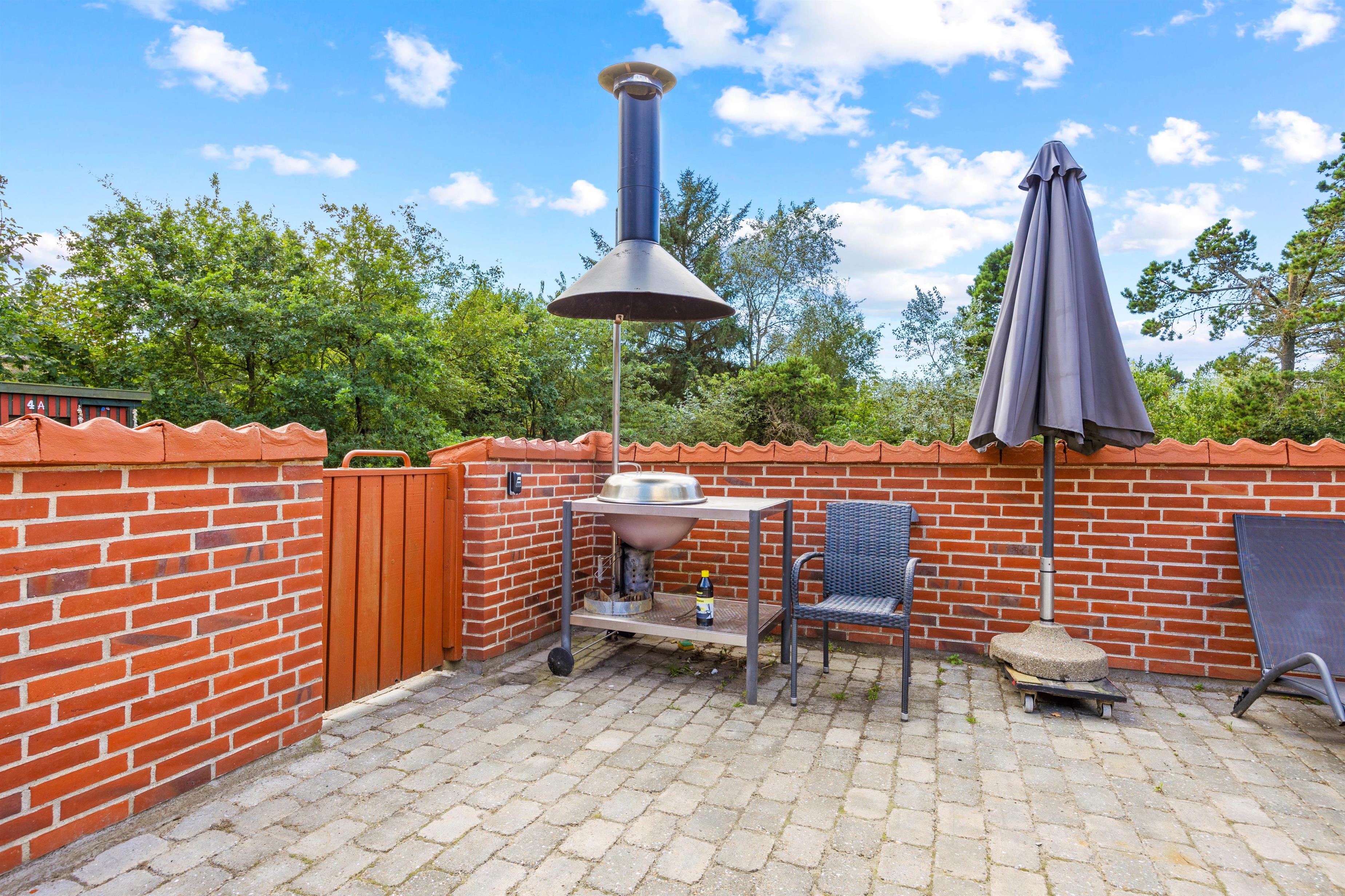 Den lukkede terrasse er ideel, hvis I har små børn eller hund med, da de kan færdes frit imellem opholdsrummet og terrassen. Slik sol i de komfortable liggestole, eller slap af i havemøblerne. Imens kan børnene gå på opdagelse på naturgrunden eller lege i legehuset, gyngerne eller sandkassen. Der er ligeledes en fodboldbane til de aktive. Tænd op i de to grills, som står på hver sin terasse til aften, og nyd et lækkert grillmåltid sammen, imens skyggerne bliver lange. Der er ladestik til el-bil til rådighed for jer på ferien (ABB) - Ladekabel mangler og skal medbringes af gæsten.
